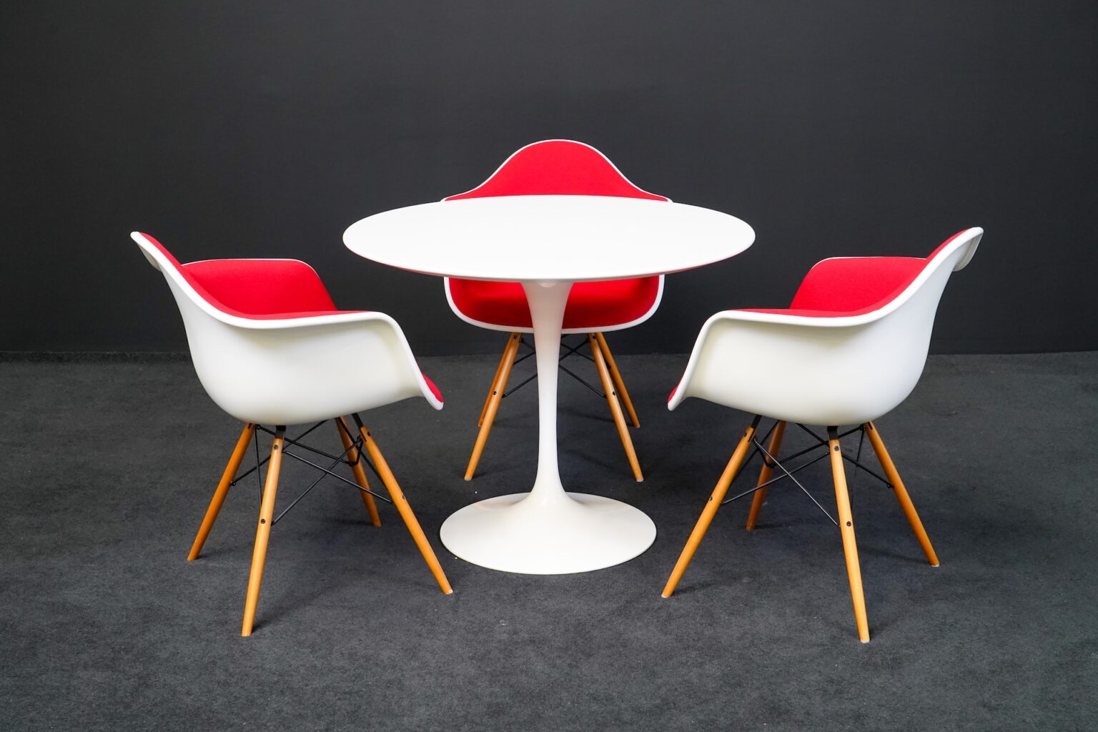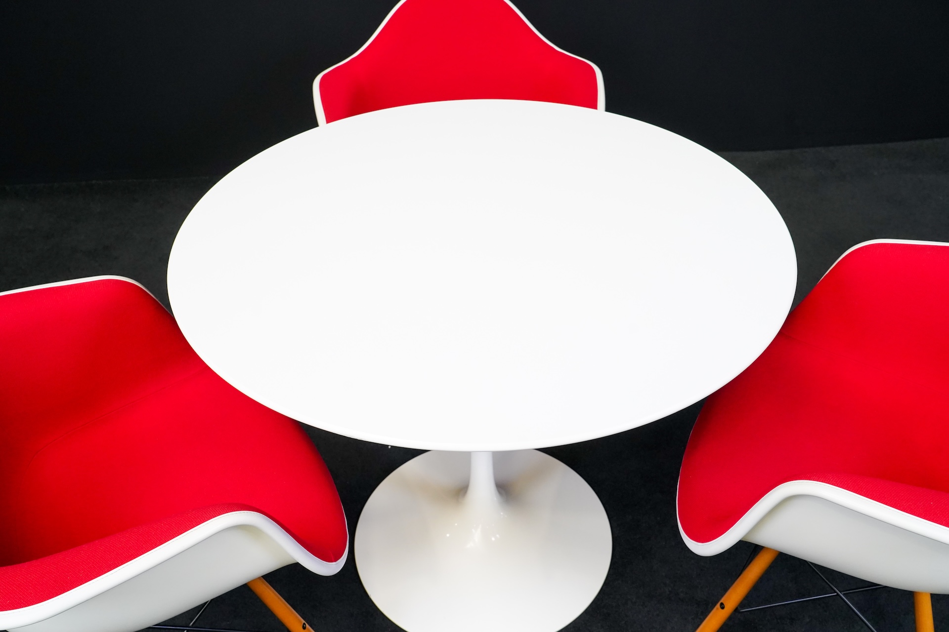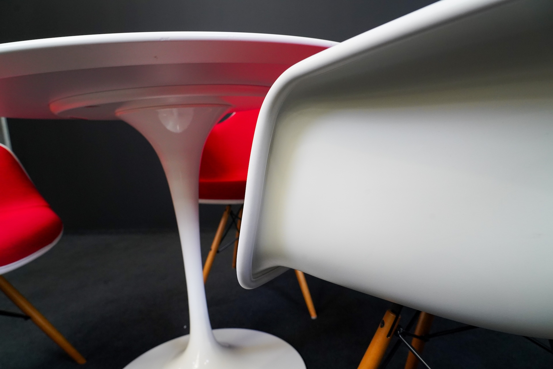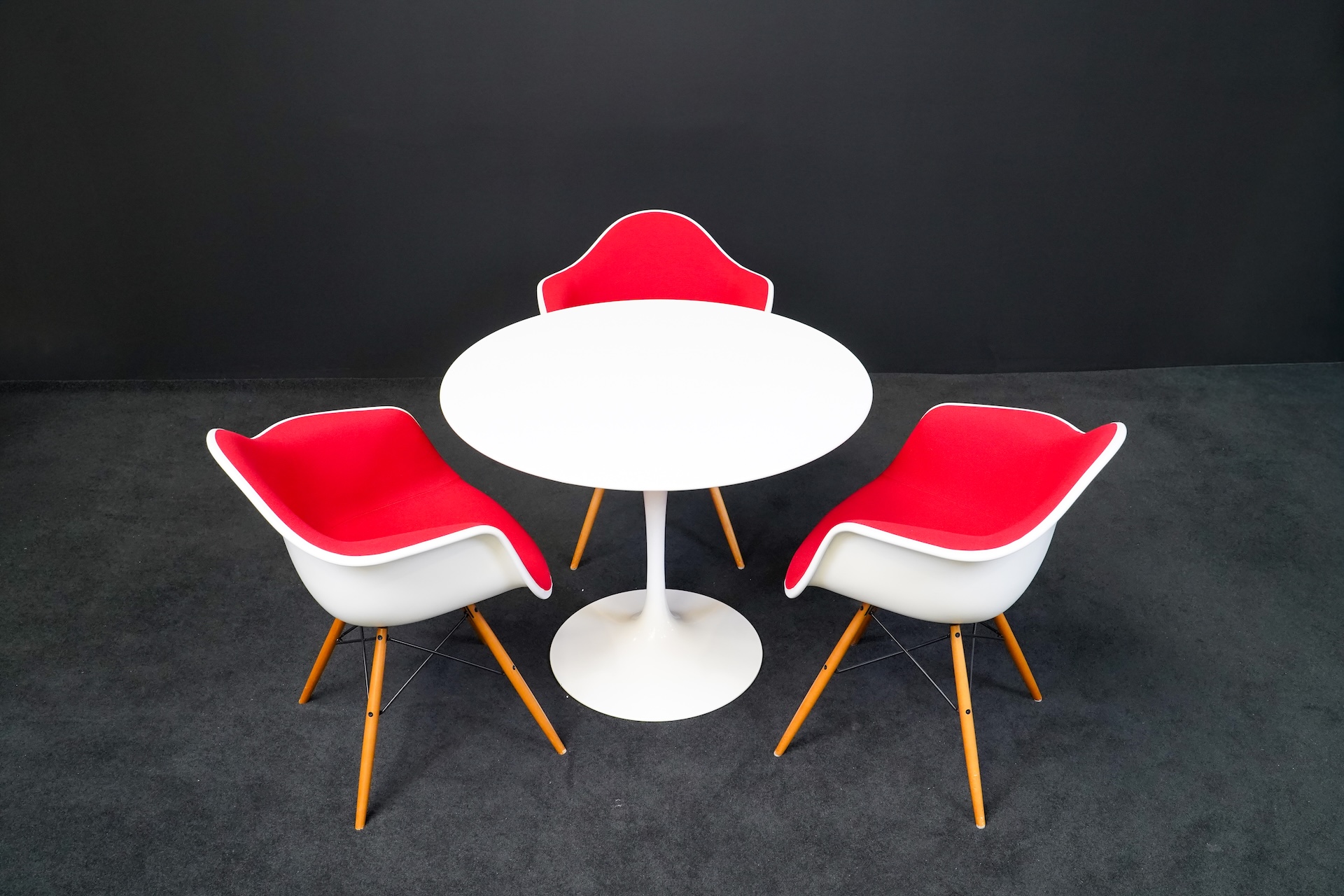 Knoll International Tisch Tulip Kunstharz Weiss + 3x Vitra Eames Plastic Armchair DAW Kunststoff Weiß