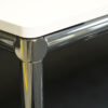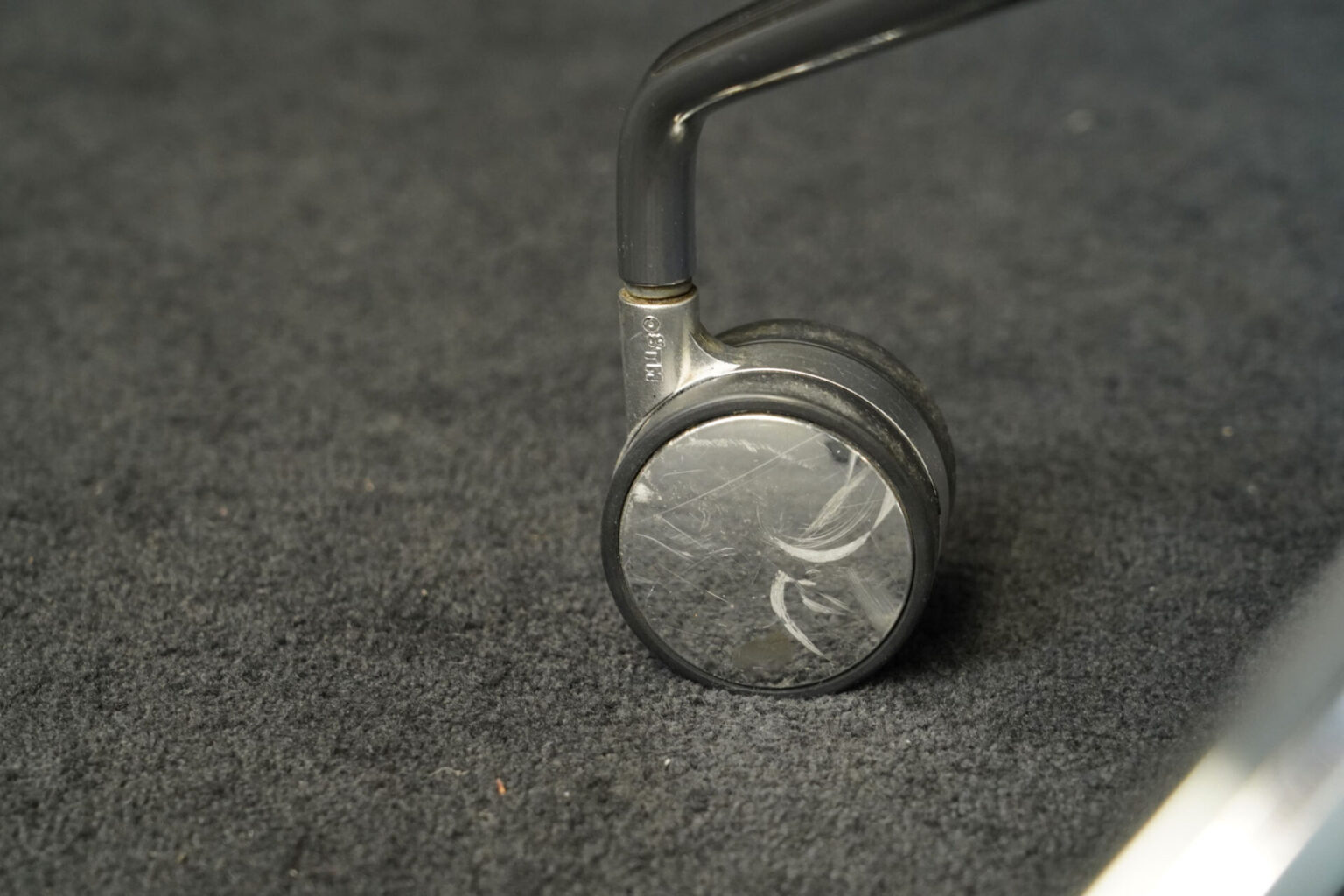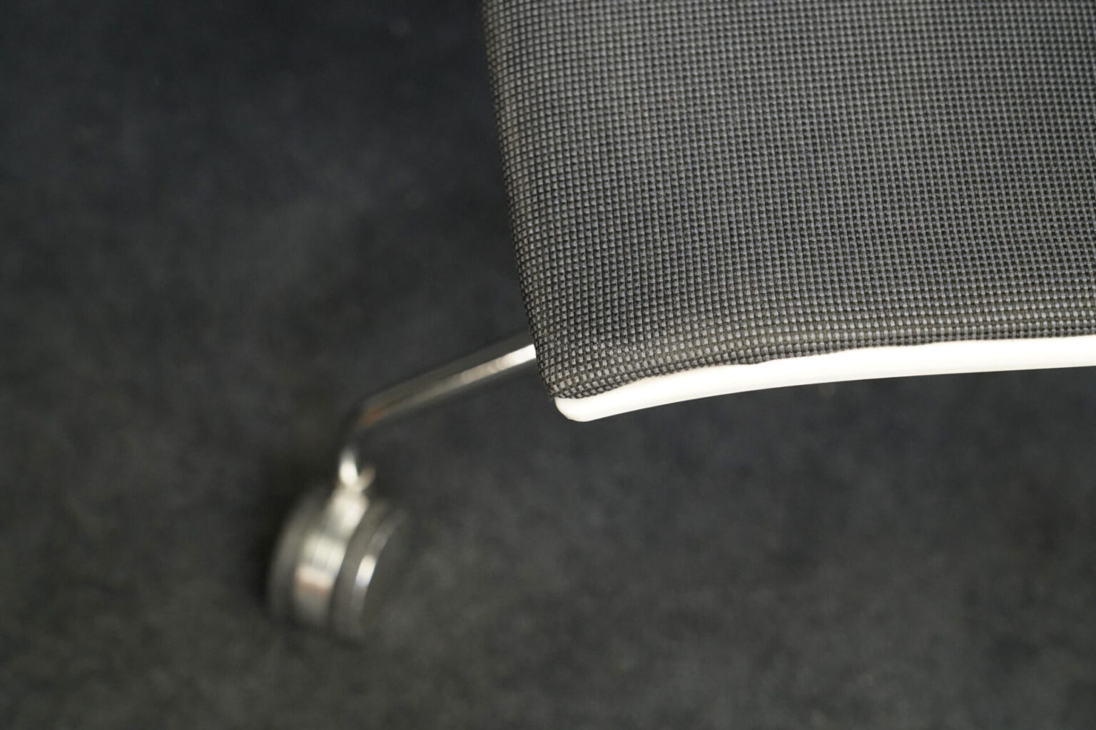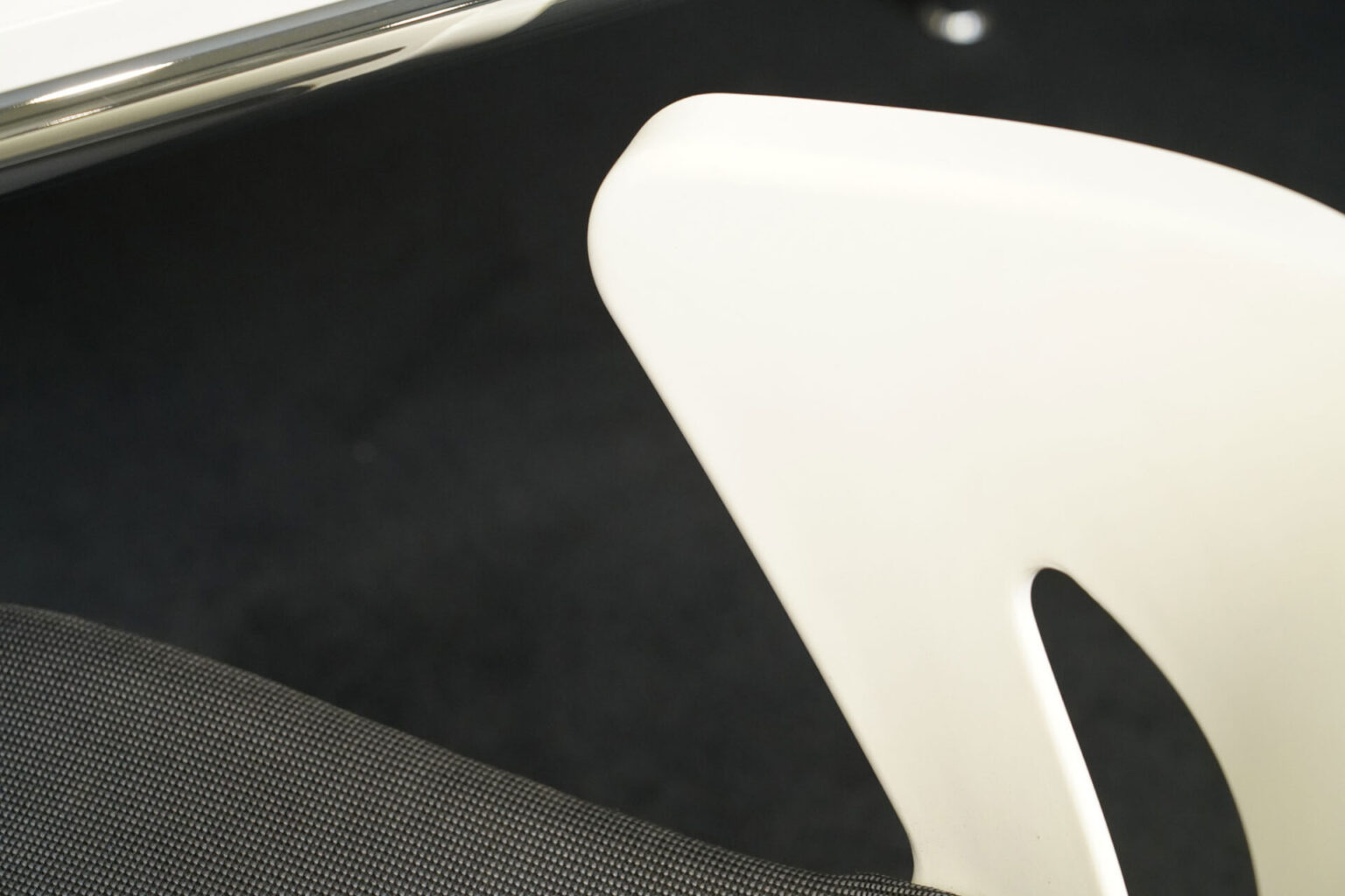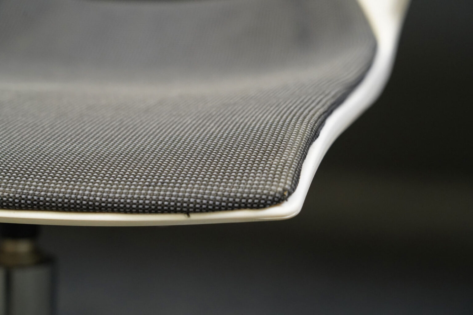 Stuhl: Kunststoff | Weiß | Sitzbezug Hopsak / Grau | drehbar | Gestell verchromt | H: 77cm | SH: 46cm | B: 55cm | T: 50cm