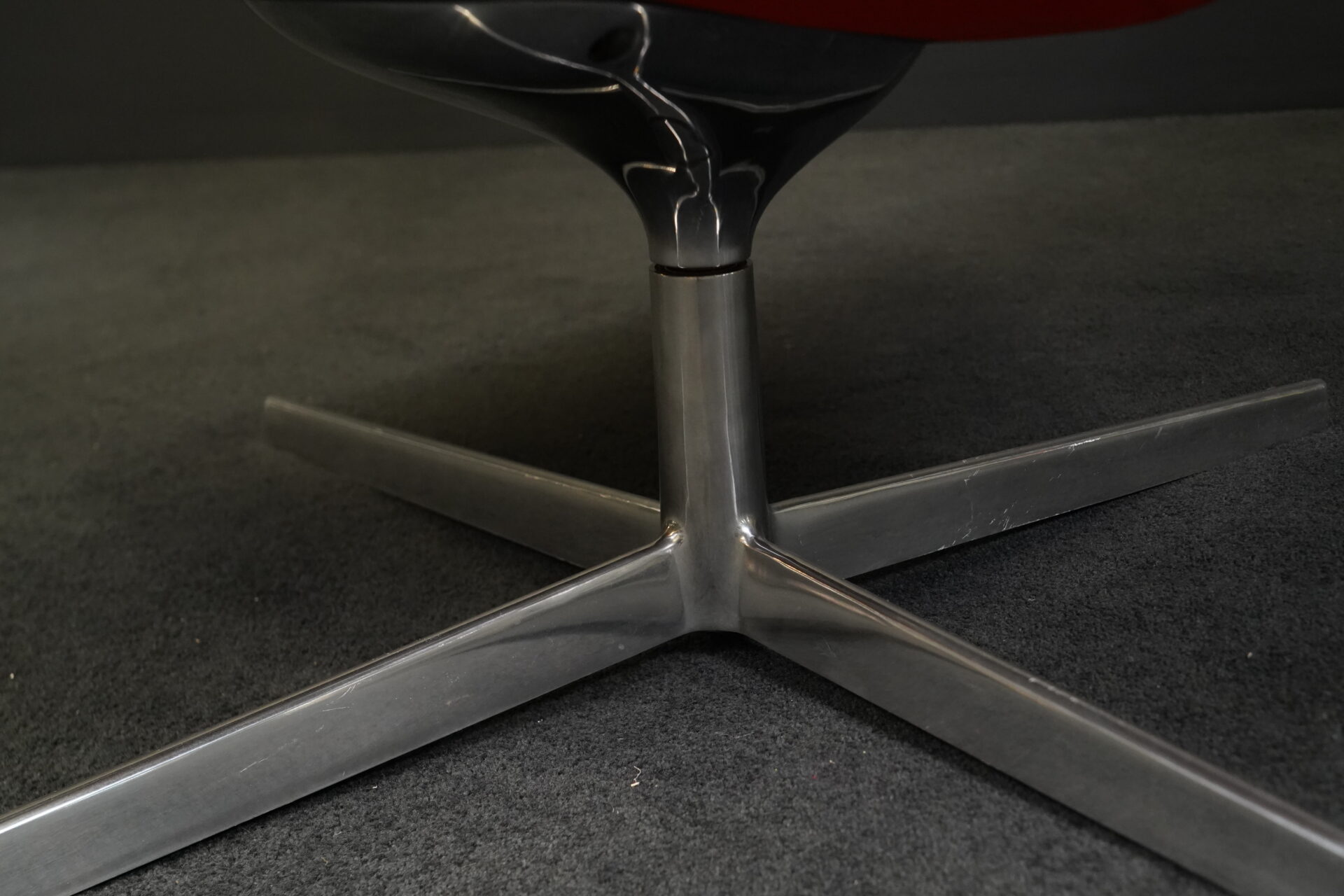 Sitz- und Rückenfläche aus rotem Stoff | Viersternfuß aus poliertem Aluminium | mit Herstelleretikett | H.108cm | Sitzhöhe: 40cm | B.70cm | T.70cm
