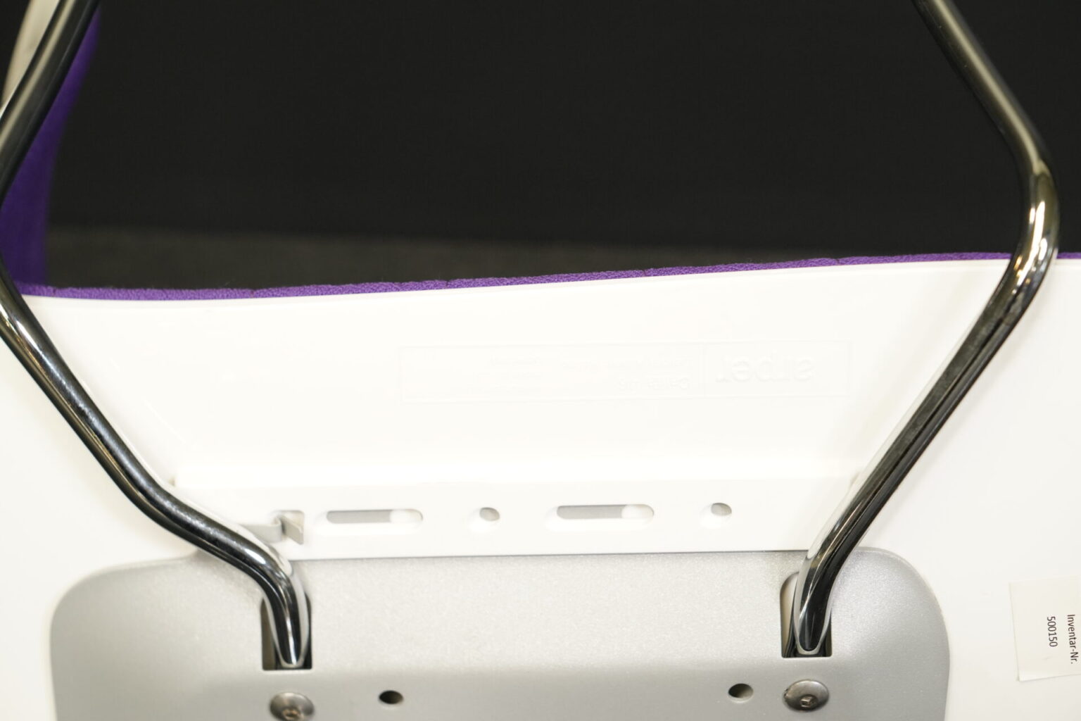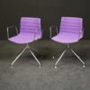 Set bestehend aus zwei Stühlen, jeweils mit Fünfsternfuß und Armlehnen aus poliertem Aluminium | Sitz- und Rückenfläche aus violettem Stoff | mit Herstellerbezeichnung | H.80cm | Sitzhöhe: 46cm | B.59 | T.42cm