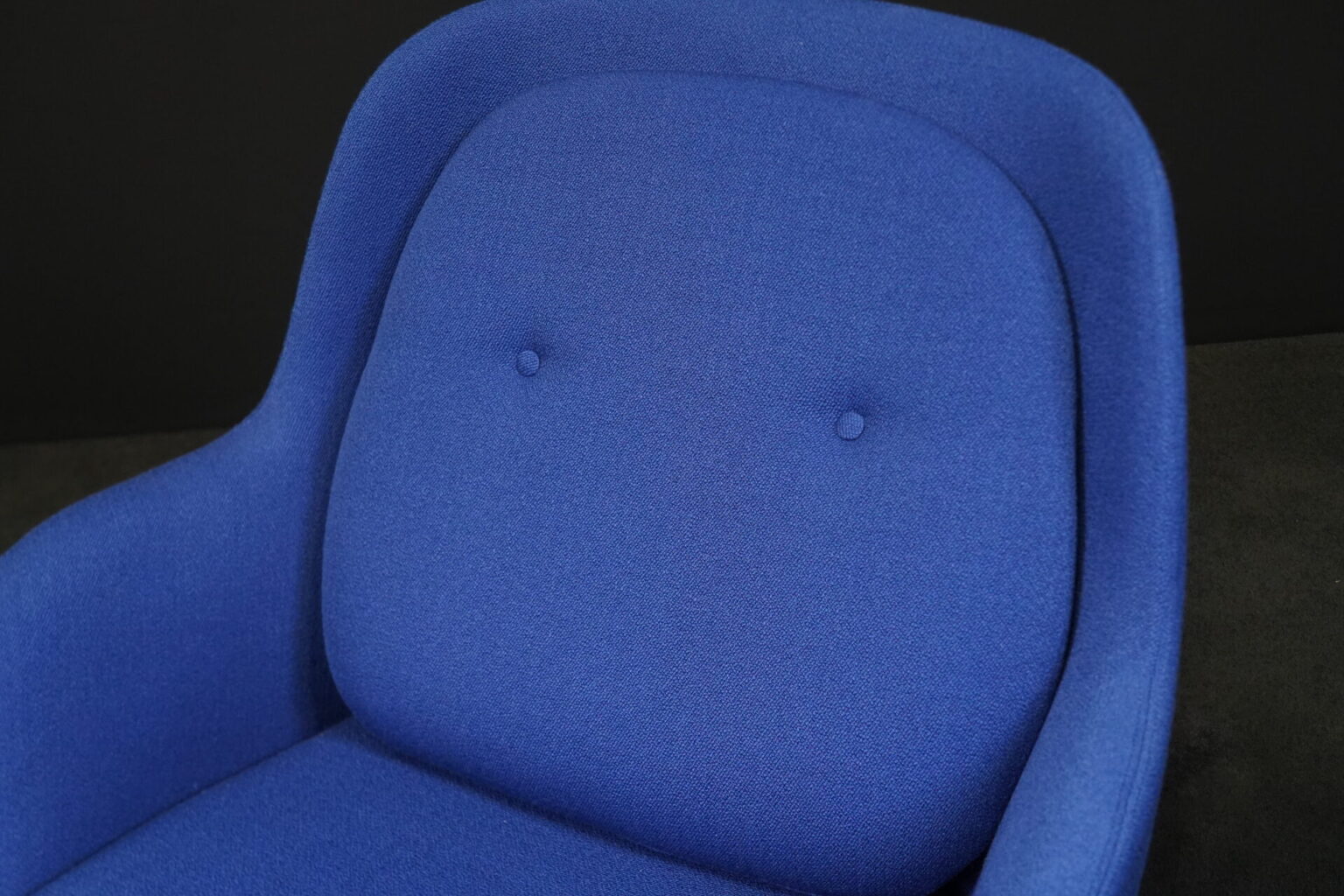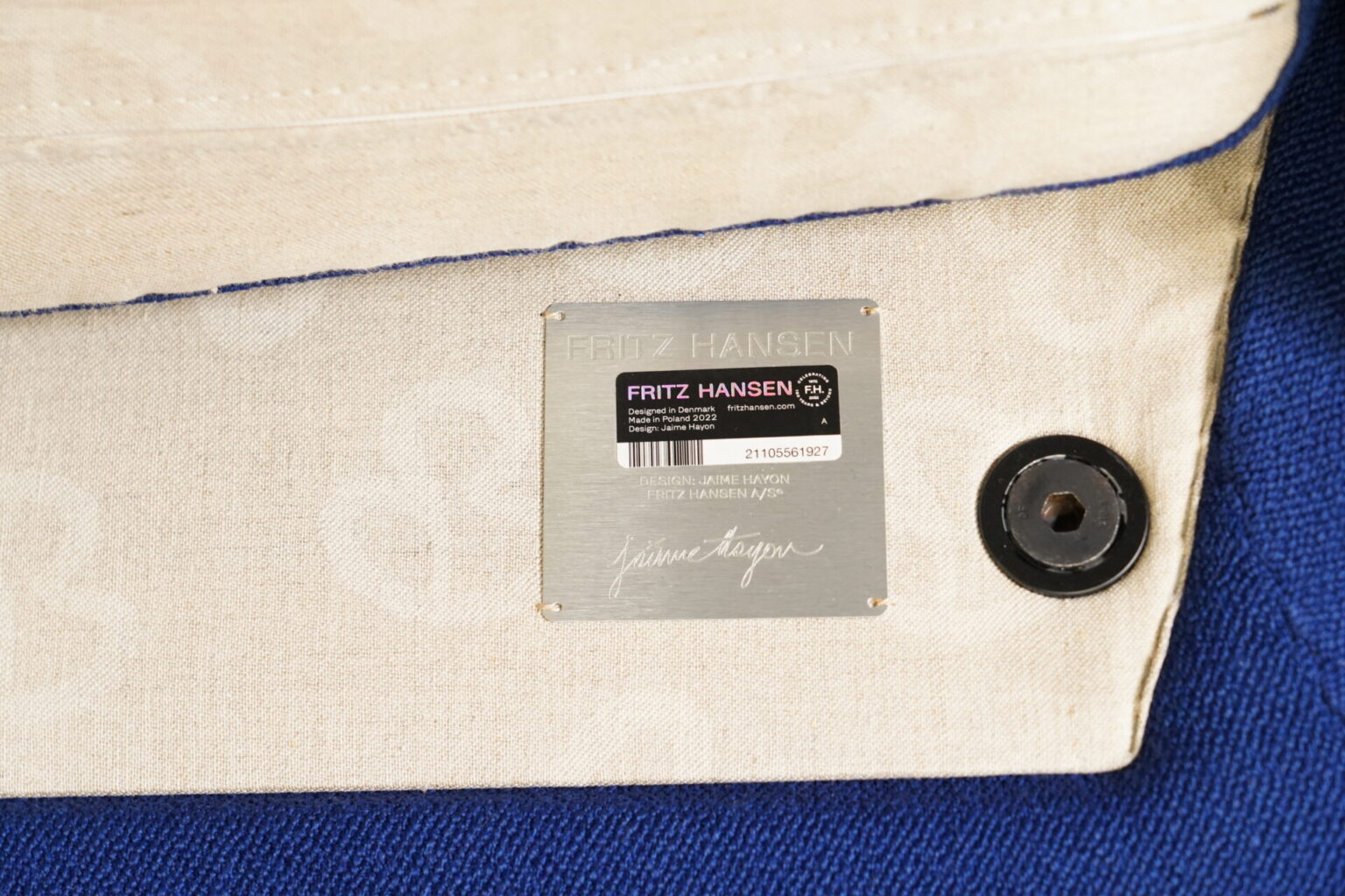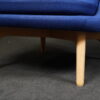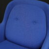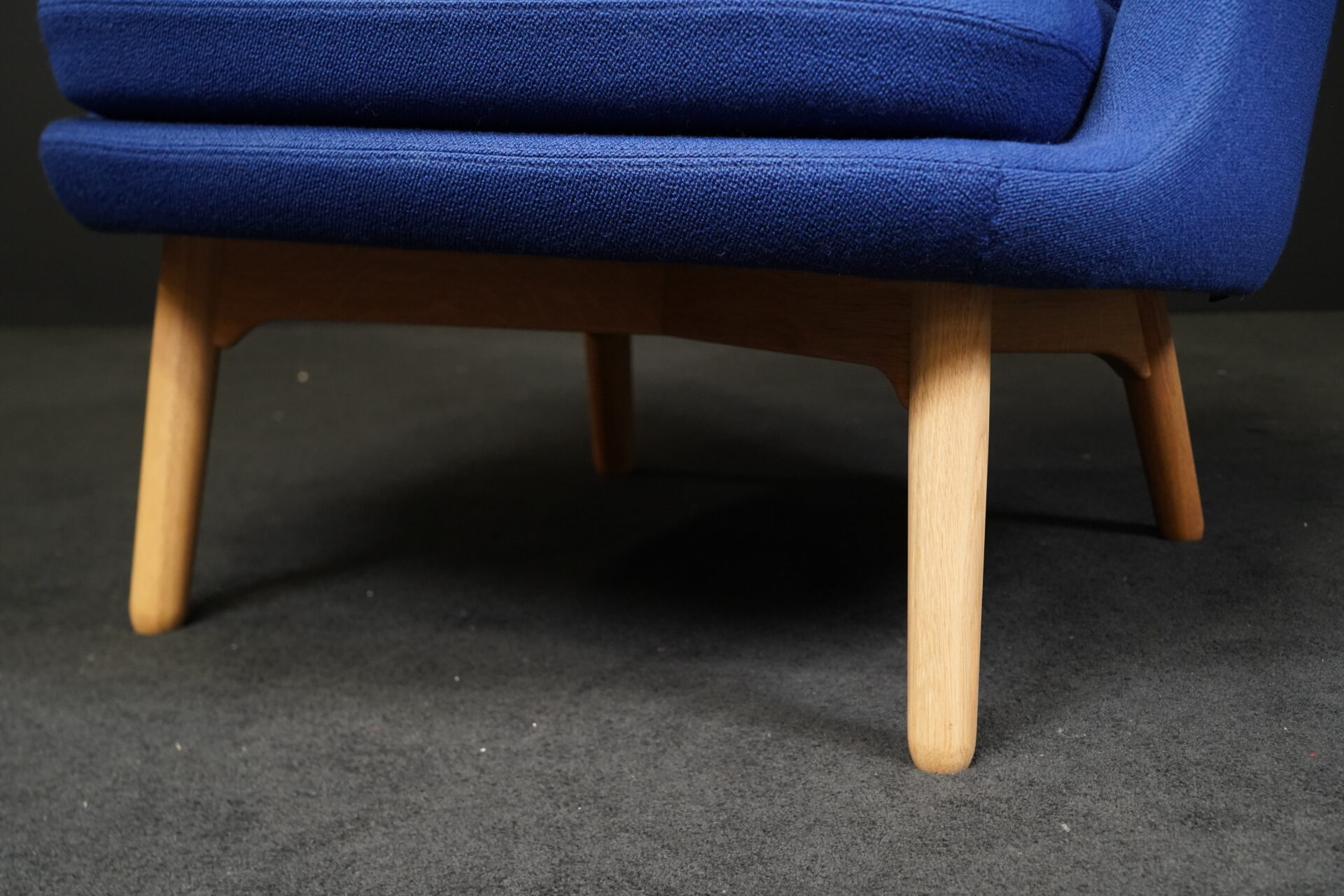 Aufgepolsterte Konstruktion aus blauem Stoff | Sitz- und Rückenkissen abnehmbar | Füße aus Eichenholz | mit Herstellerbezeichnung | H.80cm | Sitzhöhe: 44cm | B.80cm | T.70cm