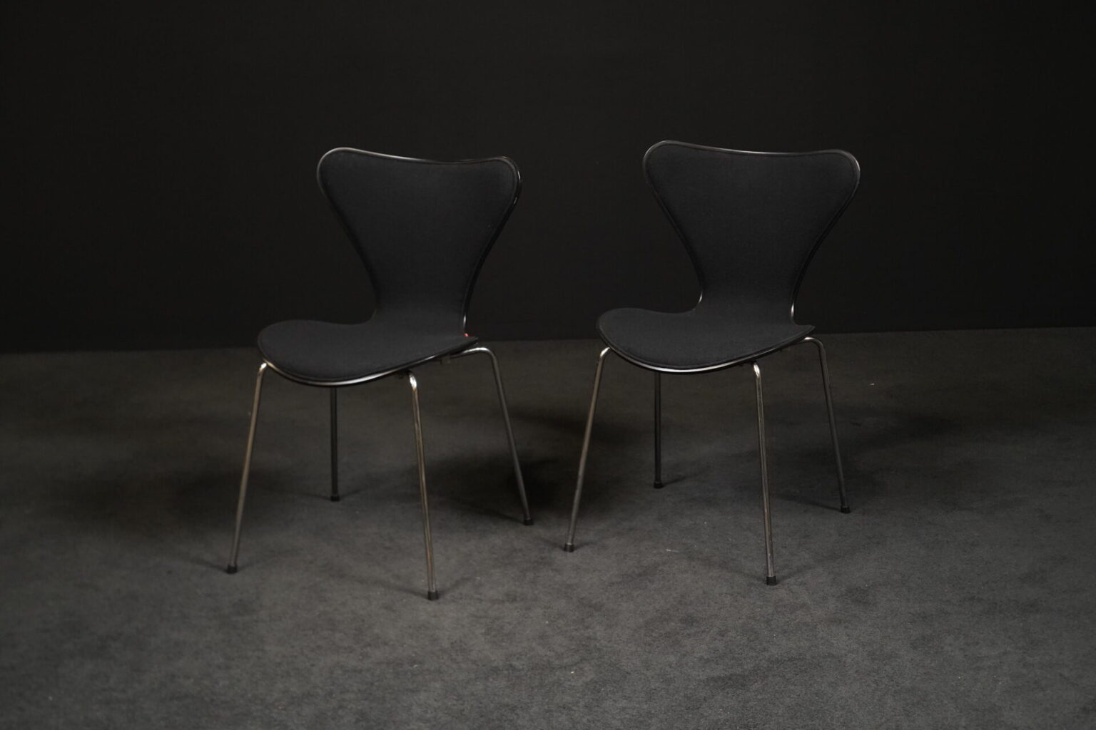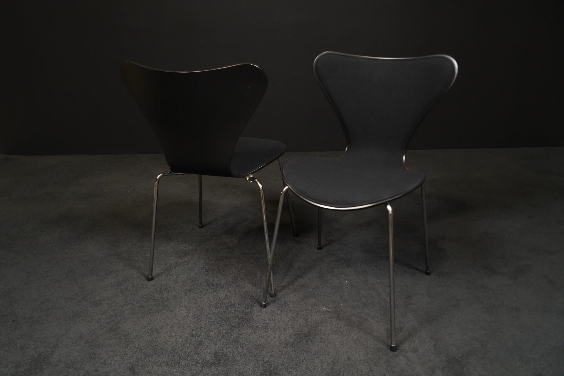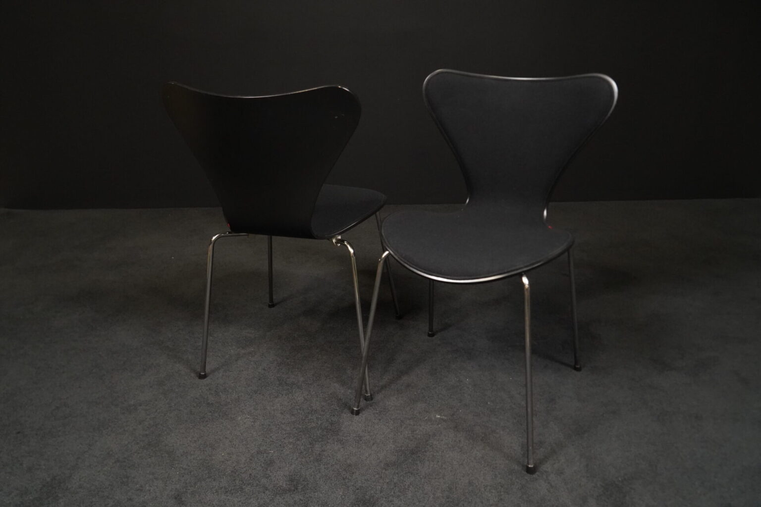 Arne Jacobsen für Fritz Hansen | zwei Stühle | Modell ‚Serie 7‘ | schwarz gebeiztes Holz | Sitz- und Rückenfläche aufgepolstert und mit schwarzem Stoff bezogen | Gestell aus verchromten Stahlrohr | mit Herstellerbezeichnung | je: H.81cm | Sitzhöhe: 48cm | B.46cm | T.45cm
