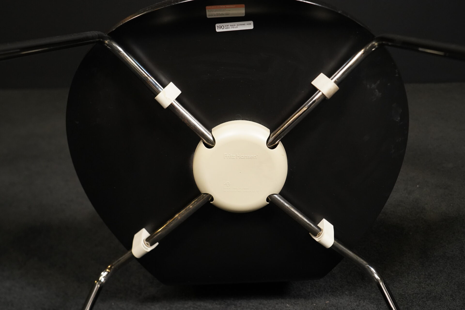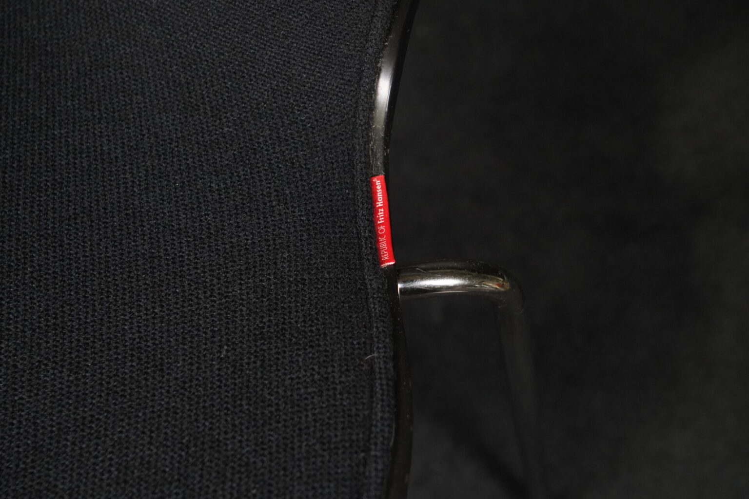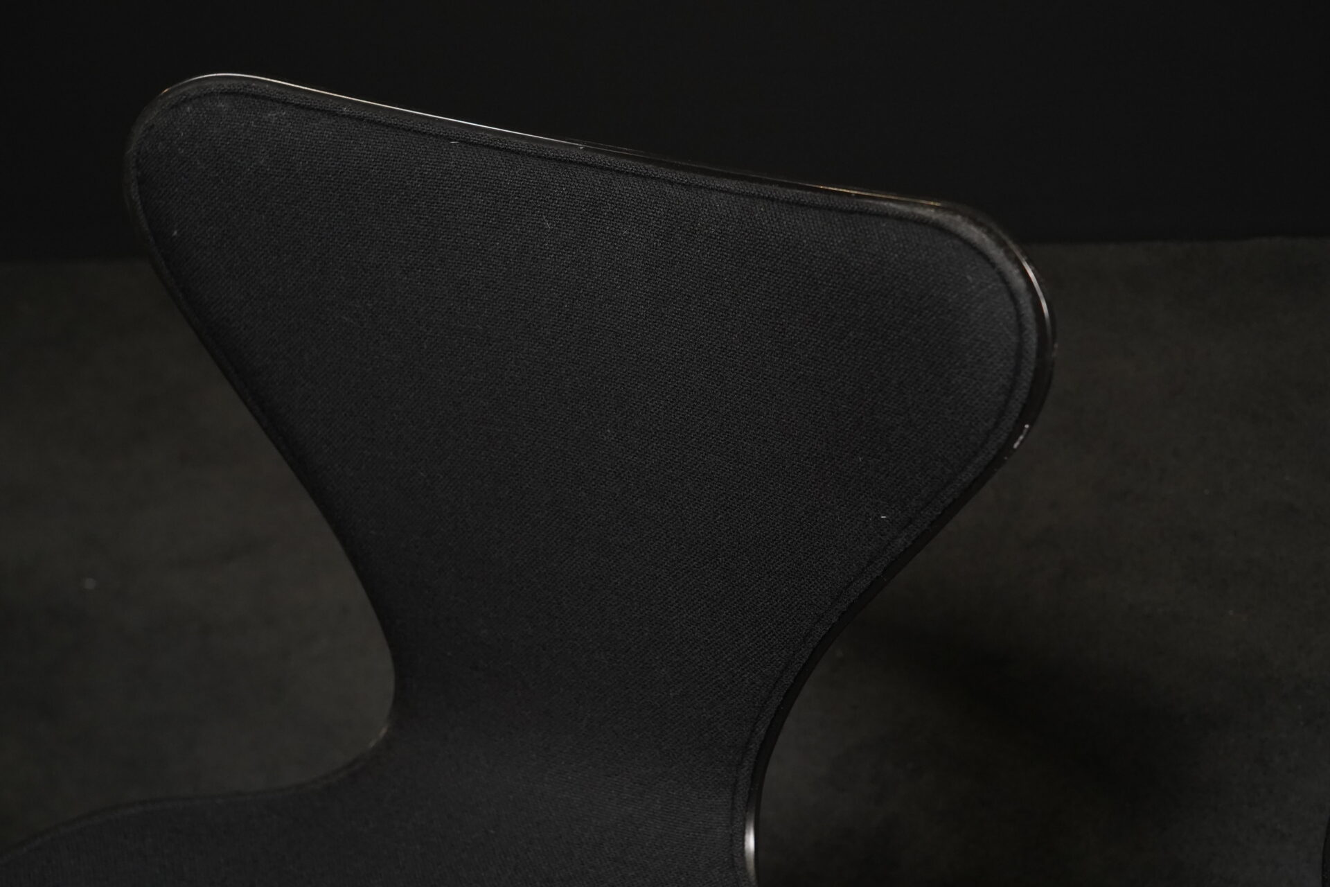 Arne Jacobsen für Fritz Hansen | zwei Stühle | Modell ‚Serie 7‘ | schwarz gebeiztes Holz | Sitz- und Rückenfläche aufgepolstert und mit schwarzem Stoff bezogen | Gestell aus verchromten Stahlrohr | mit Herstellerbezeichnung | je: H.81cm | Sitzhöhe: 48cm | B.46cm | T.45cm