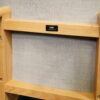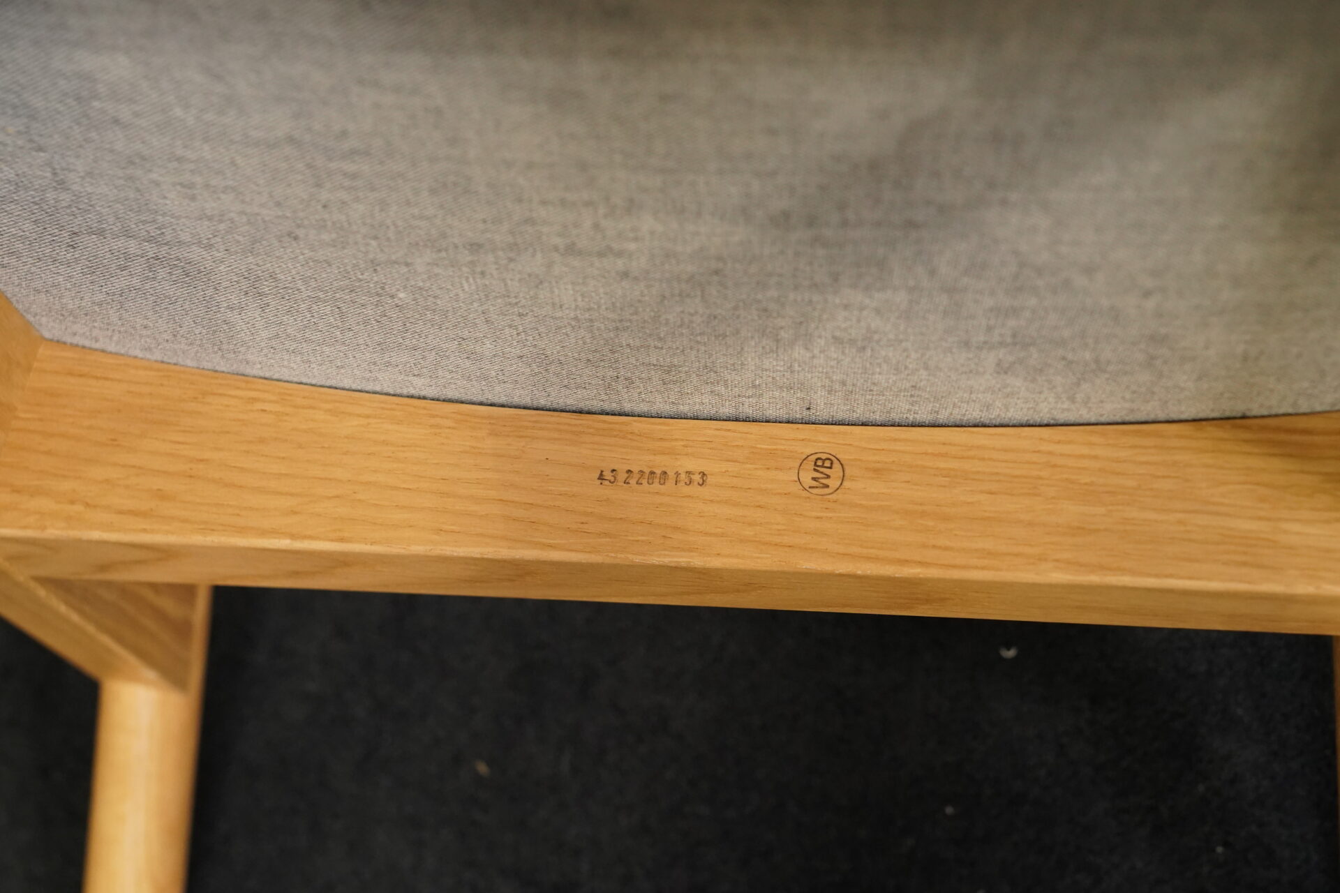 Aufgepolsterte Konstruktion aus grauem Stoff | Untergestell aus Eichenholz | mit Herstelleretikett | H.106cm | Sitzhöhe: 40cm | B.87cm | T.88cm