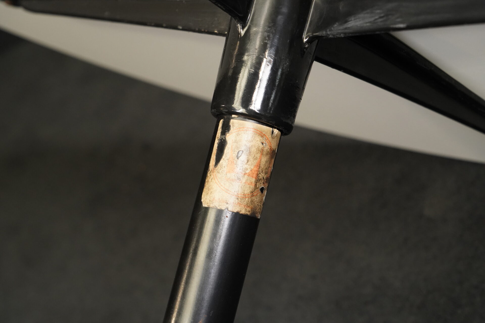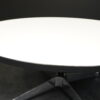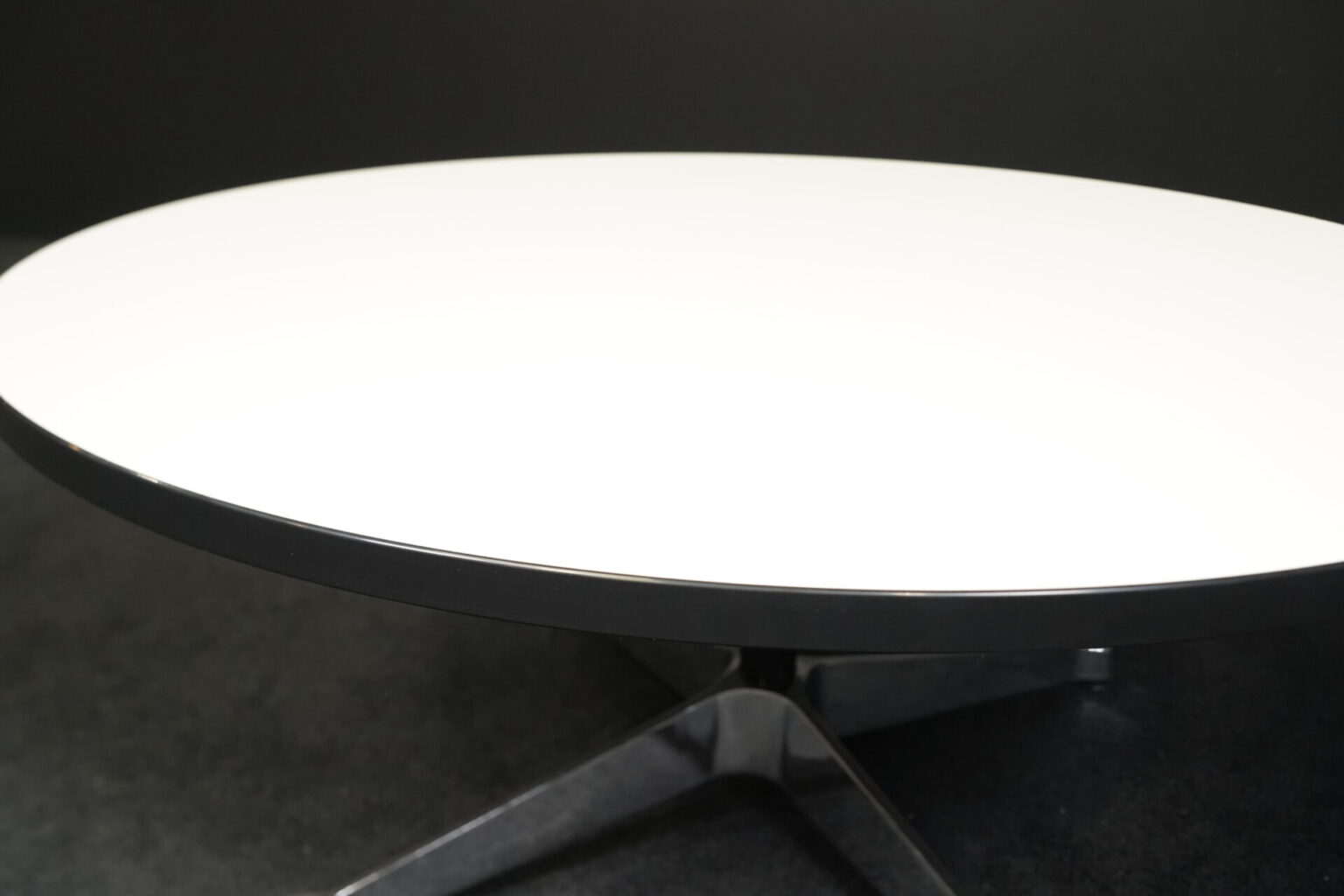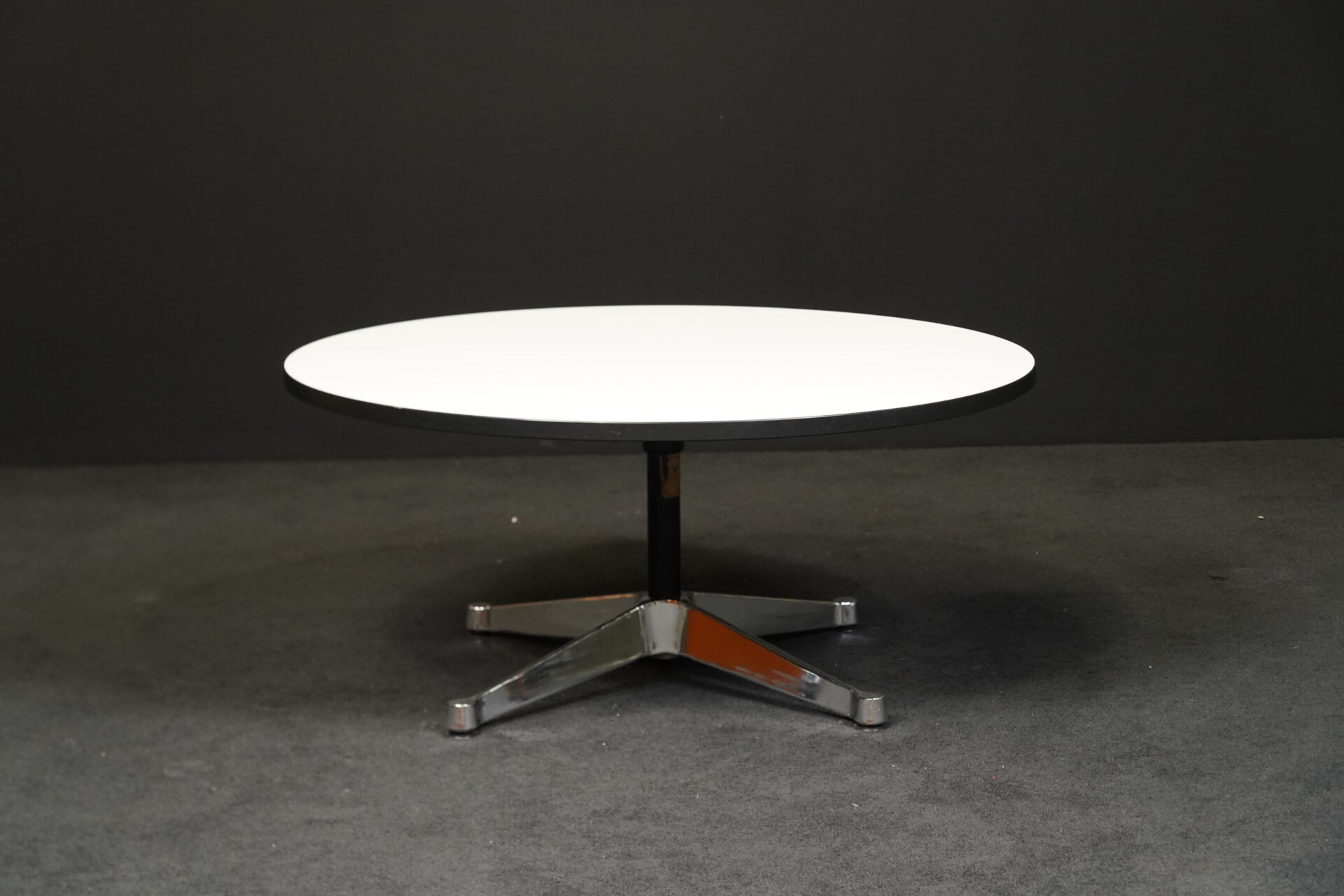 Runder Couchtisch mit einem Viersternfuß aus verchromten Aluminium | Tischplatte aus weißem Kunststoff mit schwarzen Kanten | mit Herstelleretikett | H.41cm | D.90cm