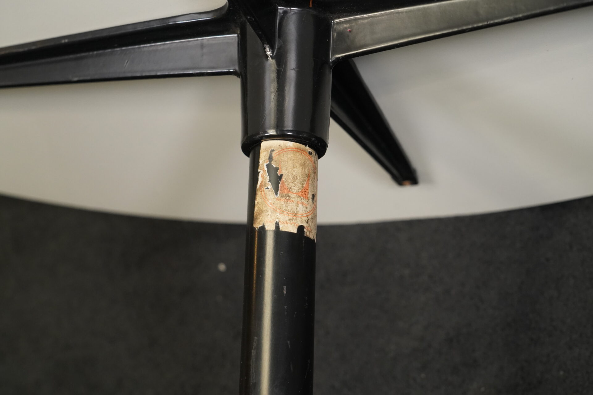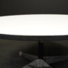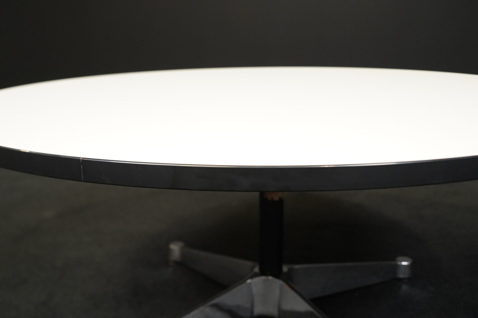 Runder Couchtisch mit einem Viersternfuß aus verchromten Aluminium | Tischplatte aus weißem Kunststoff mit schwarzen Kanten | mit Herstelleretikett | H.41cm | D.90cm