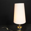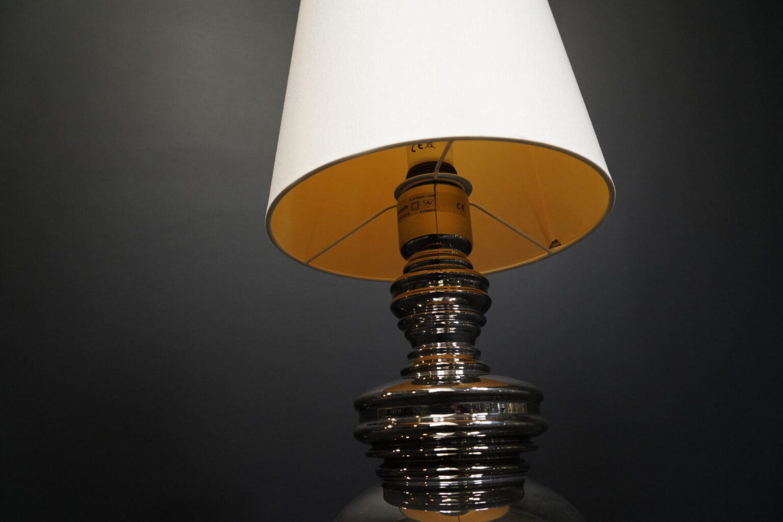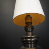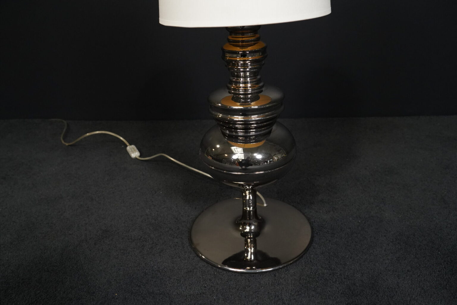 Tischlampe mit einem profiliertem Fuß aus platinierter Keramik | Schirm aus cremefarbenem Stoff | mit einem Leuchtmittel | Kippschalter | EU-Stecker | mit Herstellerbezeichnung | H.75cm | Ø Fuß / Schirm: 24cm