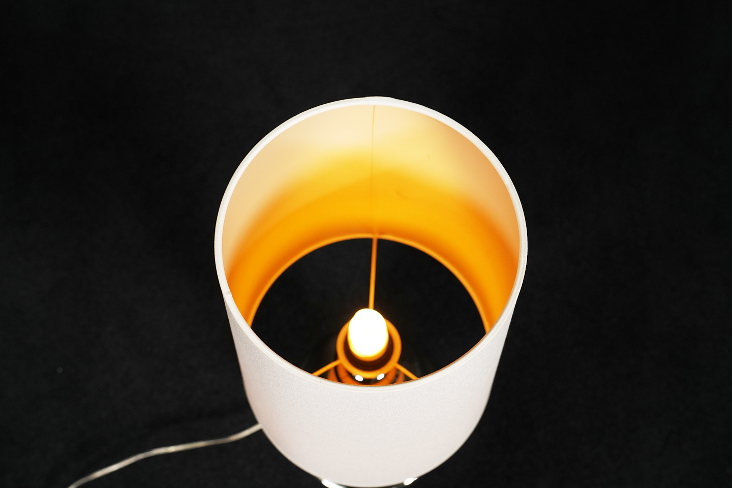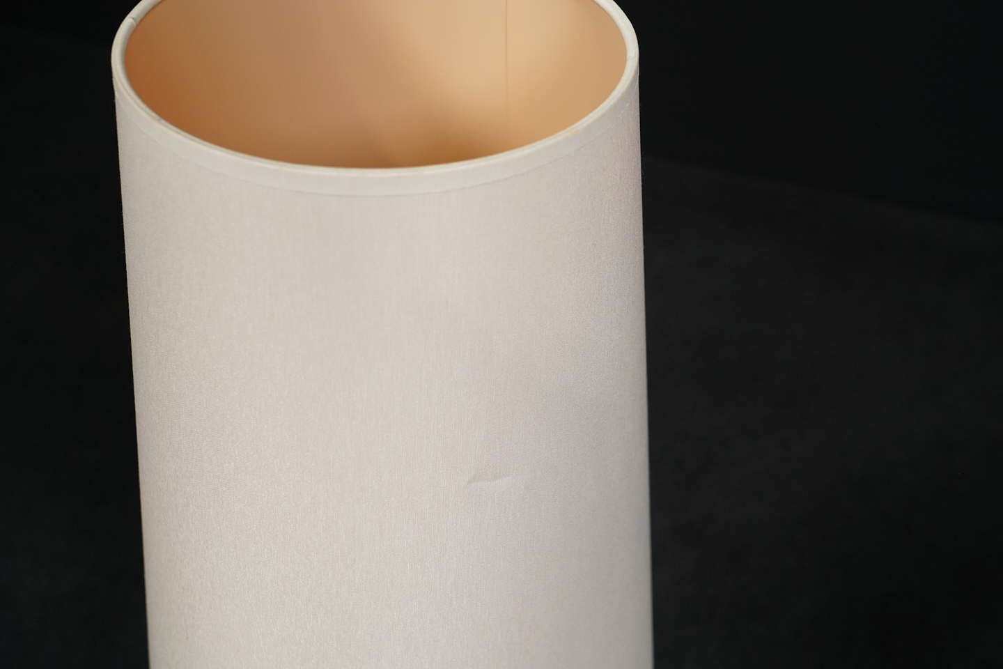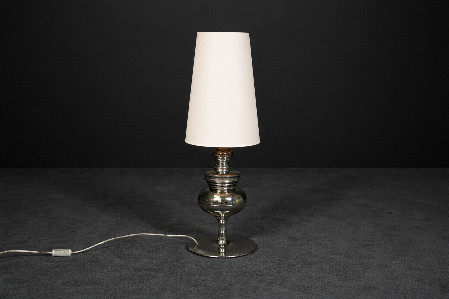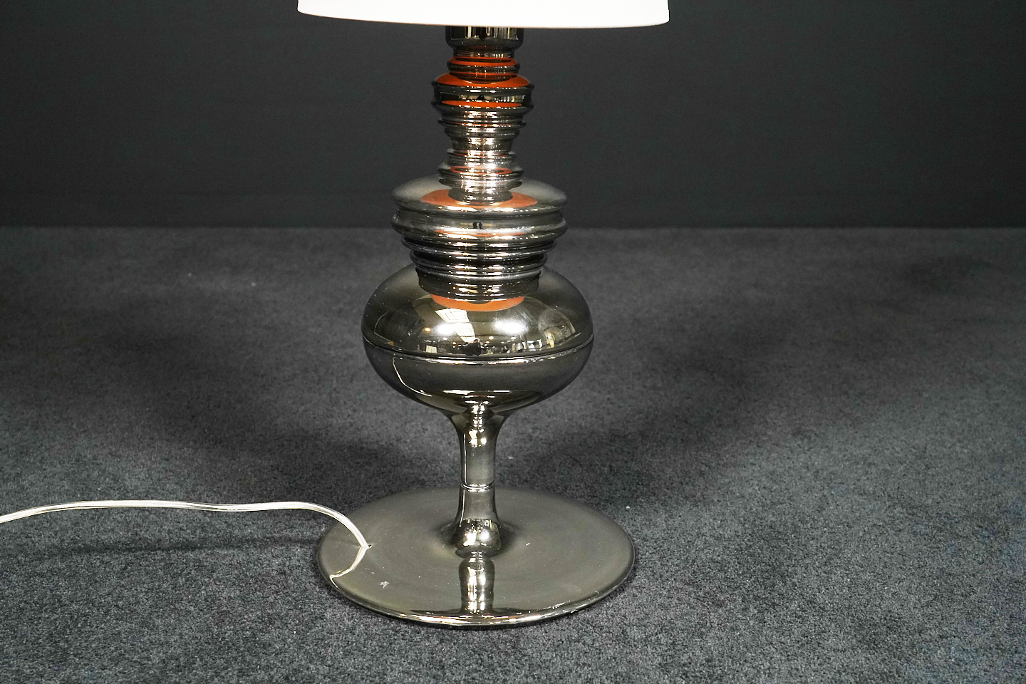 Tischlampe mit einem profiliertem Fuß aus platinierter Keramik | Schirm aus cremefarbenem Stoff | mit einem Leuchtmittel | Kippschalter | EU-Stecker | mit Herstellerbezeichnung | H.75cm | Ø Fuß / Schirm: 24cm