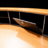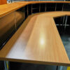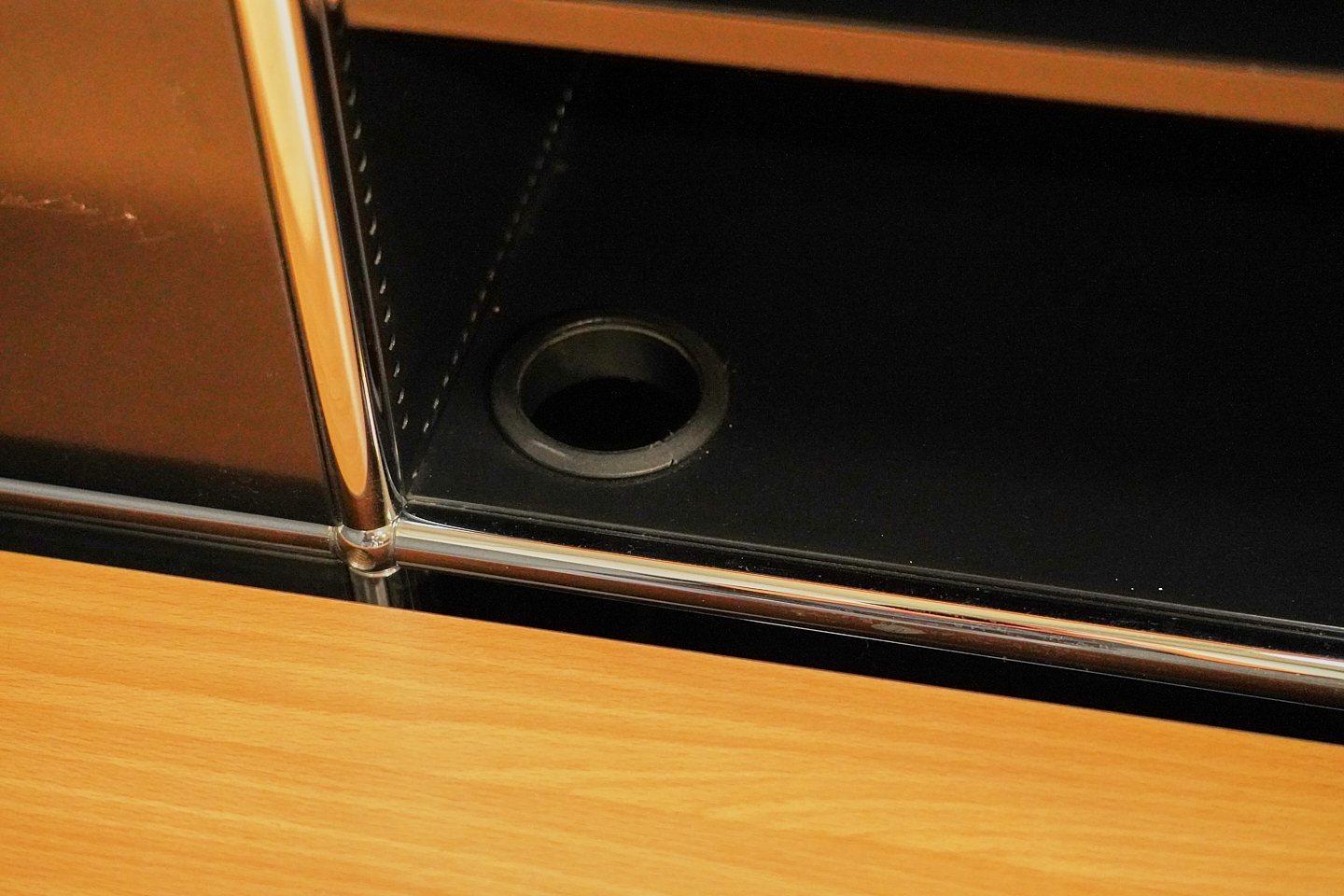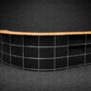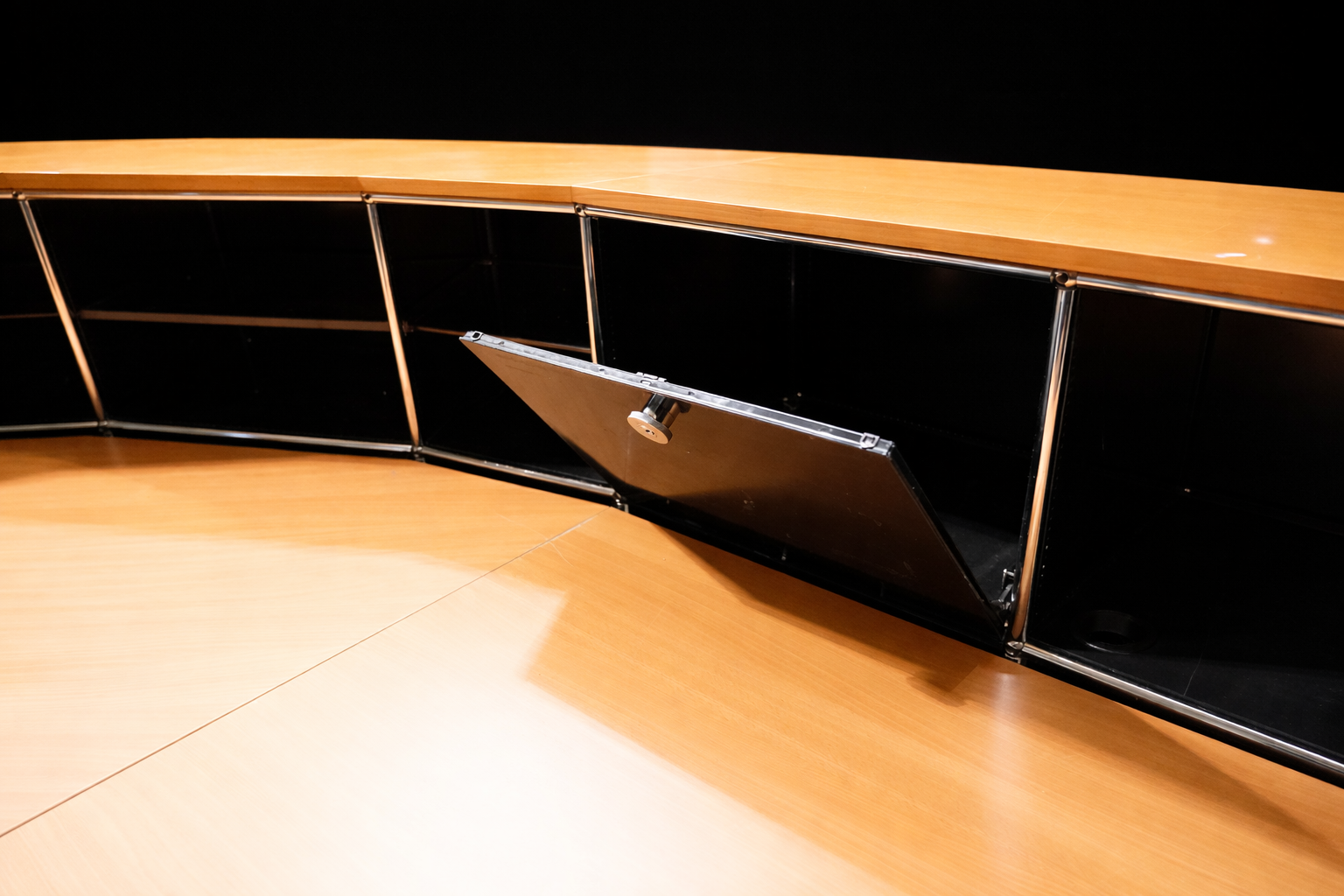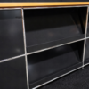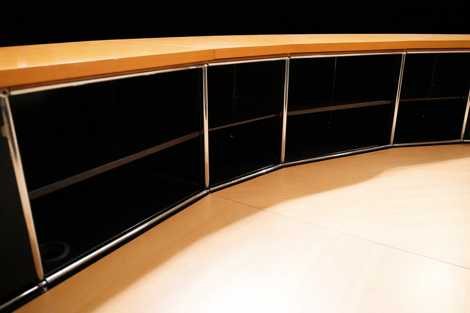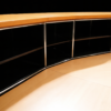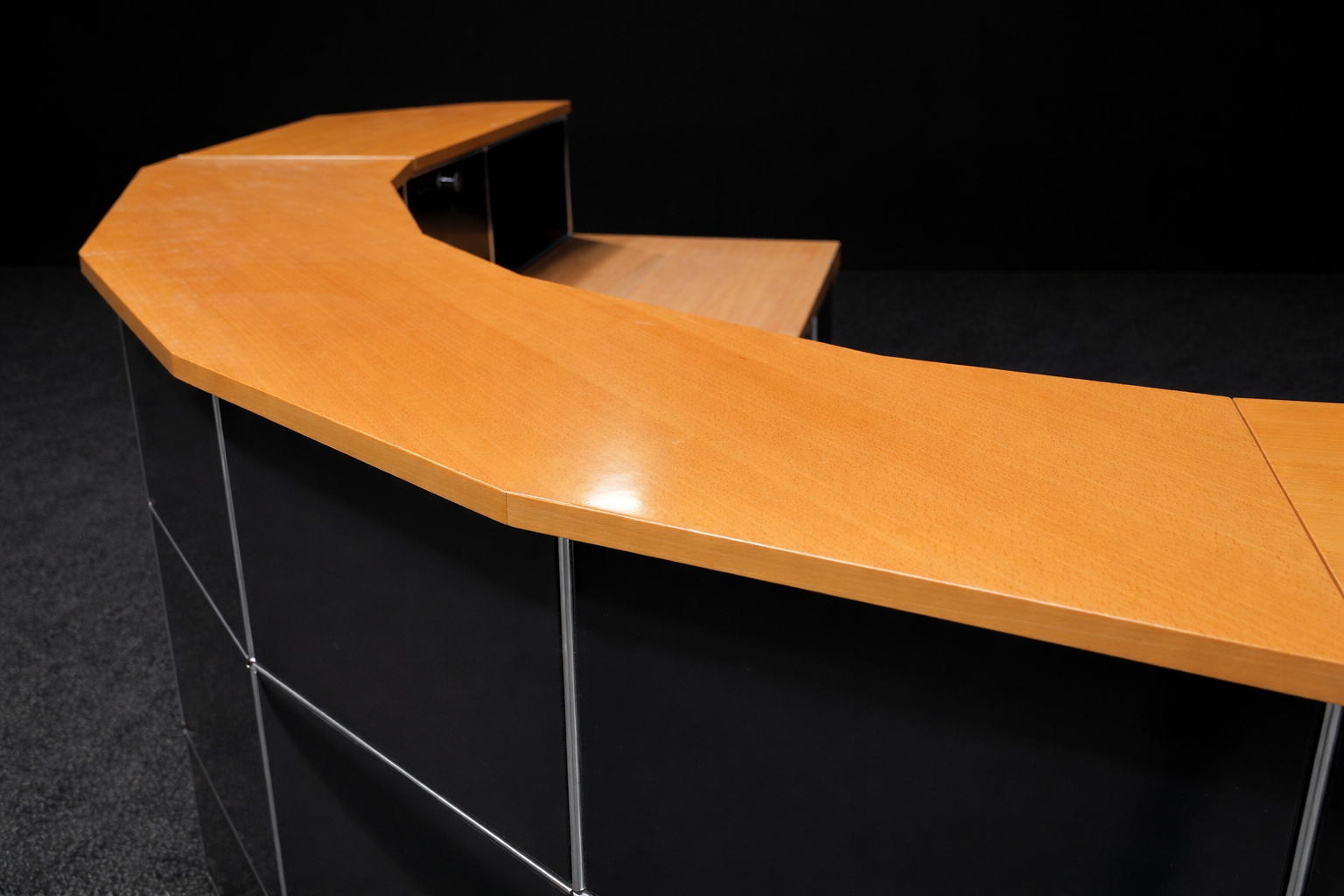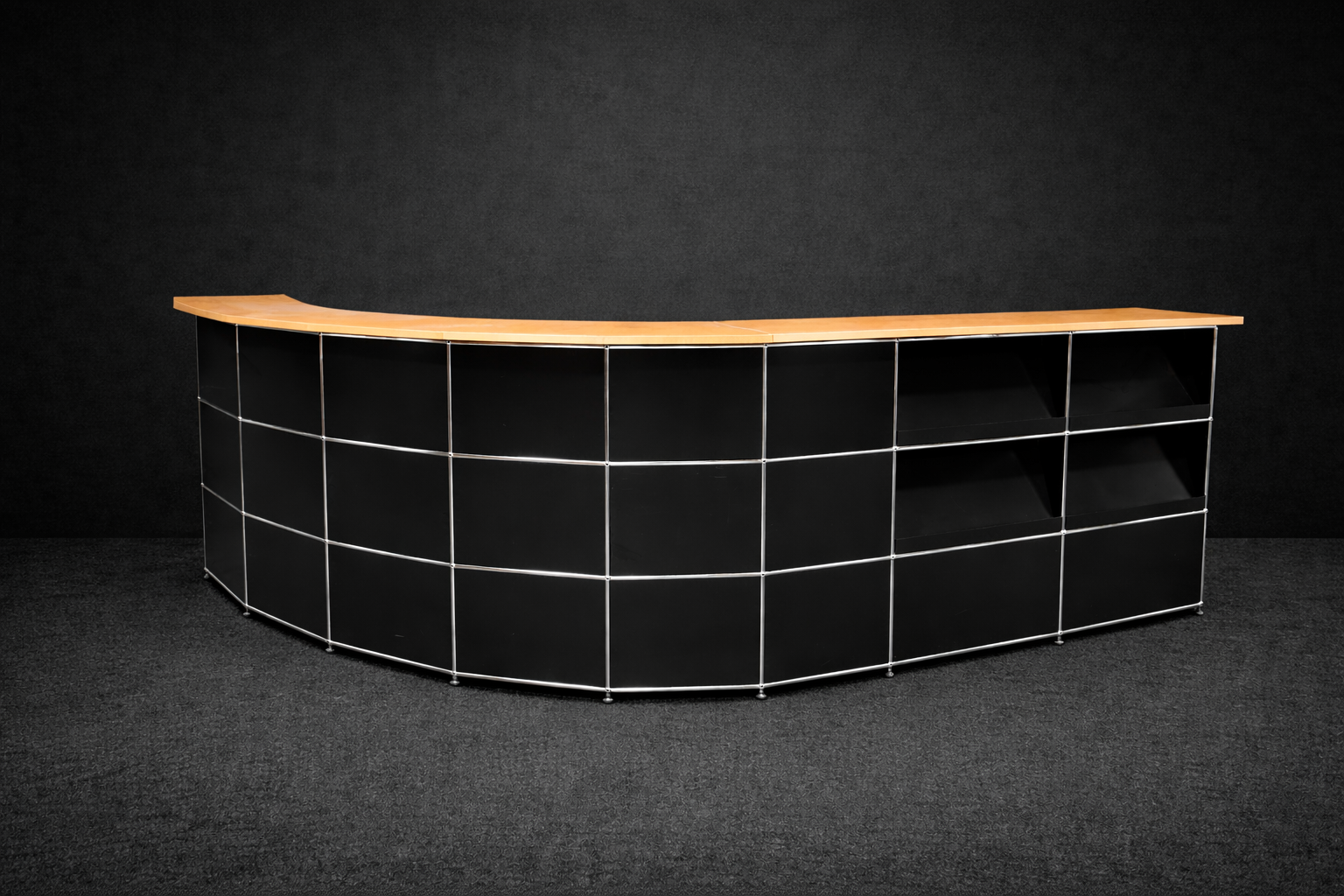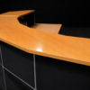 Abgerundete Thekenkonstruktion | Gestell verchromt | Korpus aus graphitschwarzem Metall | Ablagen aus Birkenholzfurnier | Frontseite mit 4 Schrägtablaren ausgestattet | Rückseite mit 8 Fächern, jeweils mit einem Tablar aus Metall oder Glas | 1 Fach mit Klapptüre versehen | H.113cm | L. ca. 470cm | B.110cm