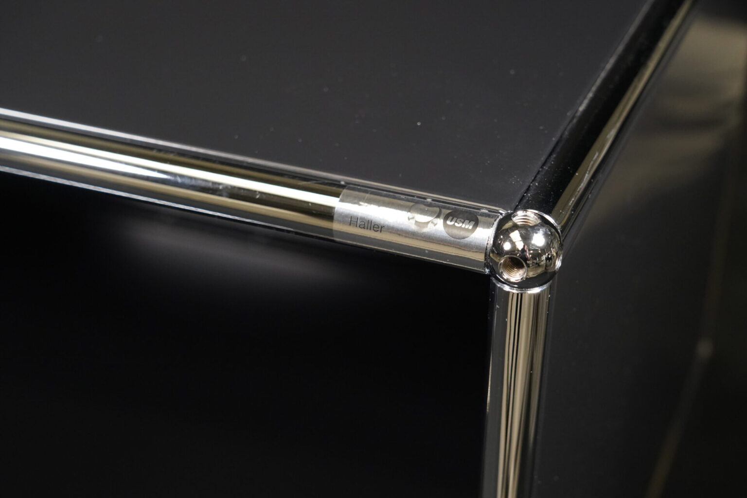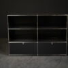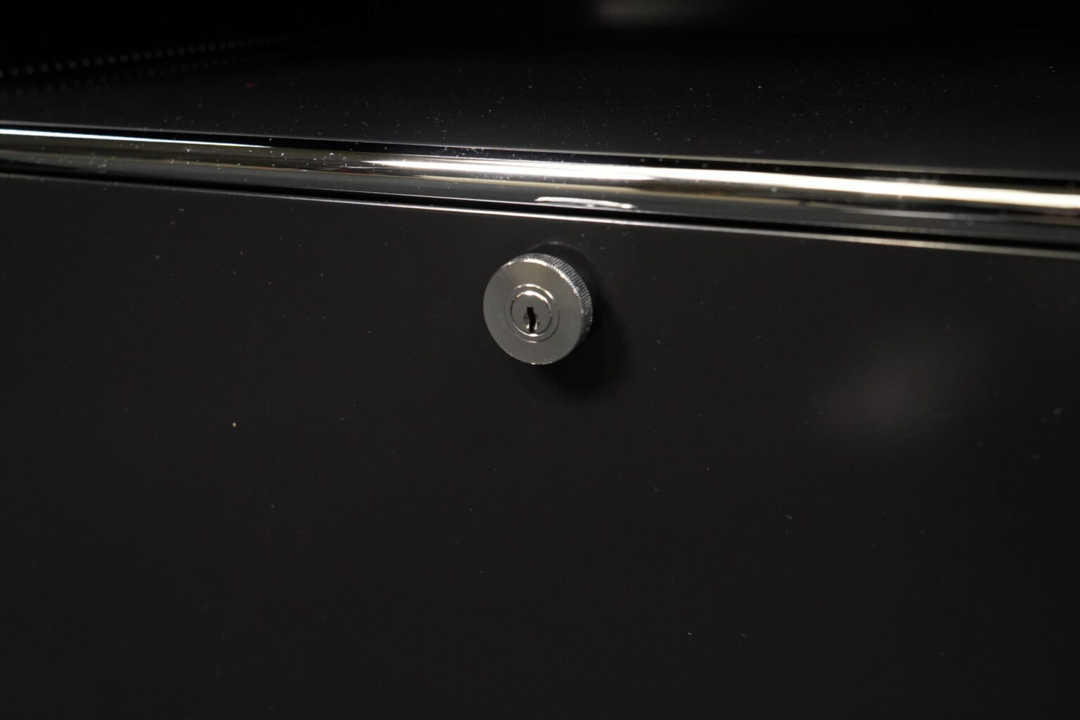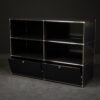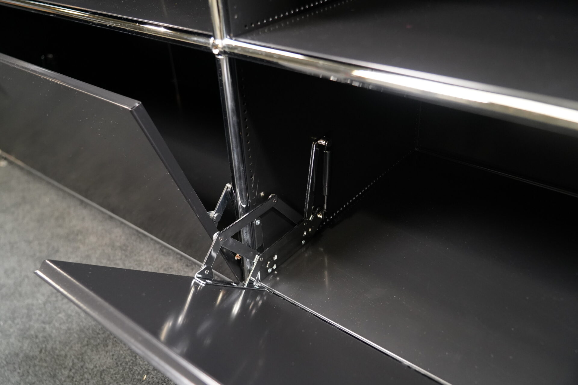 Gestell verchromt | Korpus aus schwarzem Metall | 6 Fächer | 2 Fächer mit Klapptüren mit Universalschloss | mit Herstelleretikett | H.109cm | L.153cm | B.52cm