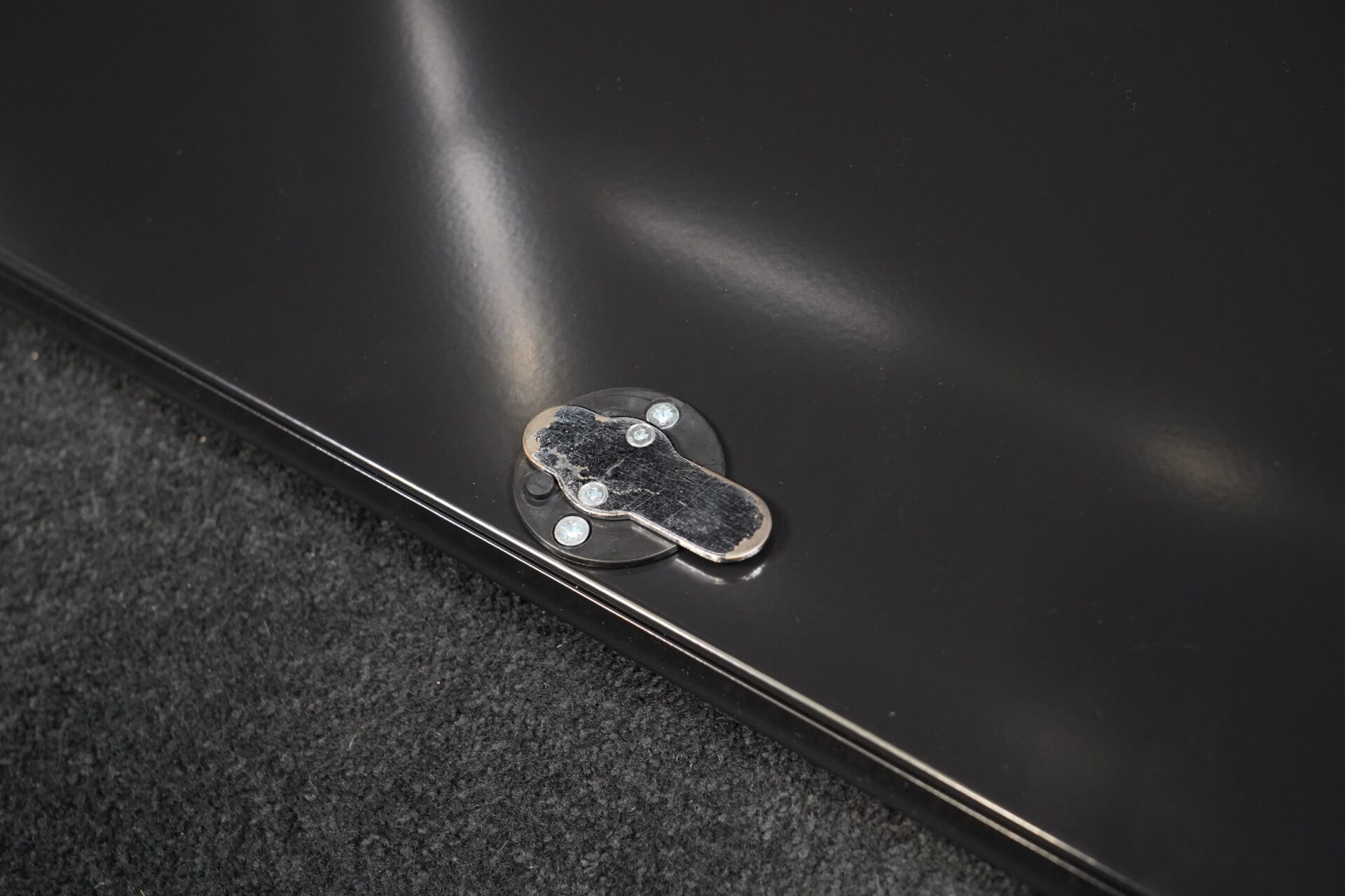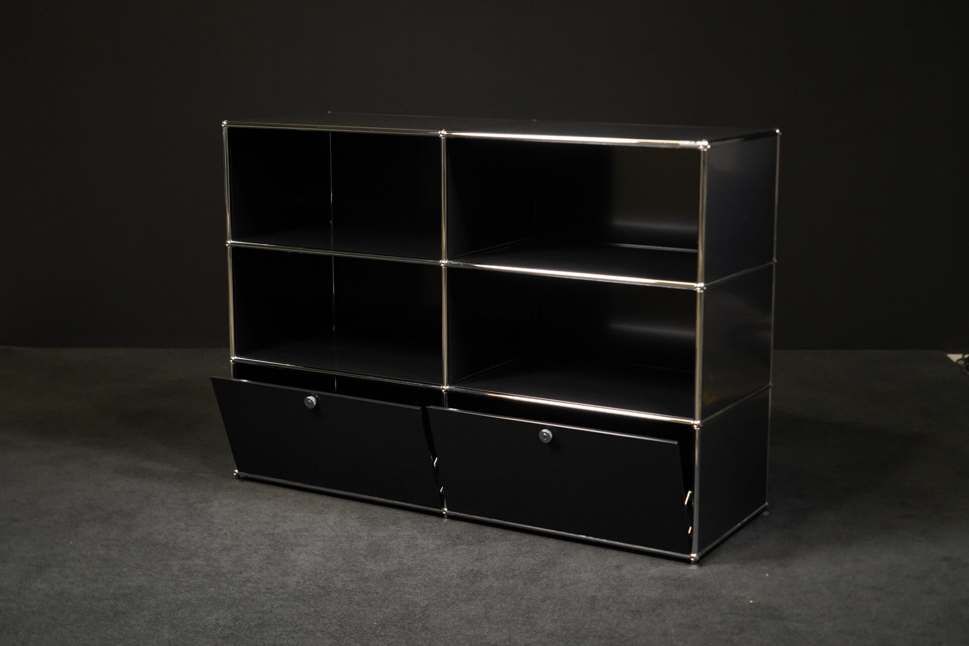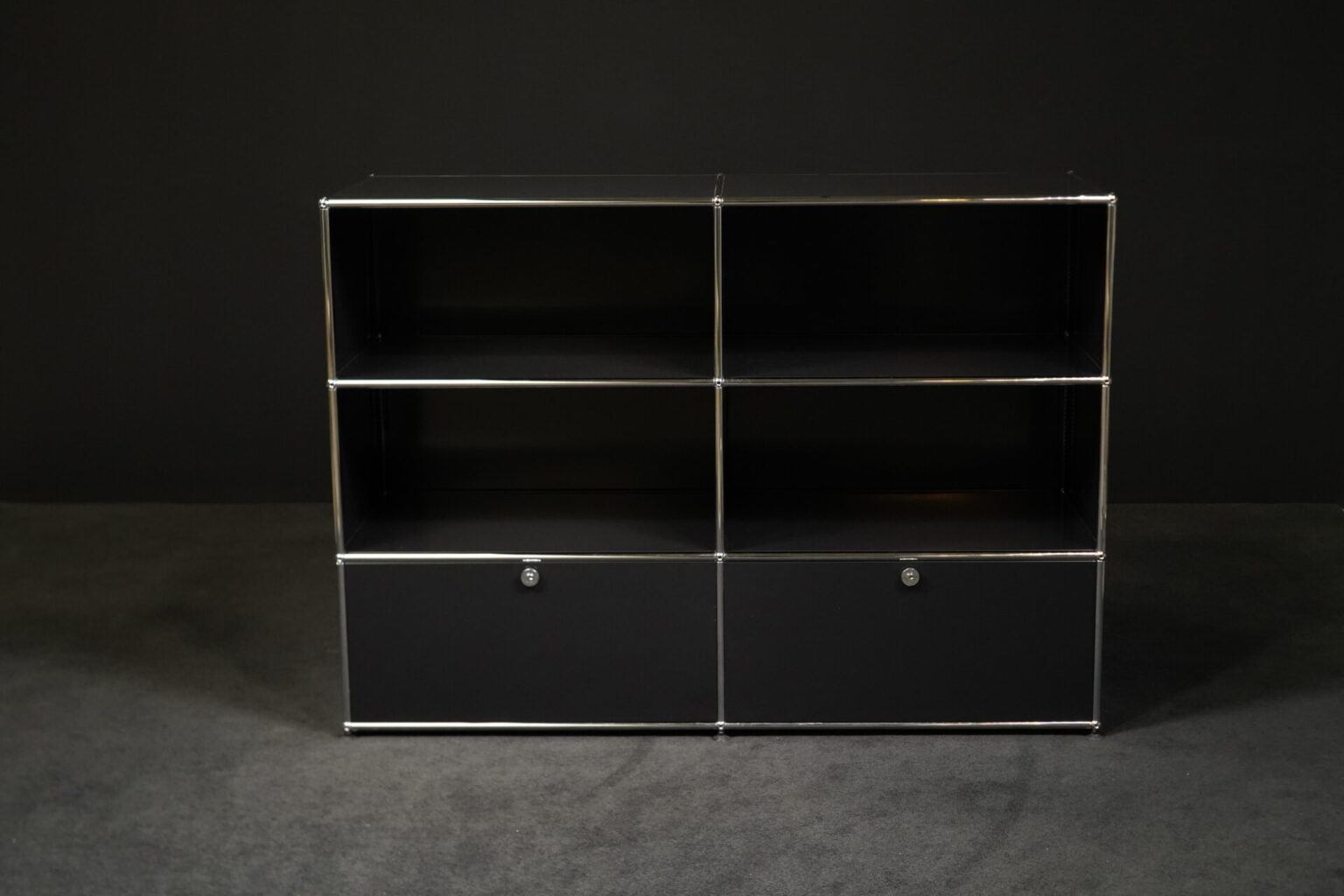 Gestell verchromt | Korpus aus schwarzem Metall | 6 Fächer | 2 Fächer mit Klapptüren mit Universalschloss | mit Herstelleretikett | H.109cm | L.153cm | B.52cm