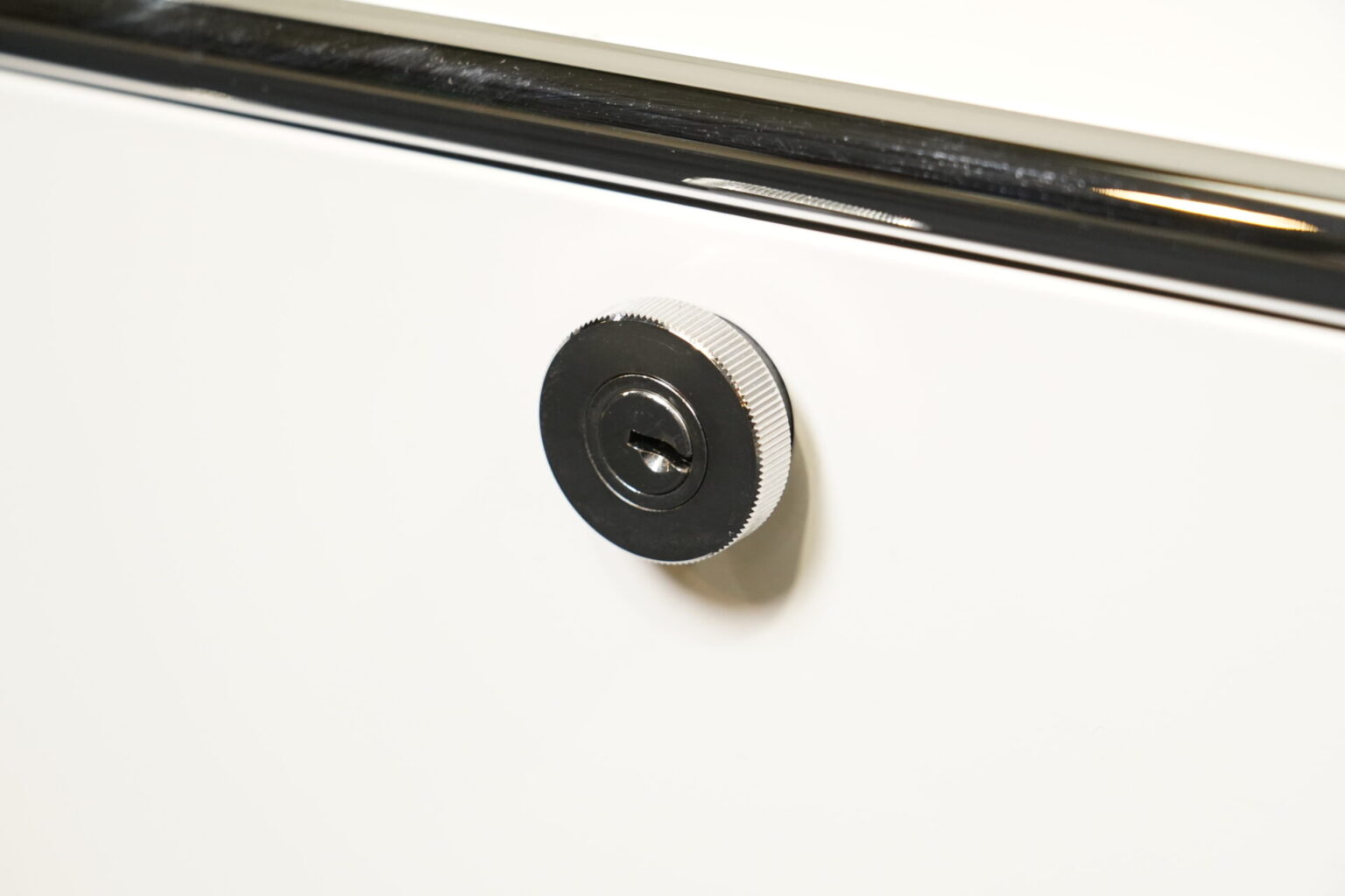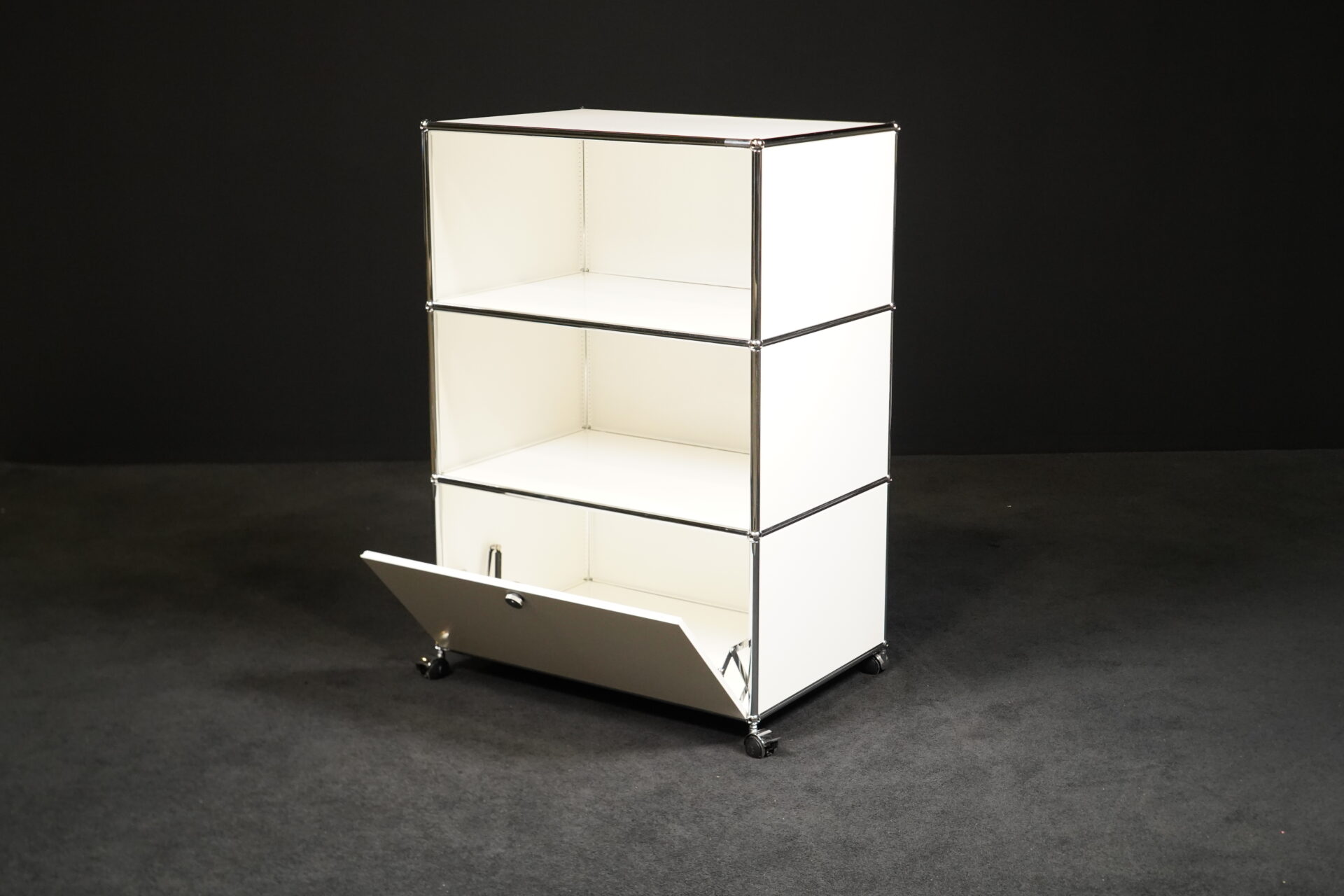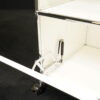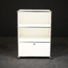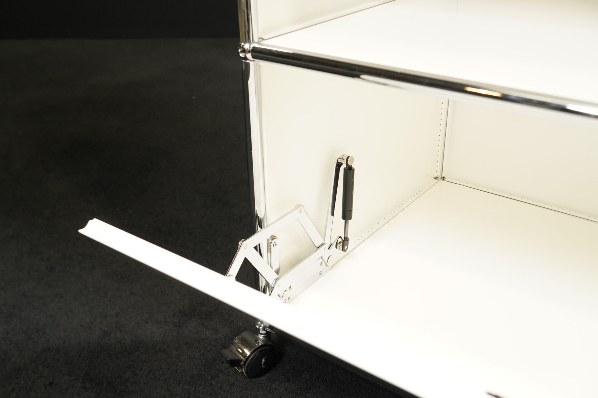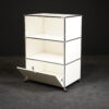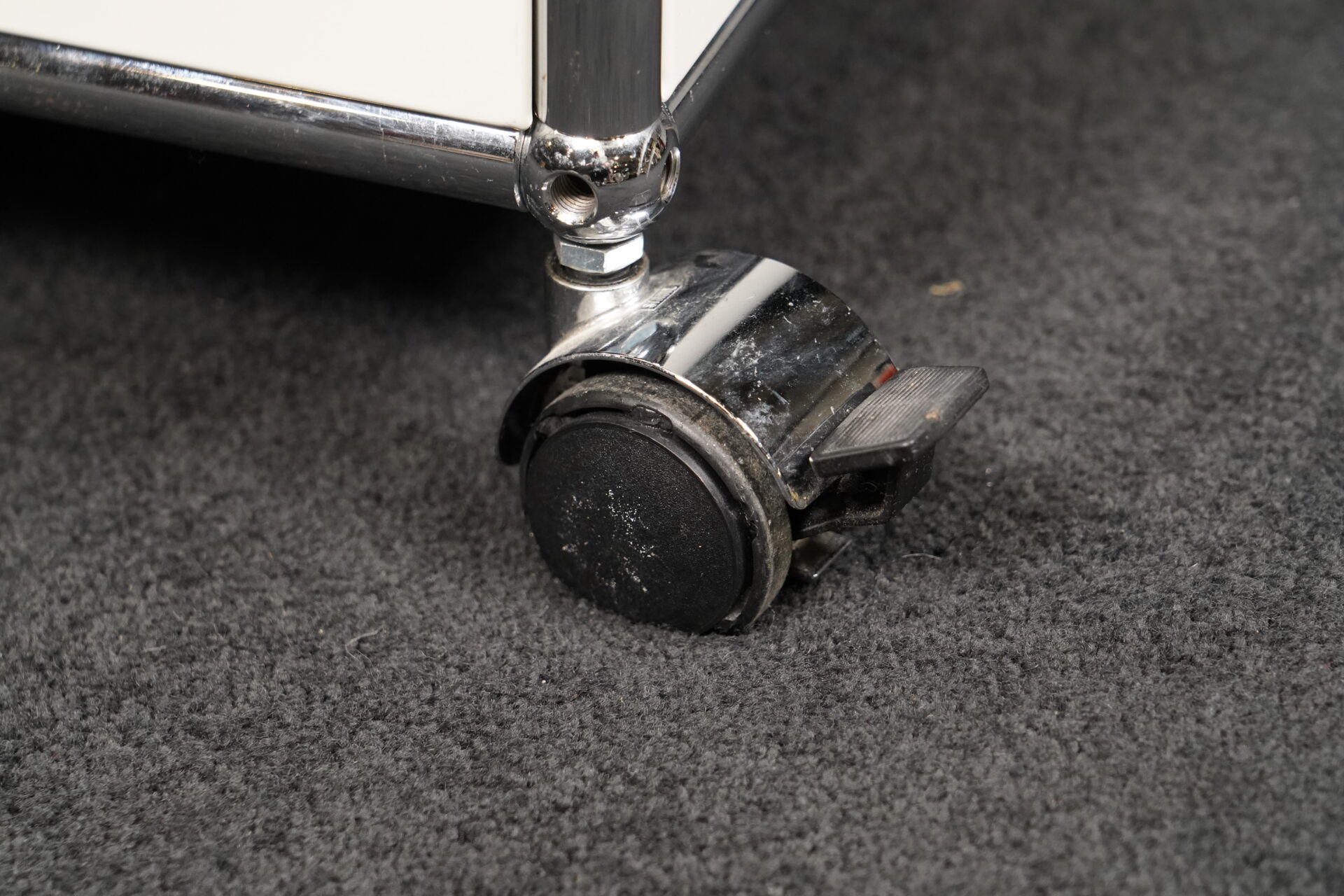 Gestell verchromt | Korpus aus weißem Metall | 3 Fächer | unteres Fach mit Klapptüre mit Schloss | auf Rollen | mit Herstellerbezeichnung | H.113cm | B.77cm | T.52cm