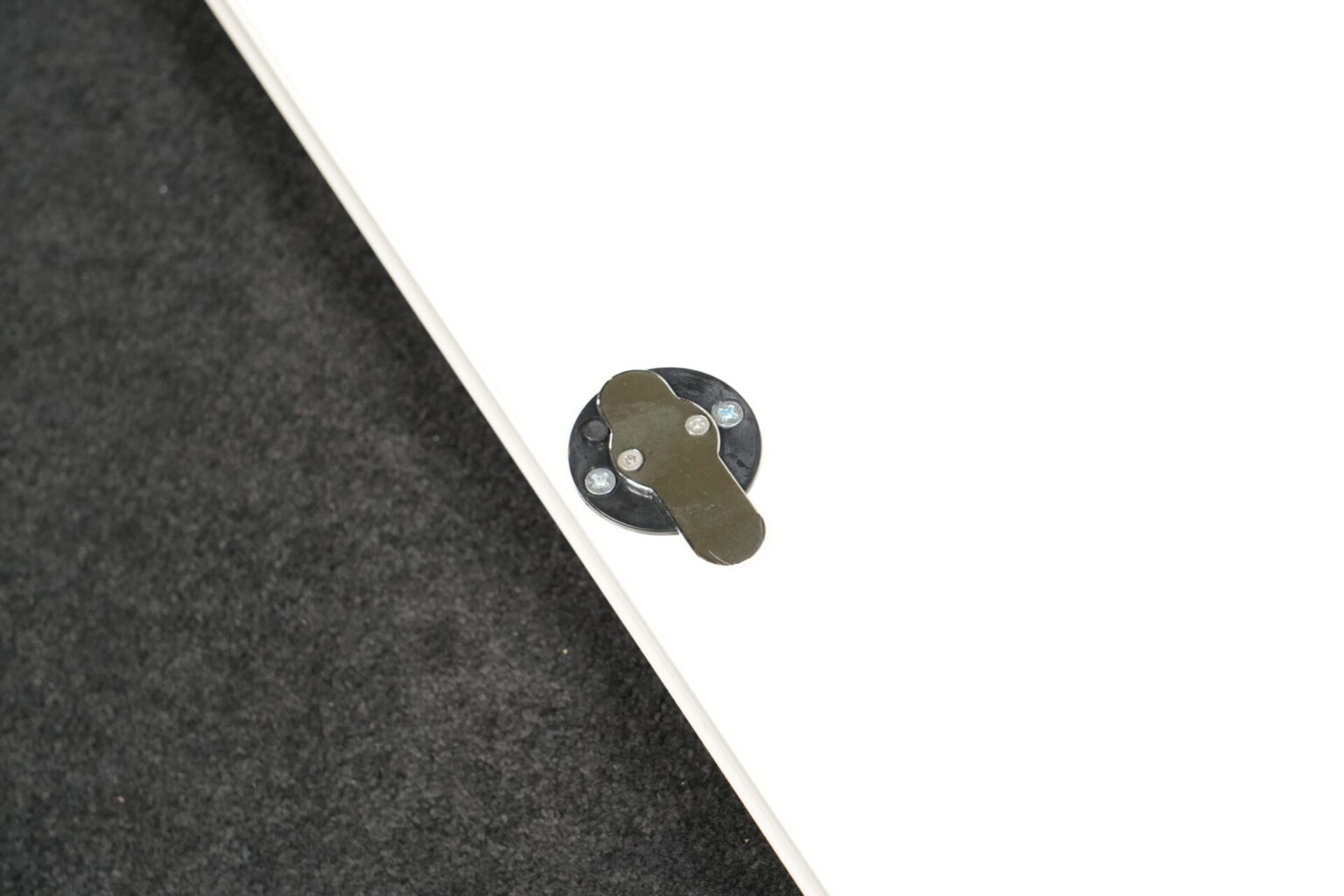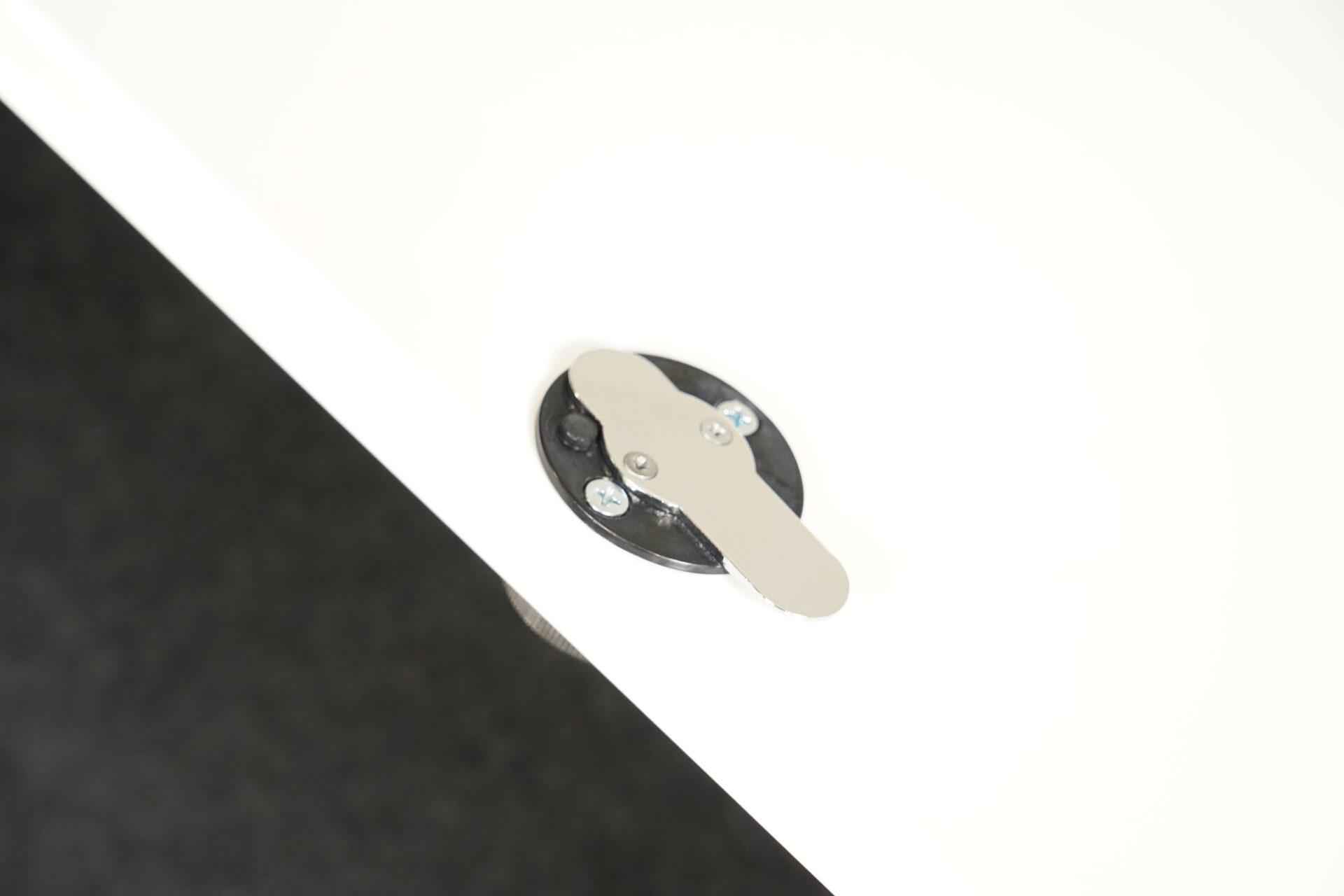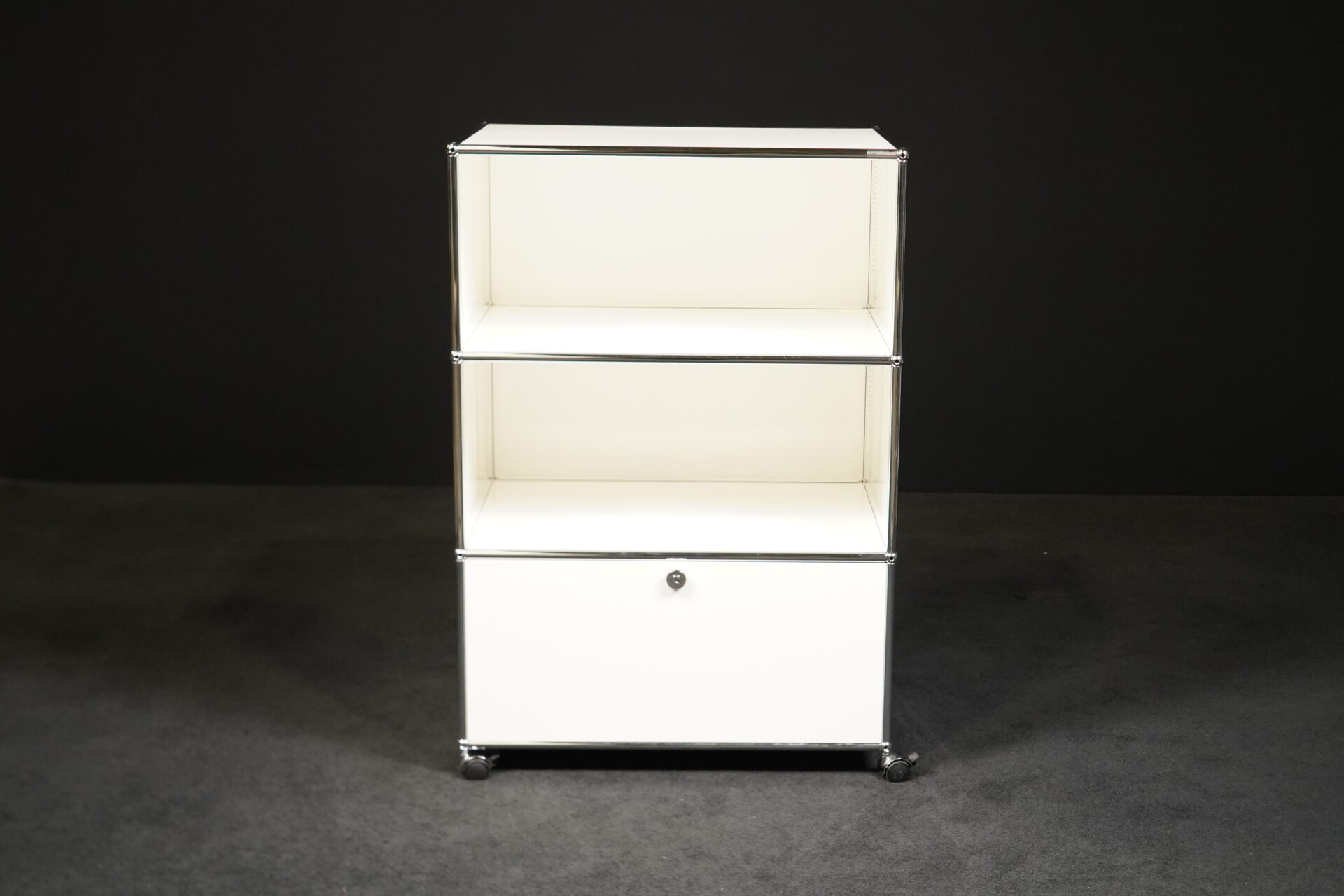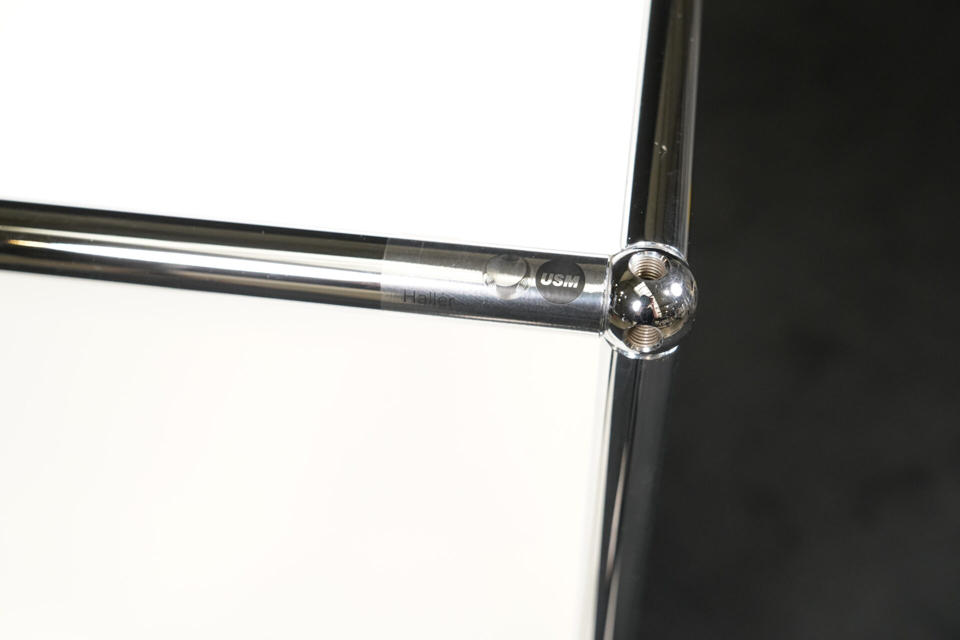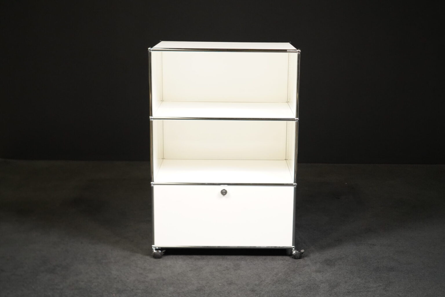 Gestell verchromt | Korpus aus weißem Metall | 3 Fächer | unteres Fach mit Klapptüre mit Schloss | auf Rollen | mit Herstellerbezeichnung | H.113cm | B.77cm | T.52cm