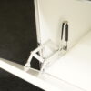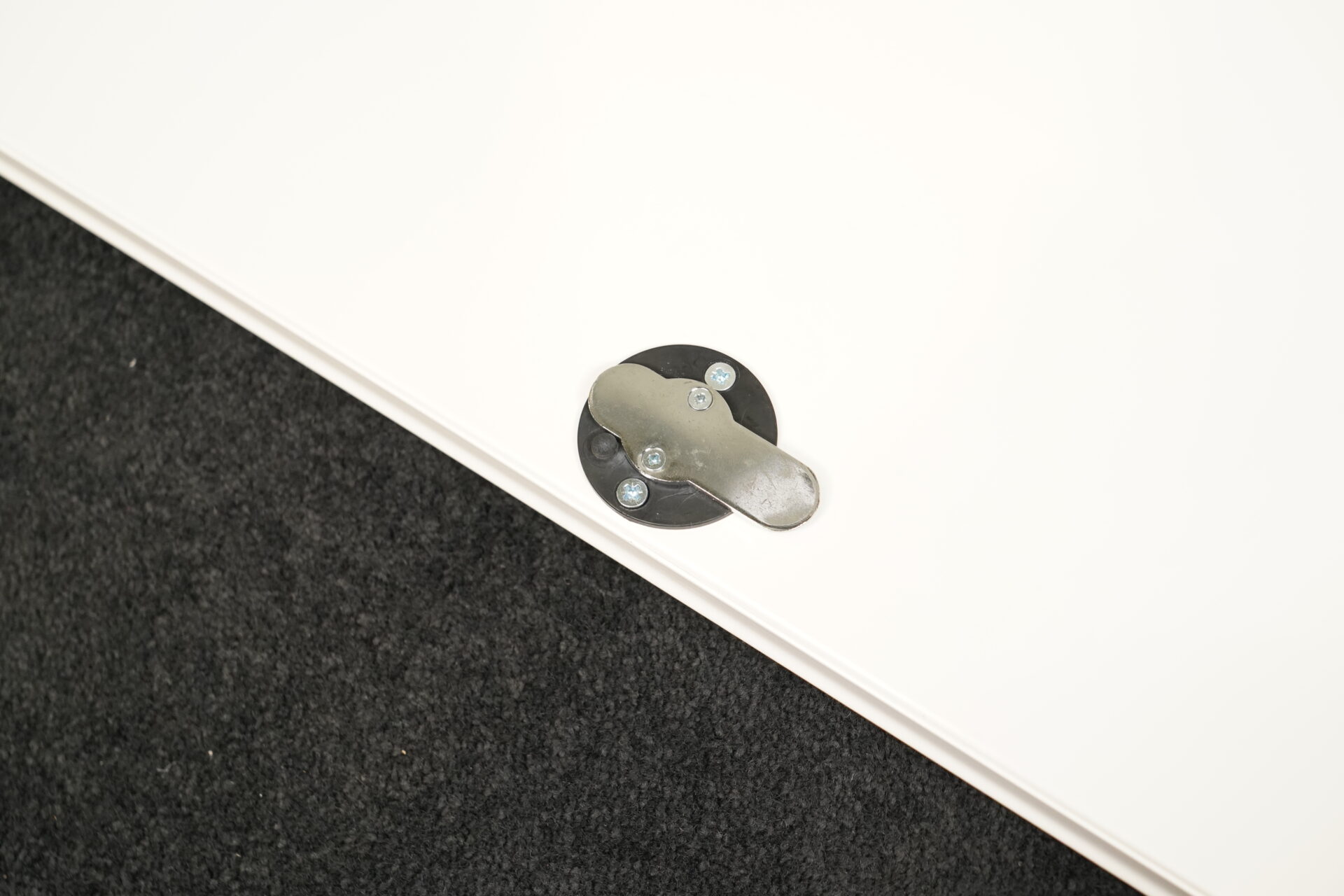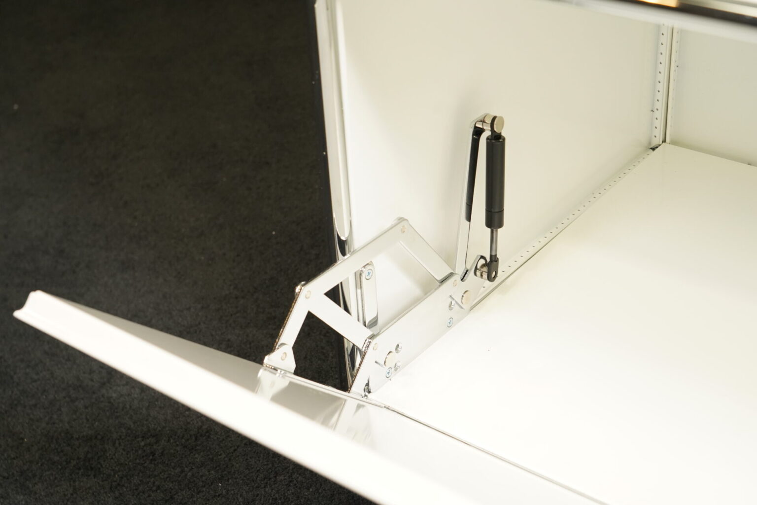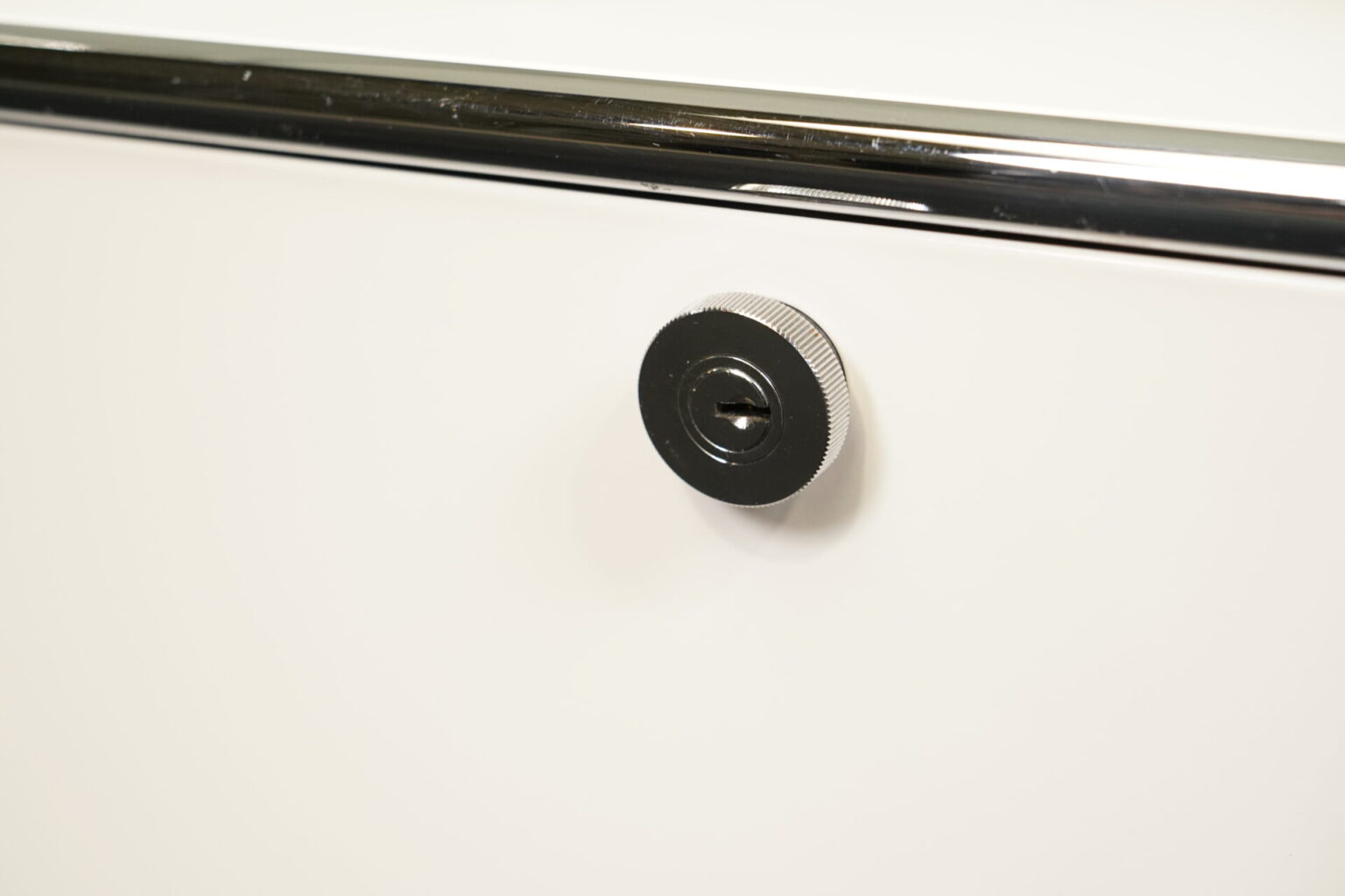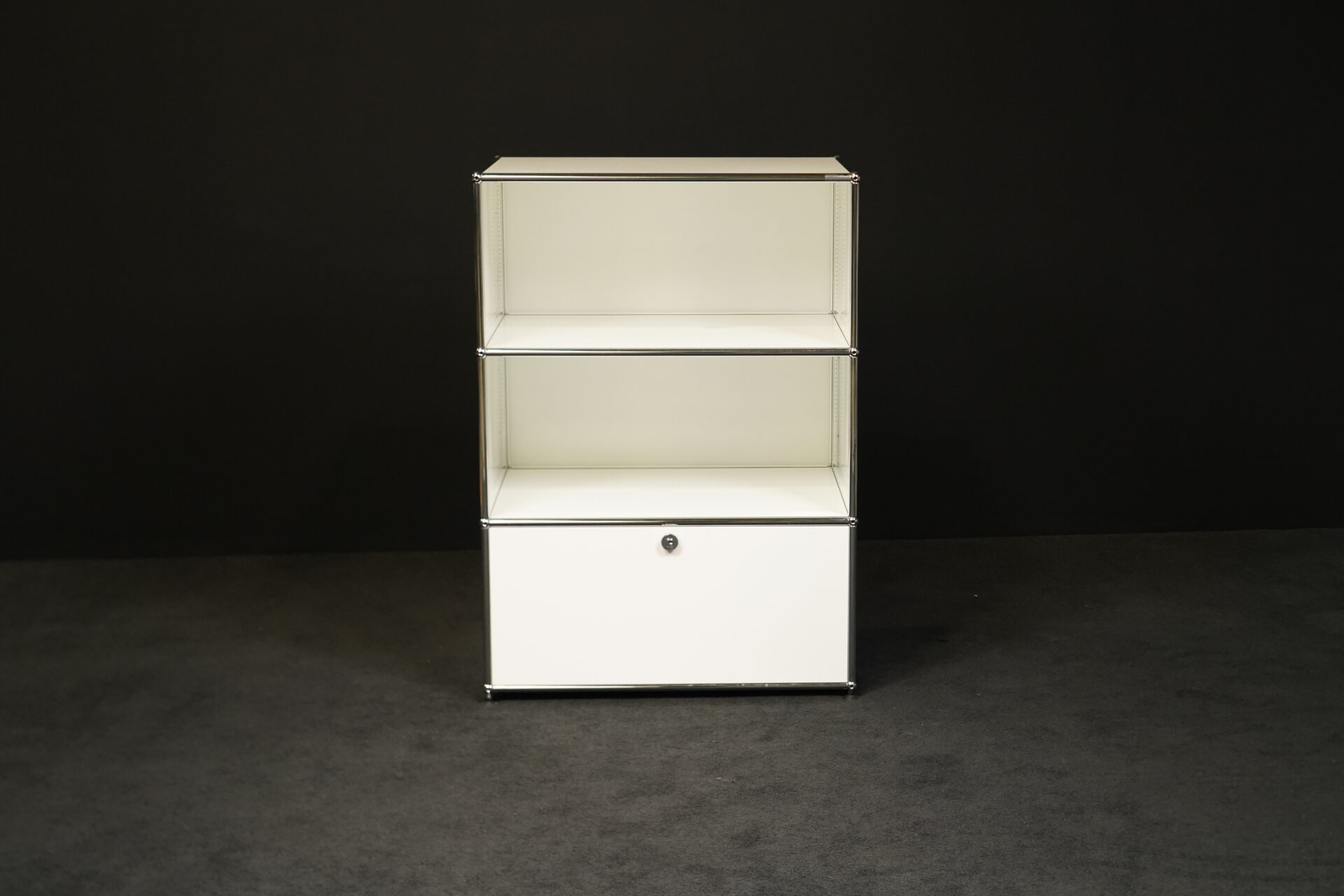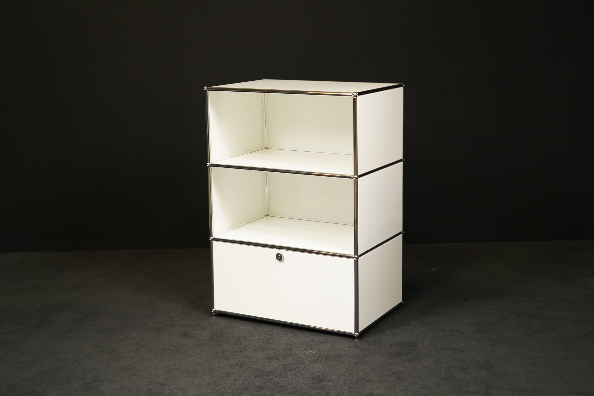 Gestell verchromt | Korpus aus weißem Metall | mit 3 Fächern | 1 Fach mit Klapptüre und Universalschloss | auf Füßen | mit Herstellerbezeichnung| H.109cm | B.75cm | T.50cm