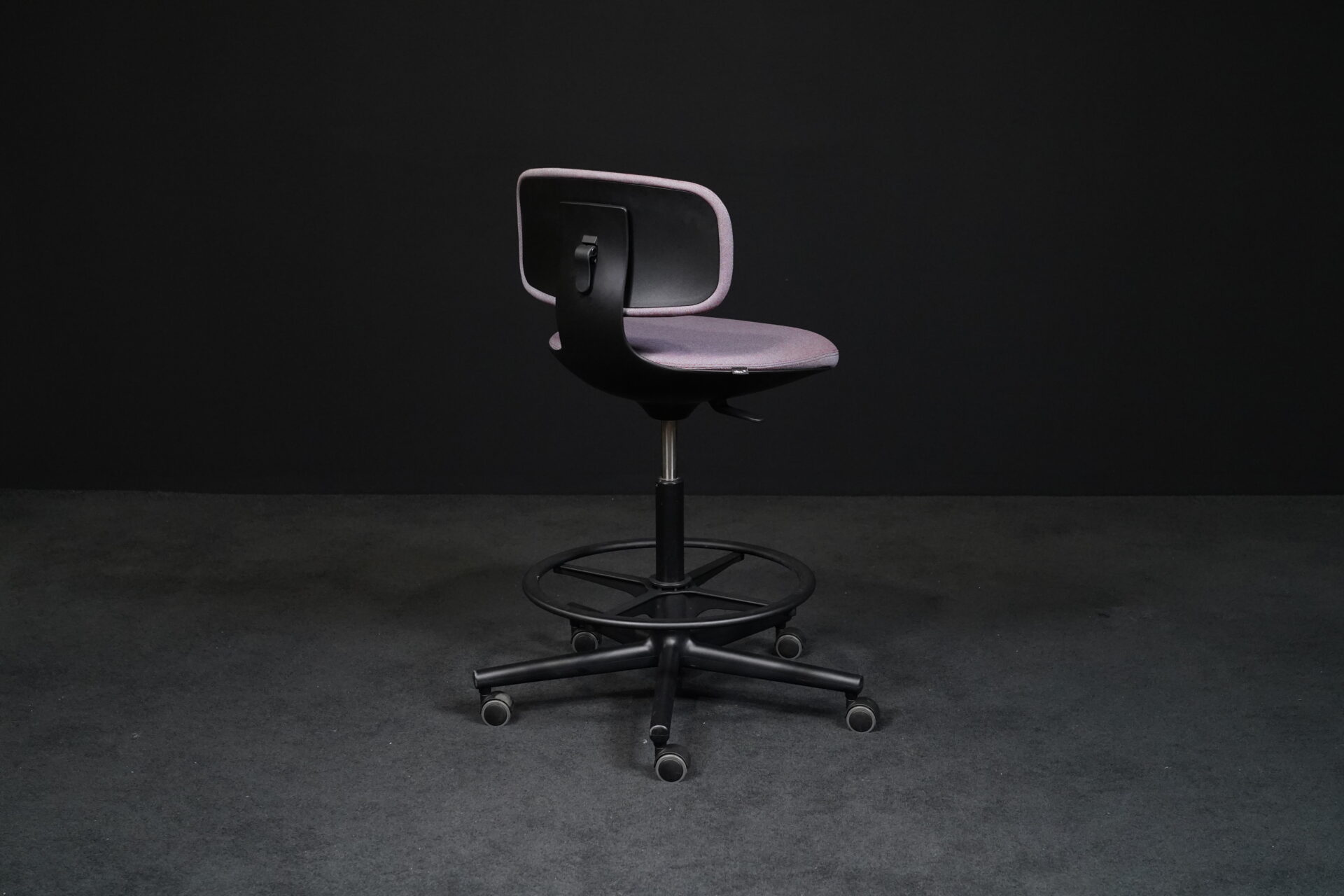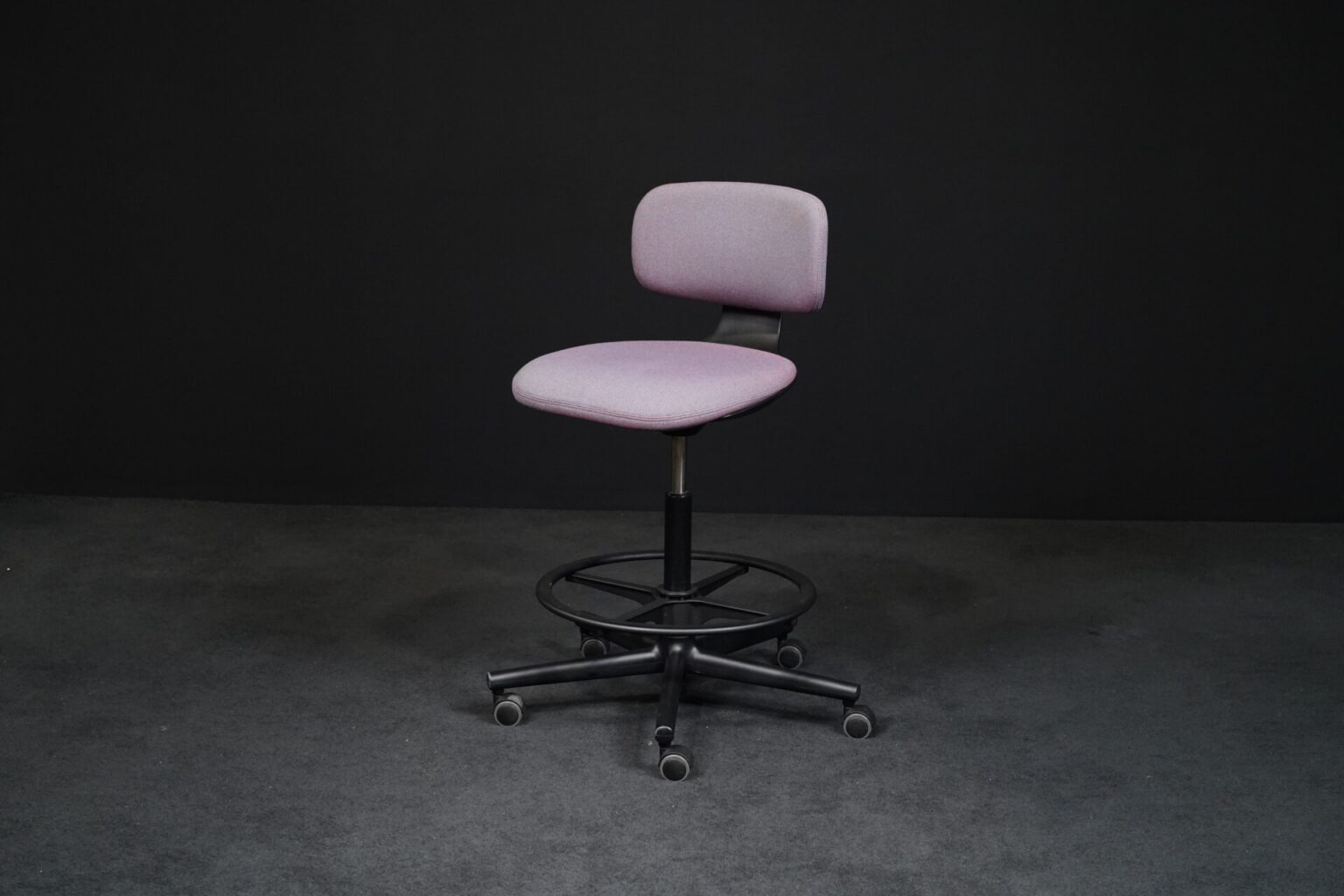 Sitzfläche mit violett-grau meliertem Hopsakstoff | Gestell aus schwarzem Kunststoff | 5-Sternfuß auf Rollen | höhenverstellbar | drehbar | mit Herstellerbezeichnung | H.99-120cm | Sitzhöhe: 70-91cm | B.69cm | T.69cm