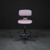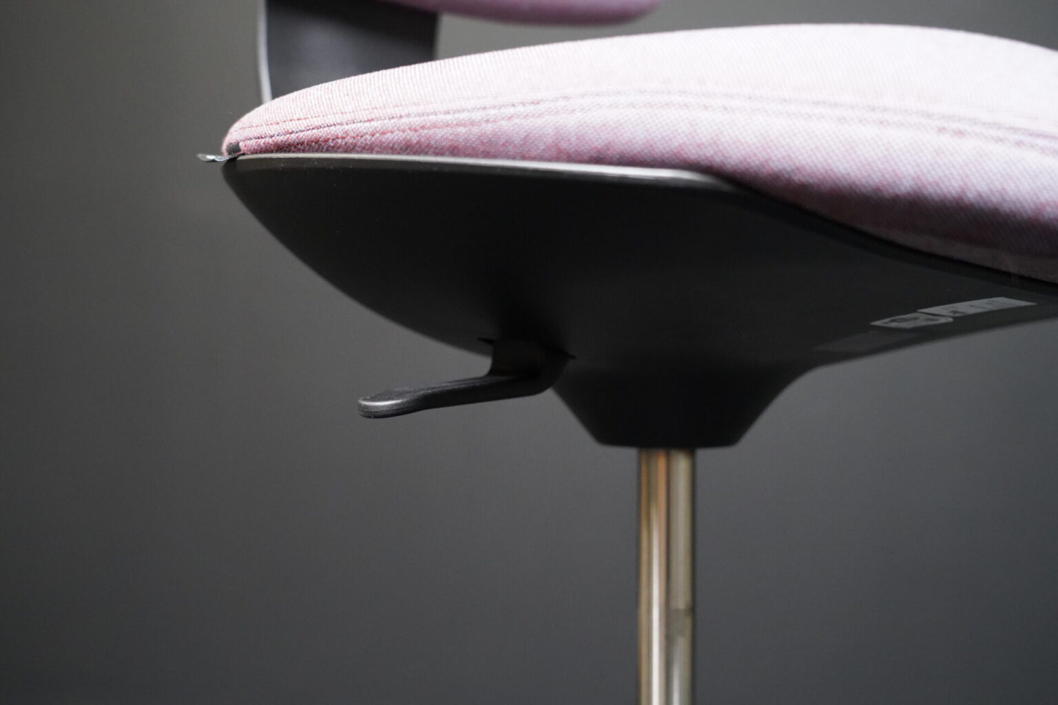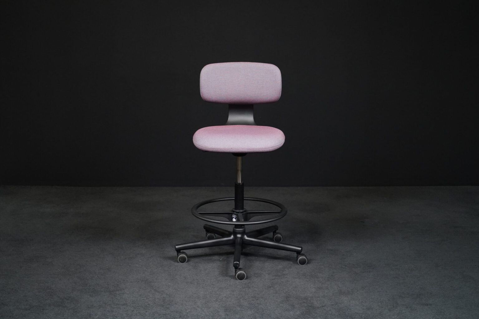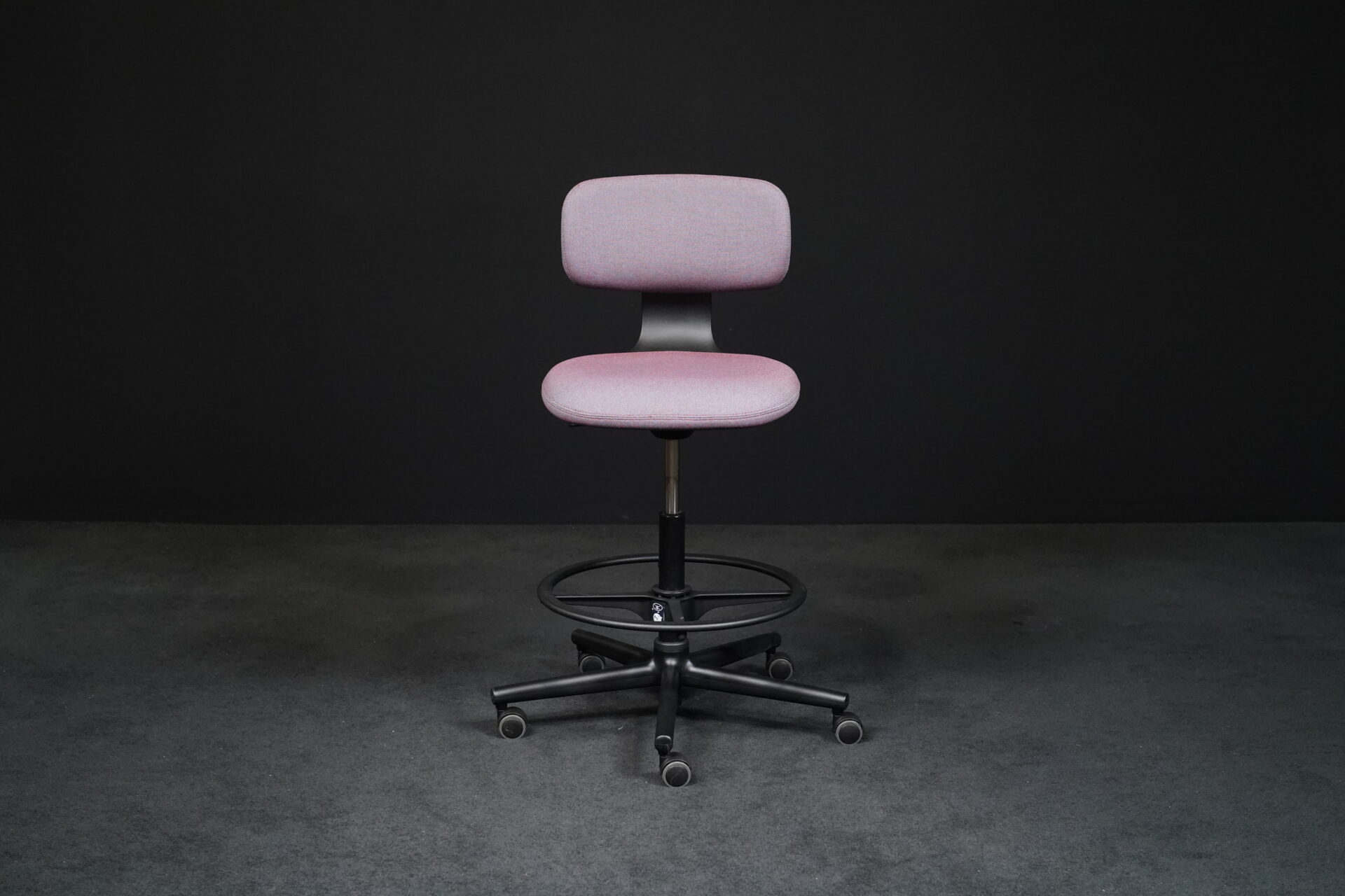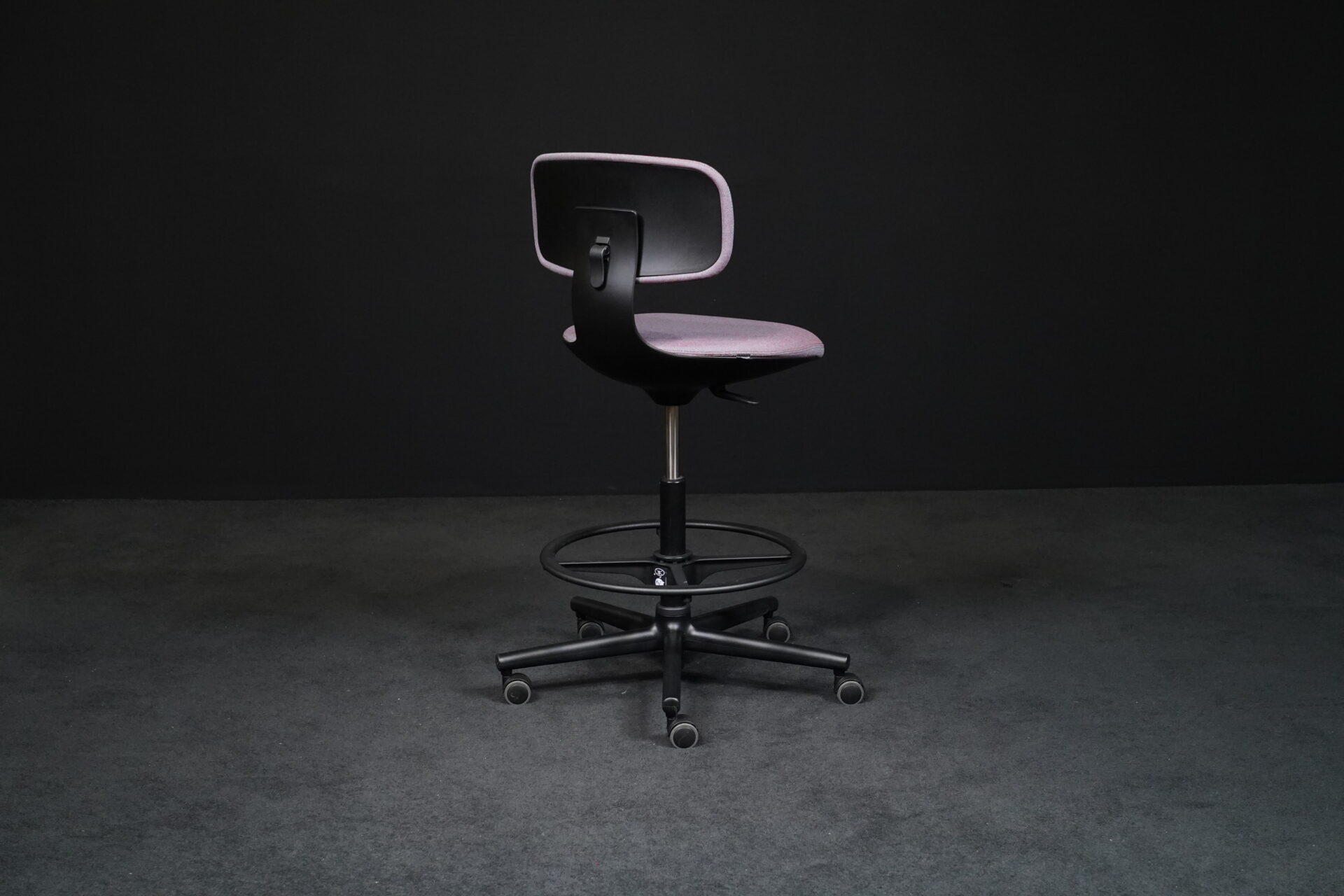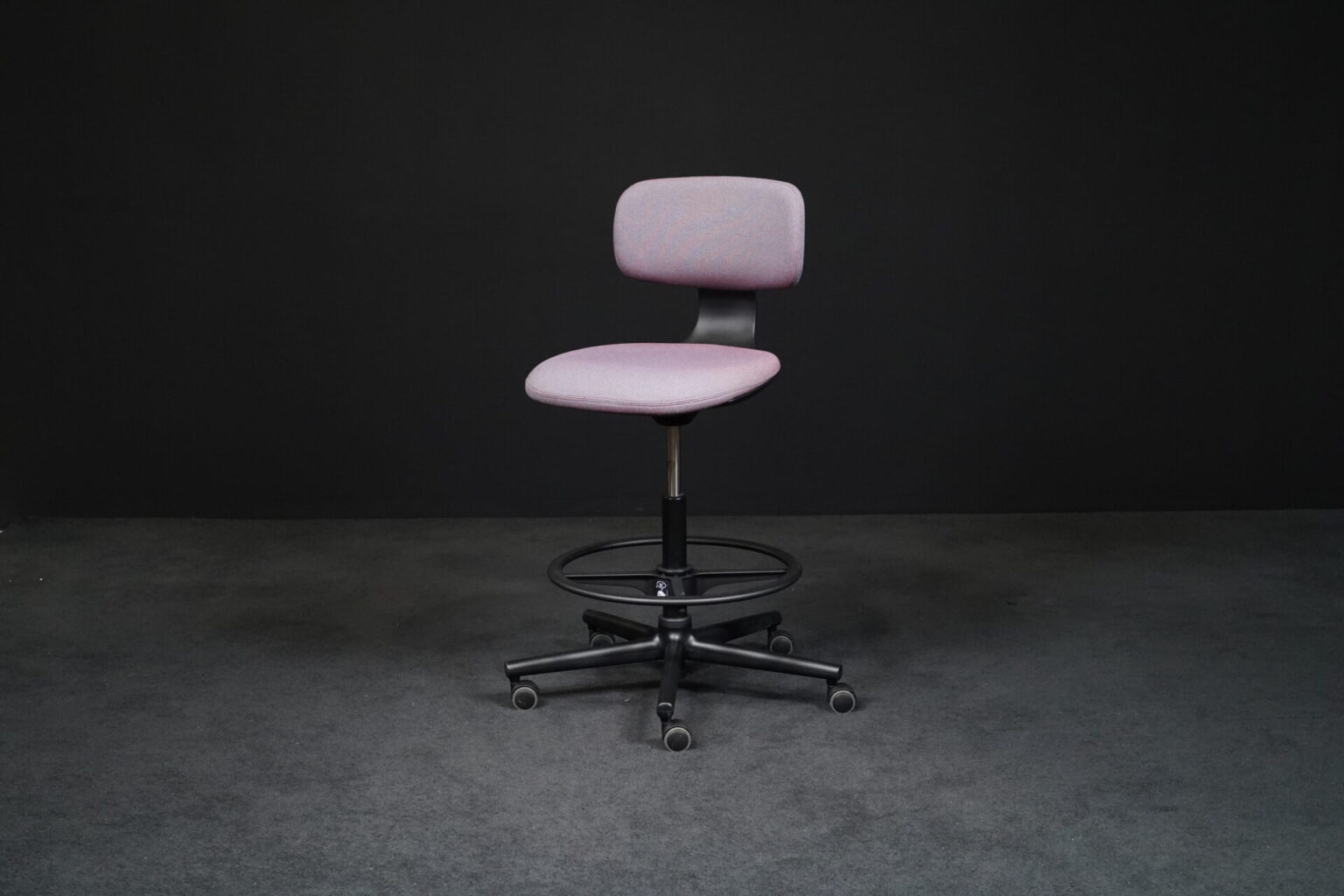 Sitzfläche mit violett-grau meliertem Hopsakstoff | Gestell aus schwarzem Kunststoff | 5-Sternfuß auf Rollen | höhenverstellbar | drehbar | mit Herstellerbezeichnung | H.99-120cm | Sitzhöhe: 70-91cm | B.69cm | T.69cm