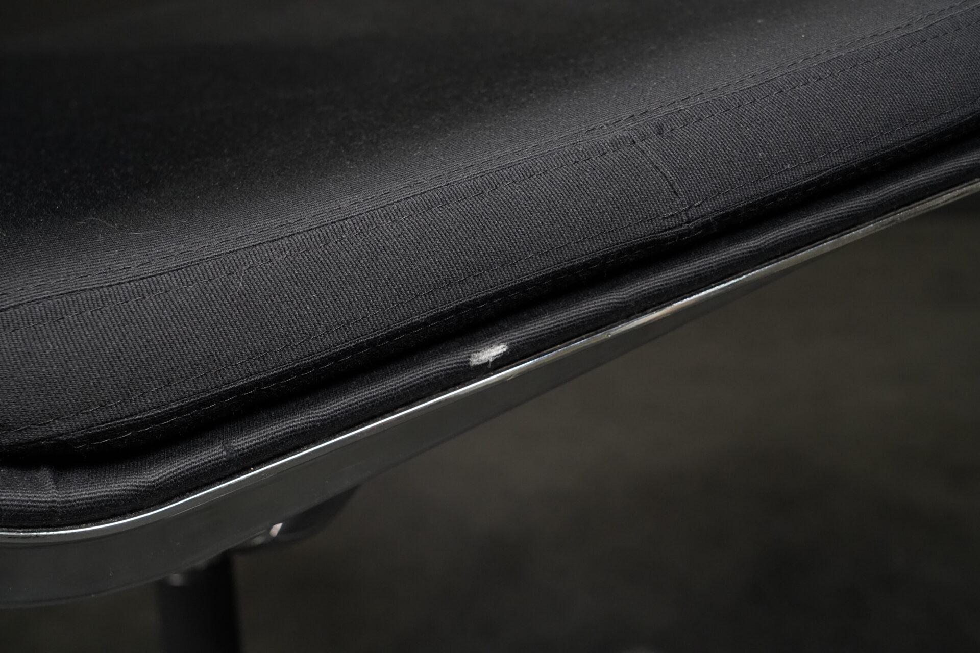 Gestell aus poliertem Aluminium | 4-Sternfuß | Sitz- und Rückenfläche aufgepolstert und aus schwarzem Stoff | mit Herstelleretikett | H.83cm | Sitzhöhe: 83cm | B.50cm | T.53cm