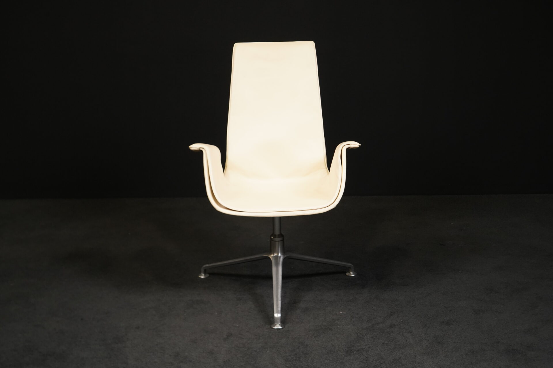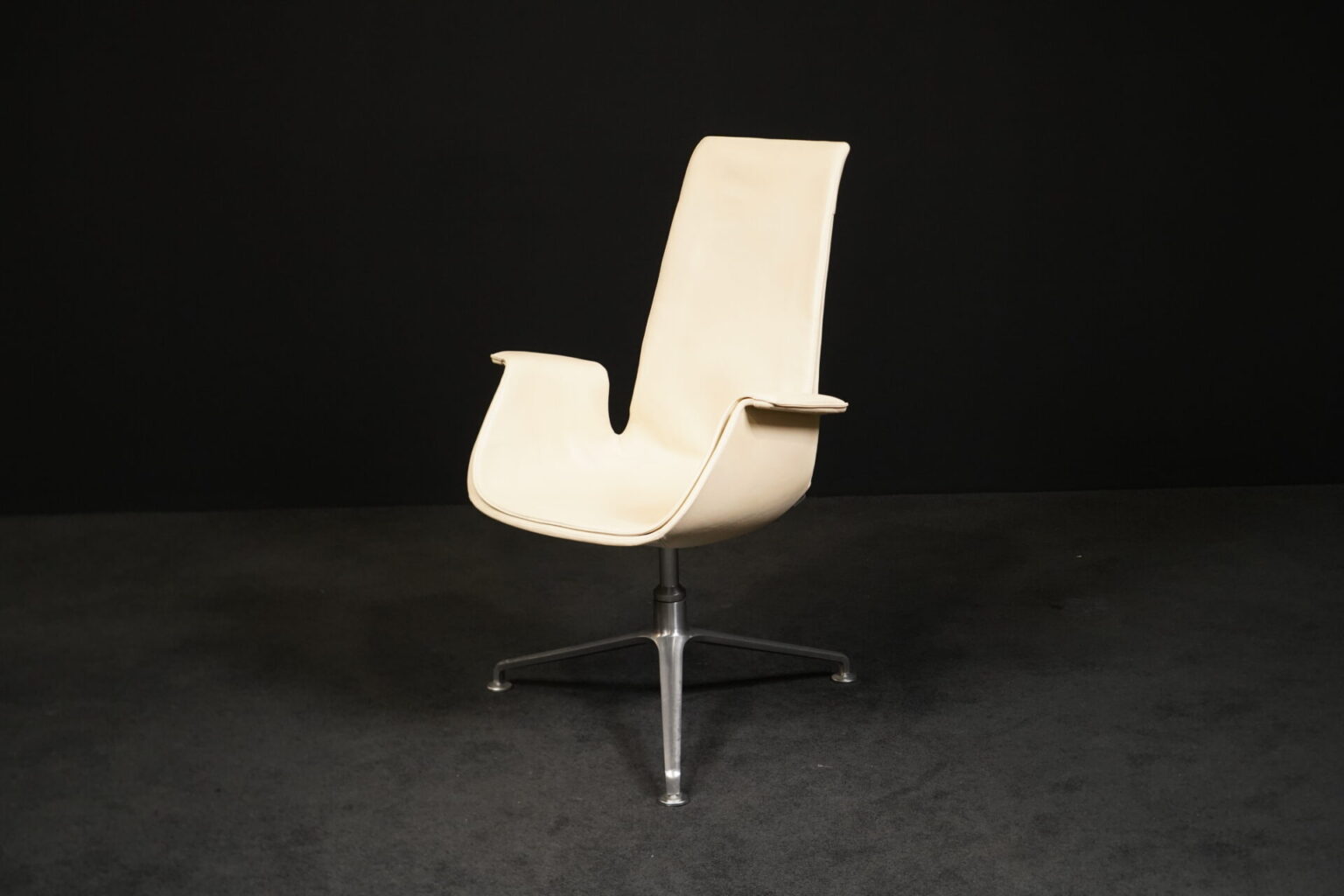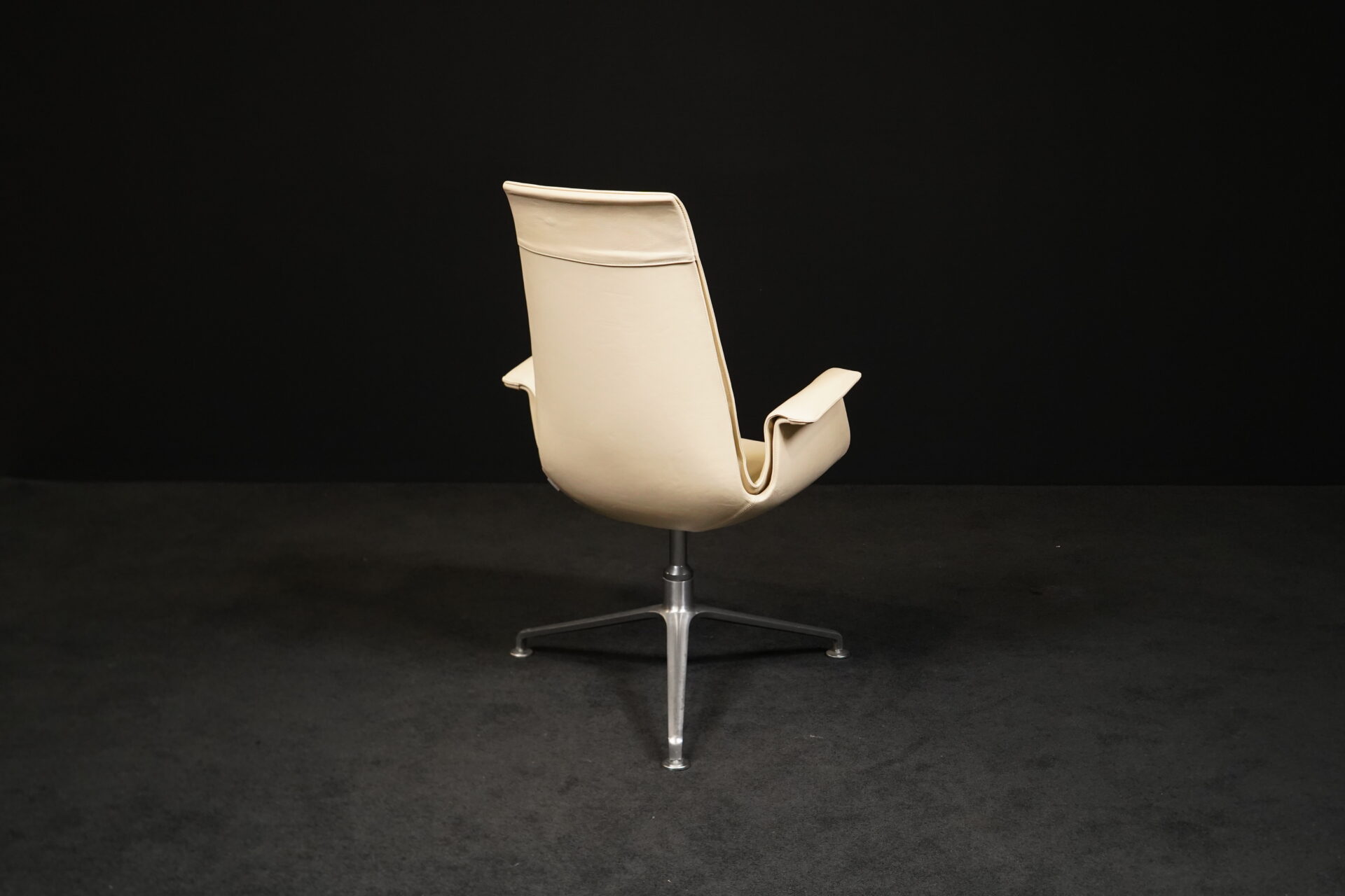 Aufgepolsterter Drehsessel aus Leder in Creme / Vanille | 3-Sternfuß aus poliertem Aluminium | mit Armlehnen | mit Herstellerbezeichnung | H.104cm | B.70cm | 72cm