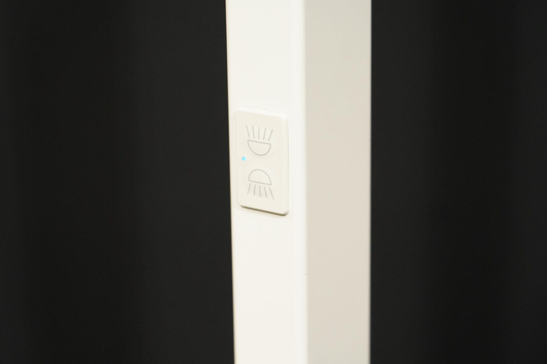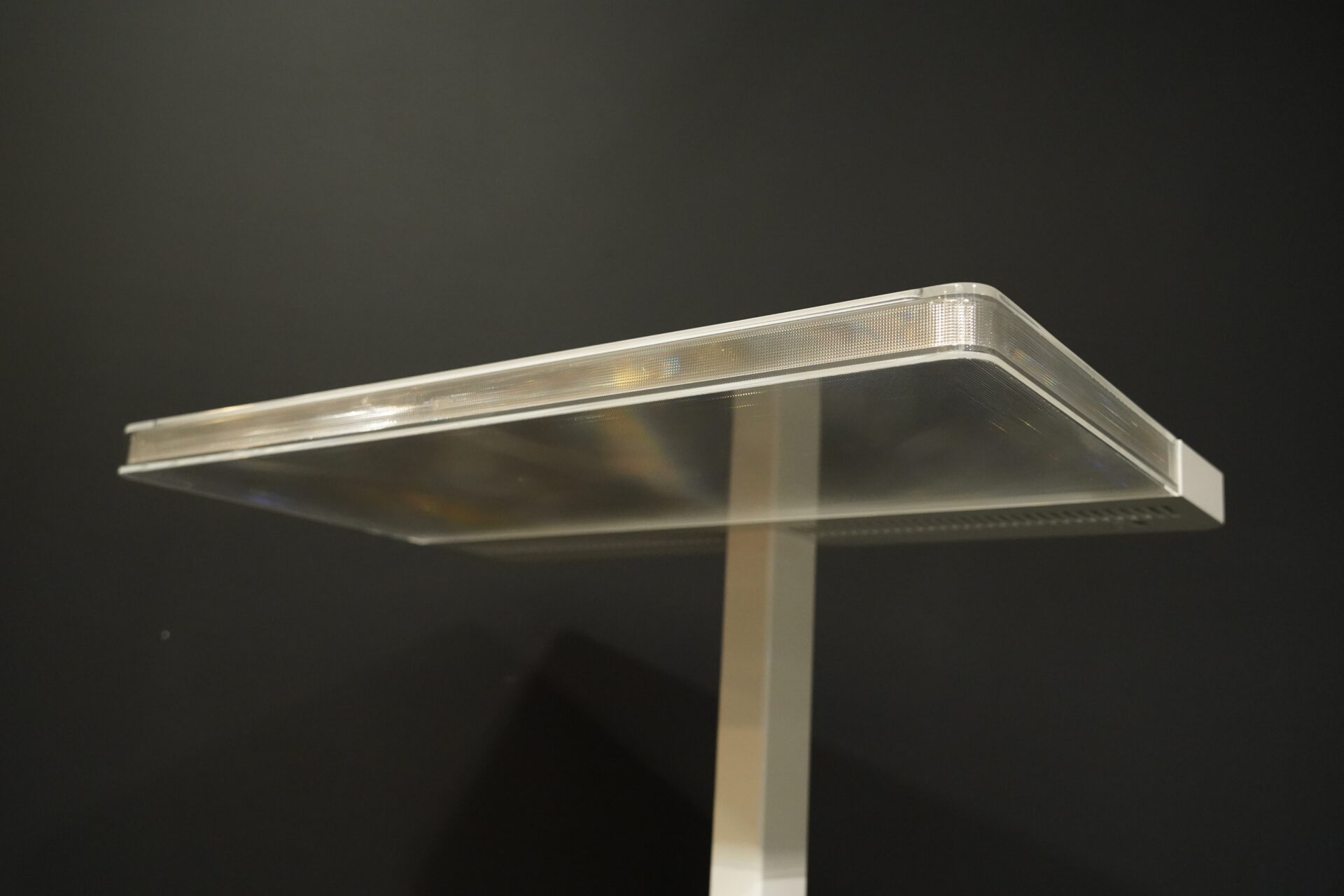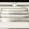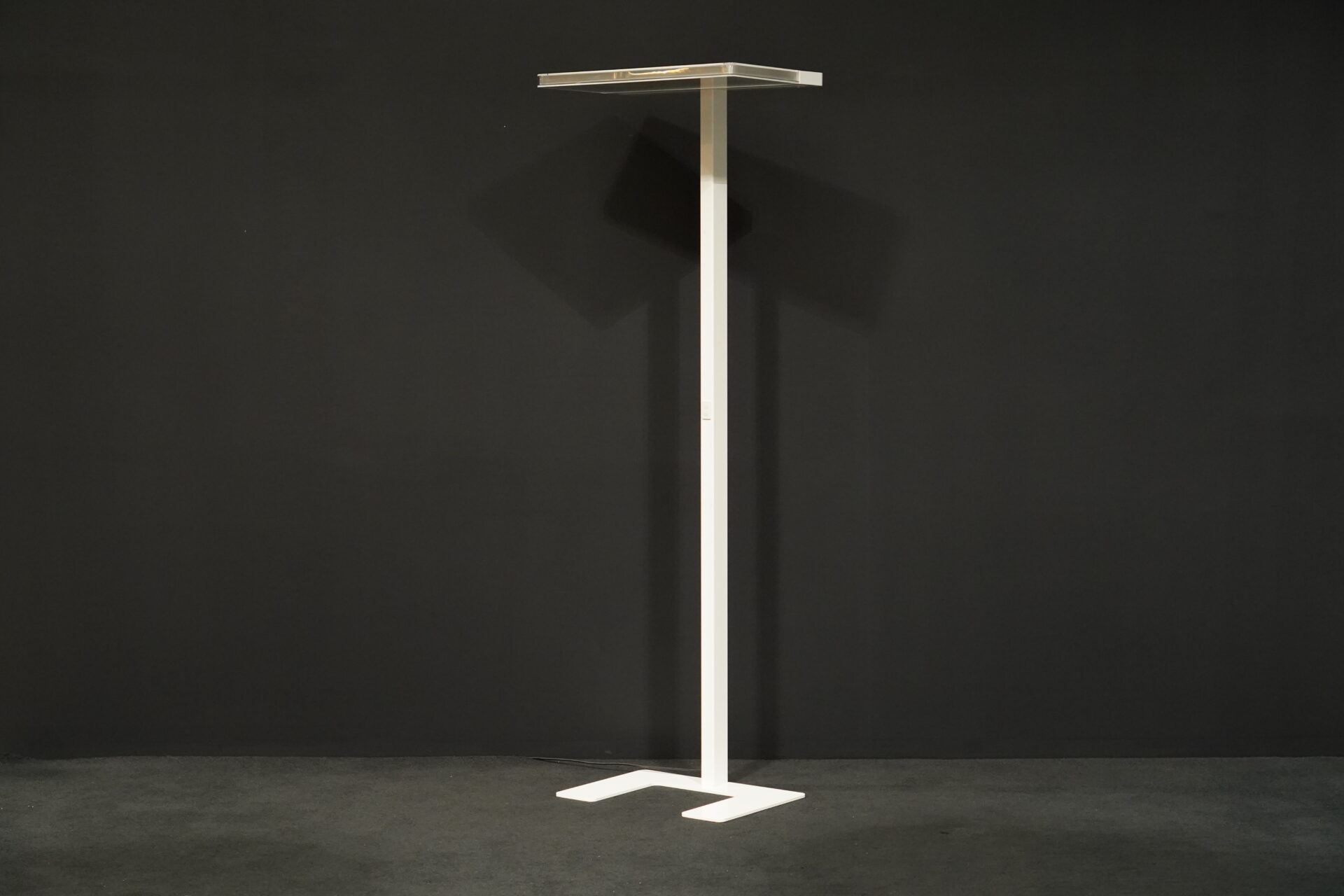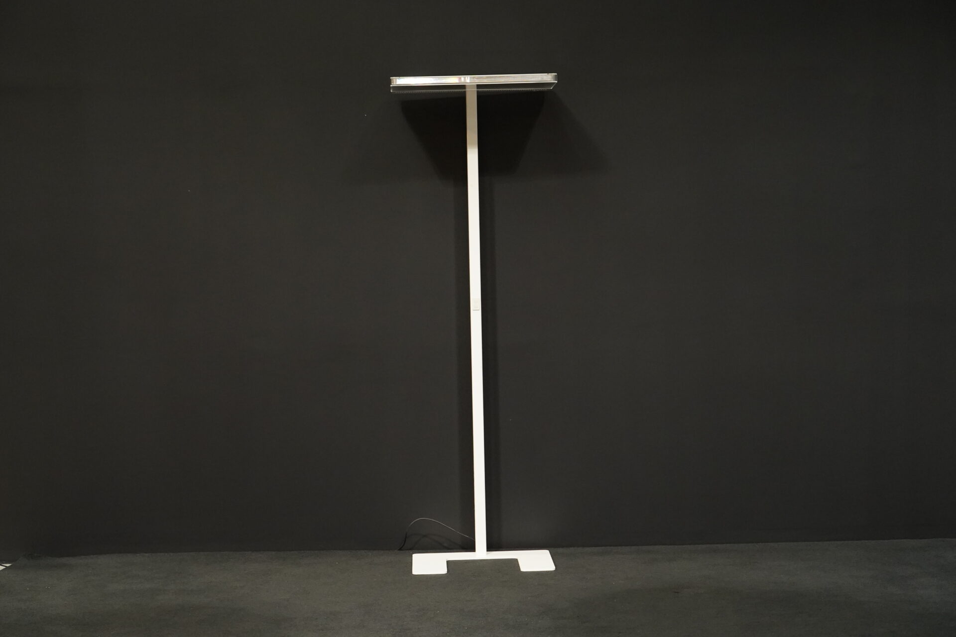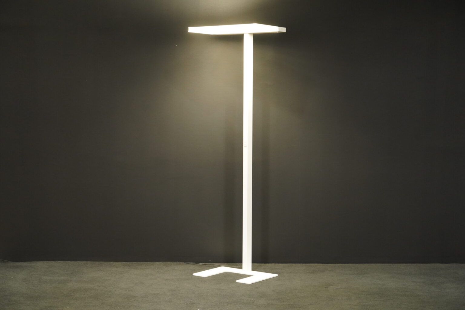 Stehlampe mit einem Gestell aus weißem Metall | mit rechteckiger LED – Leuchtplatte | strahlt nach oben und nach unten aus | Dimmbar | EU-Stecker | mit Herstellerbezeichnung | H.195cm |B.65cm | T.42cm