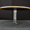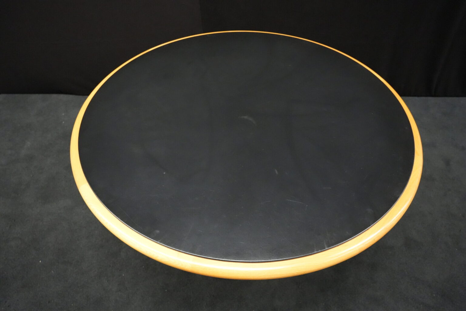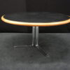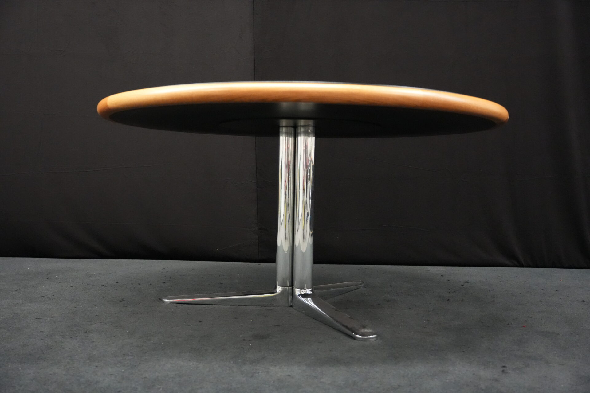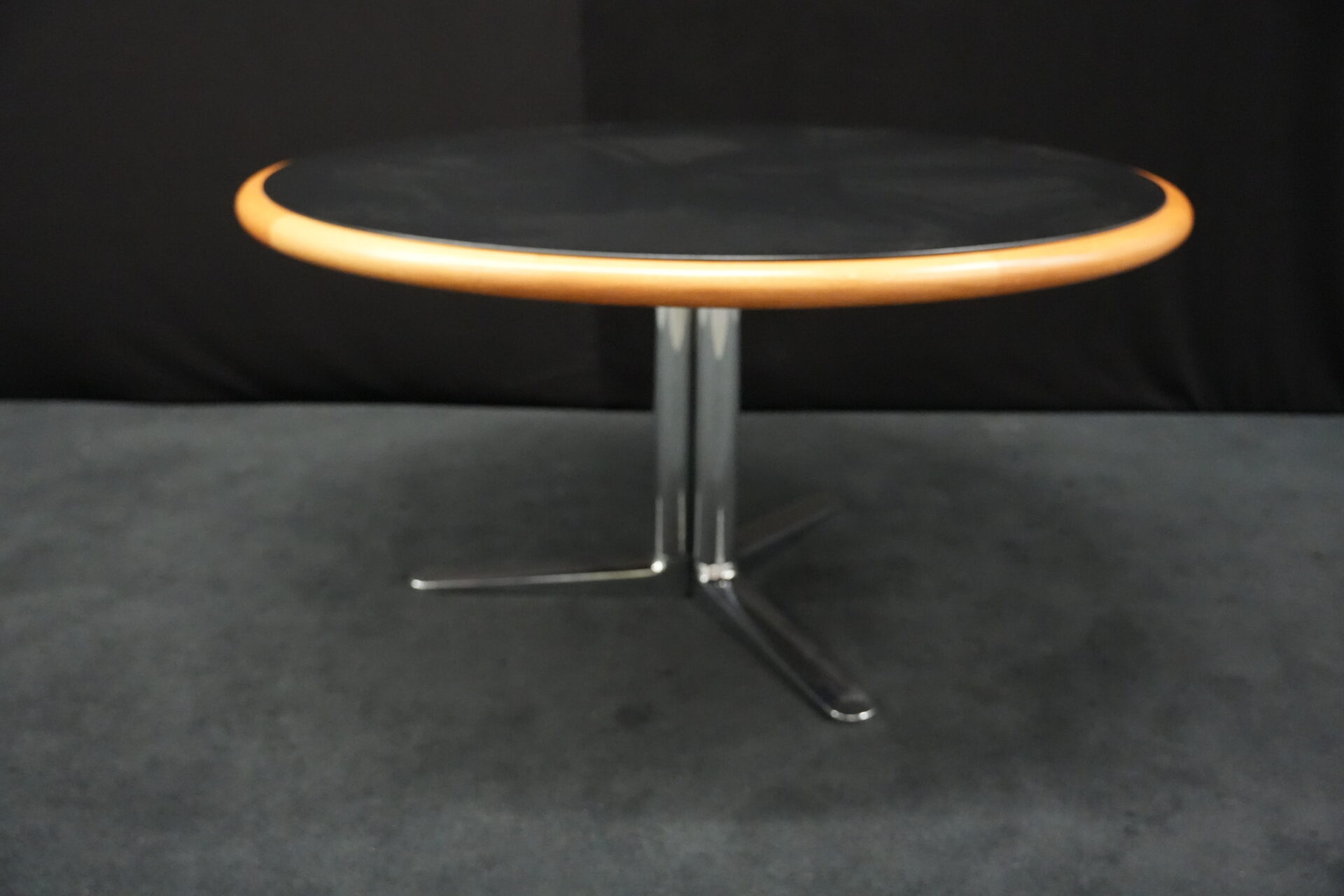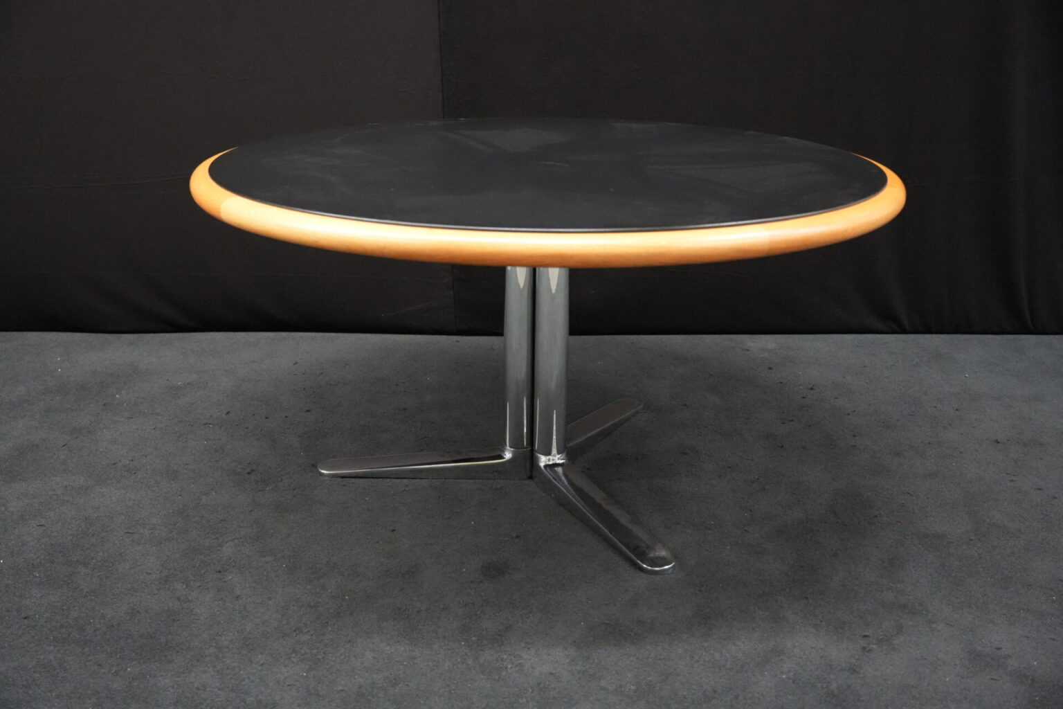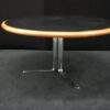 Knoll International Konferenztisch mit schwarzer Lederplatte | Marke: Knoll International| Tischplatte: Holz / hellbraun / Leder / schwarz | Gestell: Metall / verchromt | Ausstattung: Leder-Pad und ausschiebares Fach | Abmessung: H: 74cm | Tischplatte ø: 145cm
