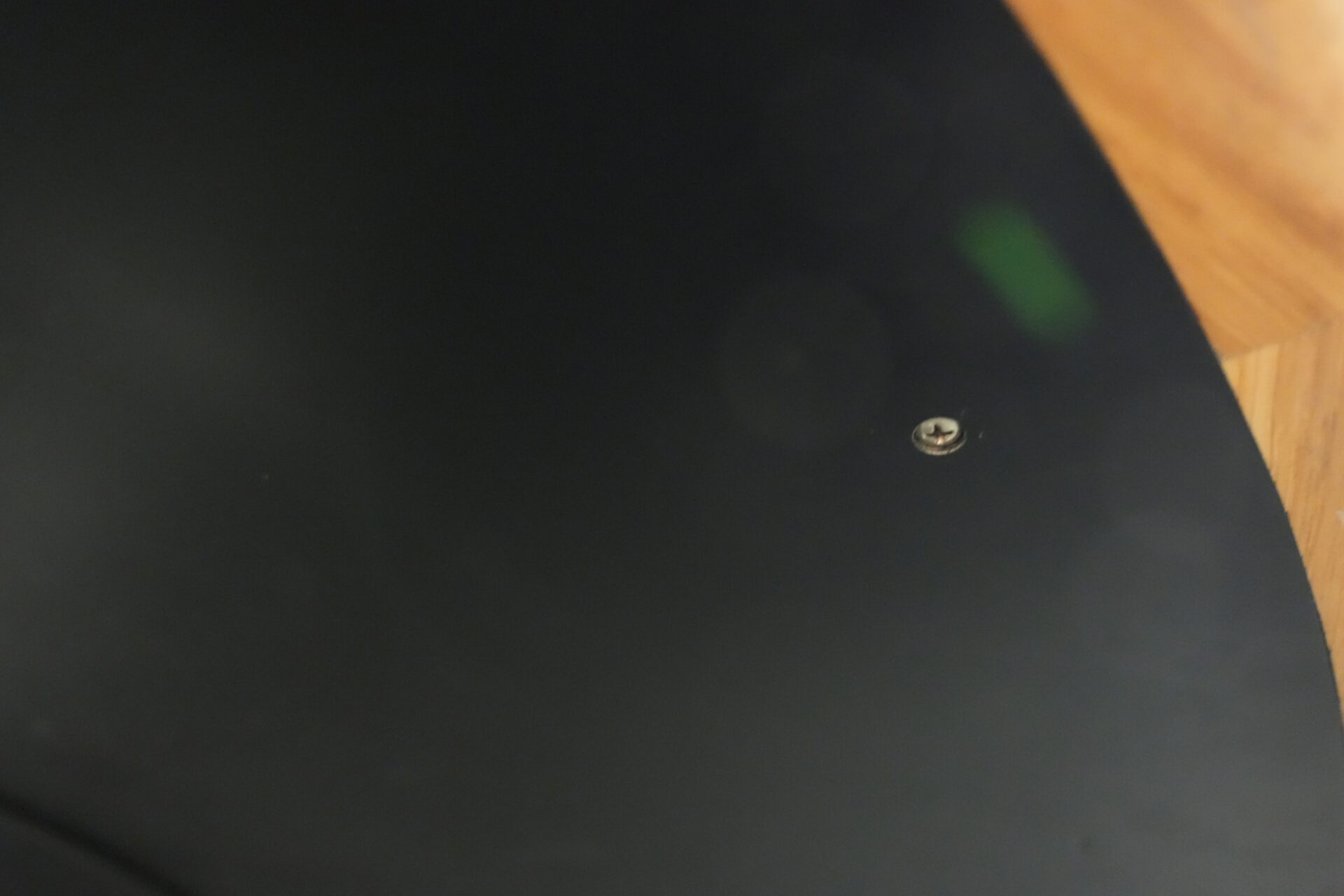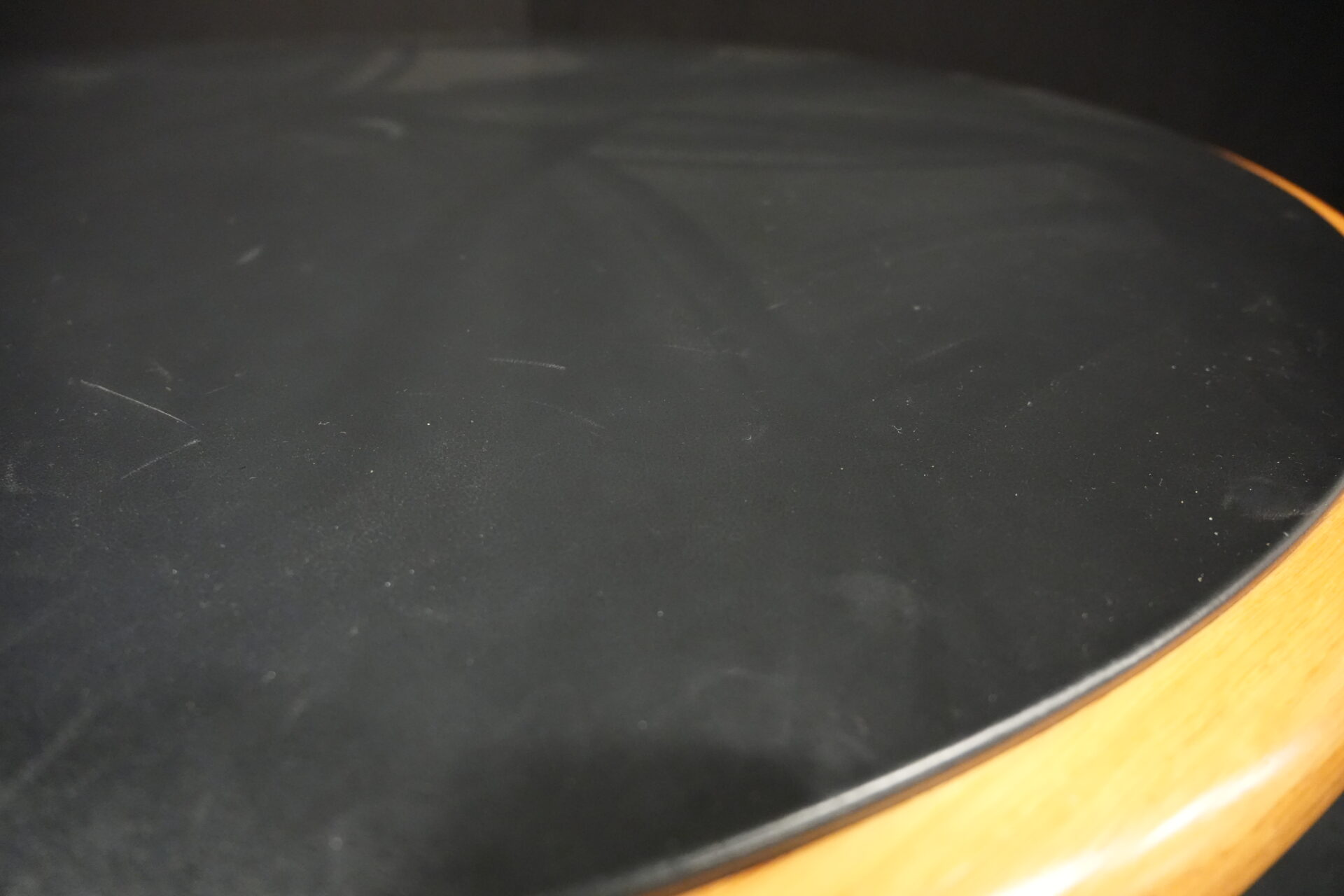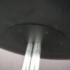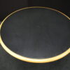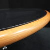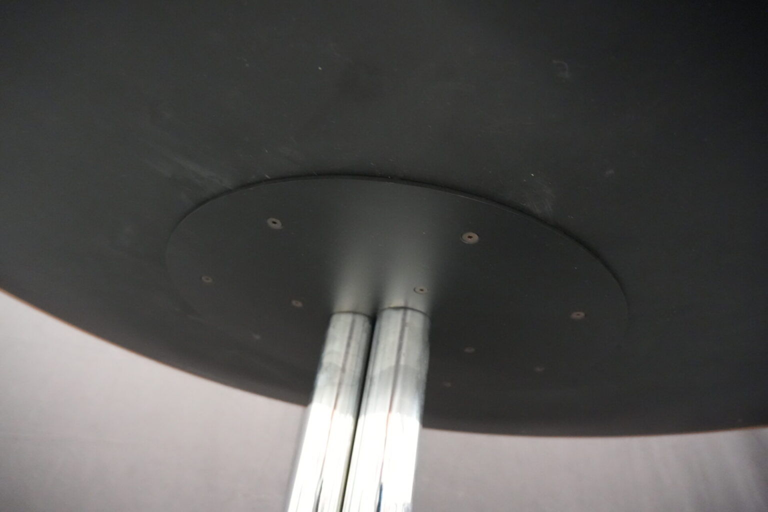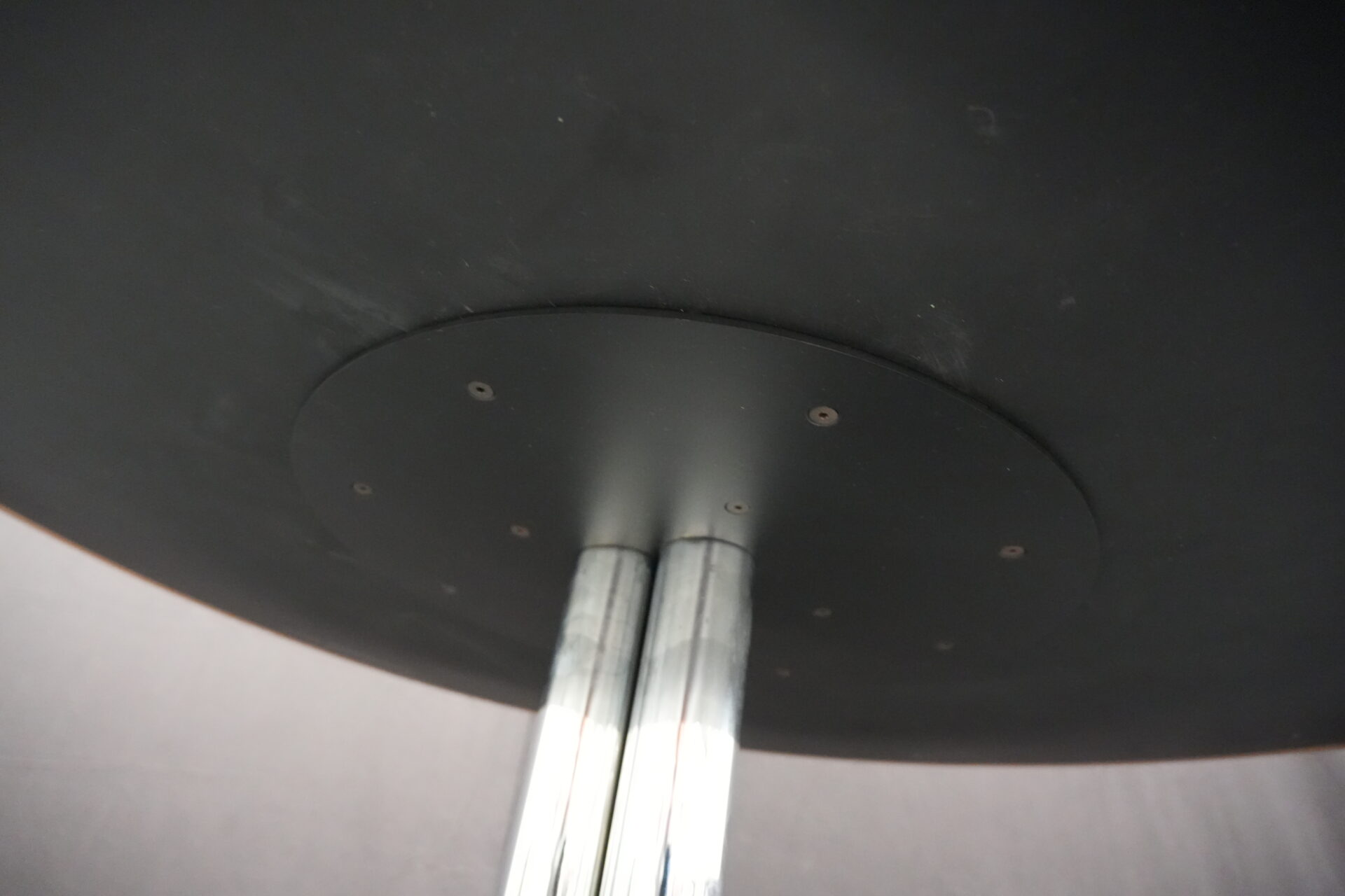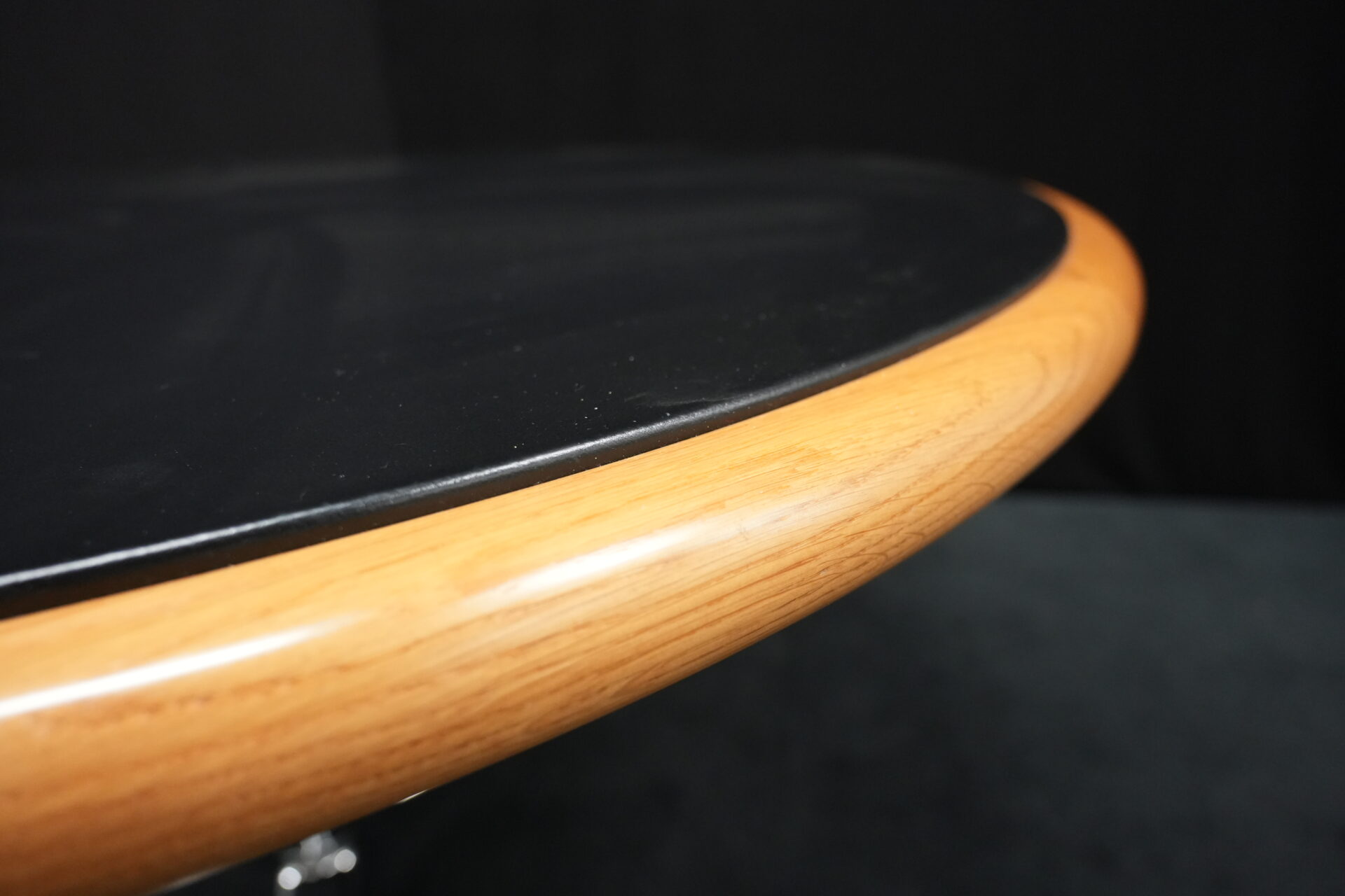 Knoll International Konferenztisch mit schwarzer Lederplatte | Marke: Knoll International| Tischplatte: Holz / hellbraun / Leder / schwarz | Gestell: Metall / verchromt | Ausstattung: Leder-Pad und ausschiebares Fach | Abmessung: H: 74cm | Tischplatte ø: 145cm