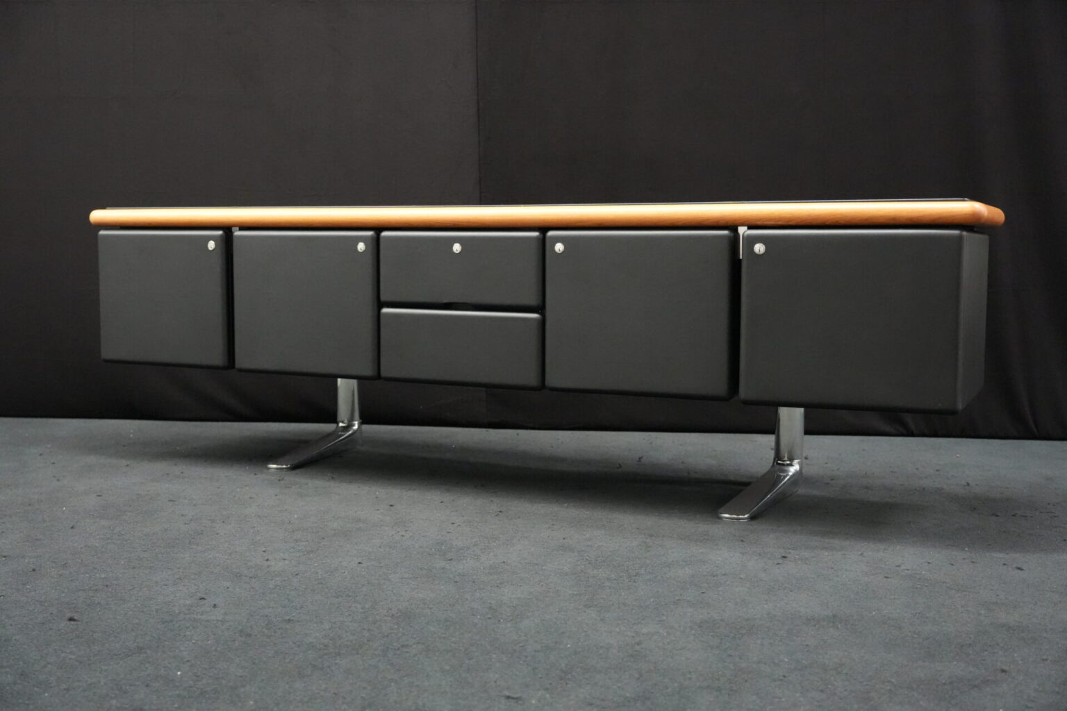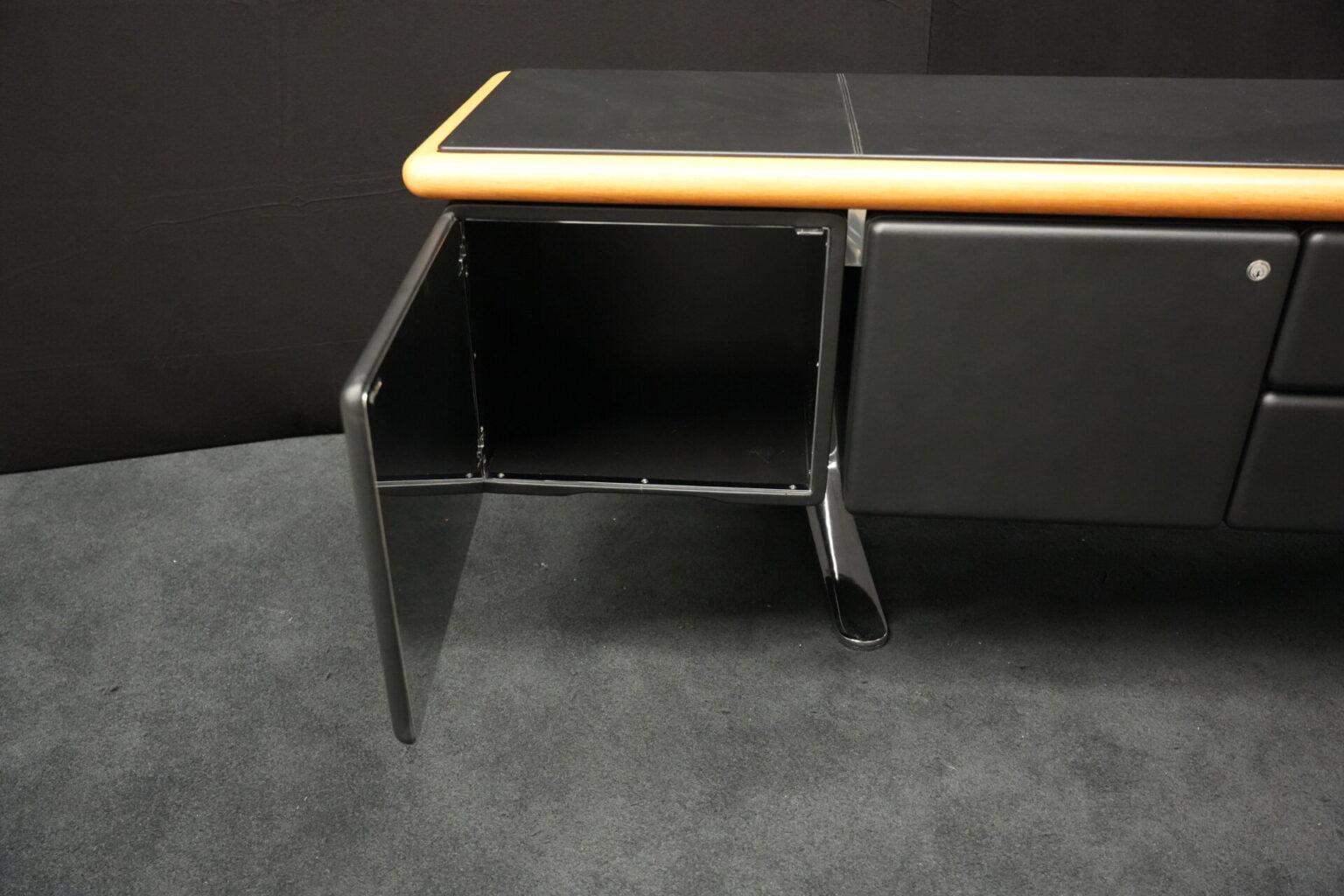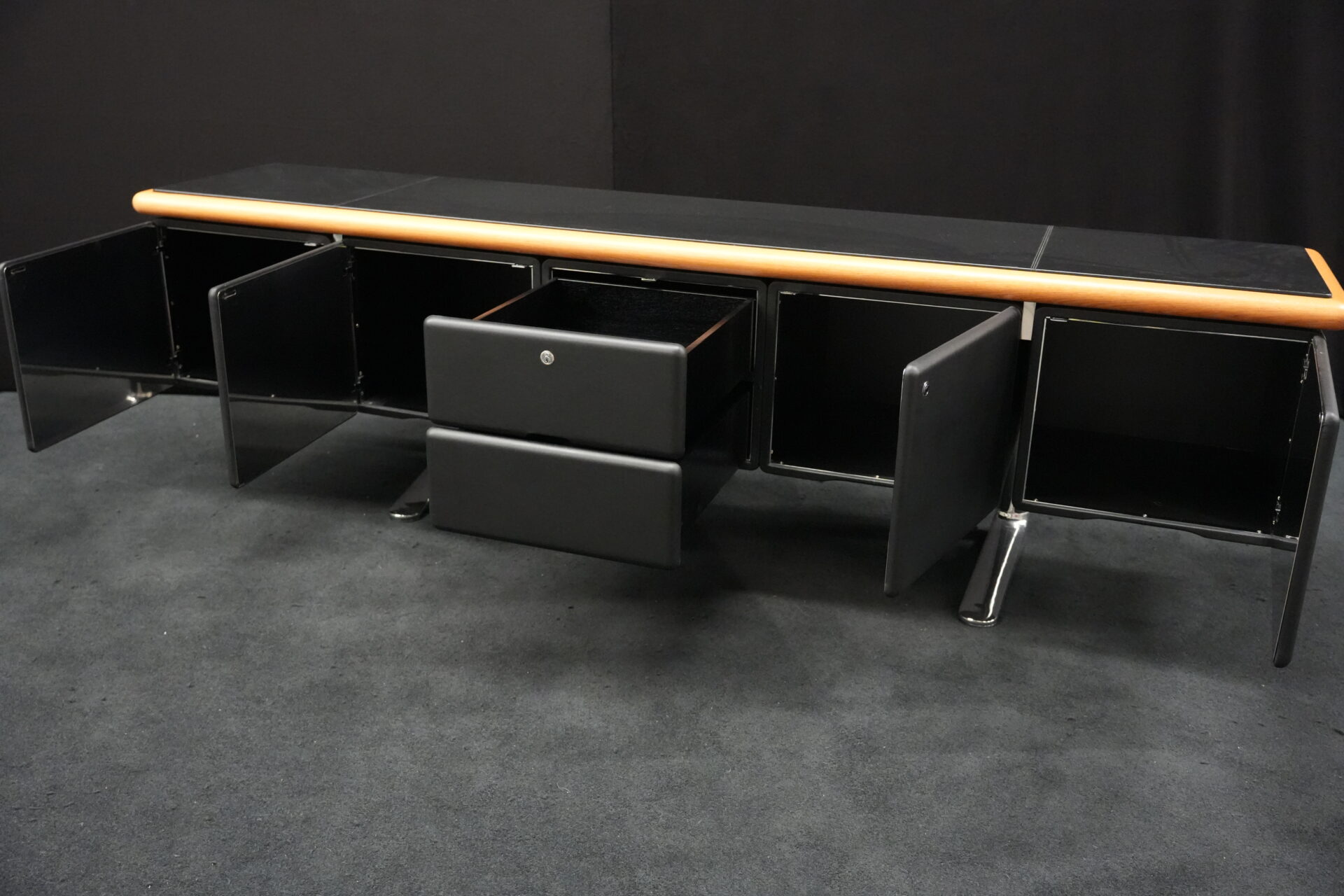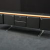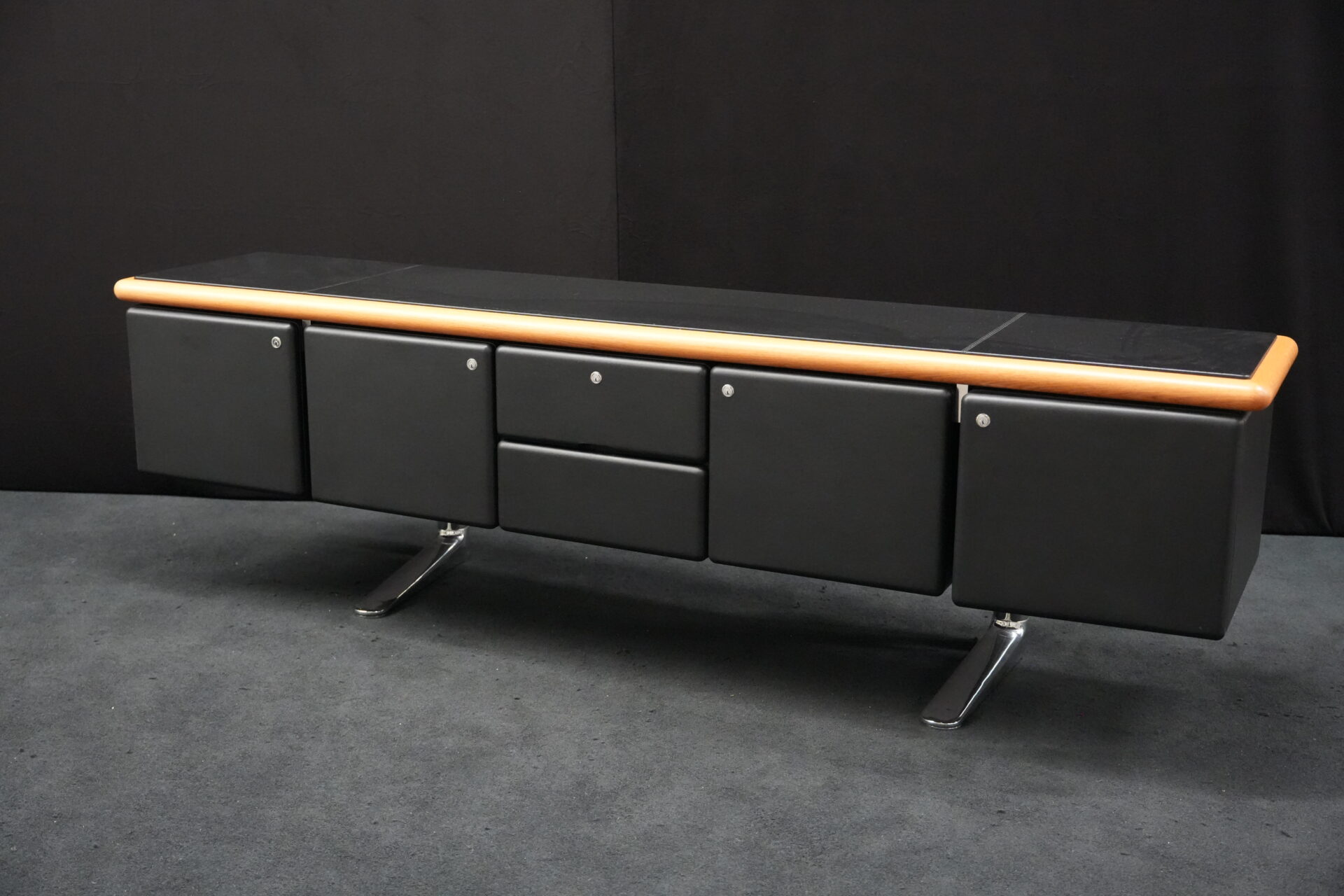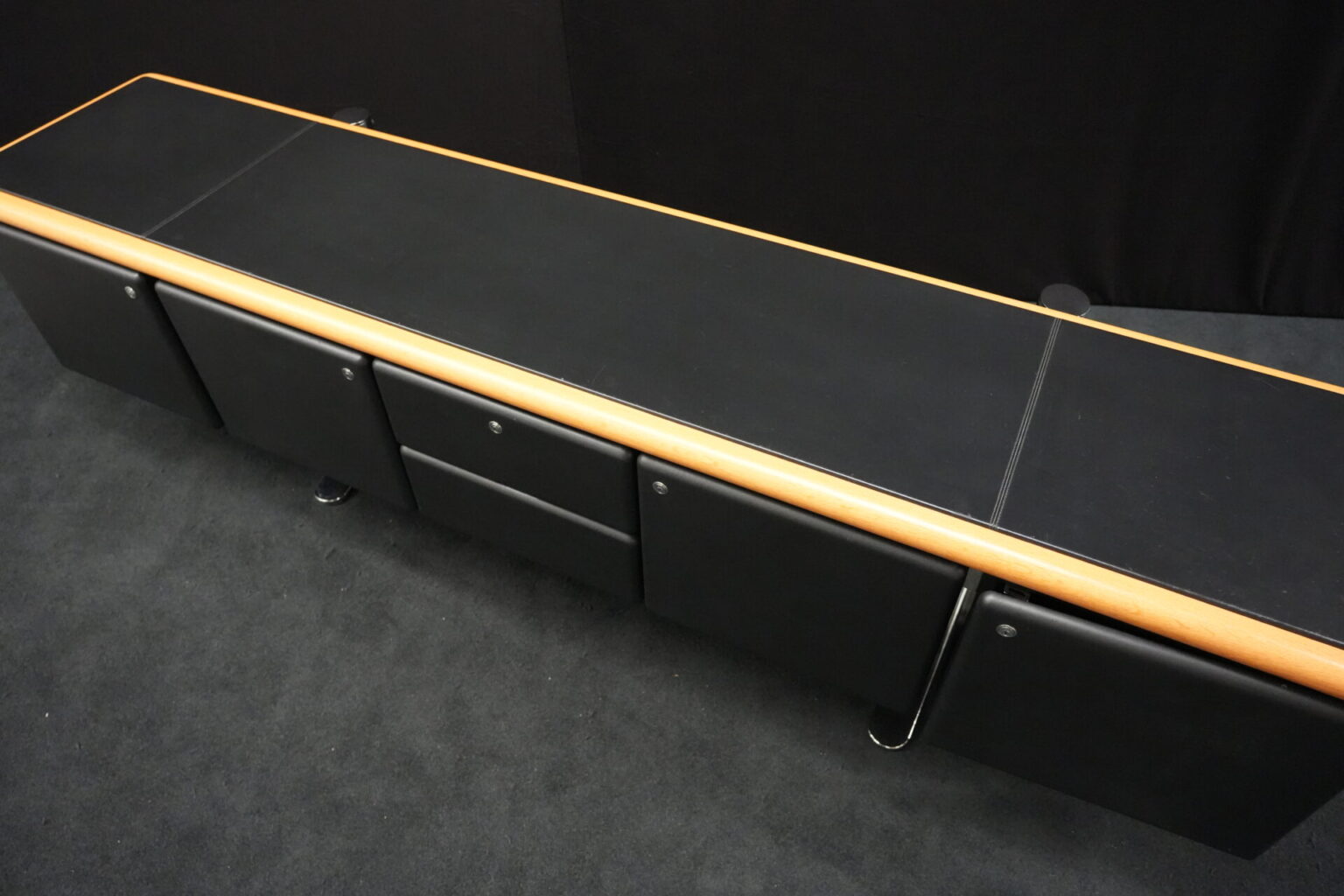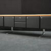 Knoll International | Marke: Knoll International | Auflage: Holz / hellbraun / Leder / schwarz | Gestell: Metall / verchromt | Fächer: Holz / schwarz | Abmessungen: H: 74cm | B: 240cm | T: 60cm