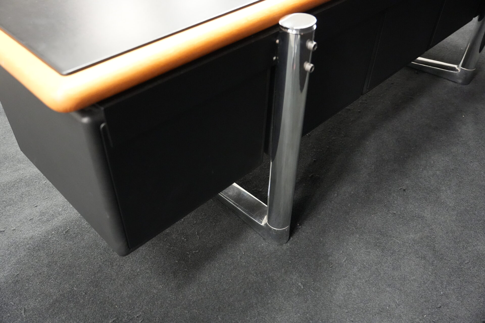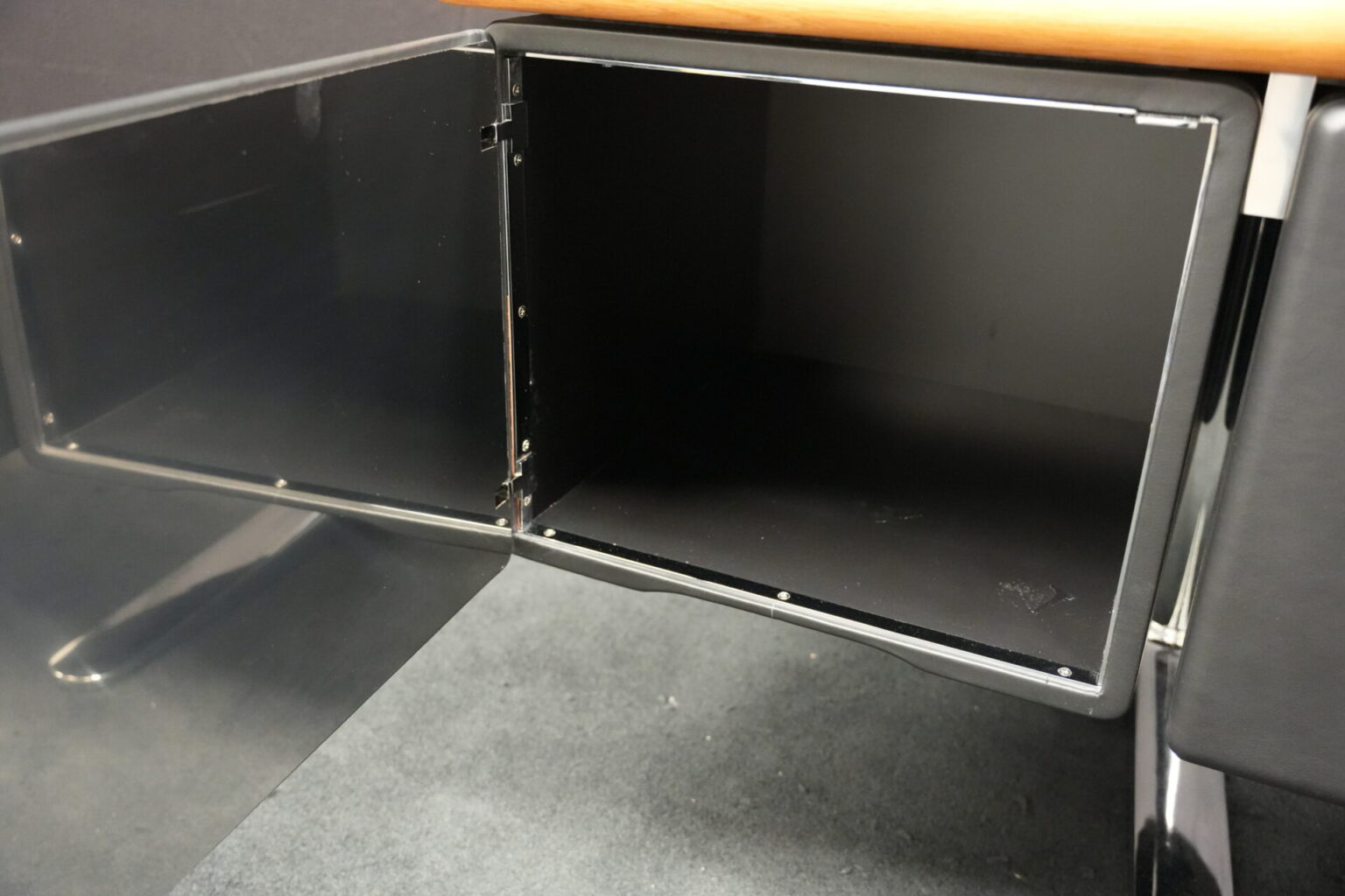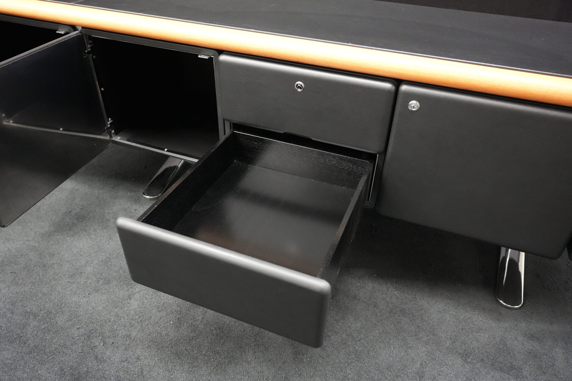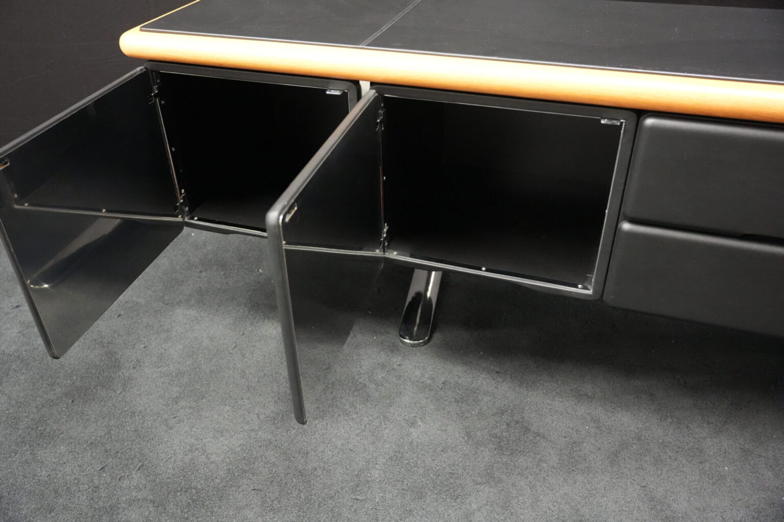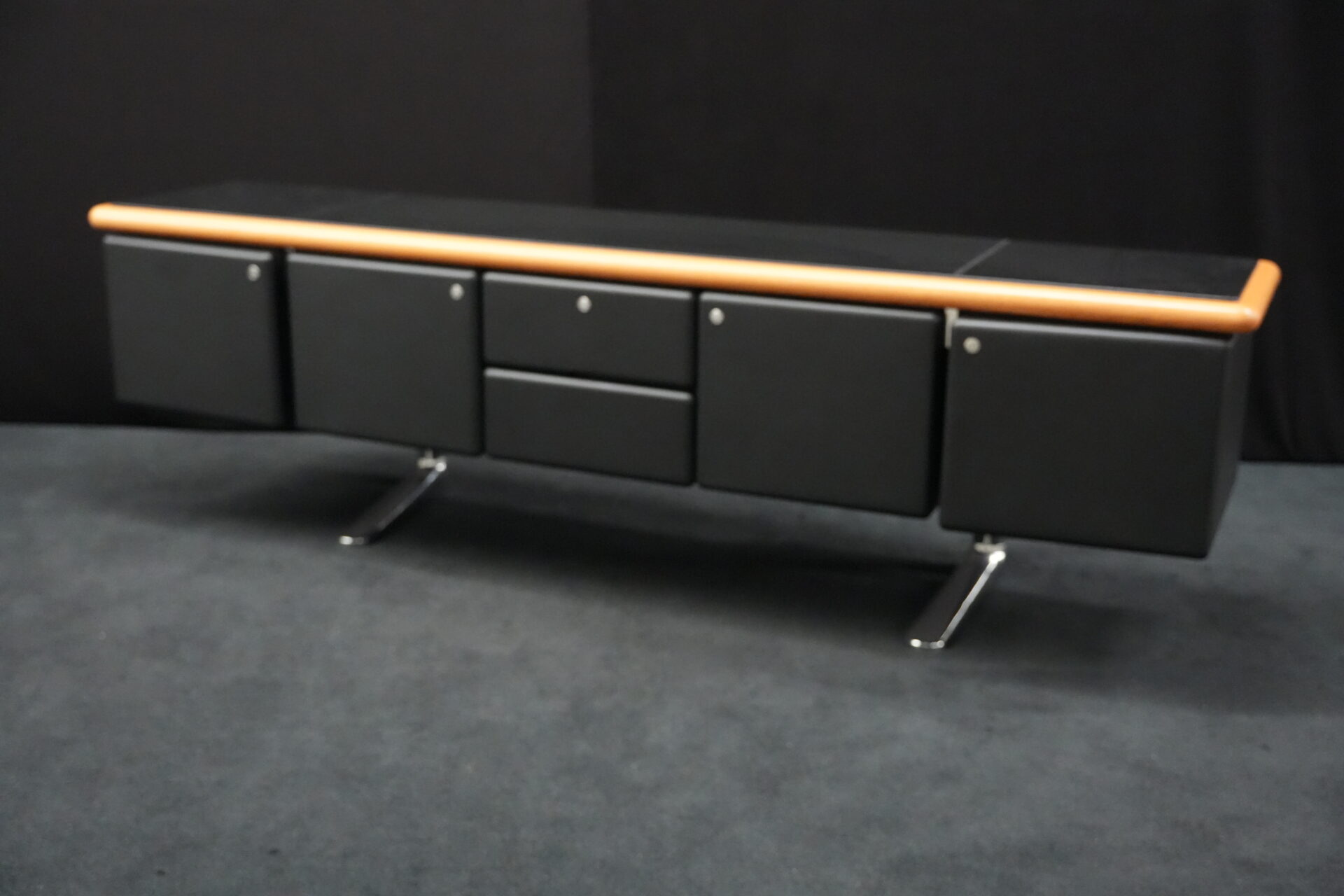 Knoll International | Marke: Knoll International | Auflage: Holz / hellbraun / Leder / schwarz | Gestell: Metall / verchromt | Fächer: Holz / schwarz | Abmessungen: H: 74cm | B: 240cm | T: 60cm