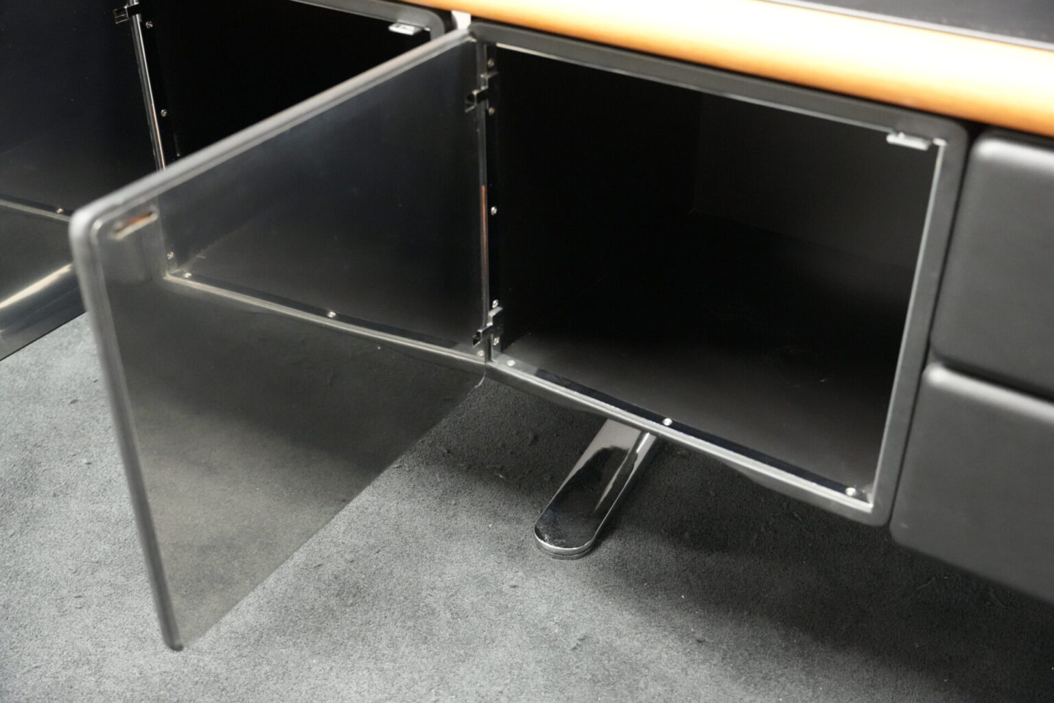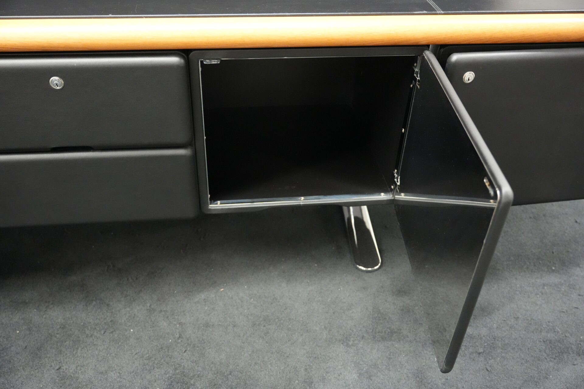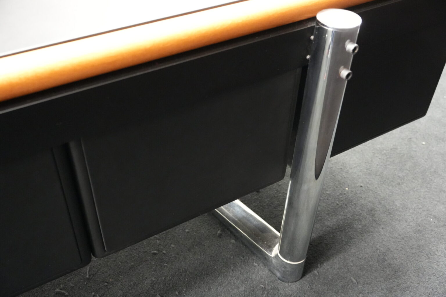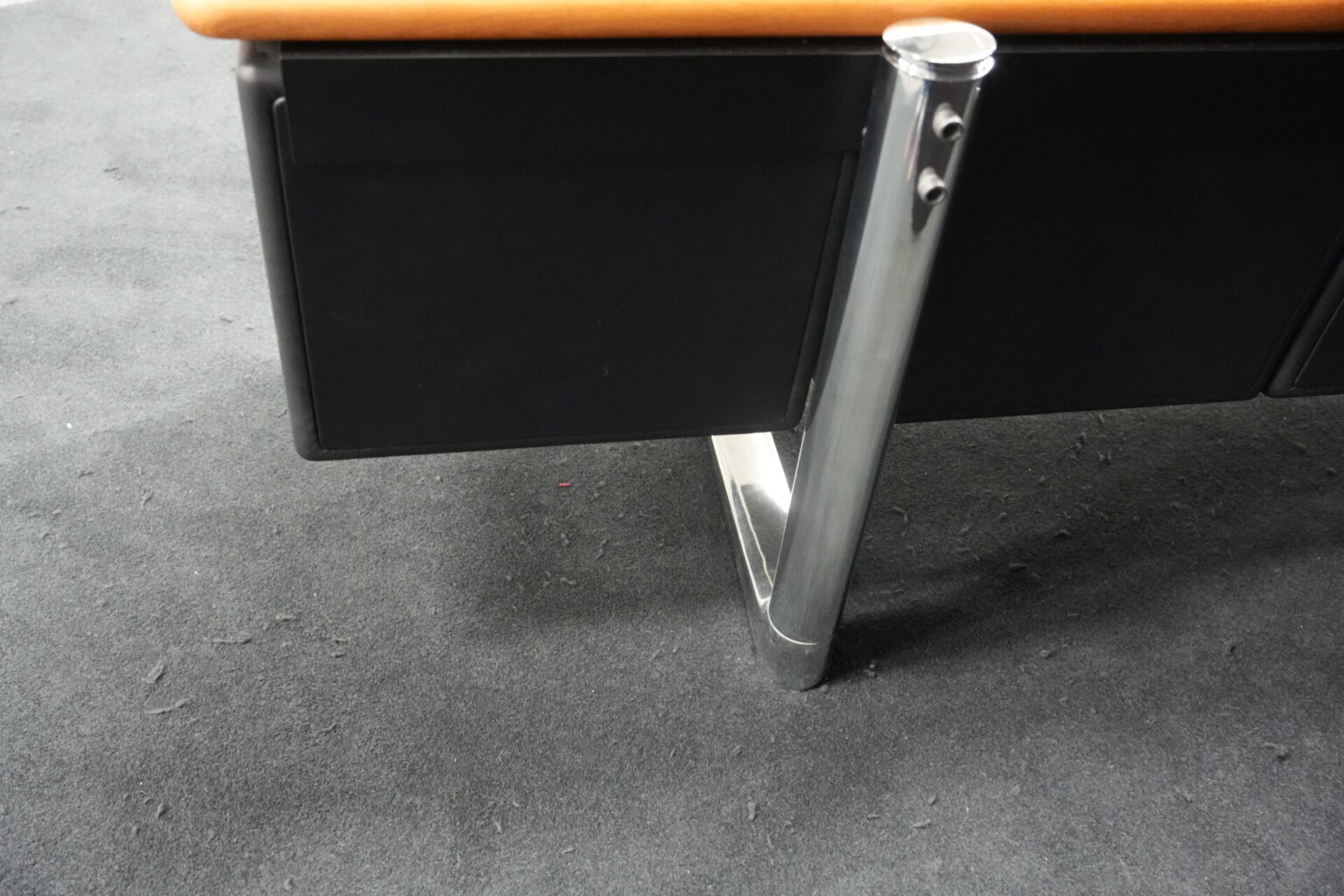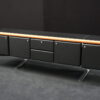 Knoll International | Marke: Knoll International | Auflage: Holz / hellbraun / Leder / schwarz | Gestell: Metall / verchromt | Fächer: Holz / schwarz | Abmessungen: H: 74cm | B: 240cm | T: 60cm