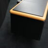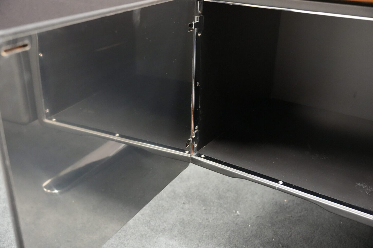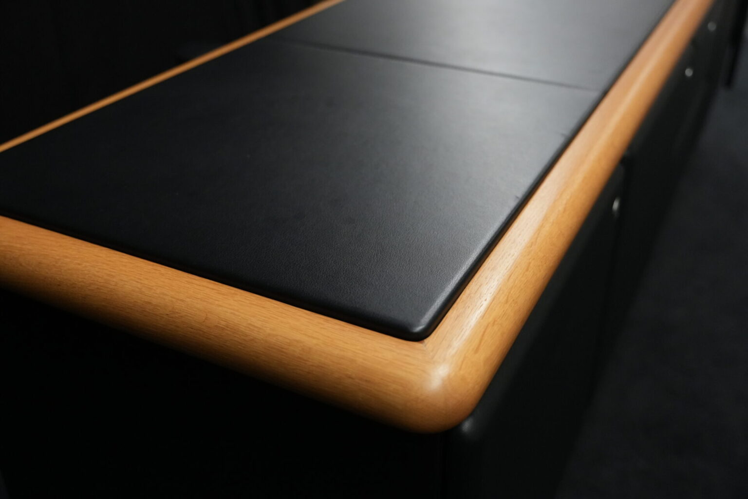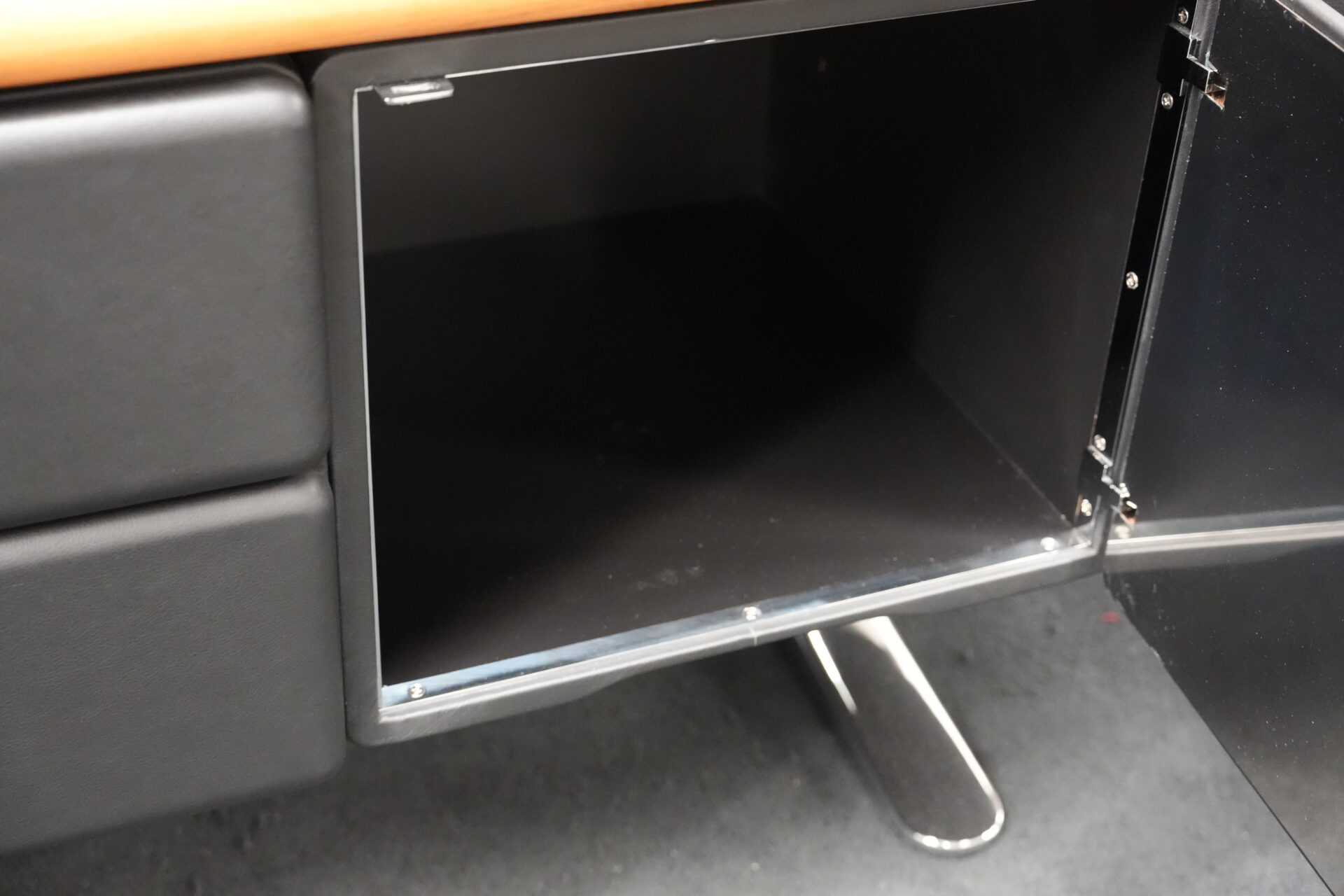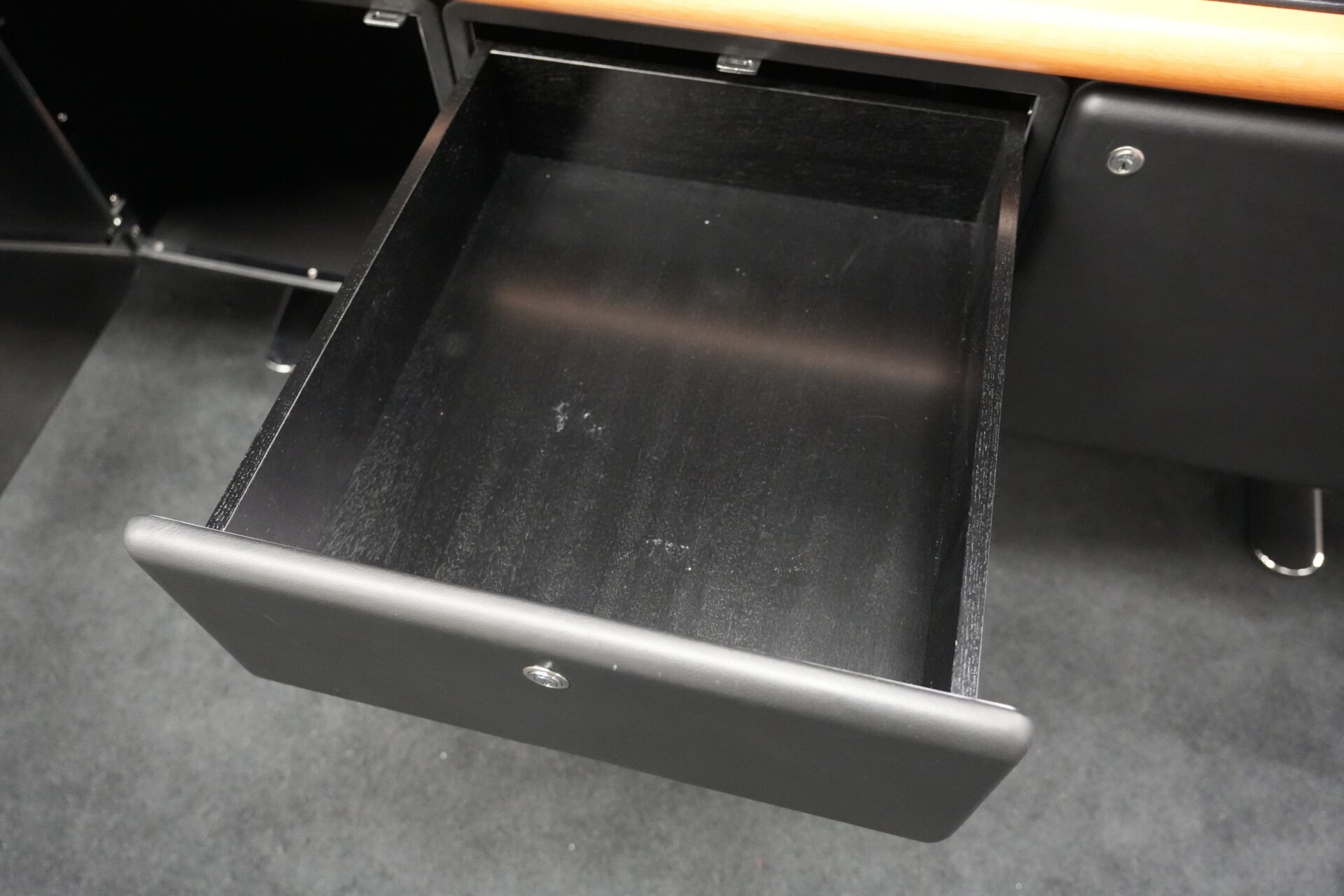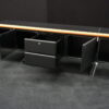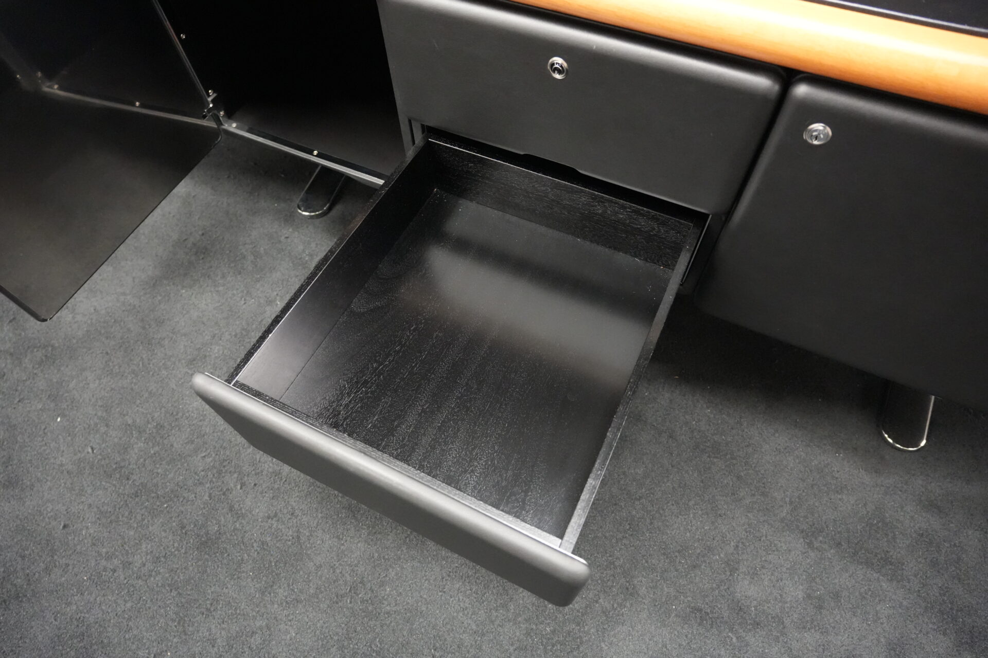 Knoll International | Marke: Knoll International | Auflage: Holz / hellbraun / Leder / schwarz | Gestell: Metall / verchromt | Fächer: Holz / schwarz | Abmessungen: H: 74cm | B: 240cm | T: 60cm