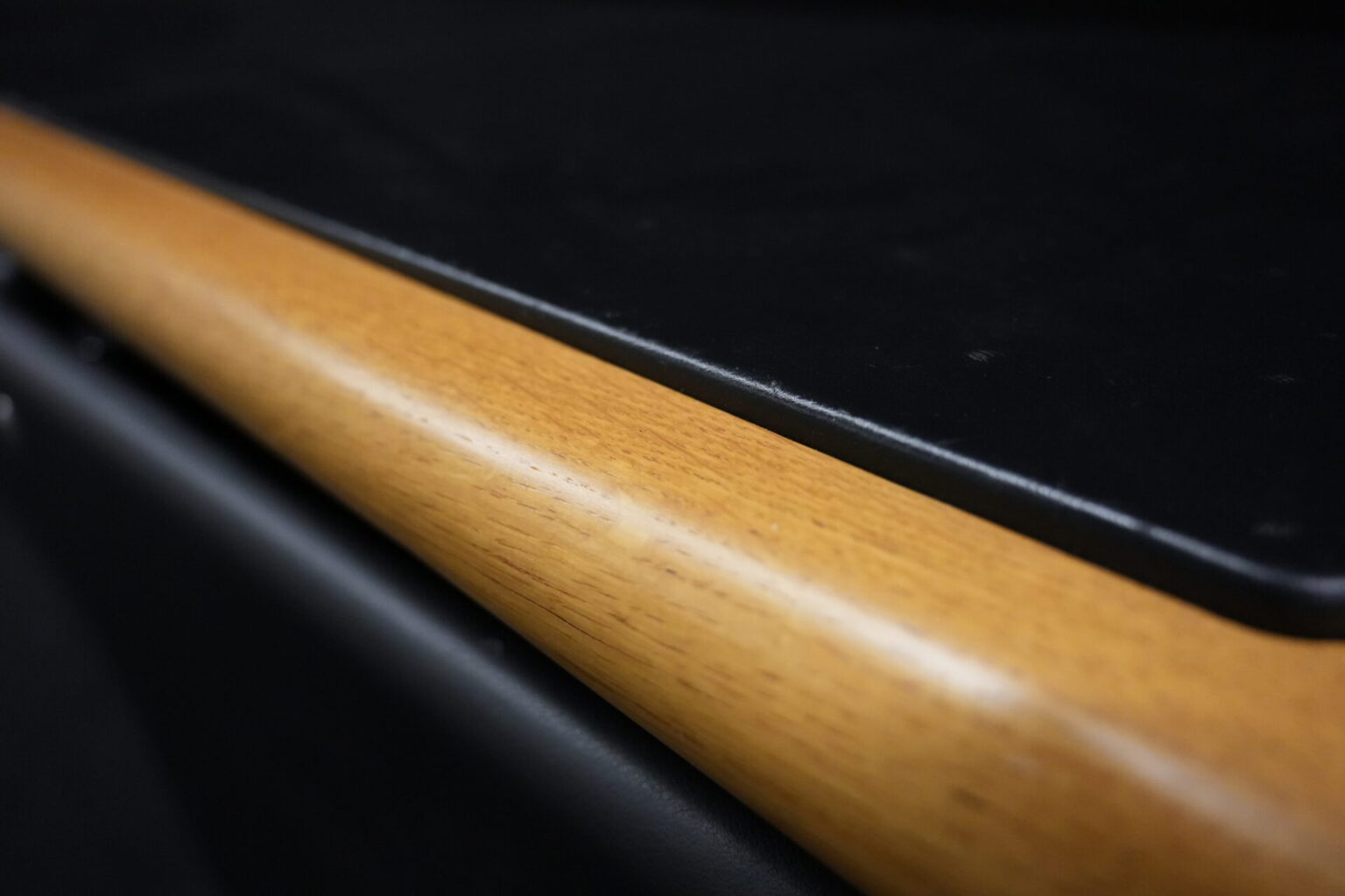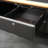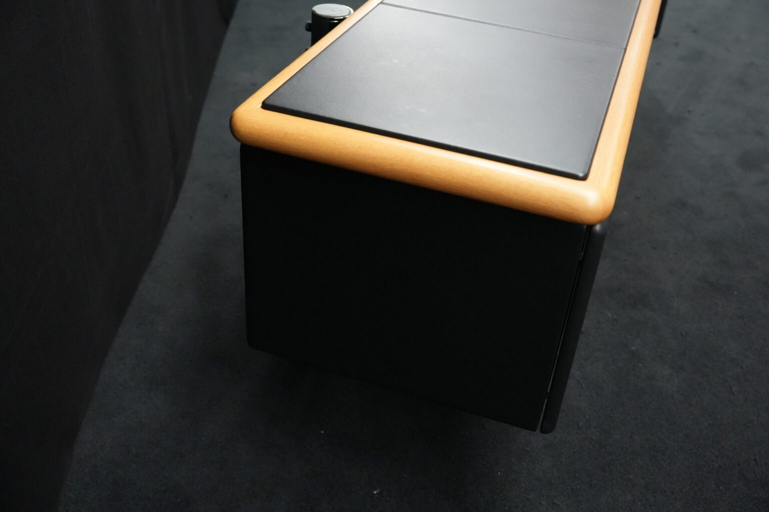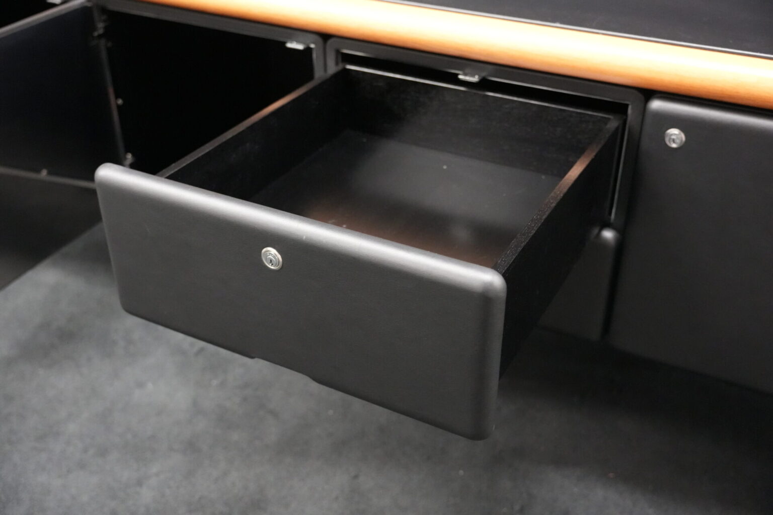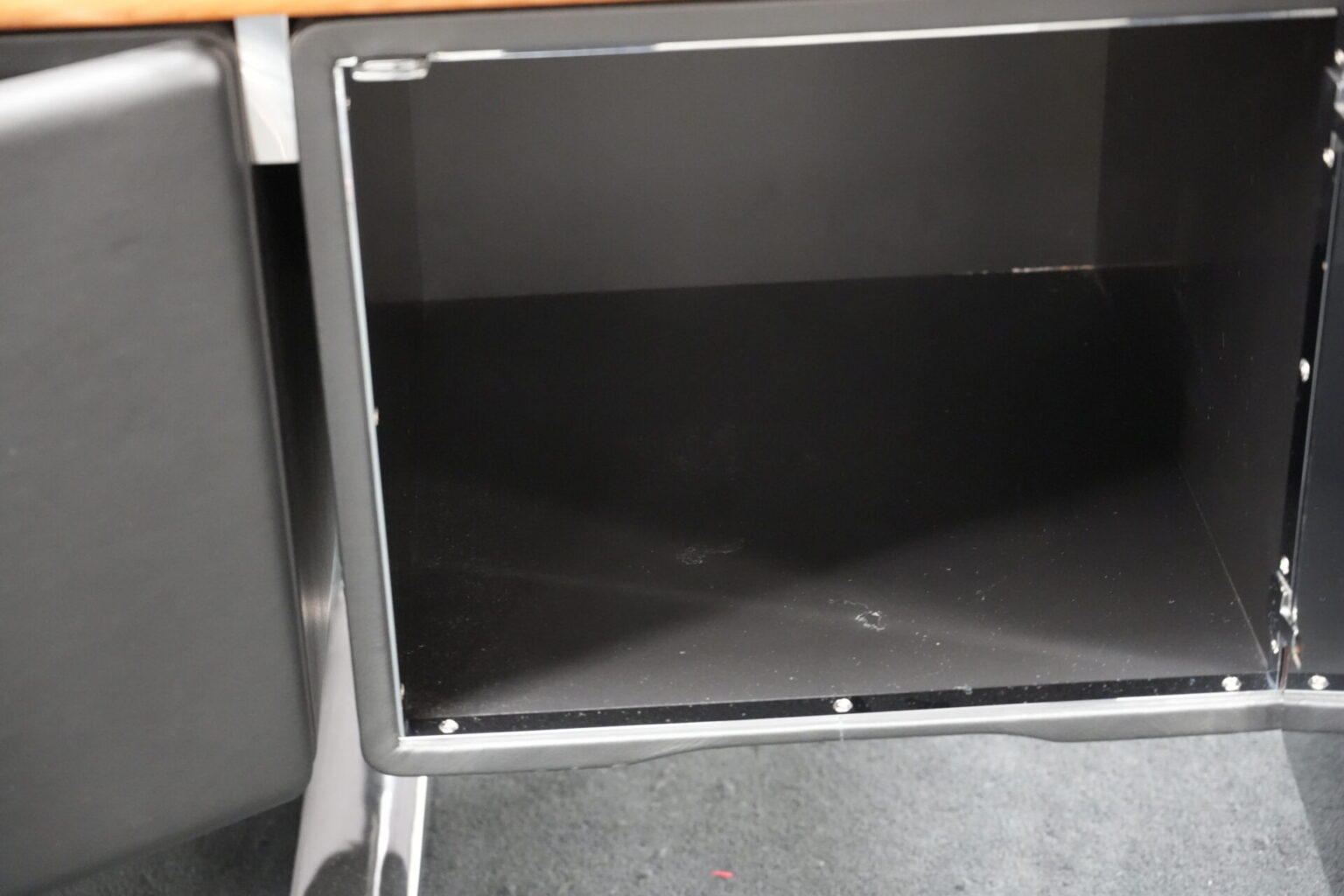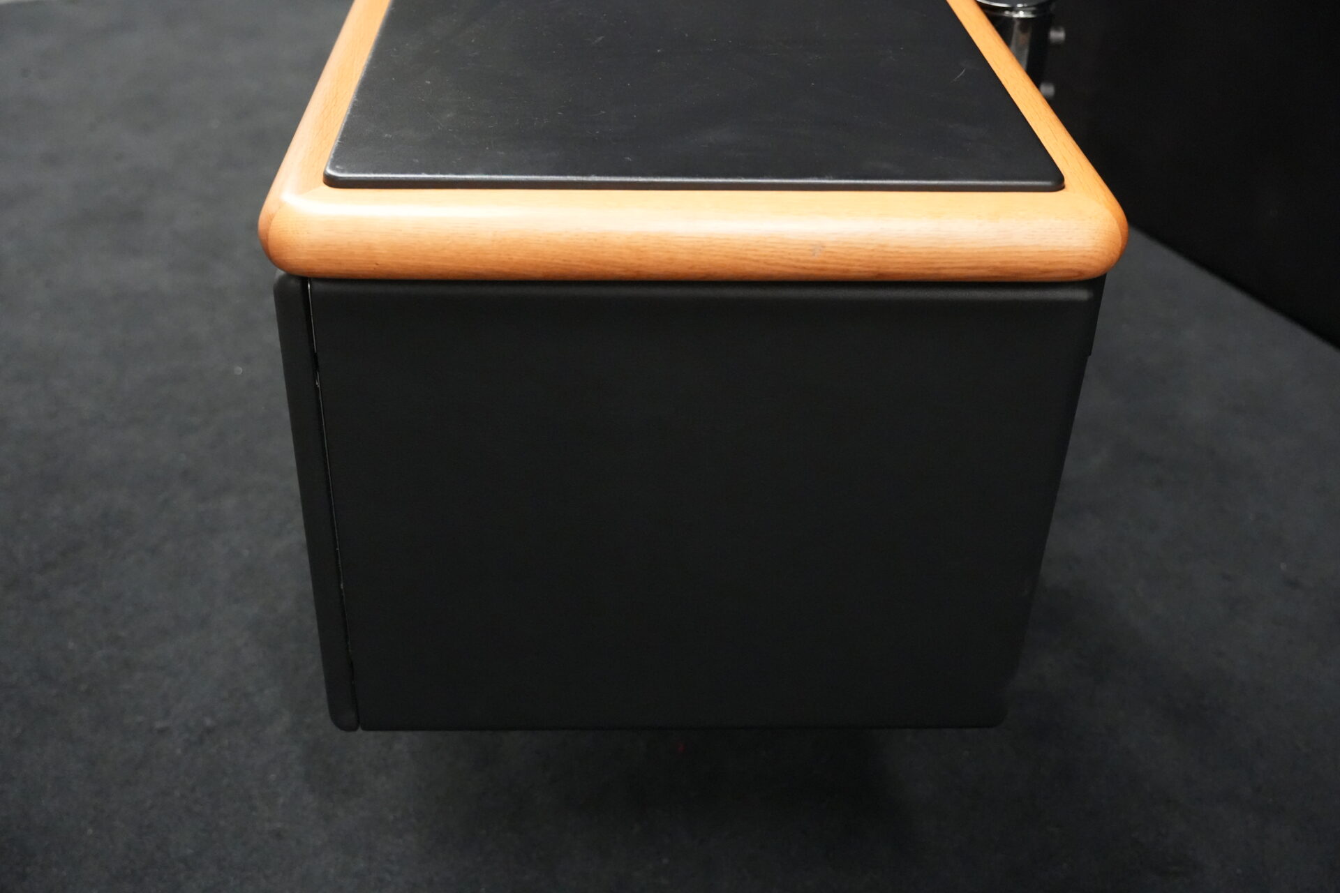 Knoll International | Marke: Knoll International | Auflage: Holz / hellbraun / Leder / schwarz | Gestell: Metall / verchromt | Fächer: Holz / schwarz | Abmessungen: H: 74cm | B: 240cm | T: 60cm