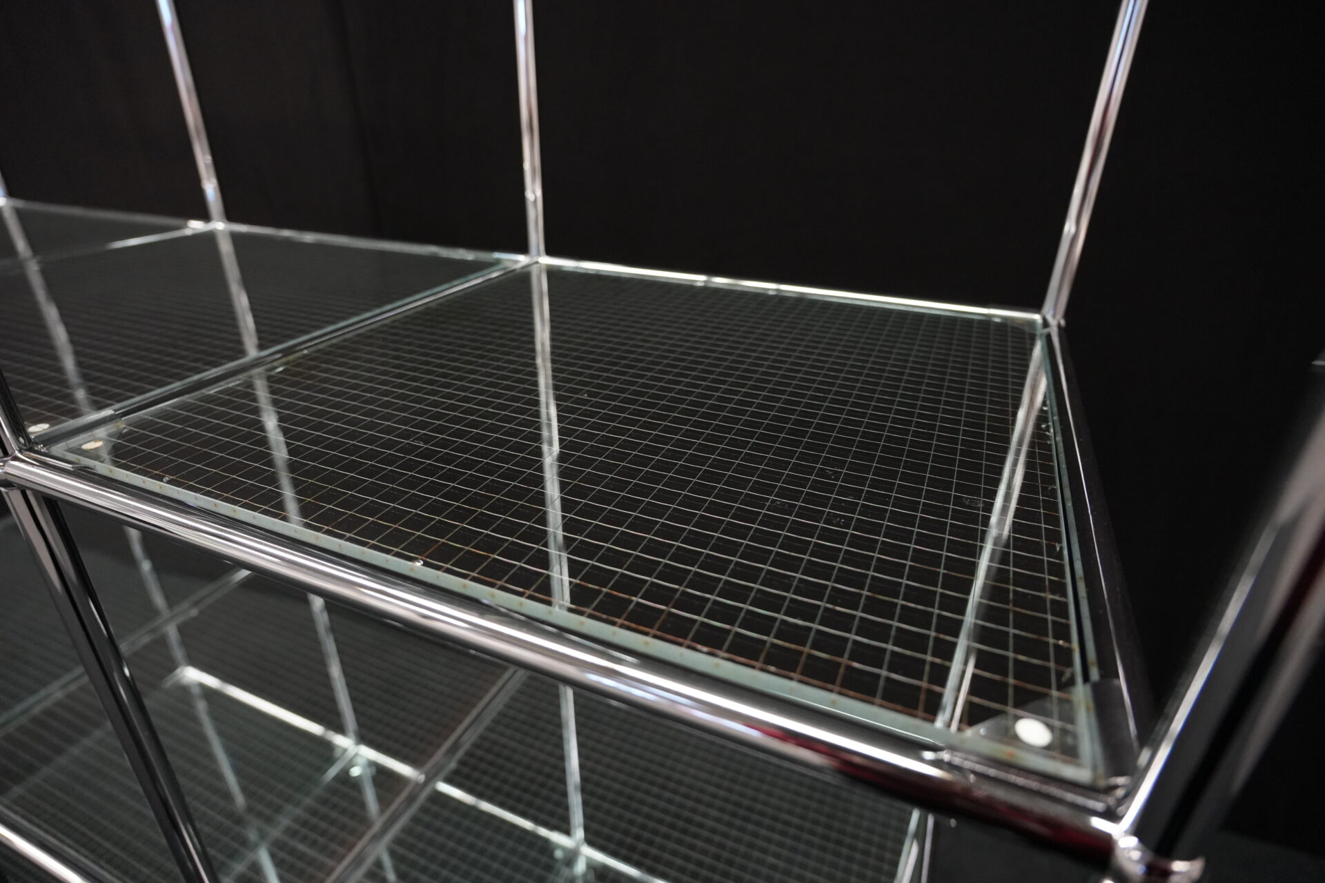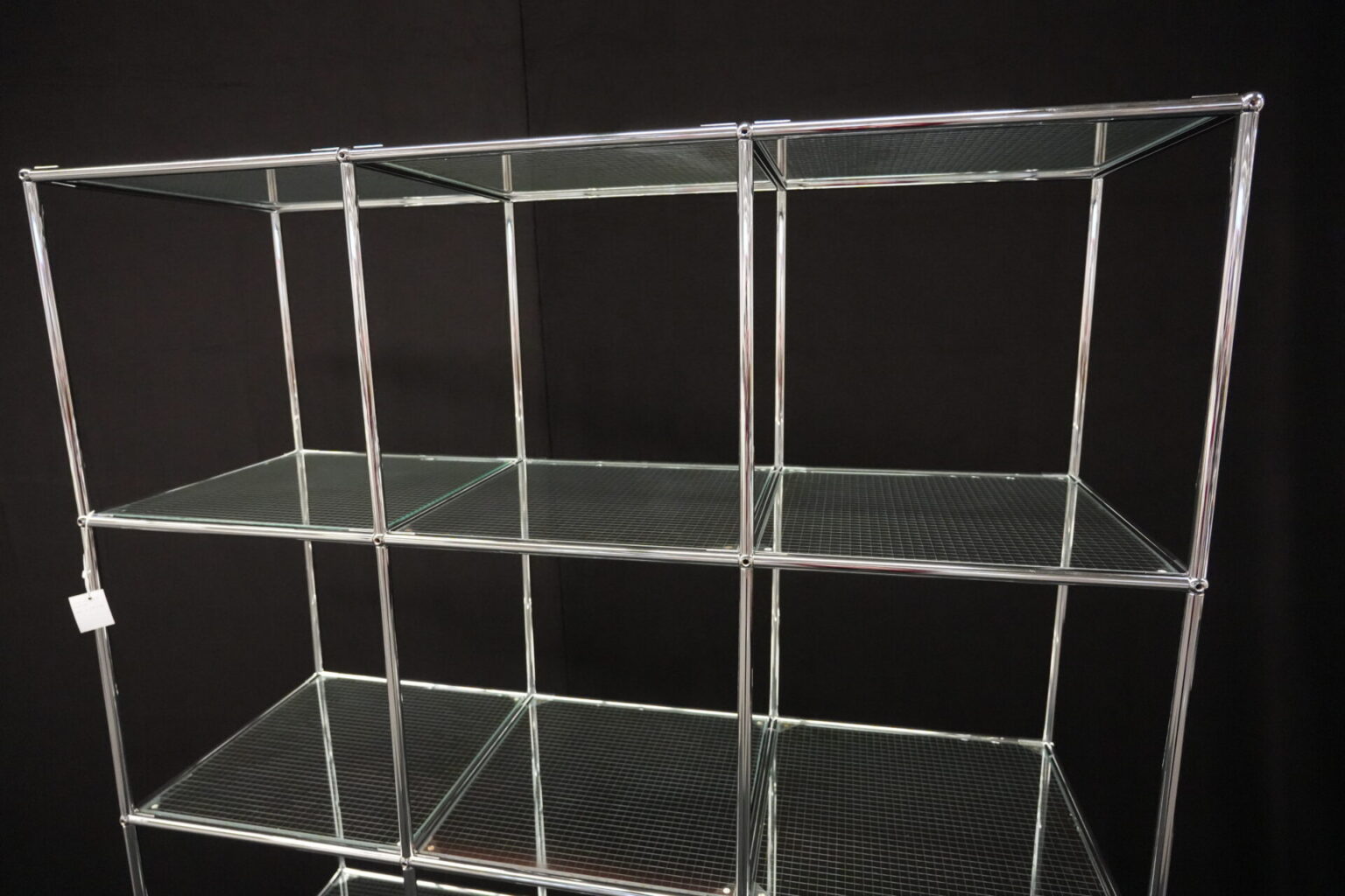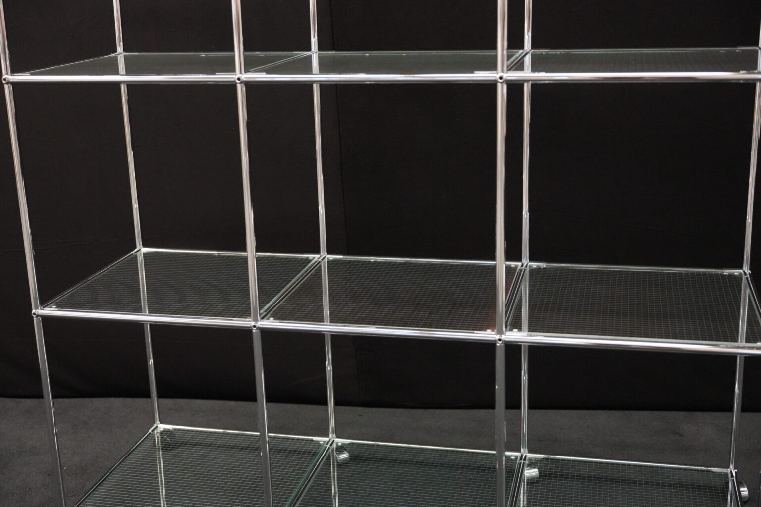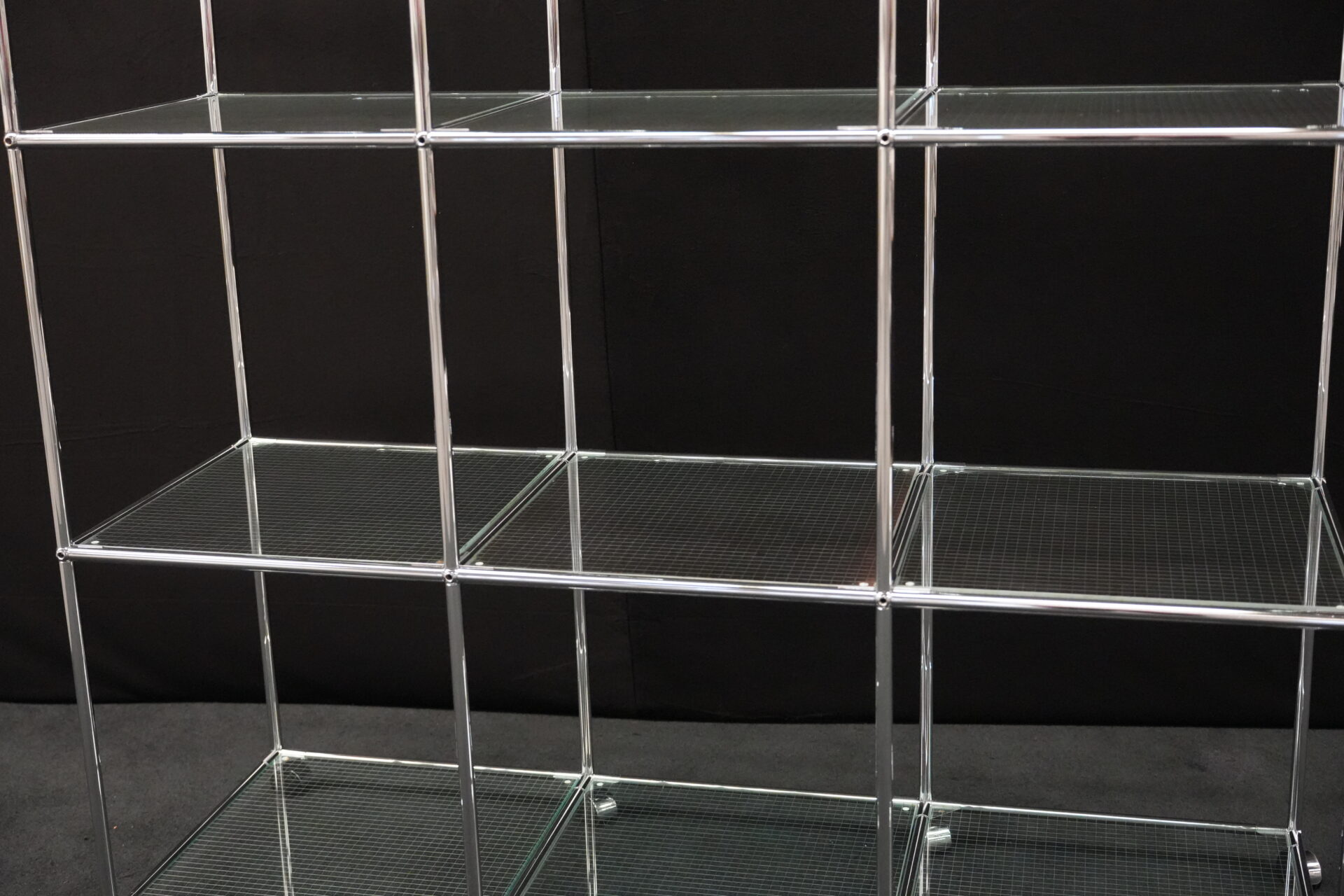 USM Haller Regal | Marke: USM Haller | Gestell: verchromt | Ausstattung: 12 Fächer mit Tablaren aus kariertem Glas, 8x Rollen | Abmessung: 152cm x 210cm x 52cm