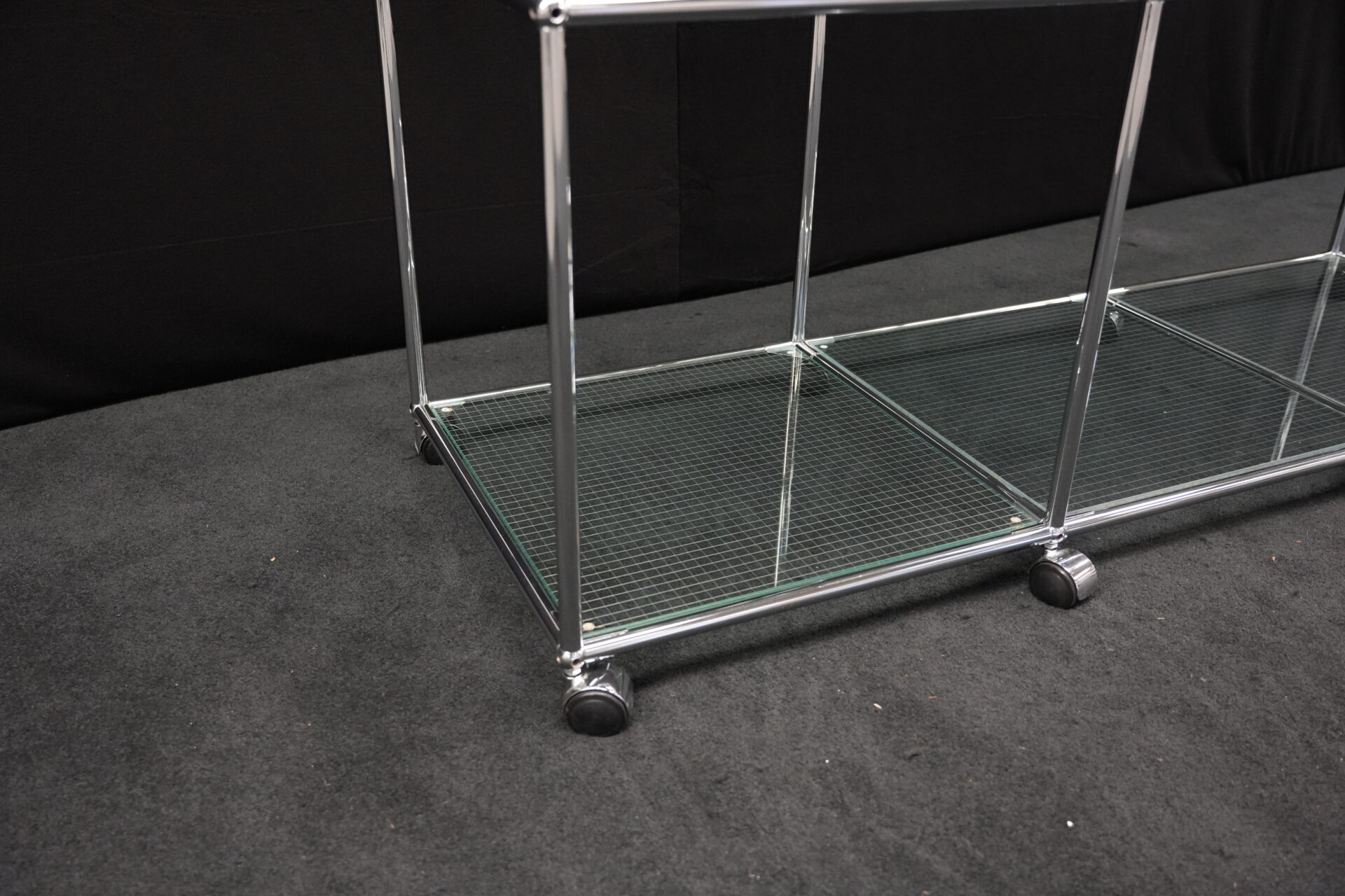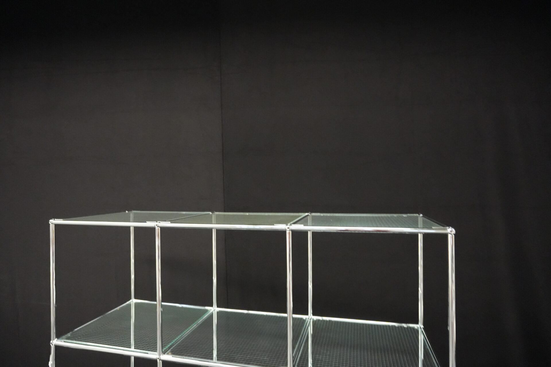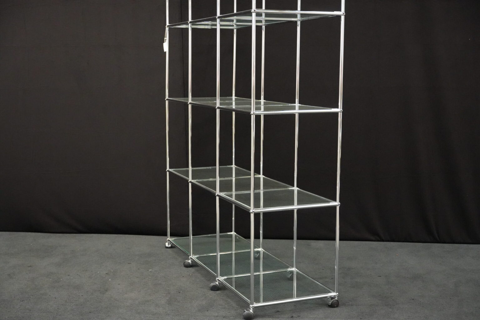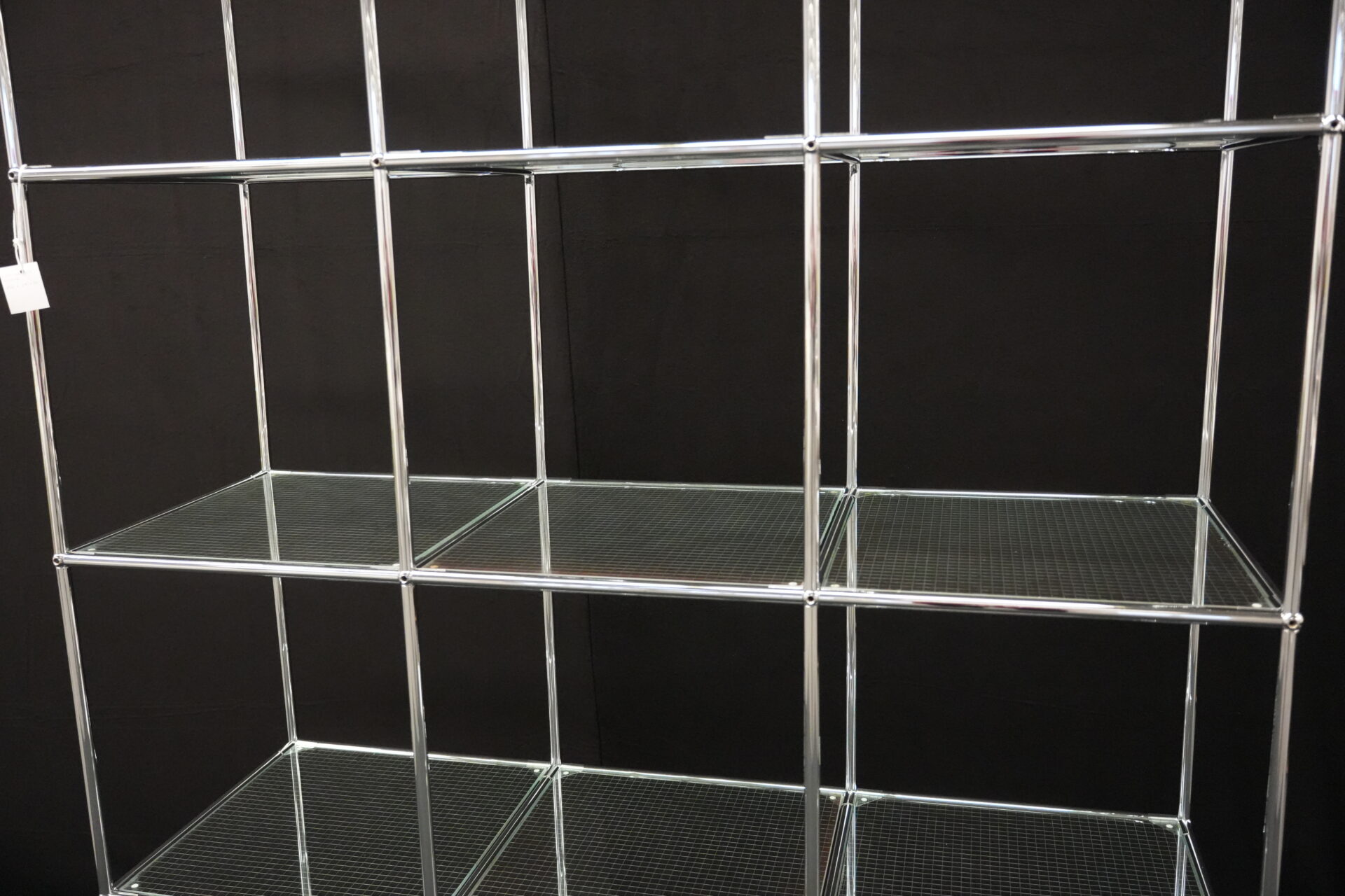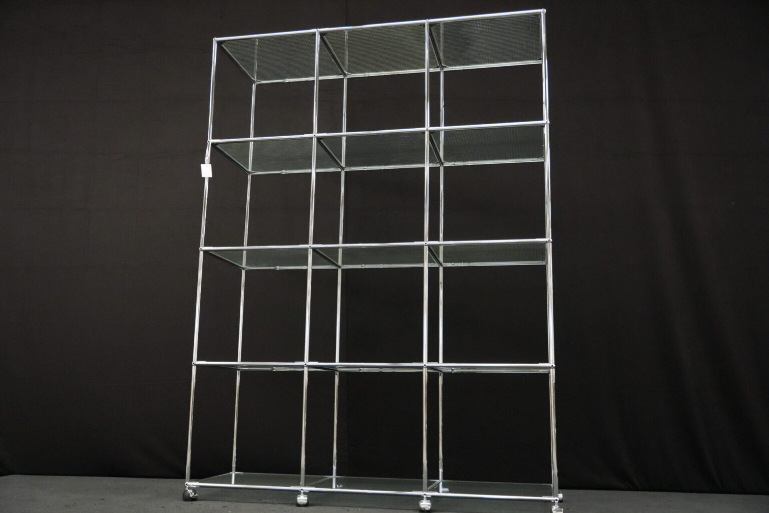 USM Haller Regal | Marke: USM Haller | Gestell: verchromt | Ausstattung: 12 Fächer mit Tablaren aus kariertem Glas, 8x Rollen | Abmessung: 152cm x 210cm x 52cm