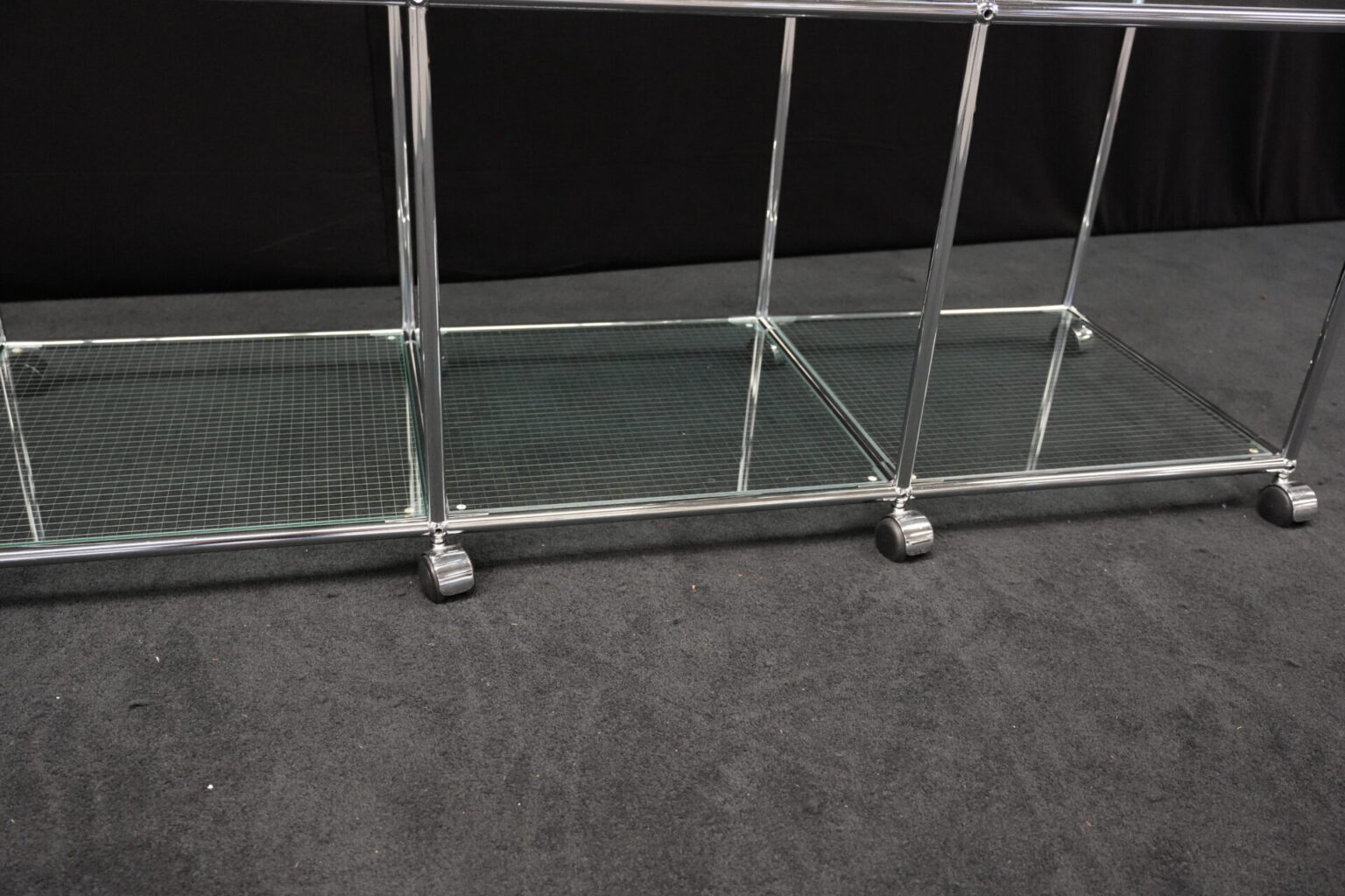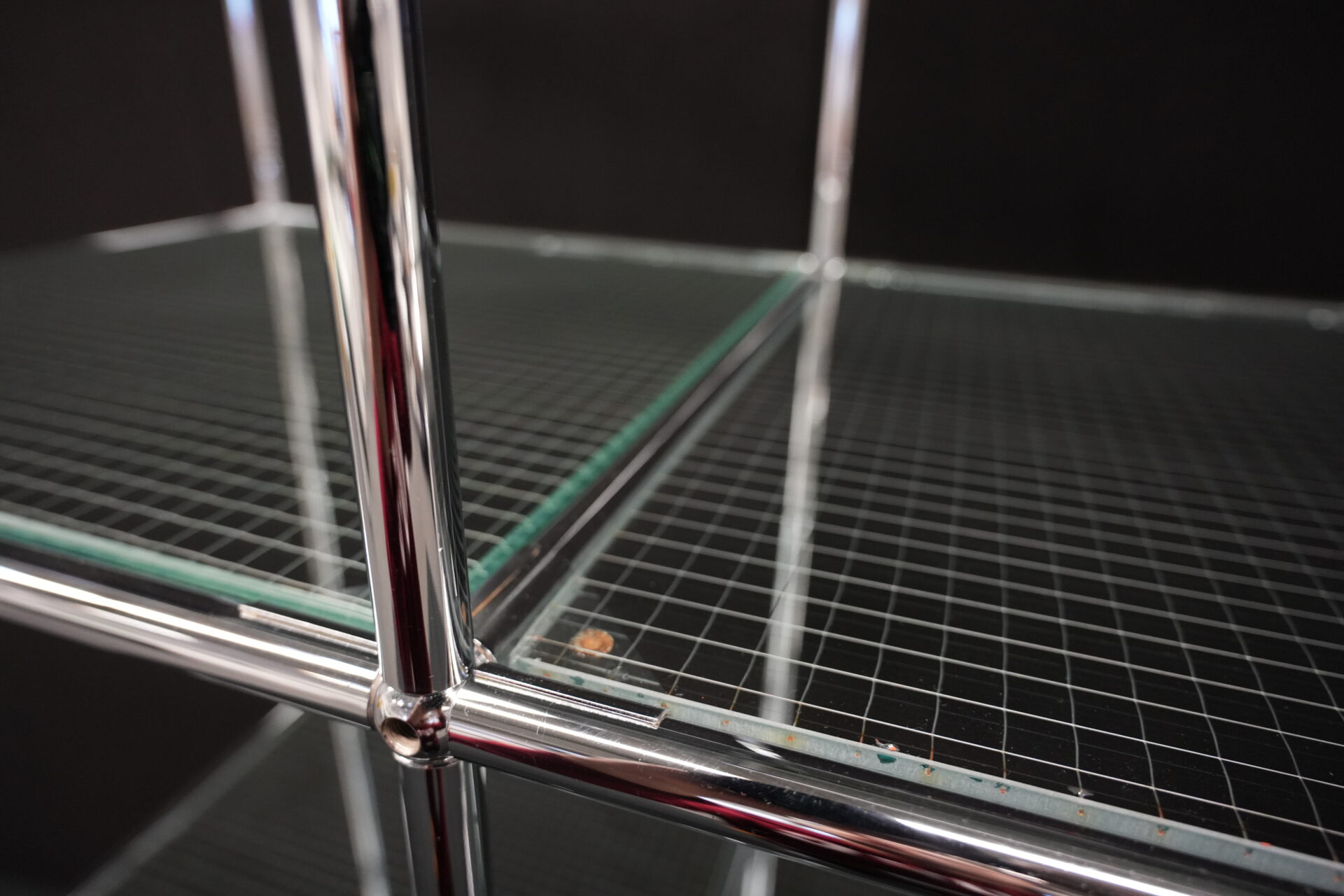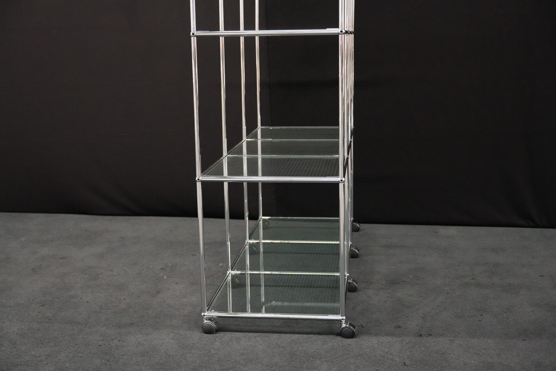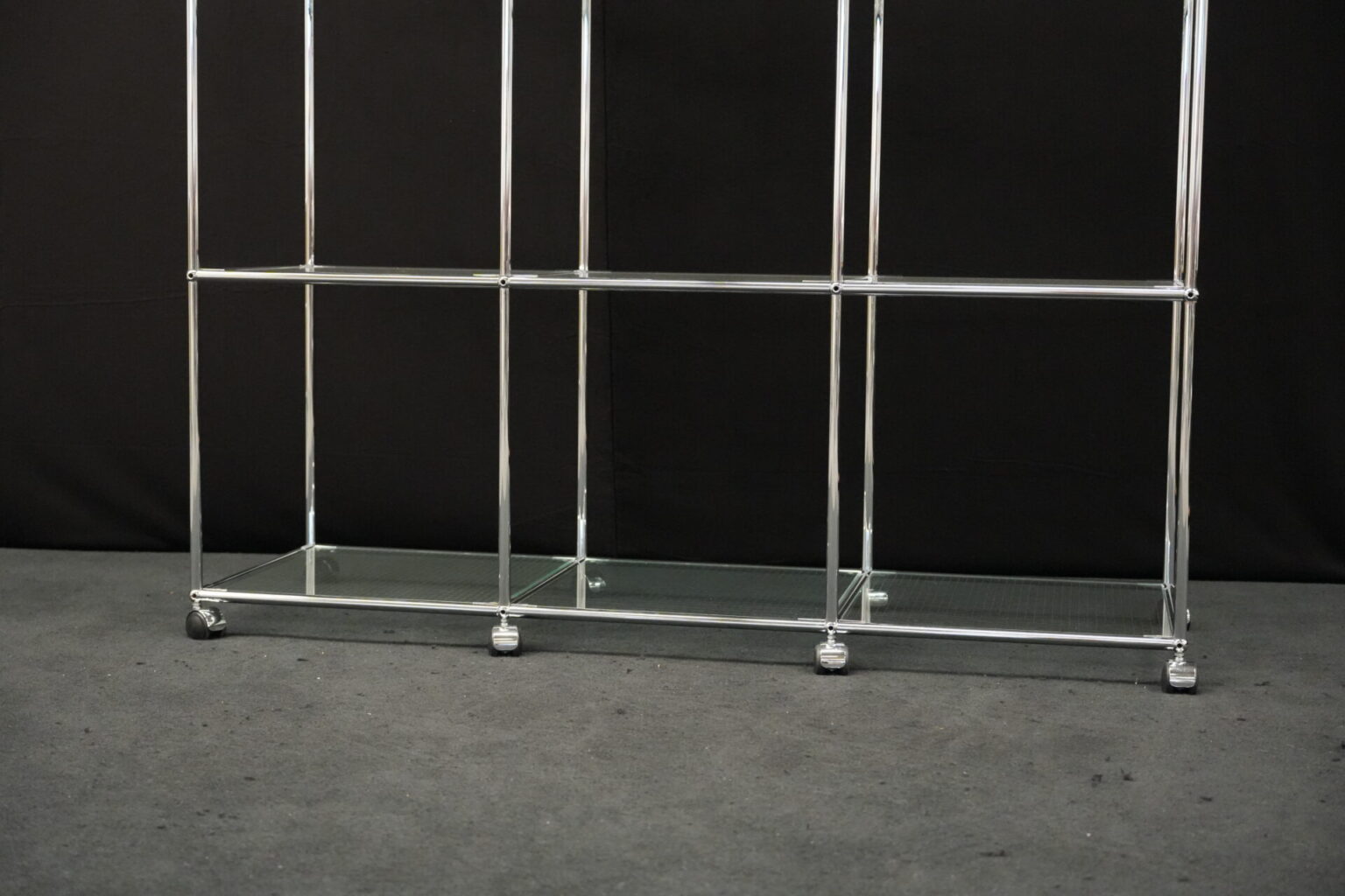 USM Haller Regal | Marke: USM Haller | Gestell: verchromt | Ausstattung: 12 Fächer mit Tablaren aus kariertem Glas, 8x Rollen | Abmessung: 152cm x 210cm x 52cm