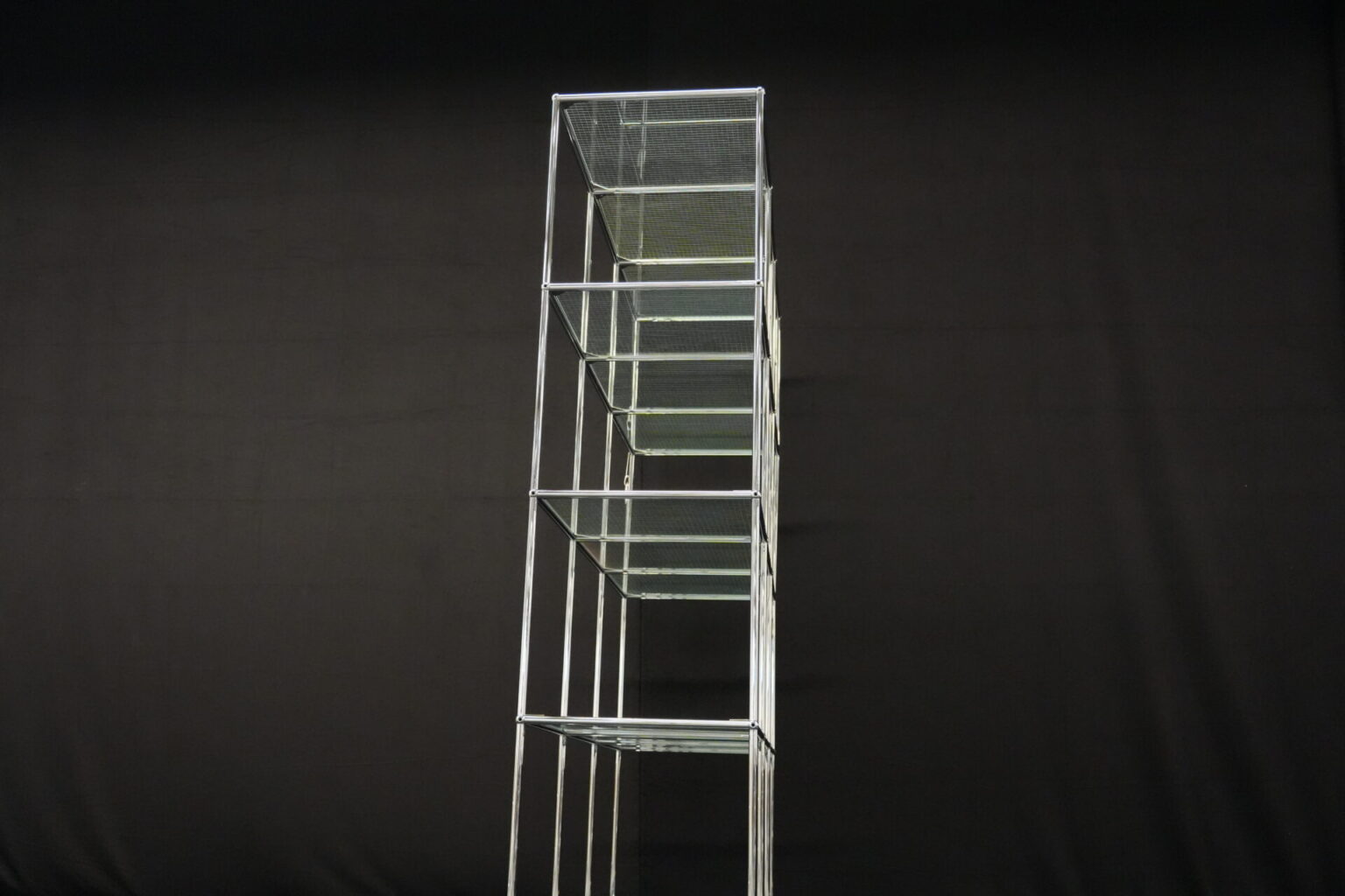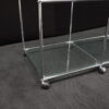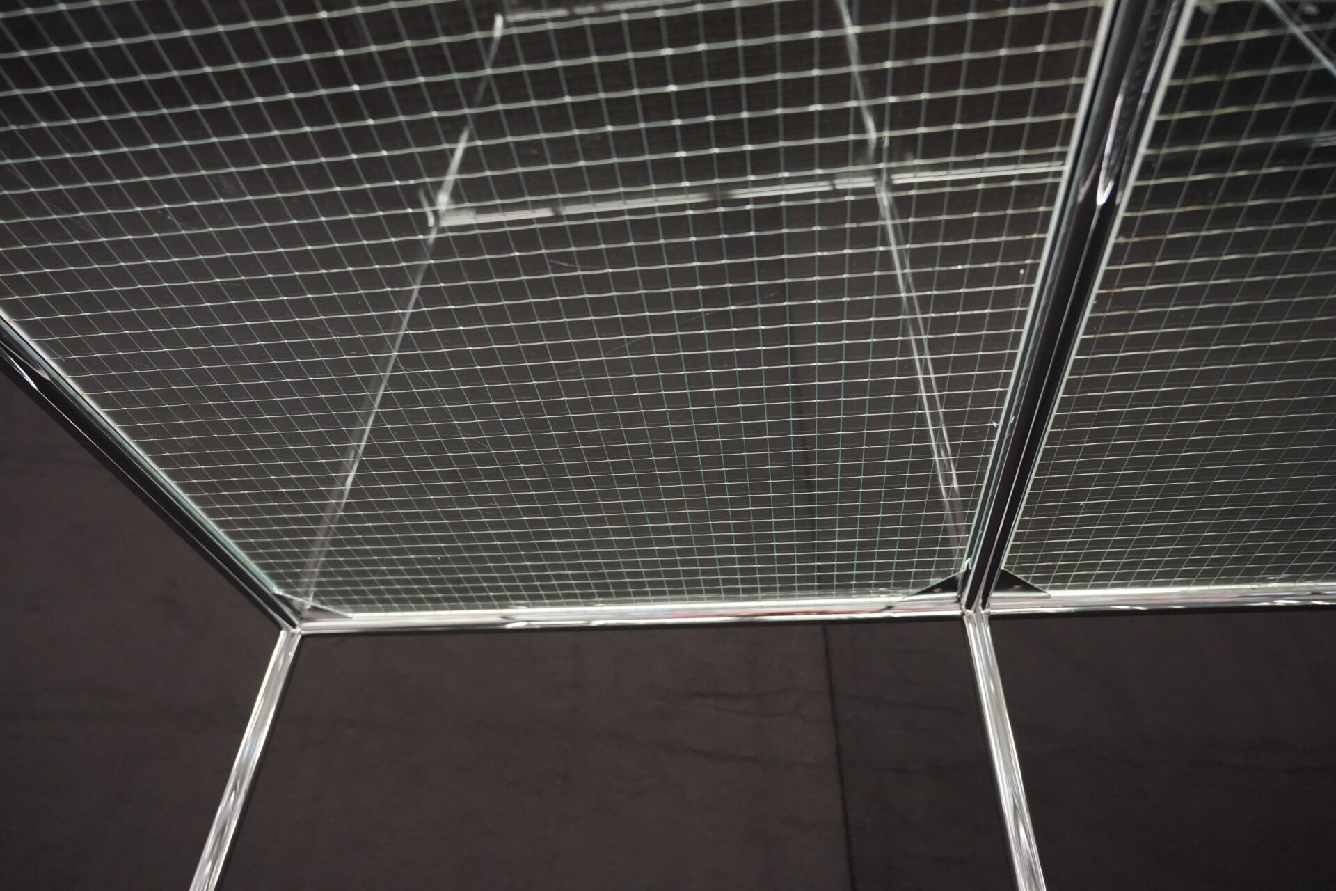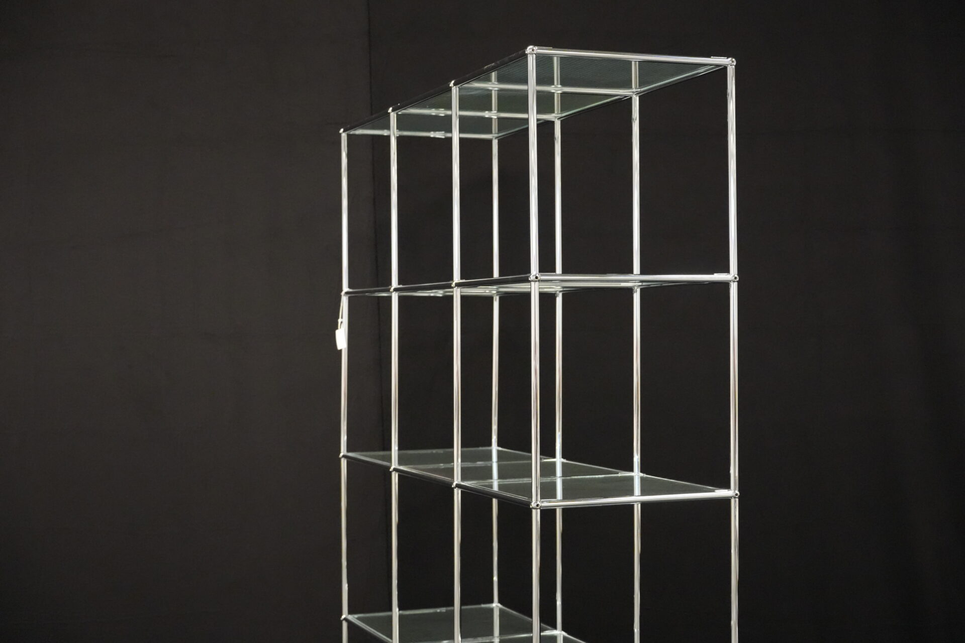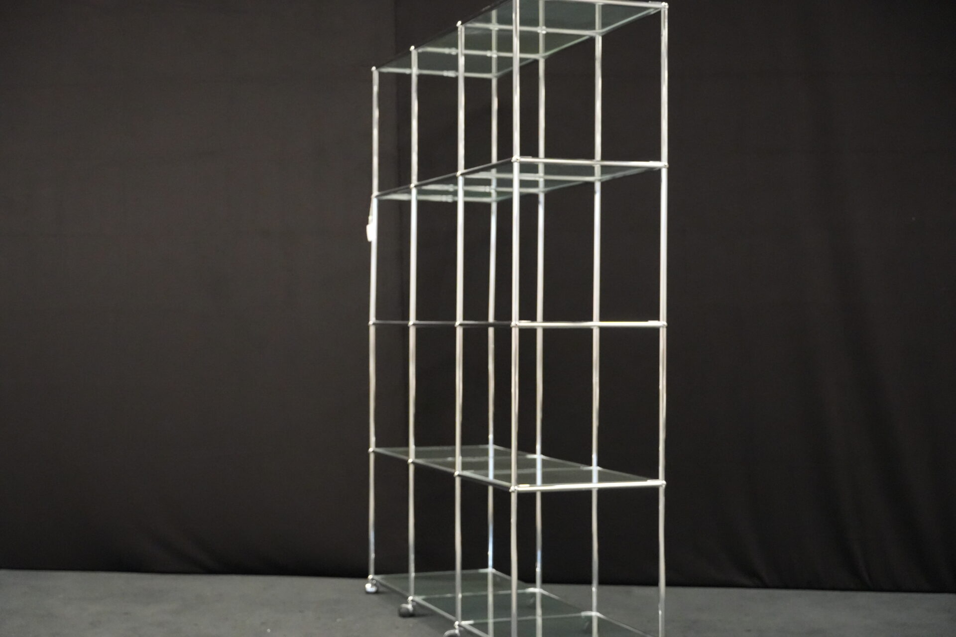 USM Haller Regal | Marke: USM Haller | Gestell: verchromt | Ausstattung: 12 Fächer mit Tablaren aus kariertem Glas, 8x Rollen | Abmessung: 152cm x 210cm x 52cm