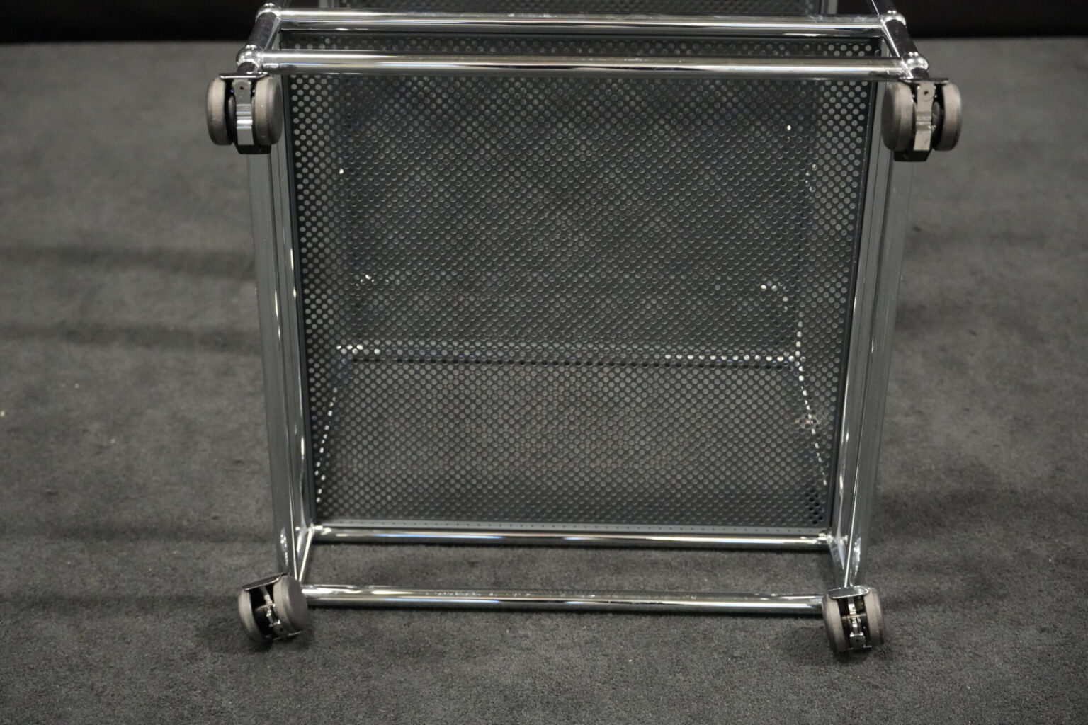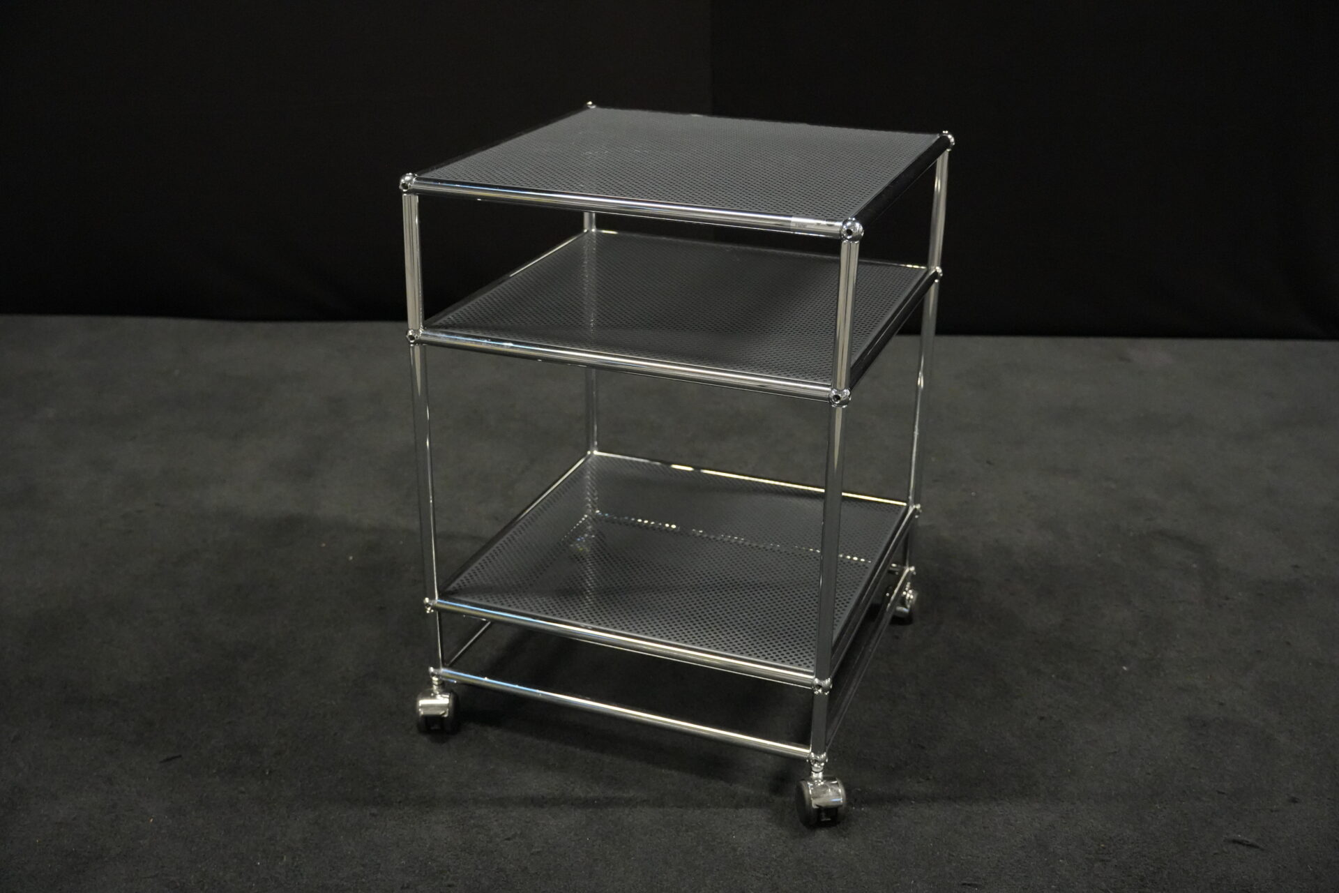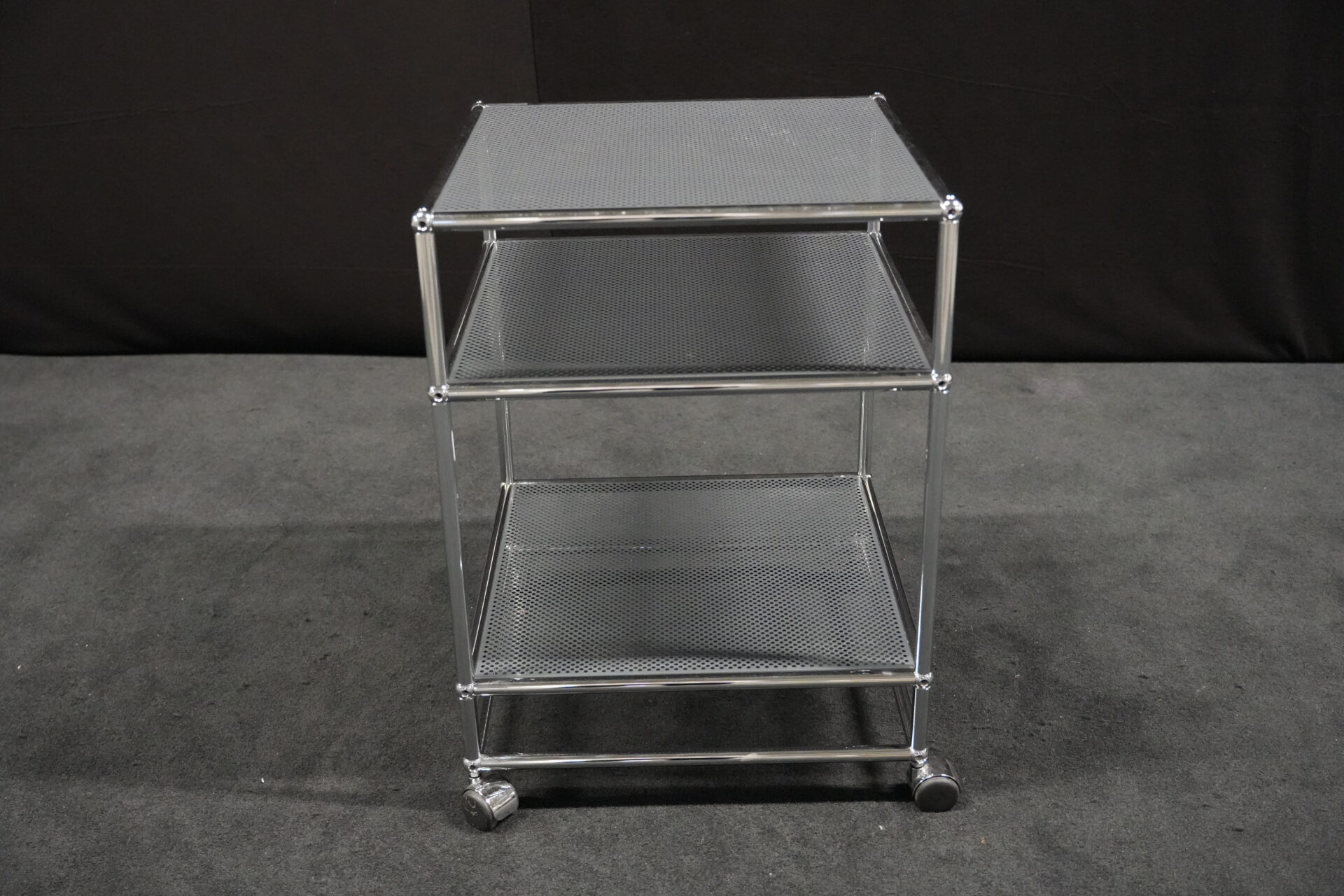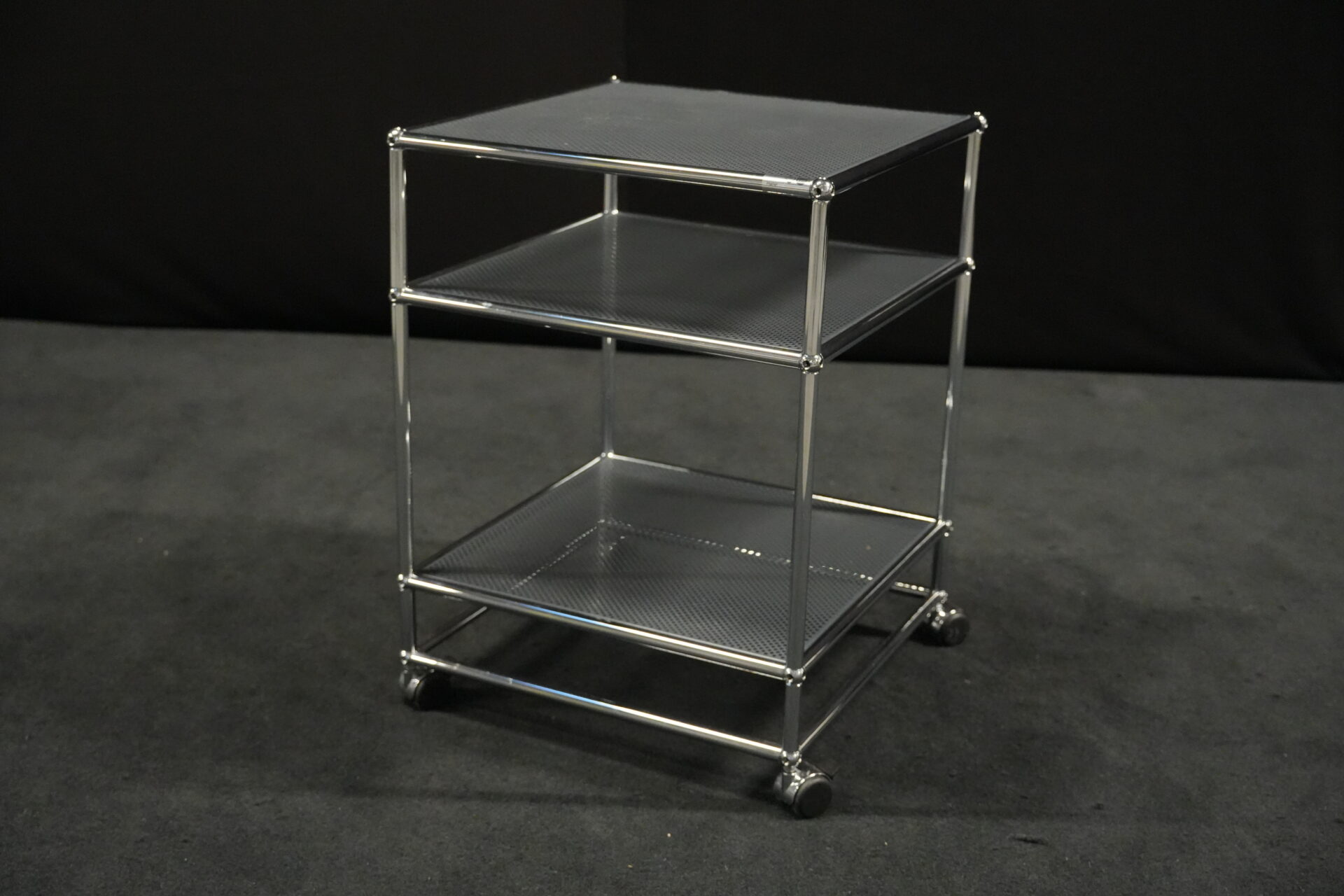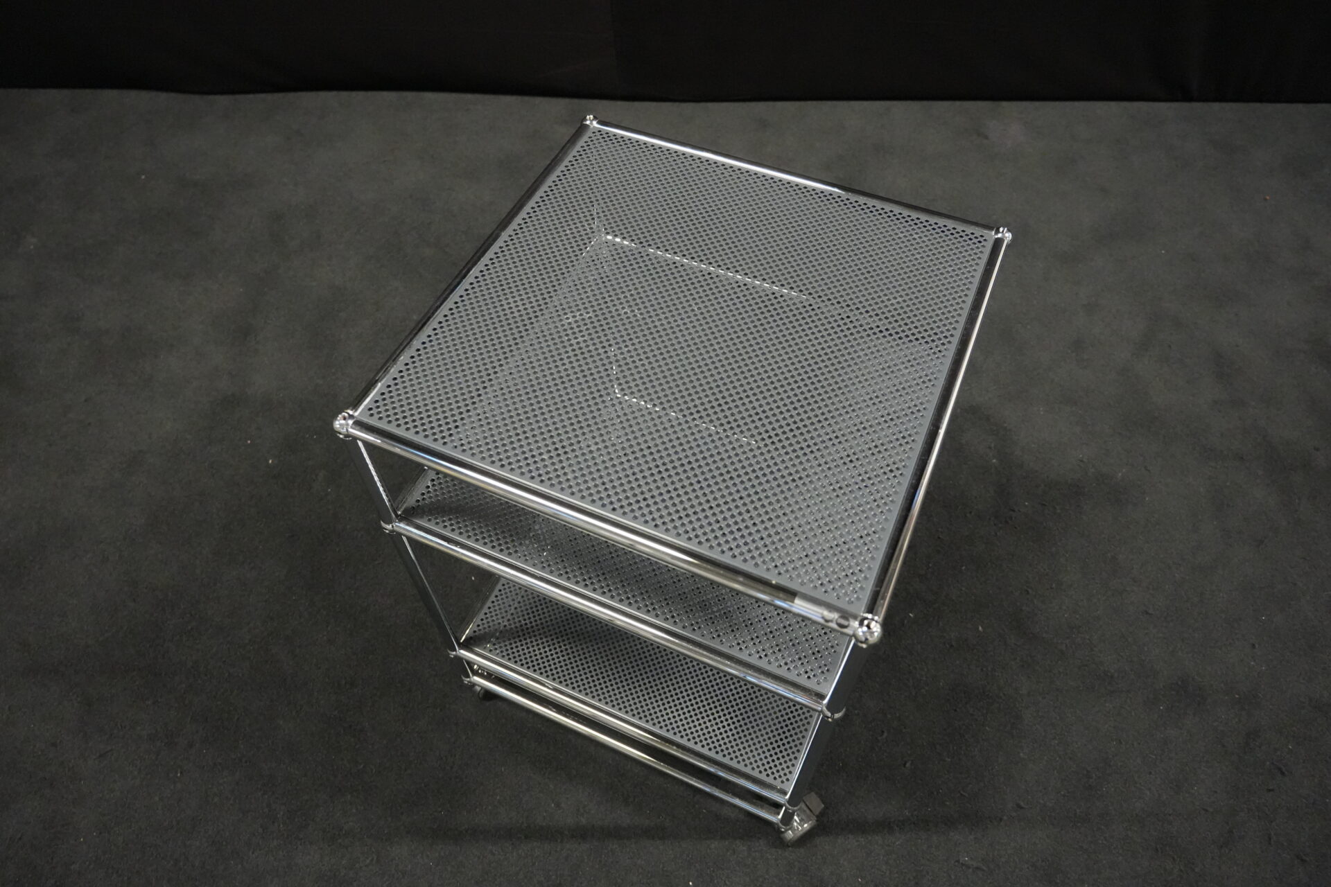 USM Haller Rollwagen mit perforierten Blech in Anthrazitgrau RAL 7016 und verchromten Gestell | Marke: USM Haller | Farbe: Anthrazitgrau RAL 7016| Gestell: verchromt | Ausstattung: Rollen 4x | Abmessungen: H: 72cm | B: 50cm | T: 50cm