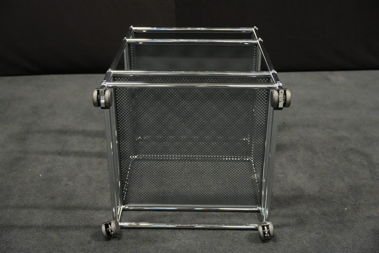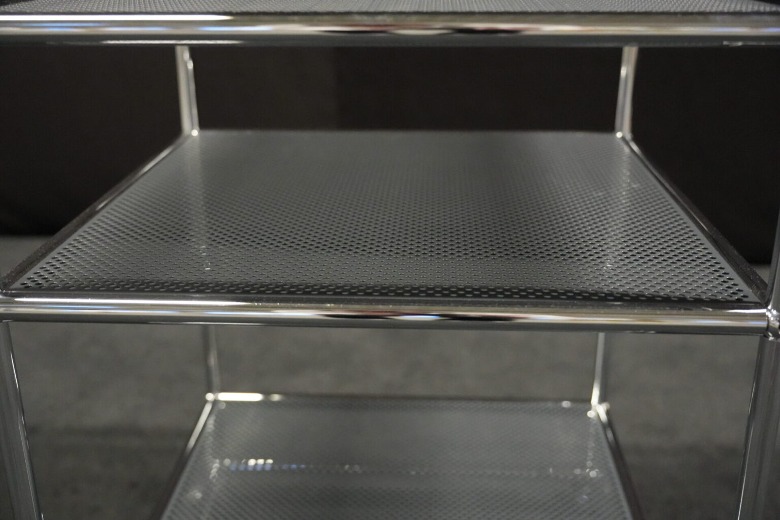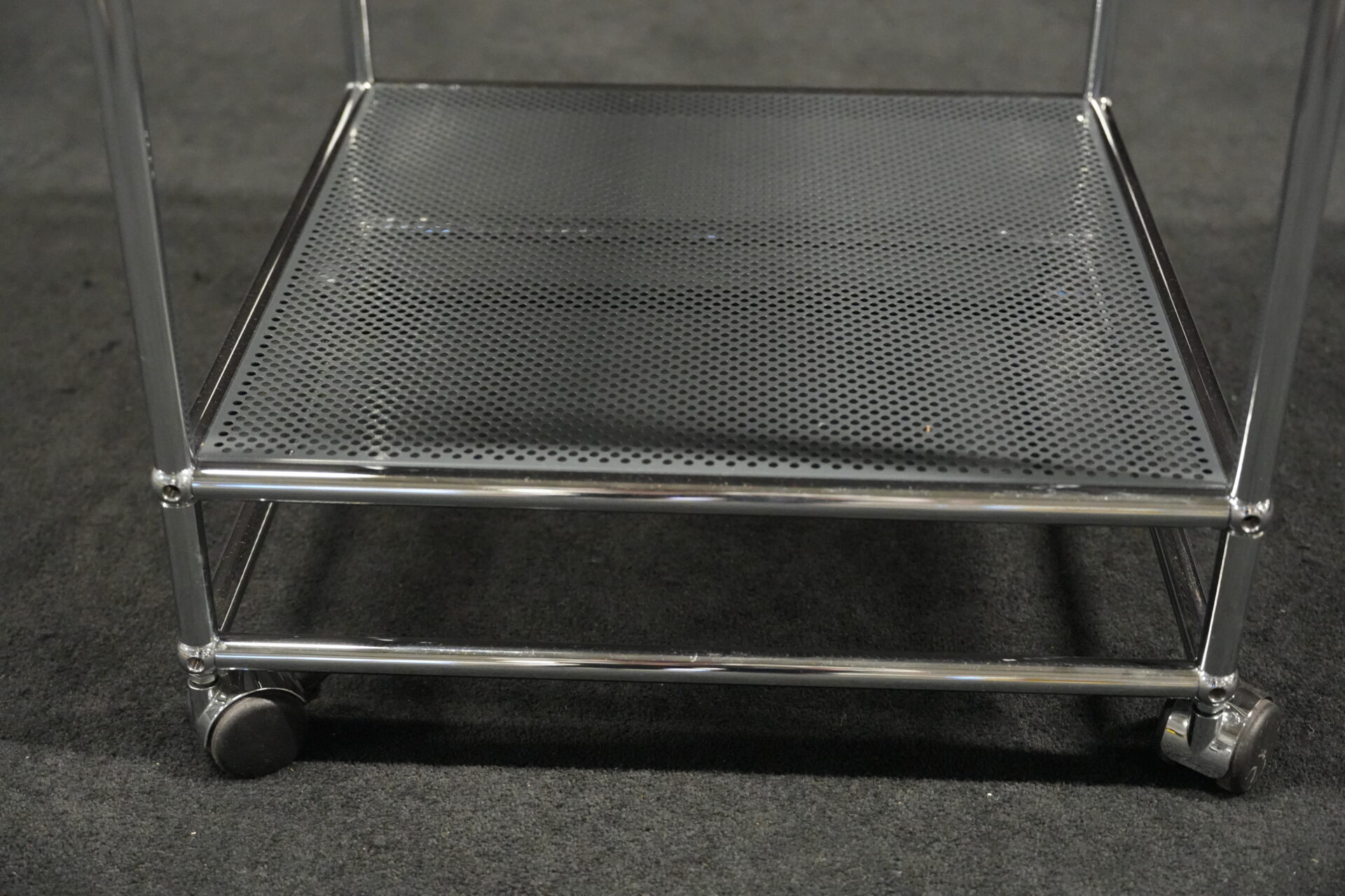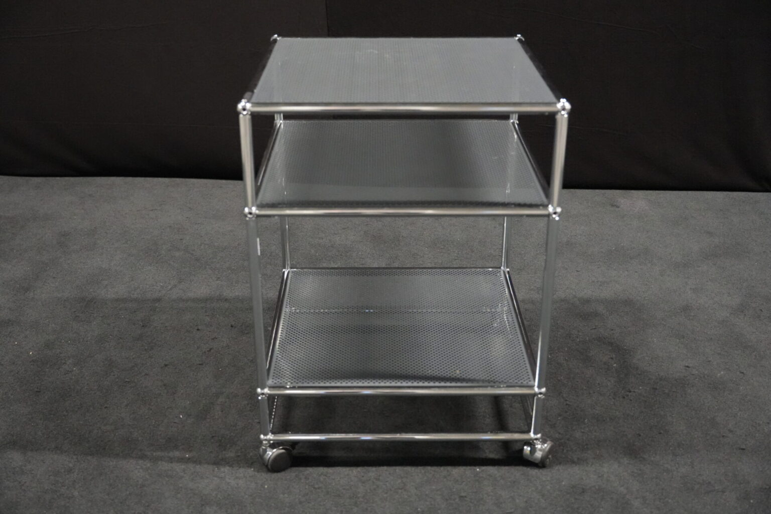 USM Haller Rollwagen mit perforierten Blech in Anthrazitgrau RAL 7016 und verchromten Gestell | Marke: USM Haller | Farbe: Anthrazitgrau RAL 7016| Gestell: verchromt | Ausstattung: Rollen 4x | Abmessungen: H: 72cm | B: 50cm | T: 50cm
