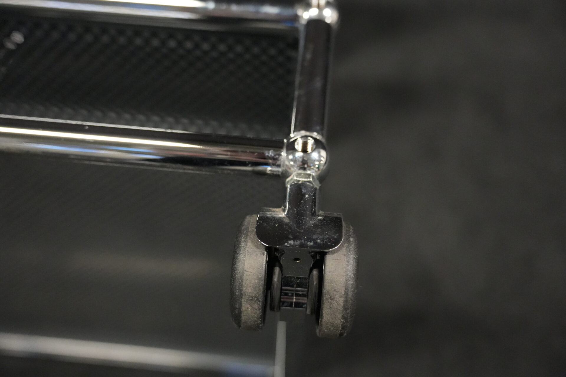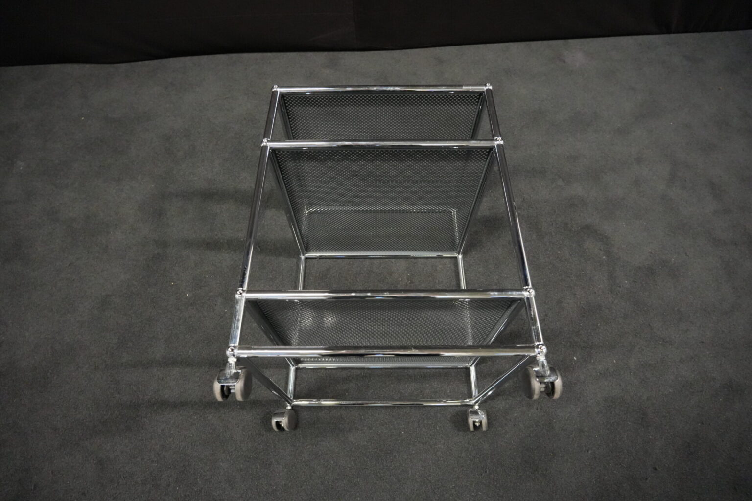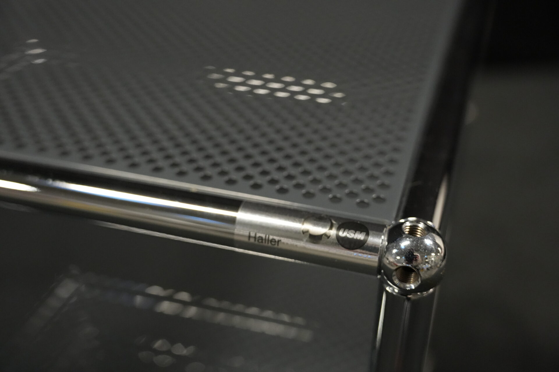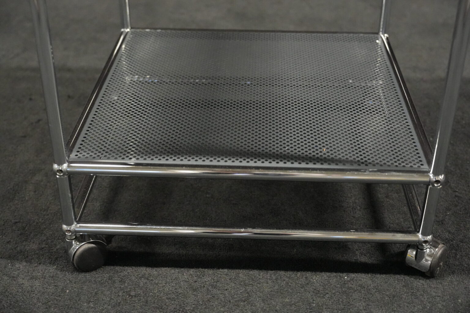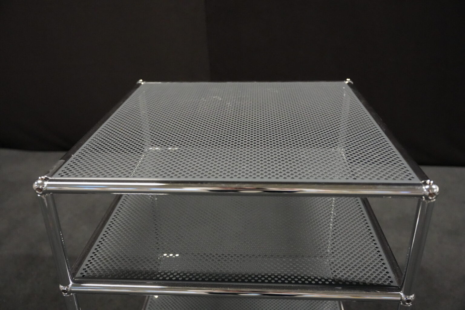 USM Haller Rollwagen mit perforierten Blech in Anthrazitgrau RAL 7016 und verchromten Gestell | Marke: USM Haller | Farbe: Anthrazitgrau RAL 7016| Gestell: verchromt | Ausstattung: Rollen 4x | Abmessungen: H: 72cm | B: 50cm | T: 50cm