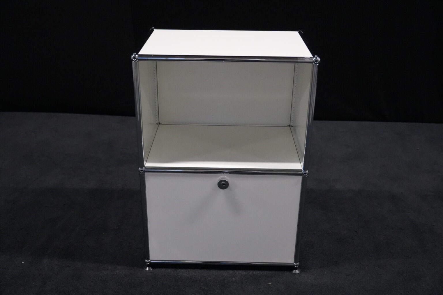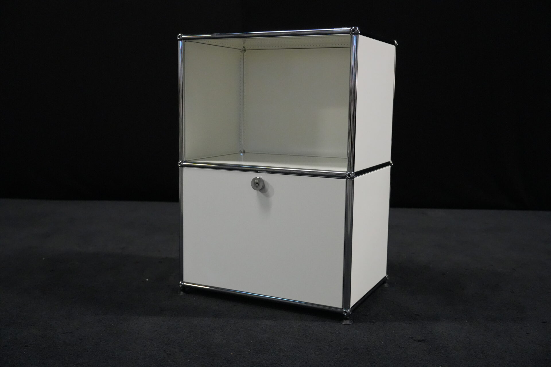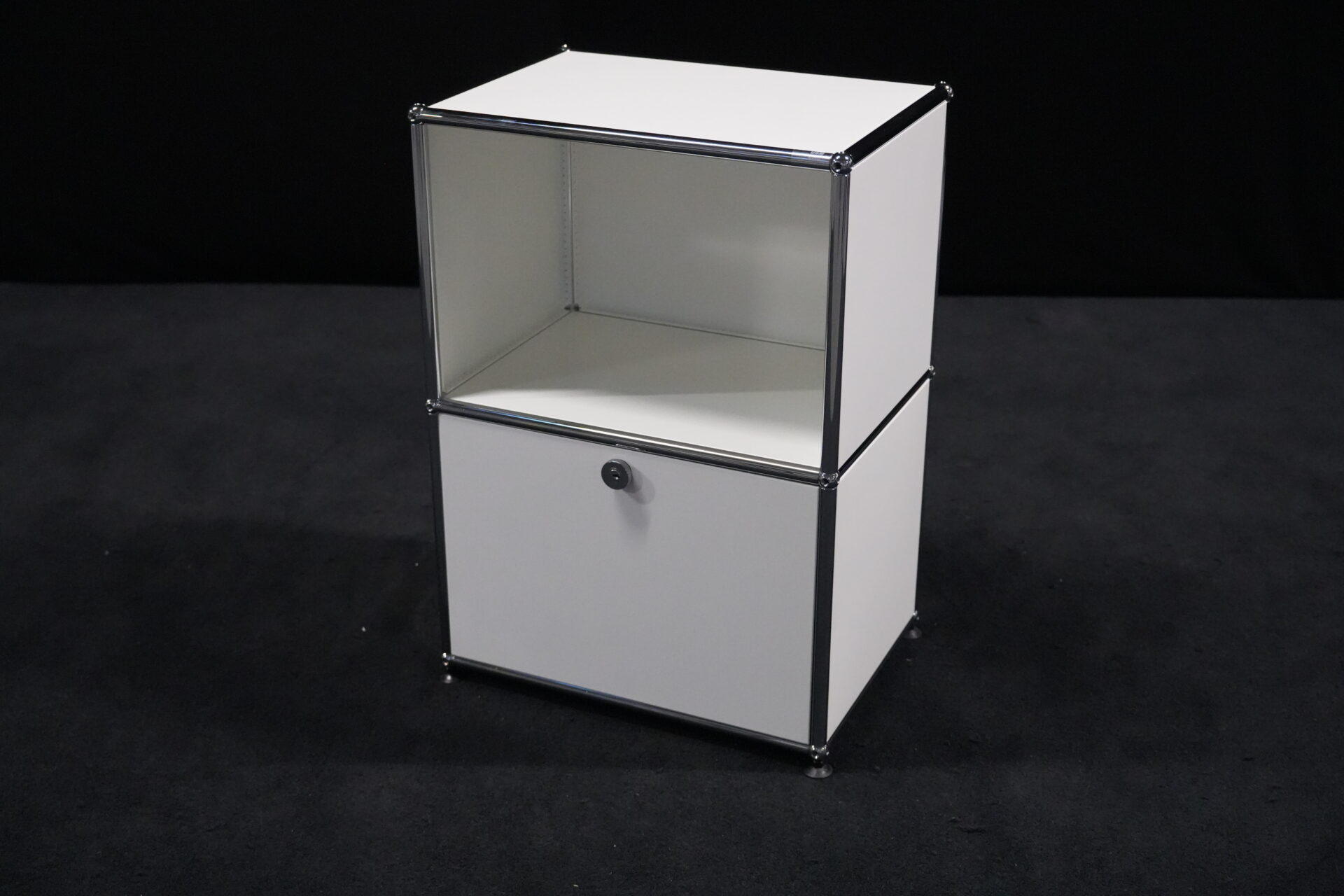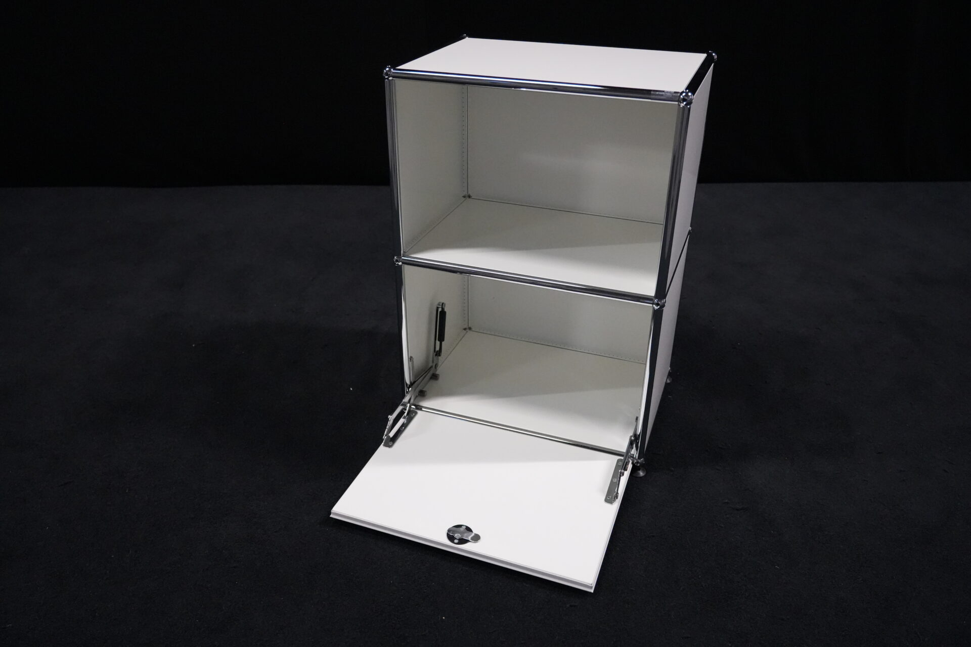 USM Haller Sideboard Reinweiß RAL 9010 mit 2 Fächern und 1x Klapptür (unten) | Marke: USM Haller | Farbe: Reinweiß | Ausstattung: eine Klapptür (unten), Nivelierfüße 4x | Abmessung: H: 74cm | B: 50cm | 35cm