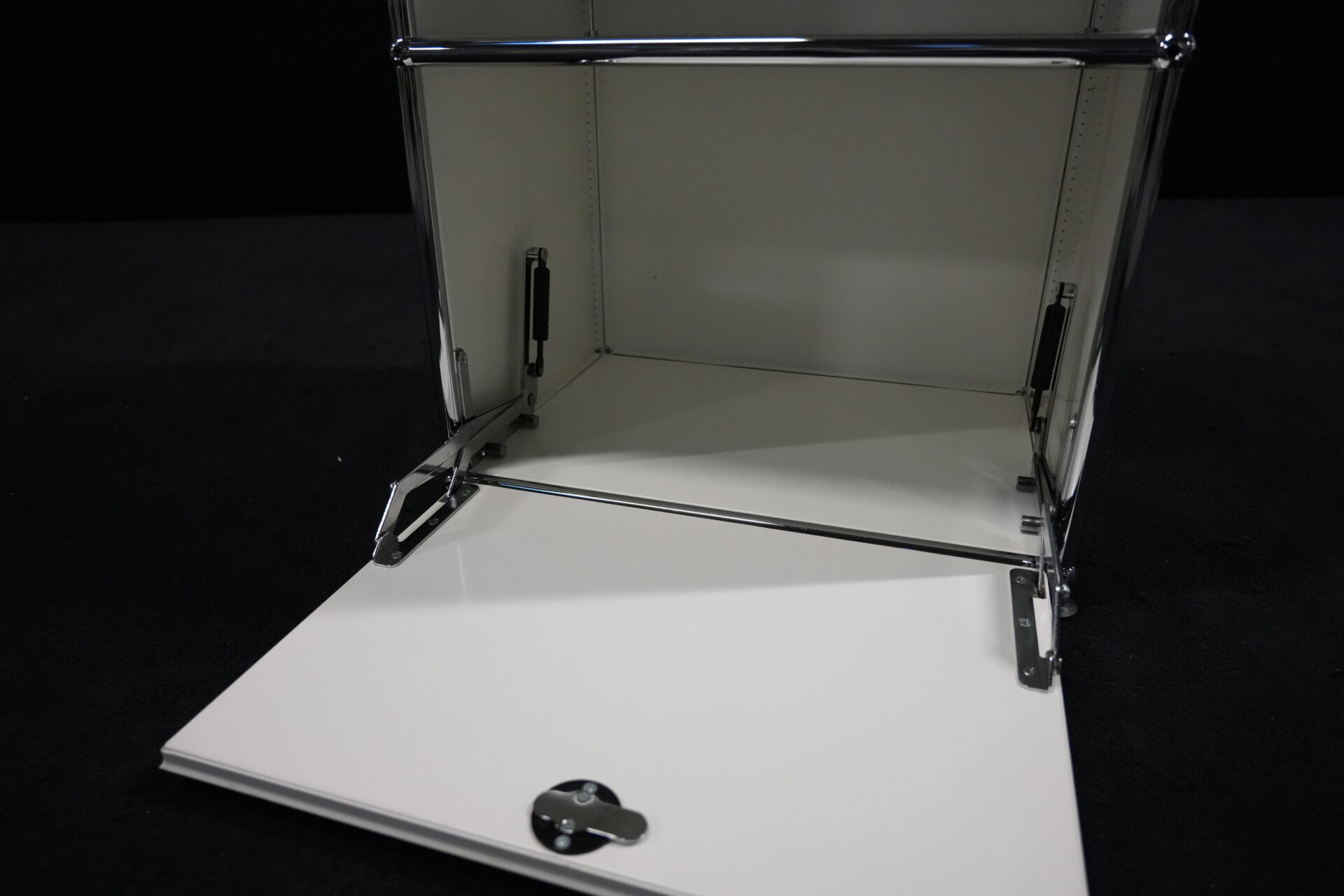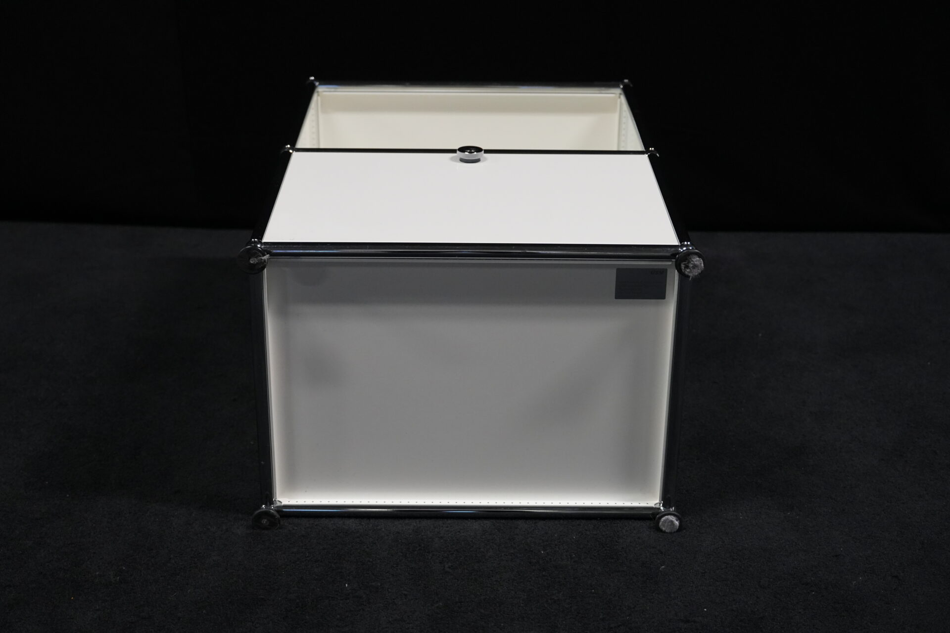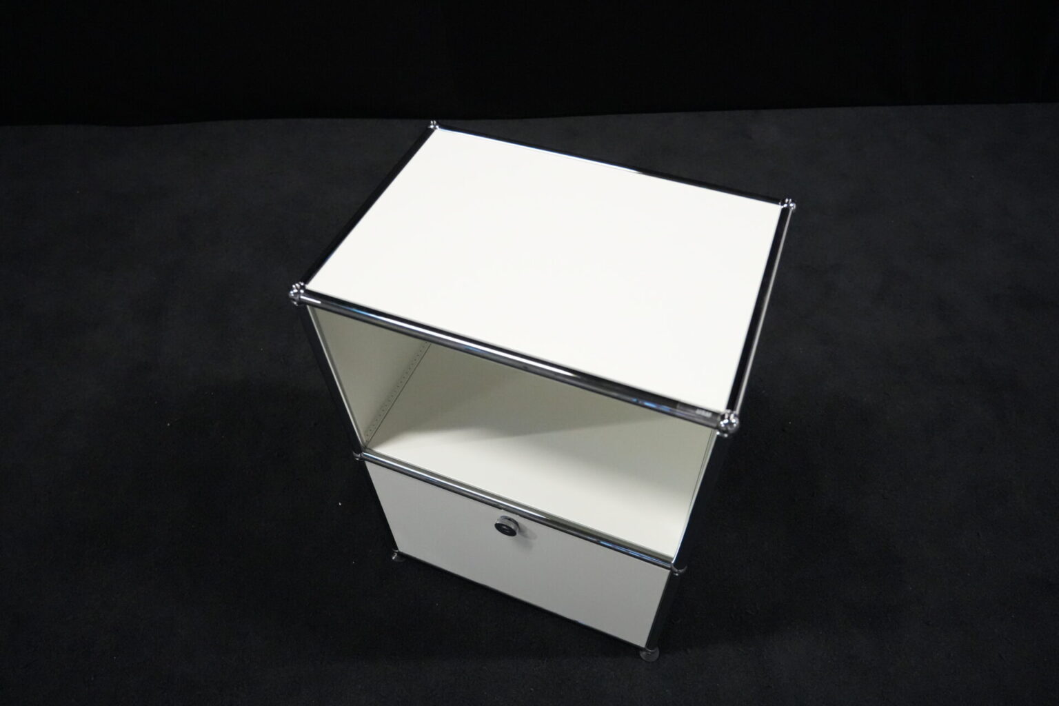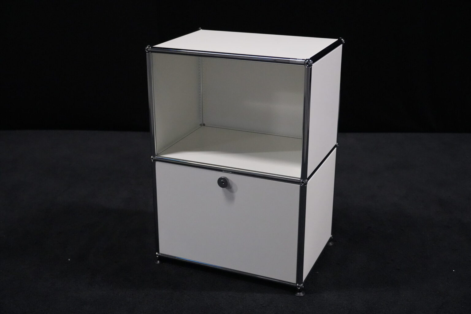 USM Haller Sideboard Reinweiß RAL 9010 mit 2 Fächern und 1x Klapptür (unten) | Marke: USM Haller | Farbe: Reinweiß | Ausstattung: eine Klapptür (unten), Nivelierfüße 4x | Abmessung: H: 74cm | B: 50cm | 35cm