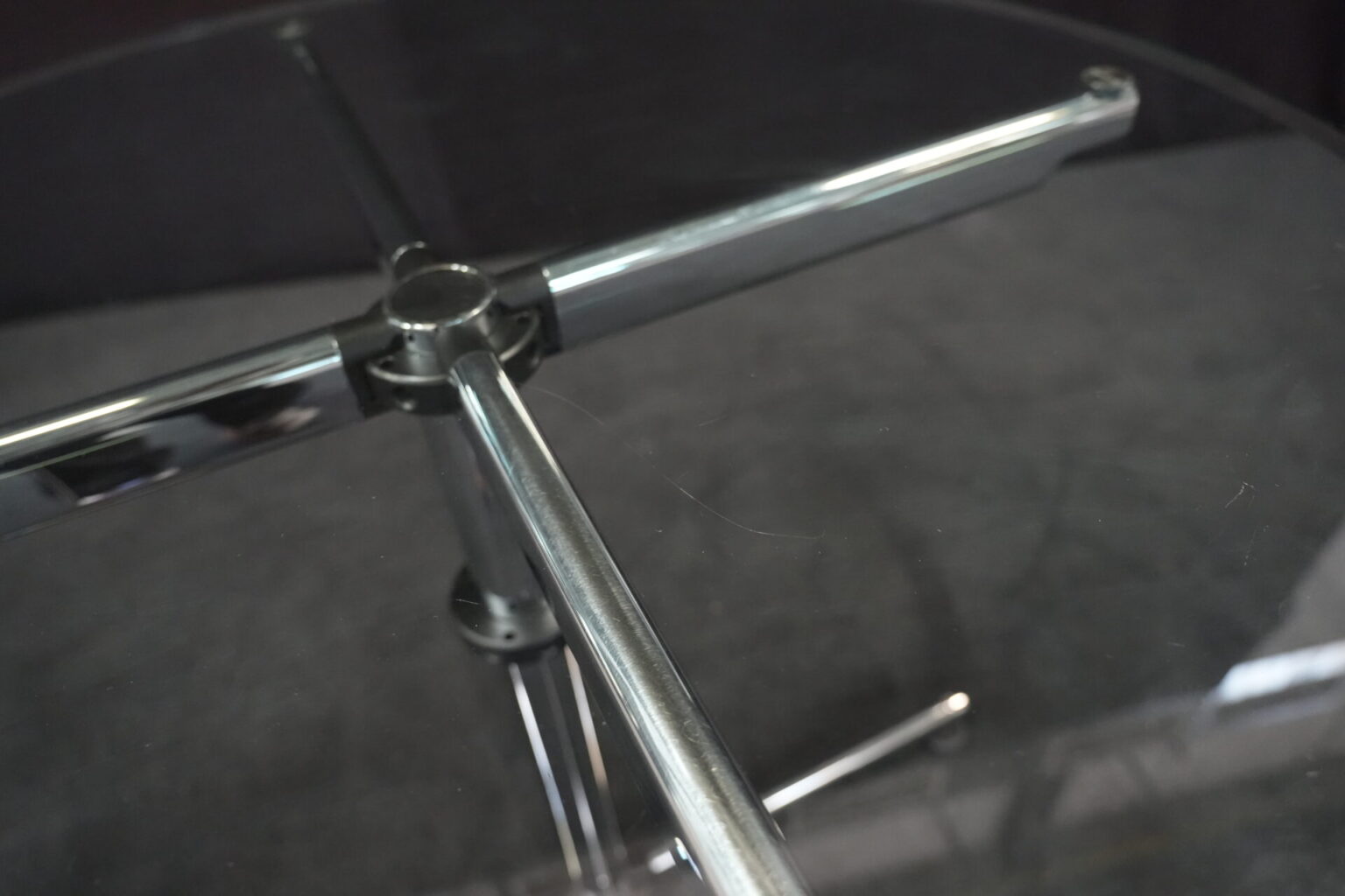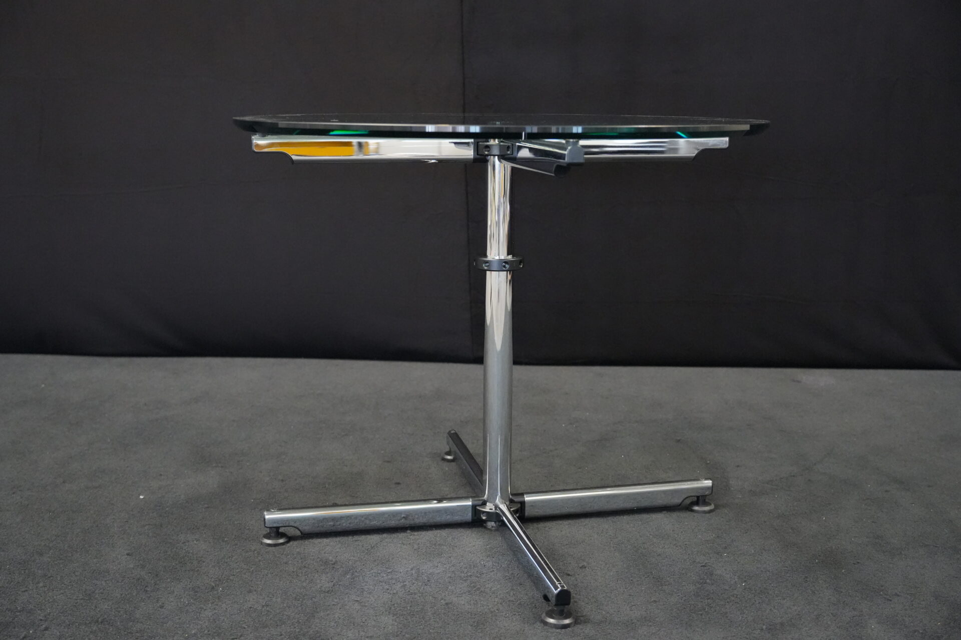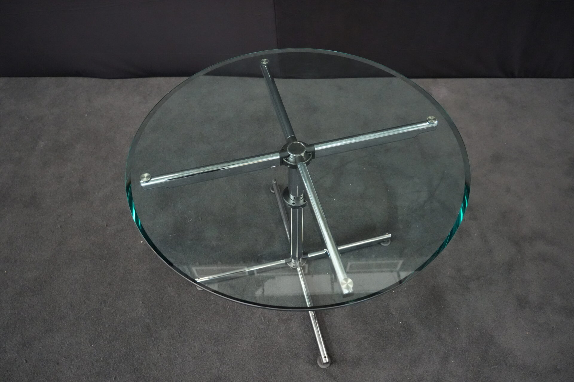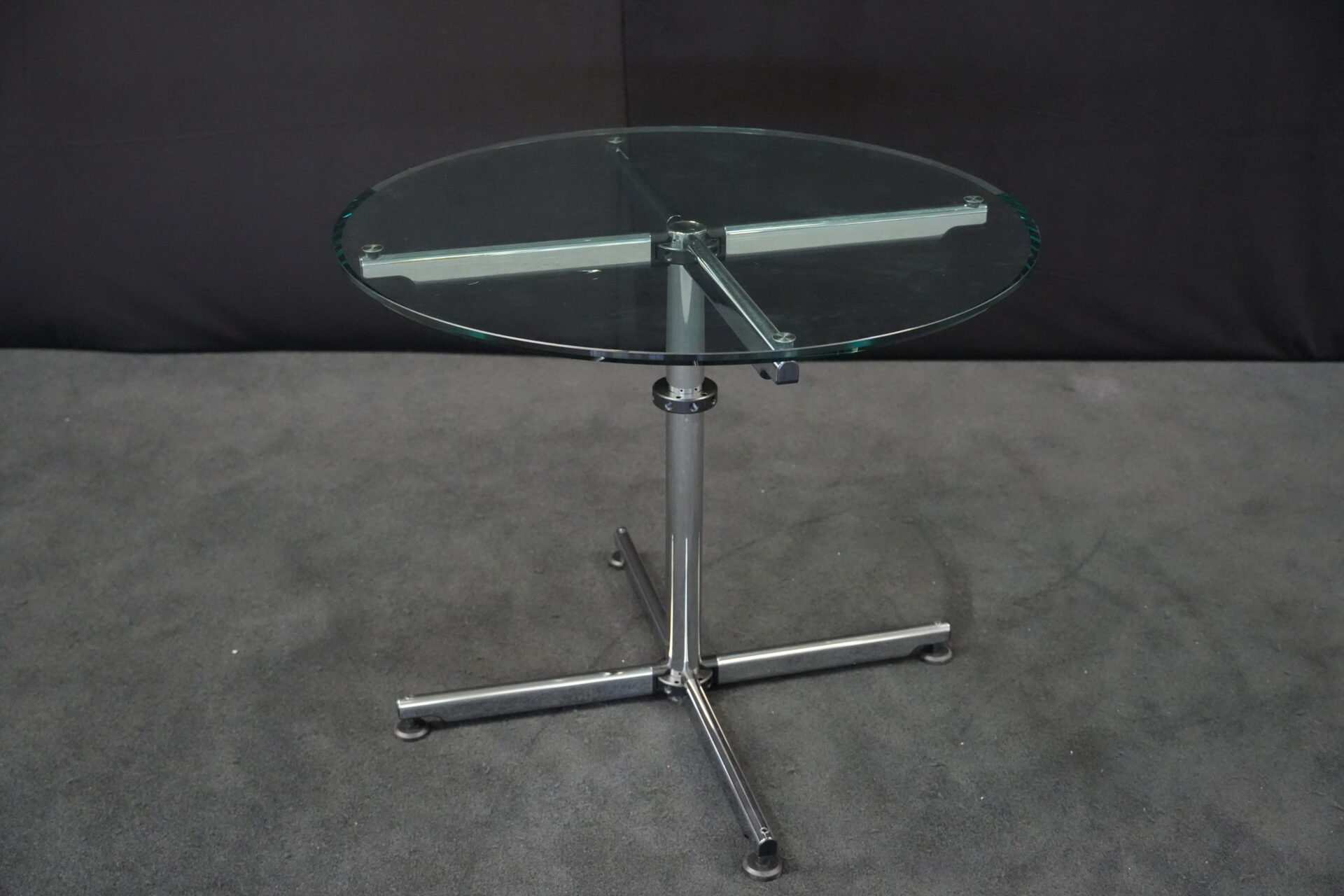 USM Kitos Besprechungstisch Klarglas | Marke: USM Kitos | Tischplatte: Klarglas | Gestell: Kitos / verchromt | Abmessungen: Tischplatte ø: 90cm | H: 74cm