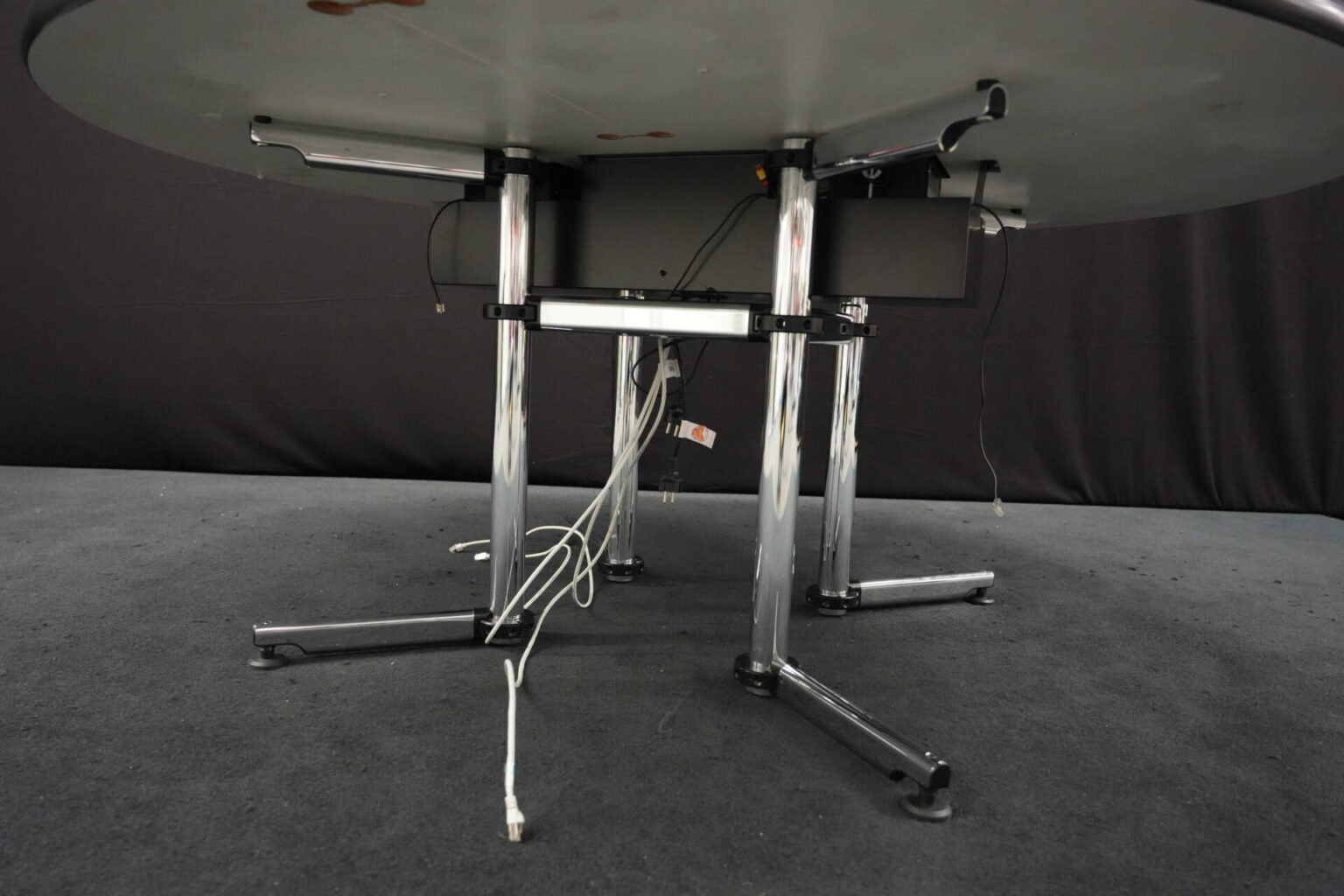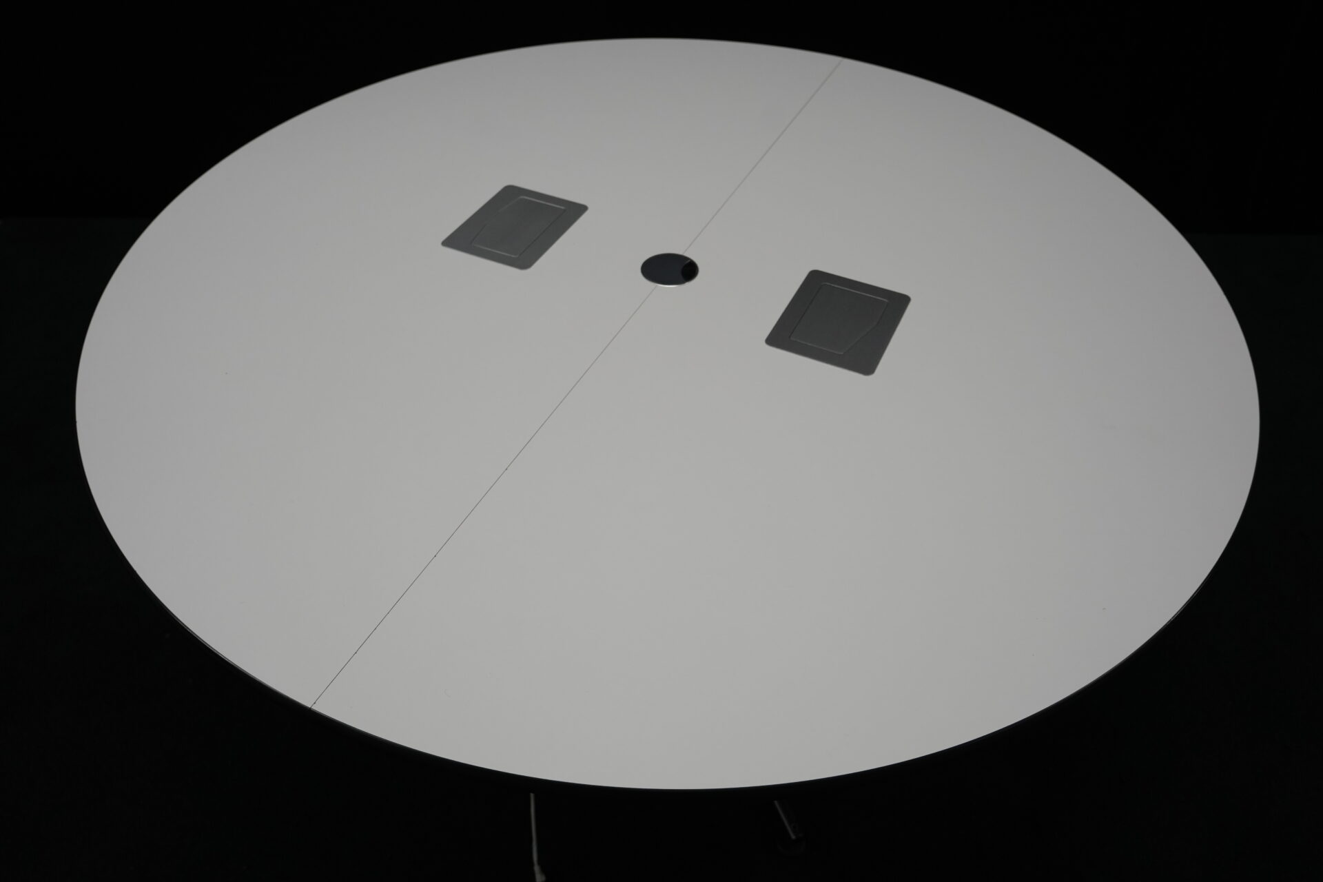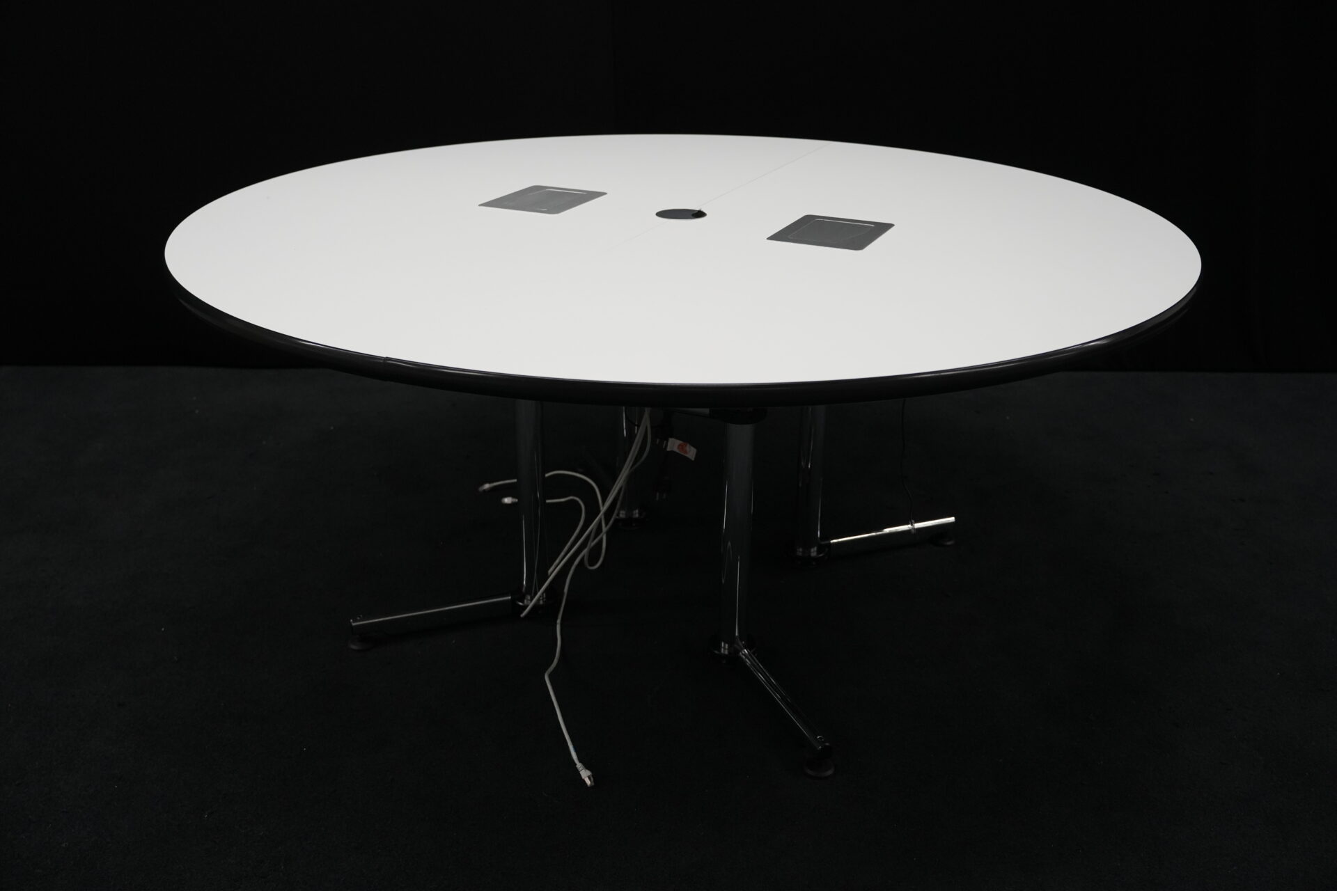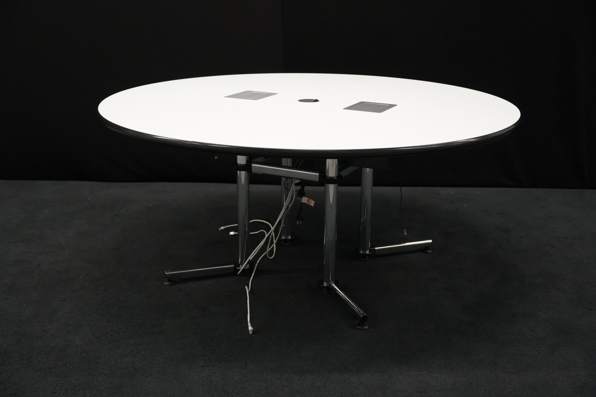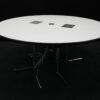USM Kitos Konferenztisch Kunstharz / weiß | Marke: USM Kitos | Tischplatte: weiß | Gestell: Kitos verchromt | Ausstattung: Kabeleinlass, 2x integrierte Steckdosen | Abmessungen: Tischplatte ø: 170cm | H: 75cm