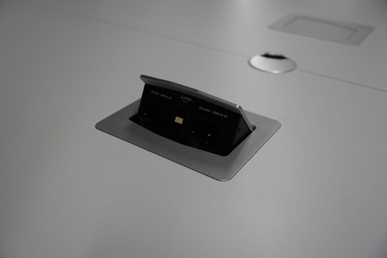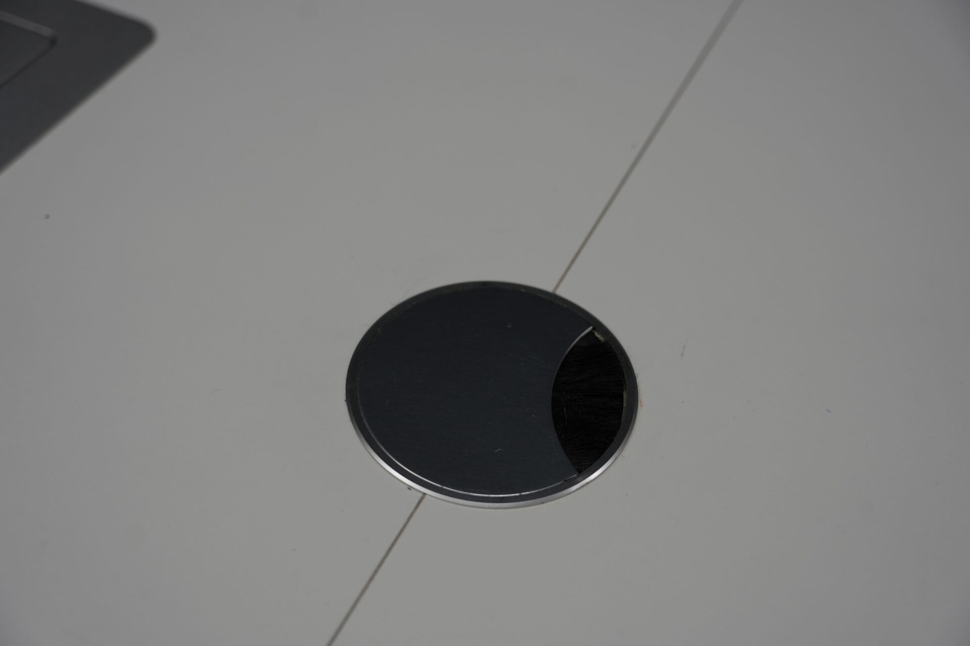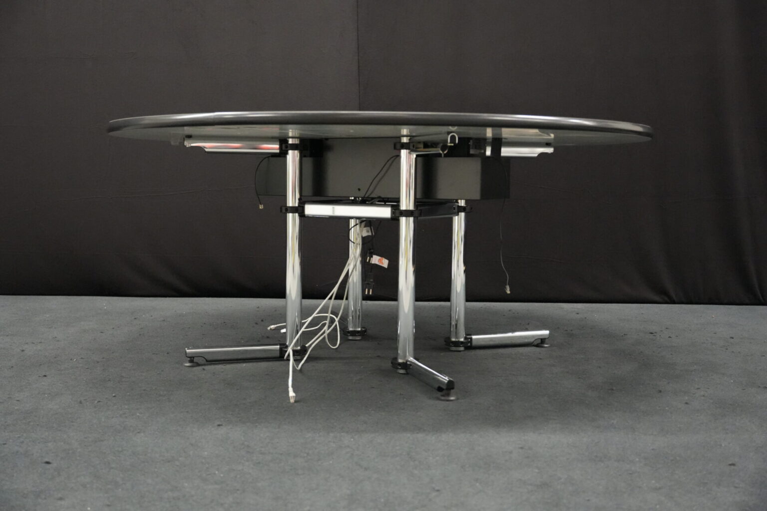 USM Kitos Konferenztisch Kunstharz / weiß | Marke: USM Kitos | Tischplatte: weiß | Gestell: Kitos verchromt | Ausstattung: Kabeleinlass, 2x integrierte Steckdosen | Abmessungen: Tischplatte ø: 170cm | H: 75cm