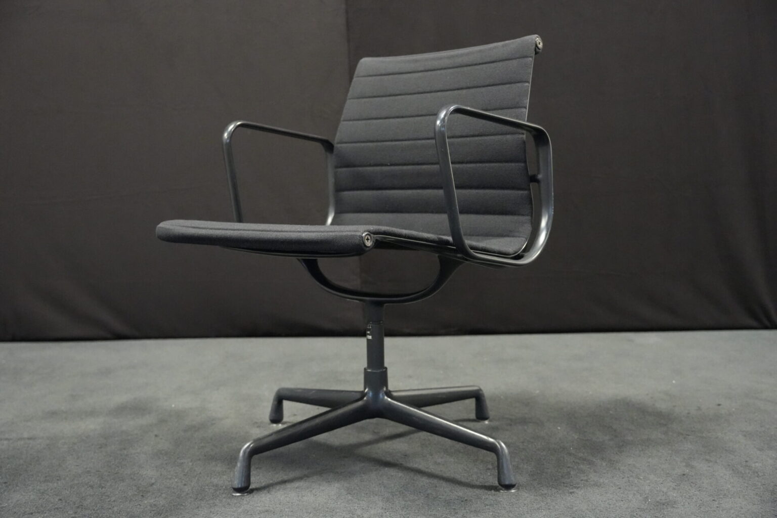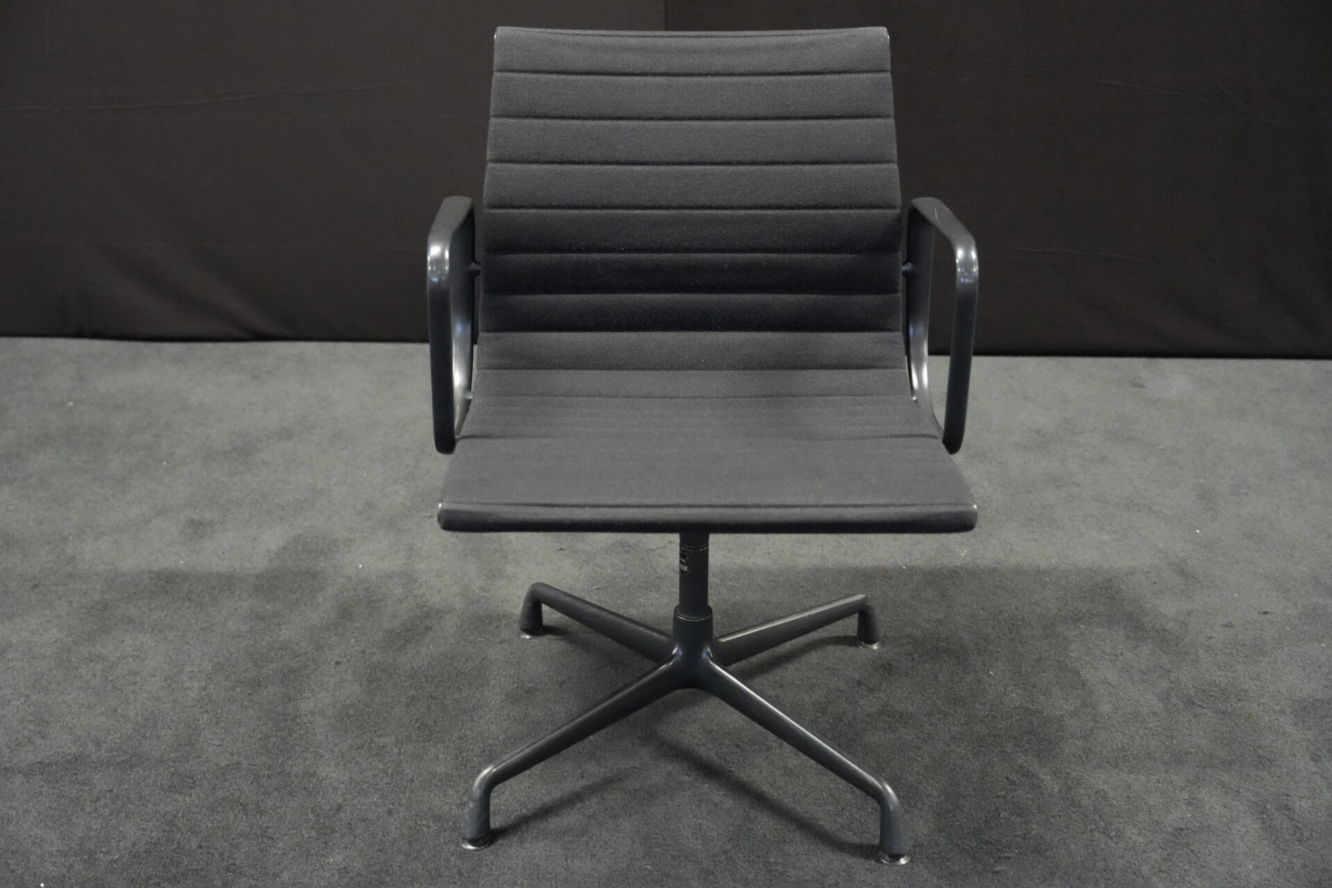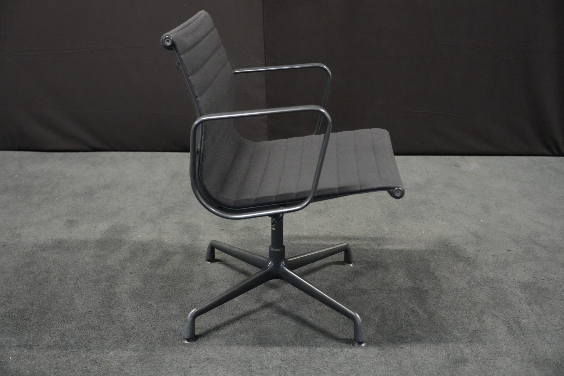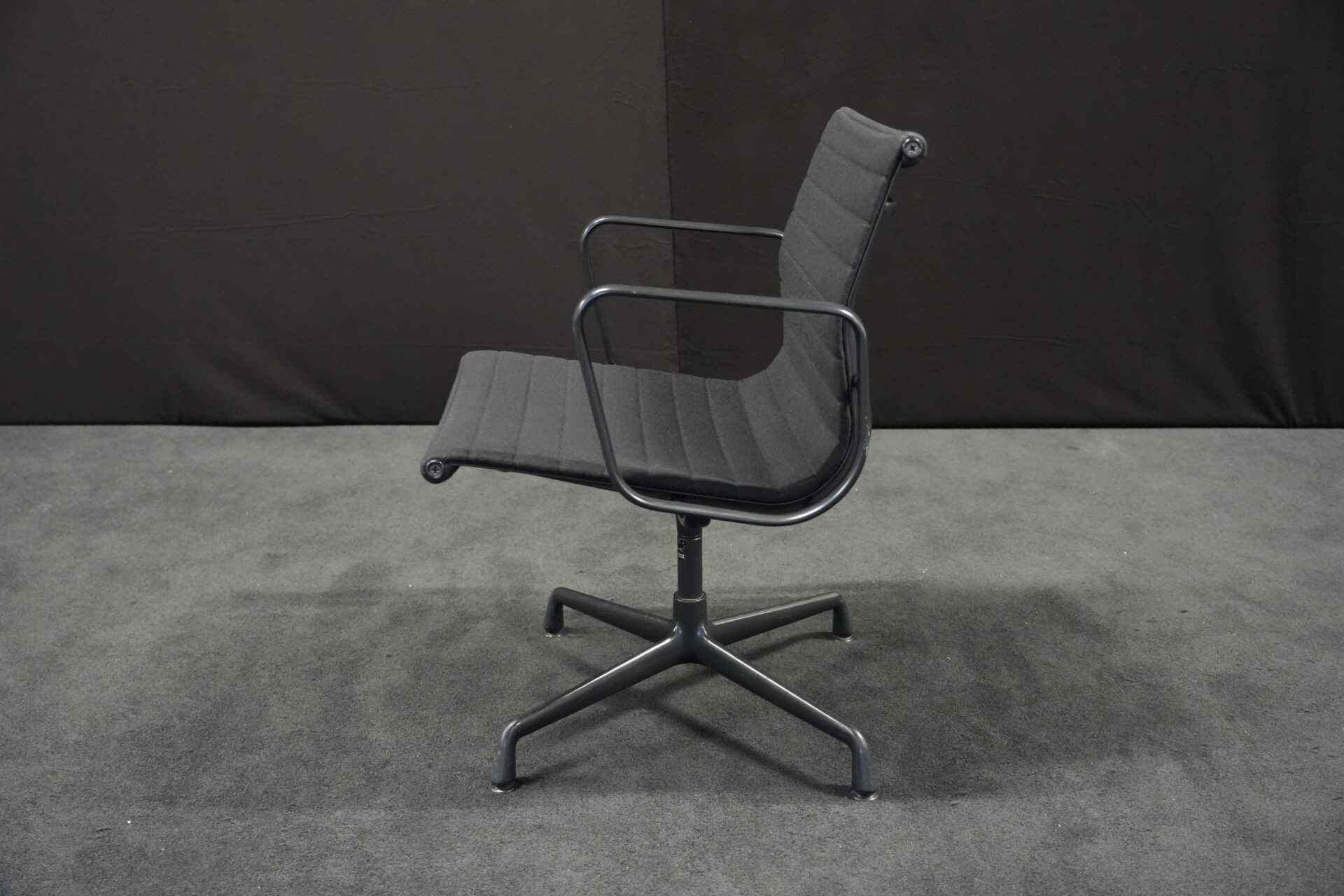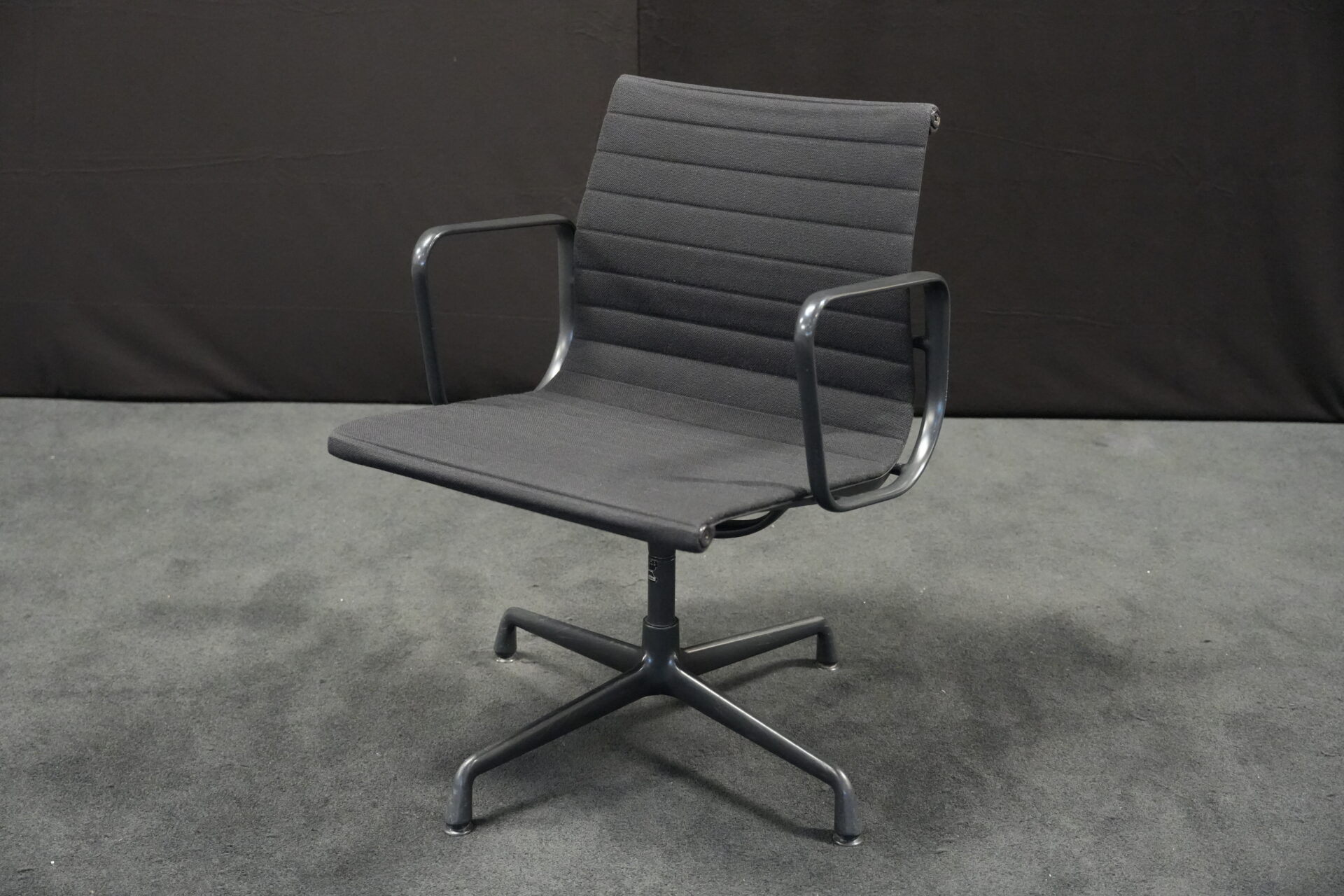 Vitra EA 108 Hopsak / schwarz (drehbar) | Marke: Vitra | Bezug: Hopsak / schwarz | Gestell: Aluminium-Druckguss schwarz | Ausstattung: mit Armlehnen und mittelhoher Rückenlehne, 4-Sternfuß | Abmessungen: H: 83cm | SH: 40cm | B: 58cm | T: 59cm