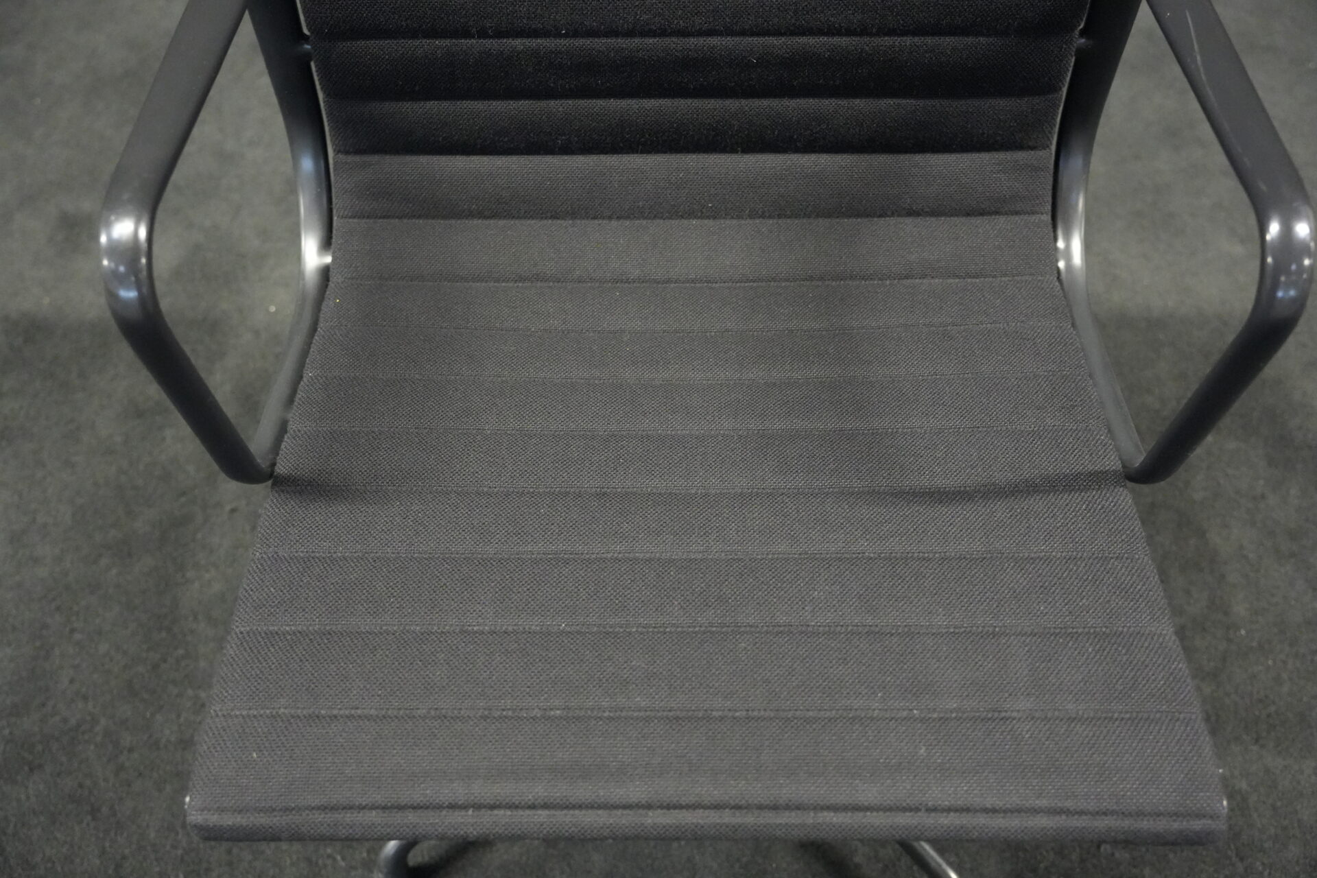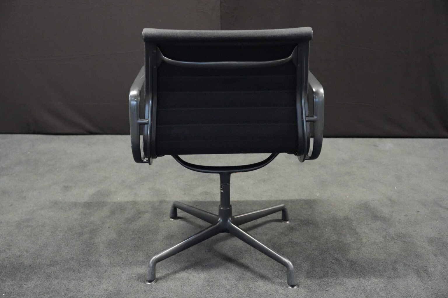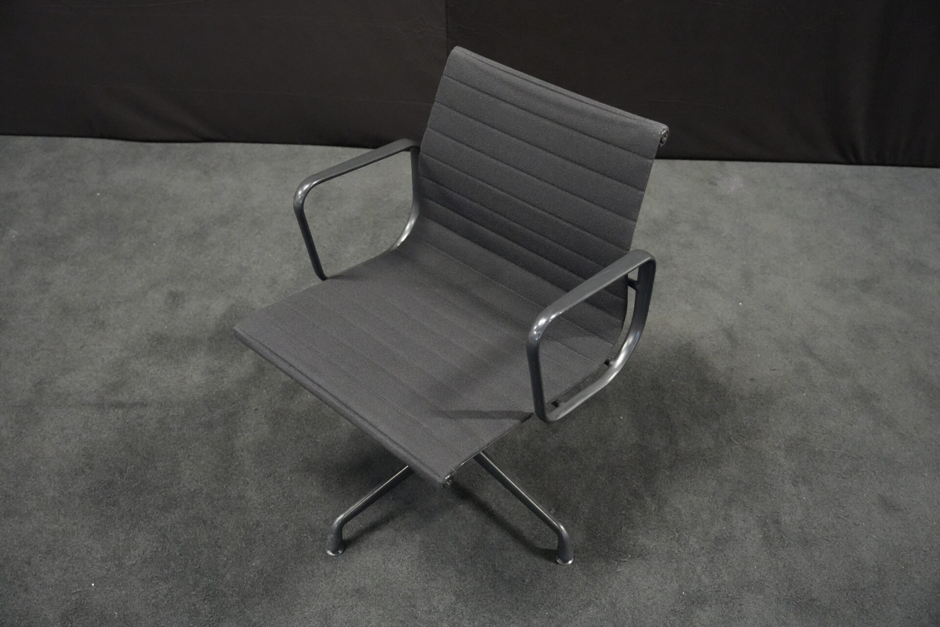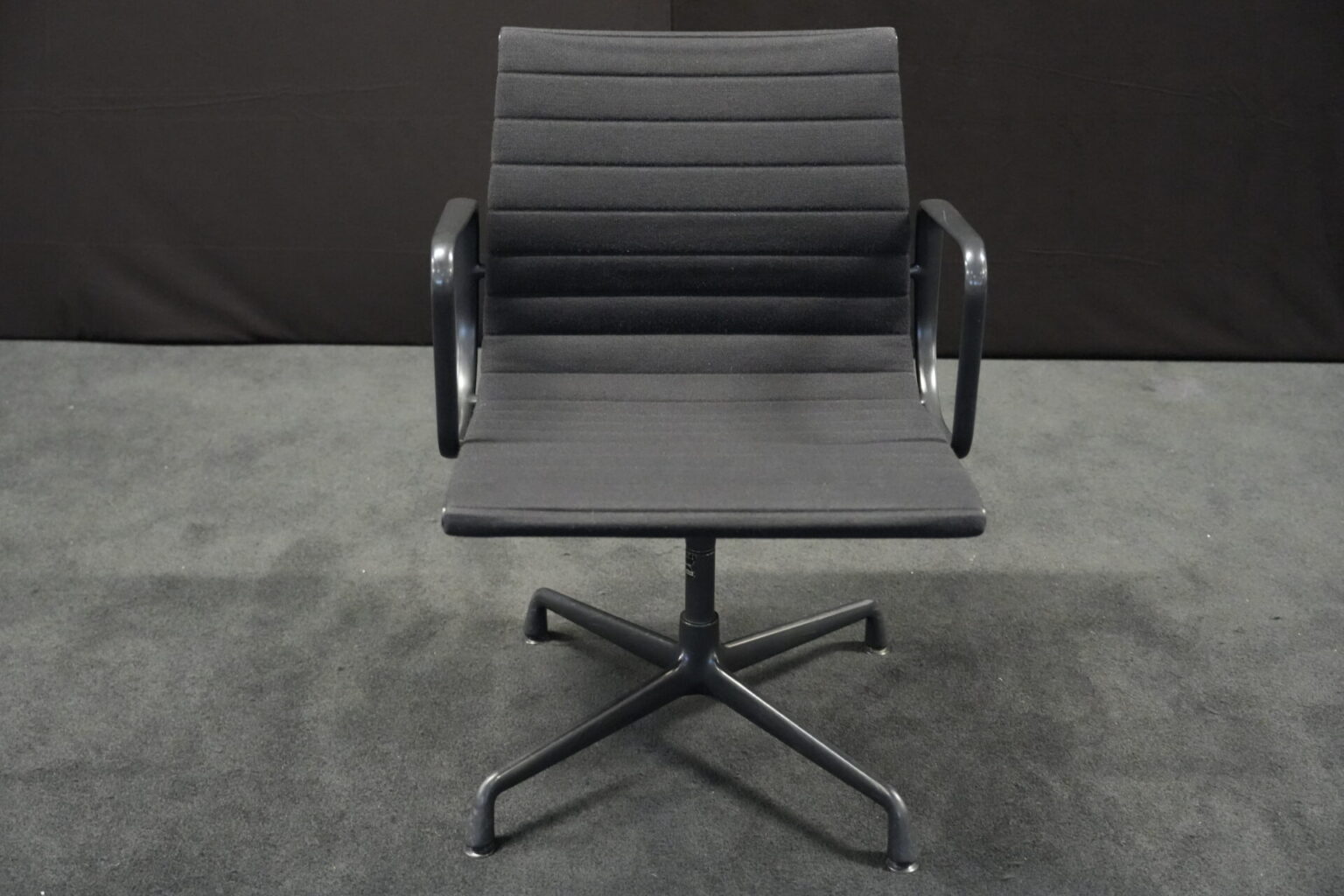 Vitra EA 108 Hopsak / schwarz (drehbar) | Marke: Vitra | Bezug: Hopsak / schwarz | Gestell: Aluminium-Druckguss schwarz | Ausstattung: mit Armlehnen und mittelhoher Rückenlehne, 4-Sternfuß | Abmessungen: H: 83cm | SH: 40cm | B: 58cm | T: 59cm