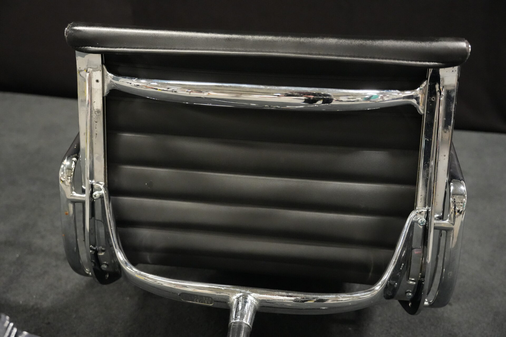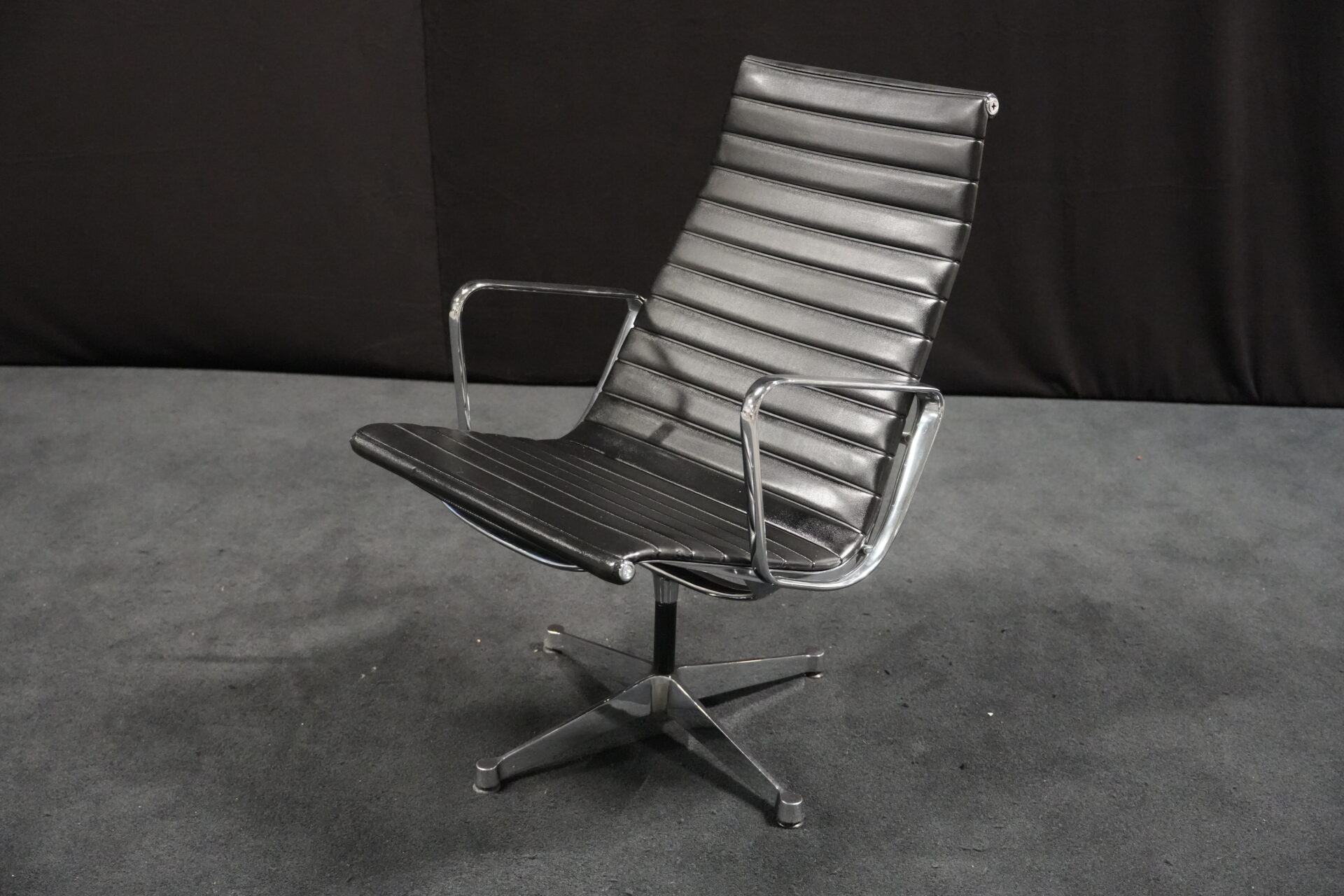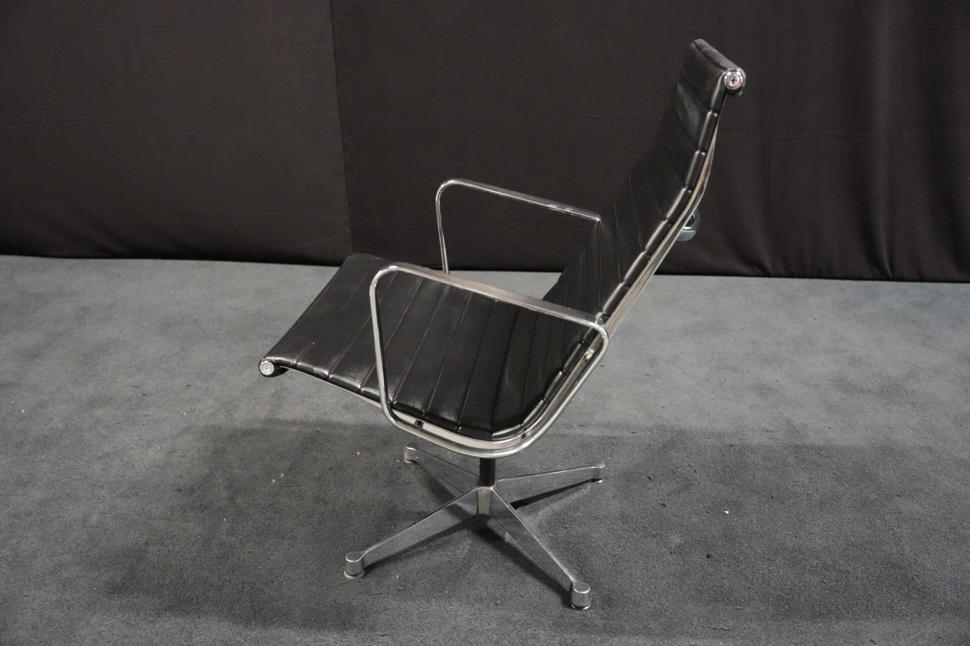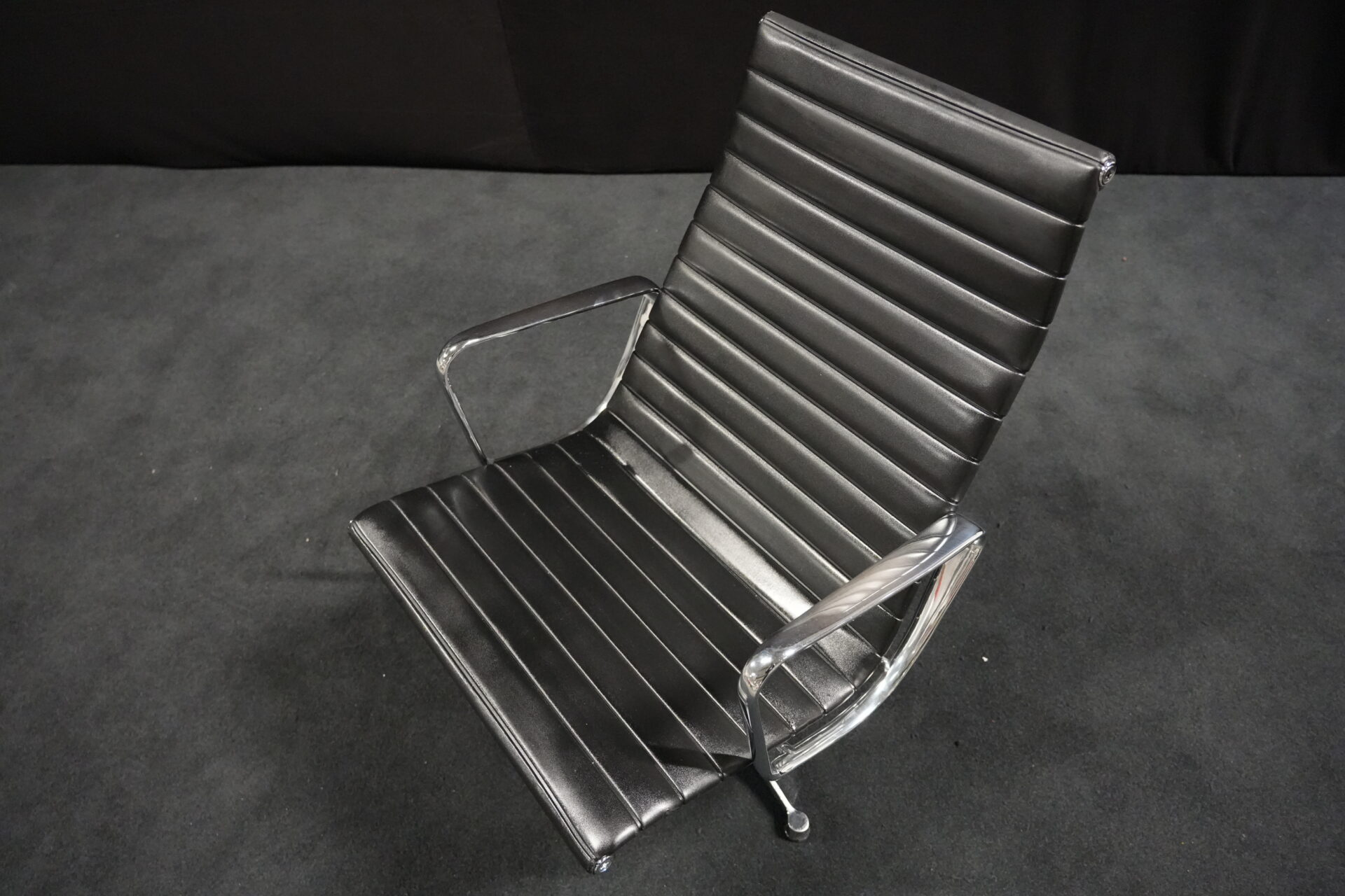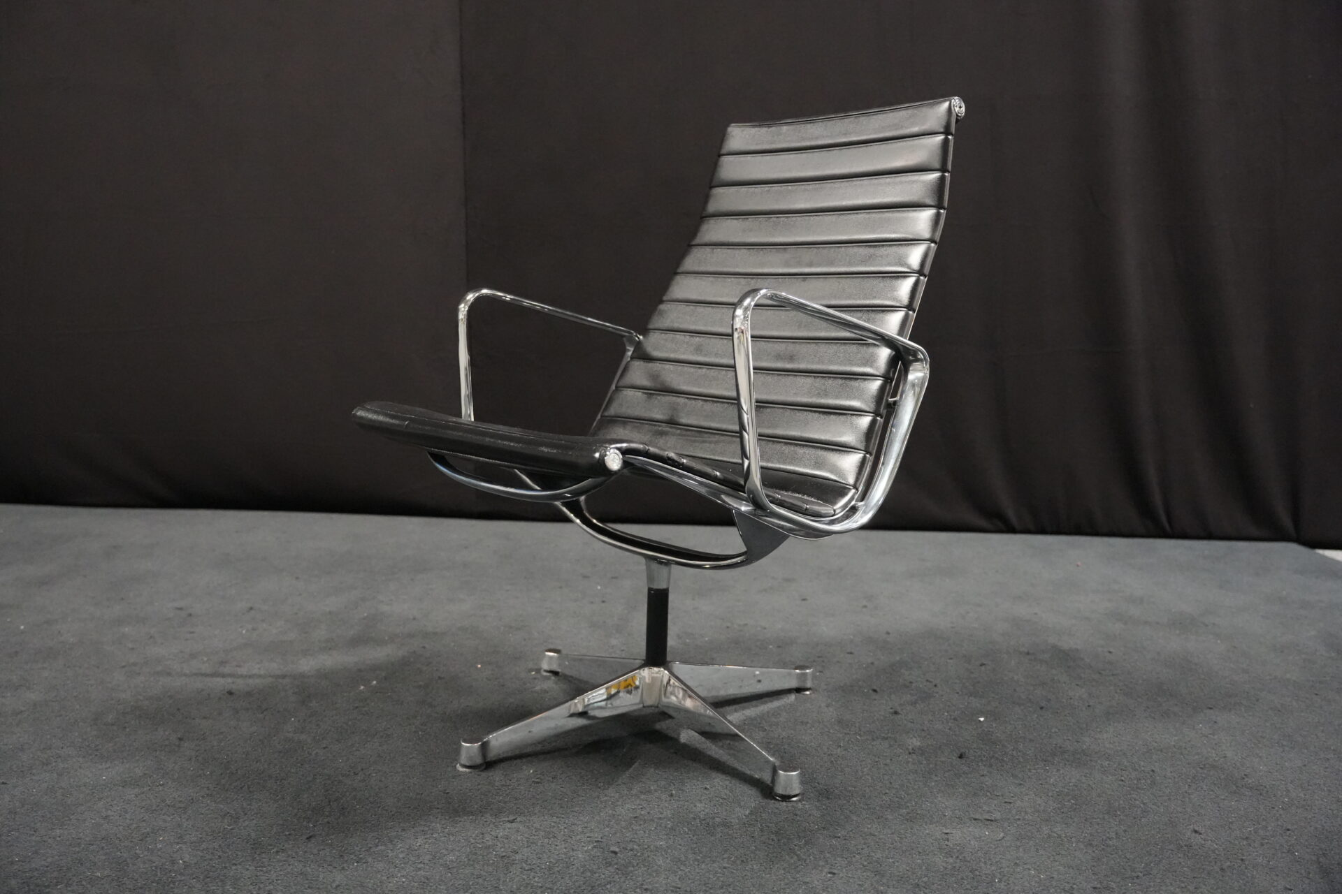 Vitra EA 116 Leder / Schwarz (drehbar) | Marke: Vitra | Bezug: Leder / schwarz | Rückseite: Leder / schwarz | Gestell: Aluminium-Druckguss verchromt |Ausstattung: mit Armlehnen hohe Rückenlehne 4-Sternfuß | Abmessungen: H: 90cm | SH: 35cm | B: 62cm | T: 72cm