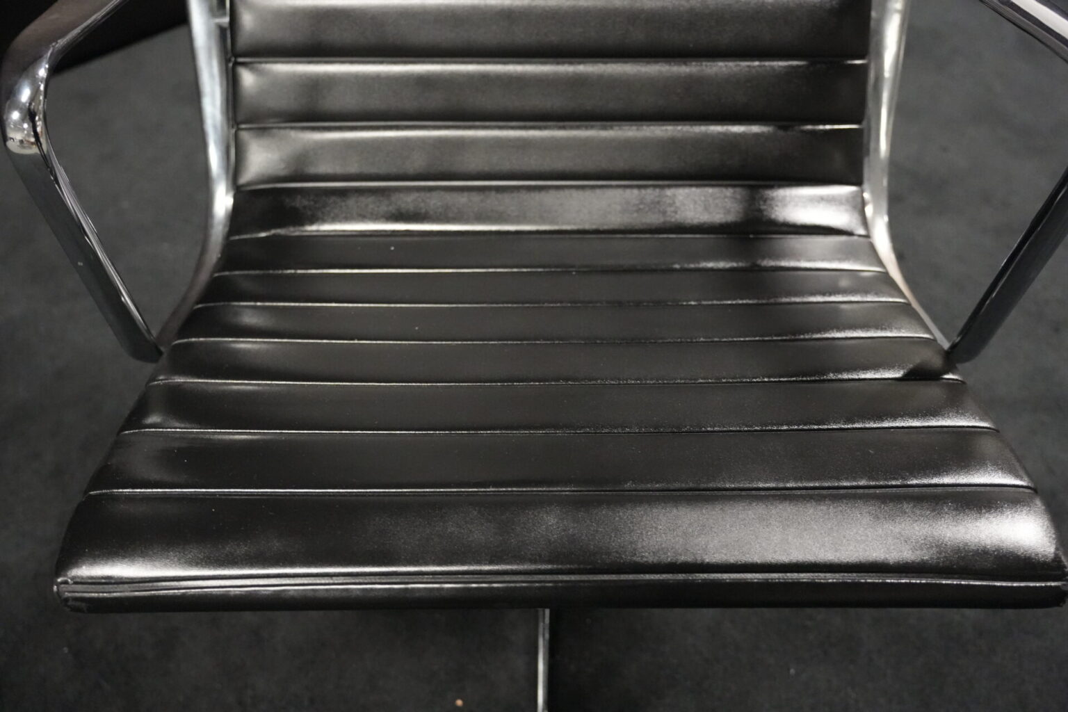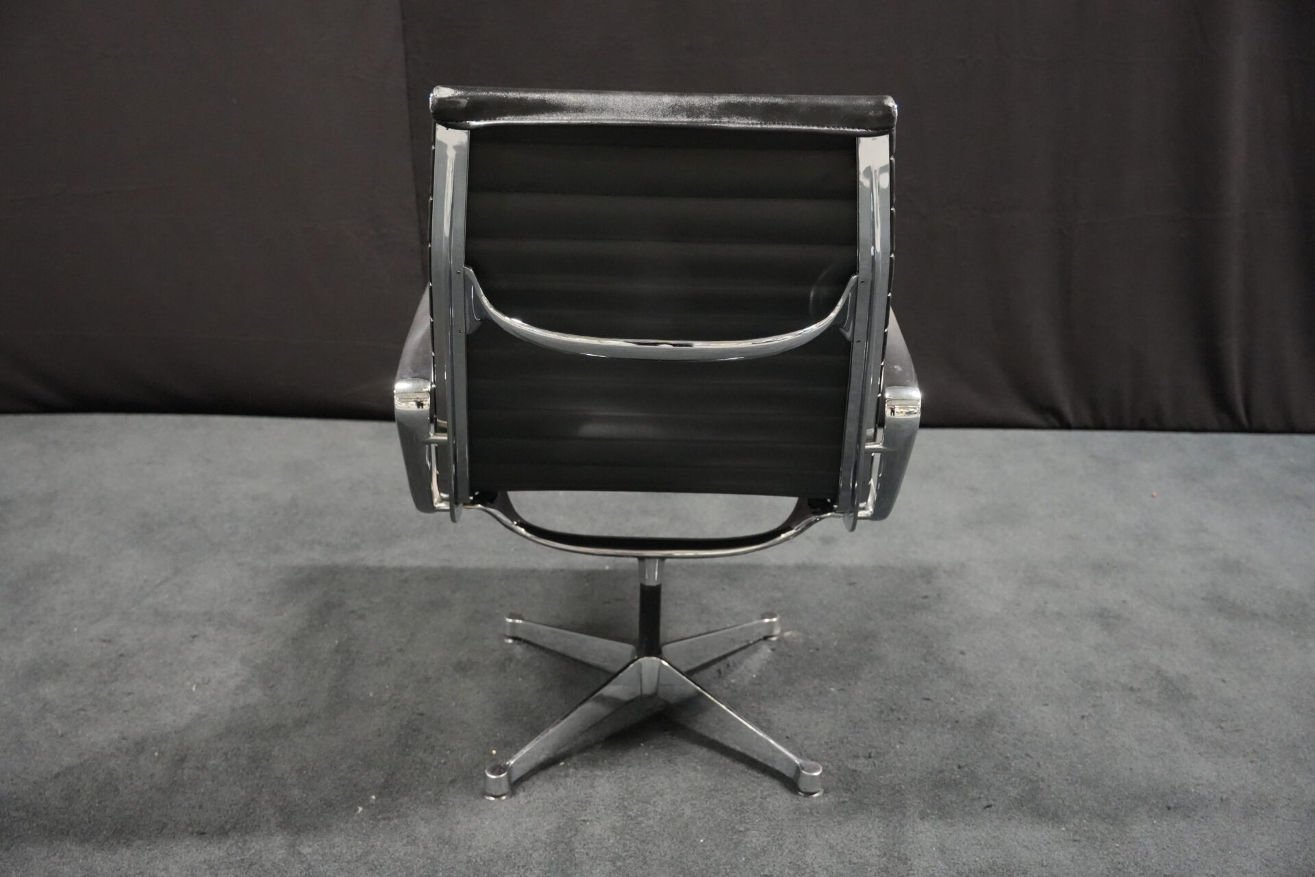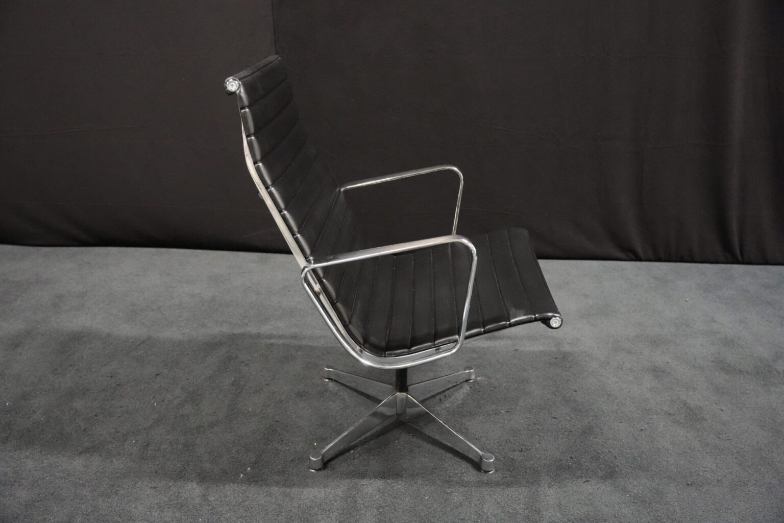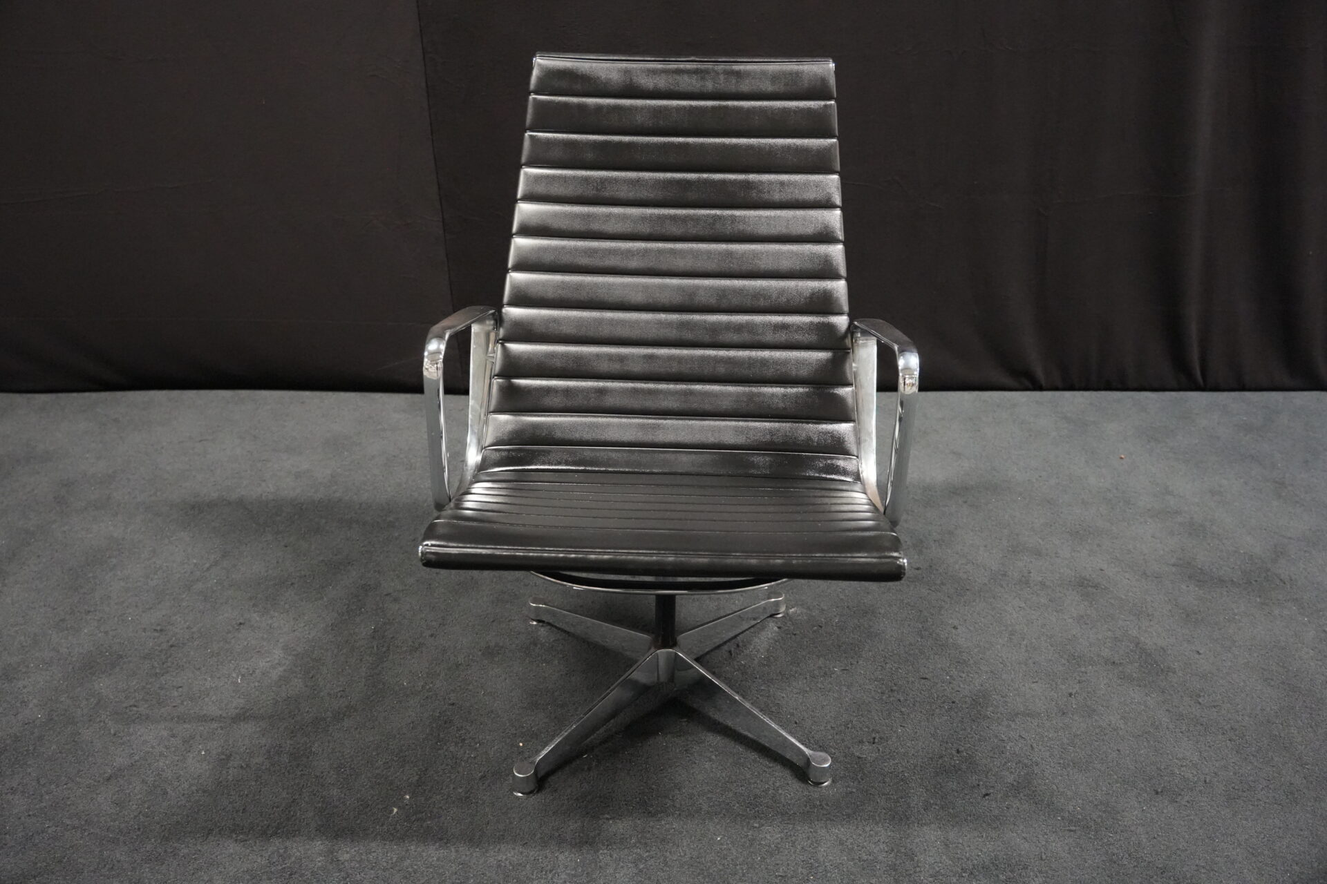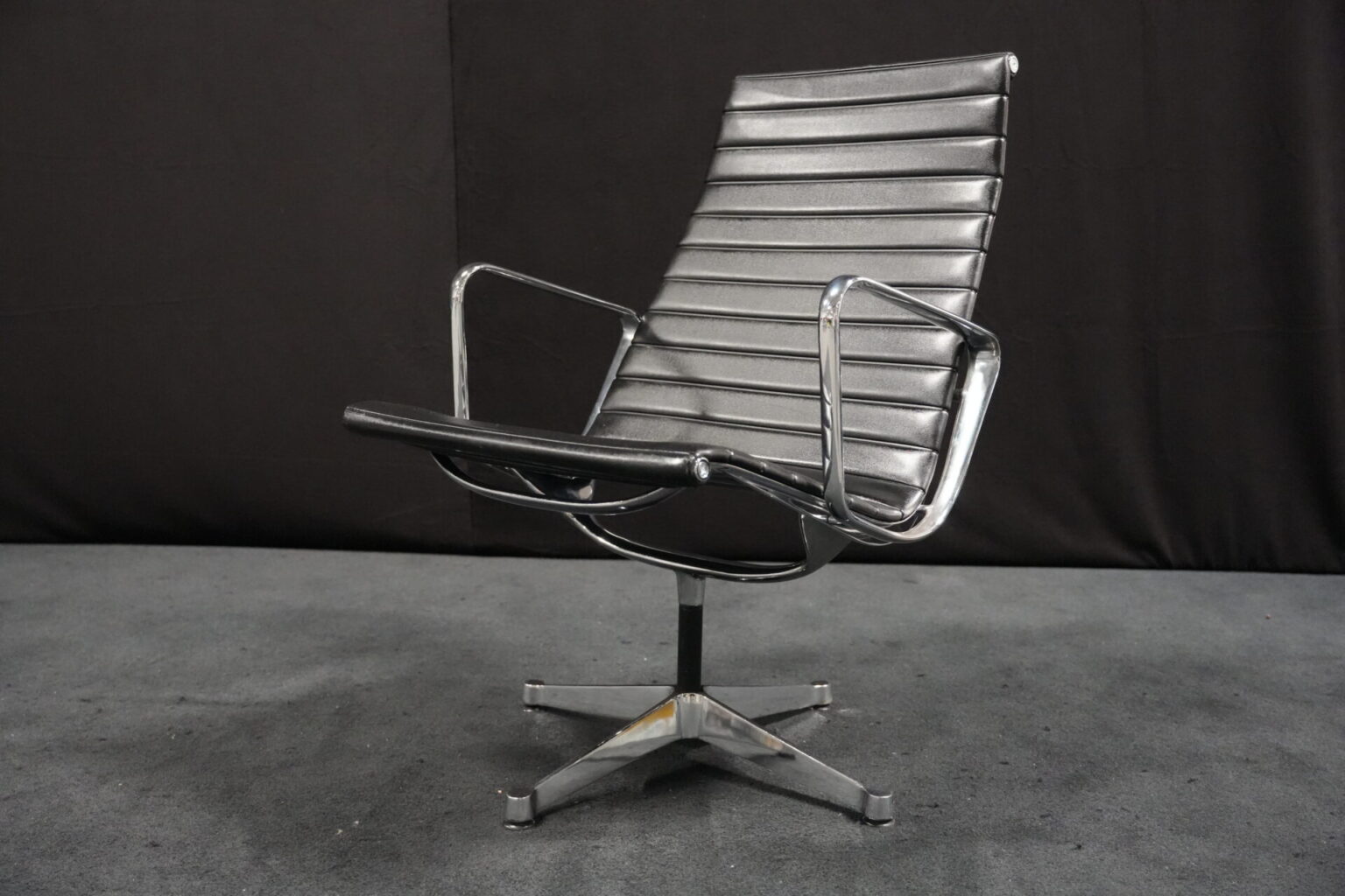 Vitra EA 116 Leder / Schwarz (drehbar) | Marke: Vitra | Bezug: Leder / schwarz | Rückseite: Leder / schwarz | Gestell: Aluminium-Druckguss verchromt |Ausstattung: mit Armlehnen hohe Rückenlehne 4-Sternfuß | Abmessungen: H: 90cm | SH: 35cm | B: 62cm | T: 72cm