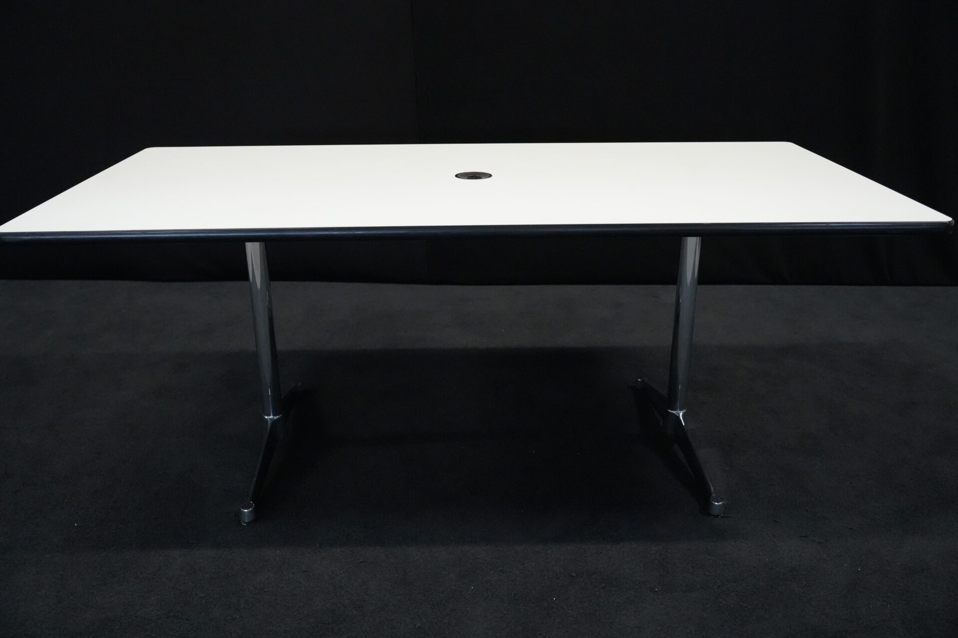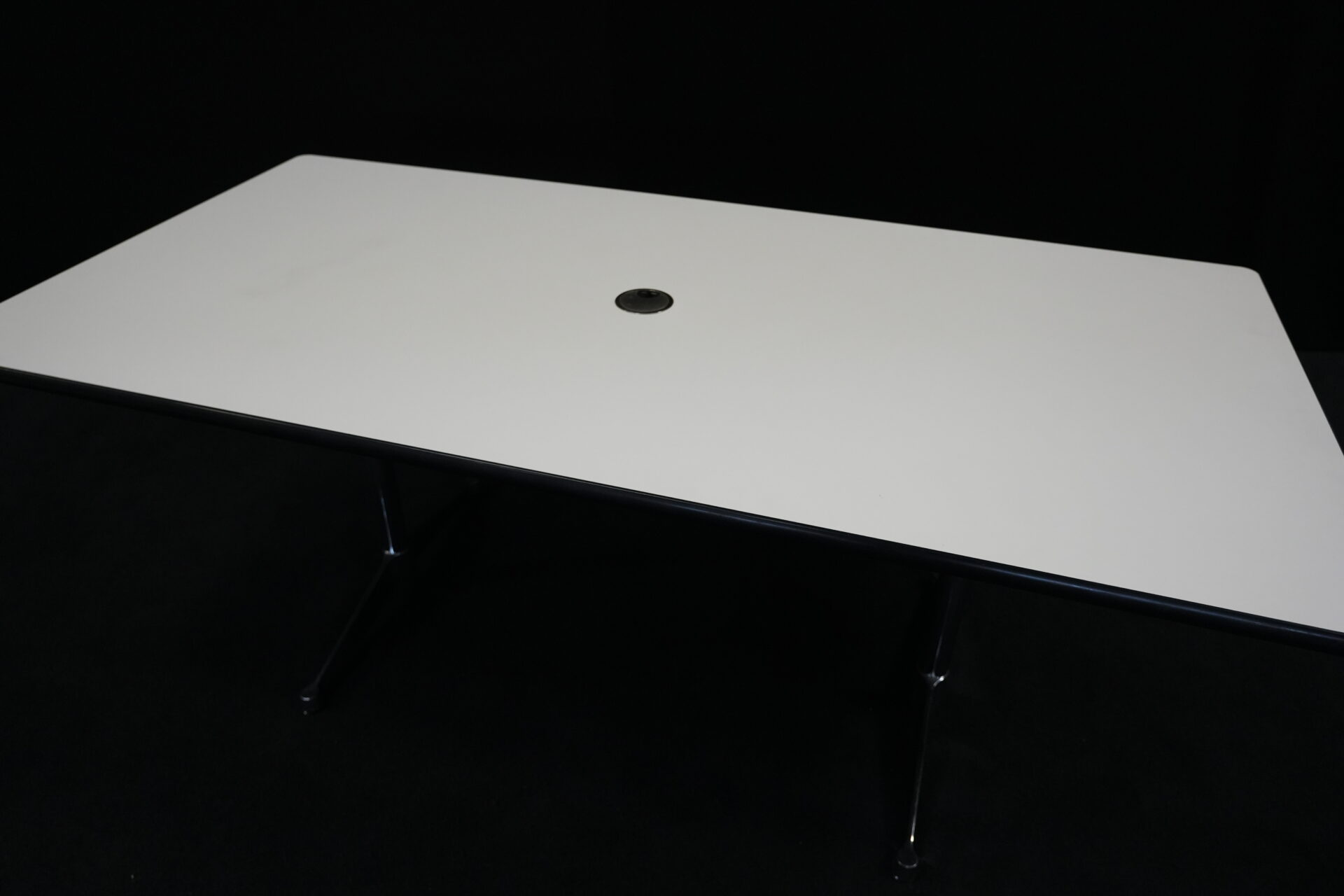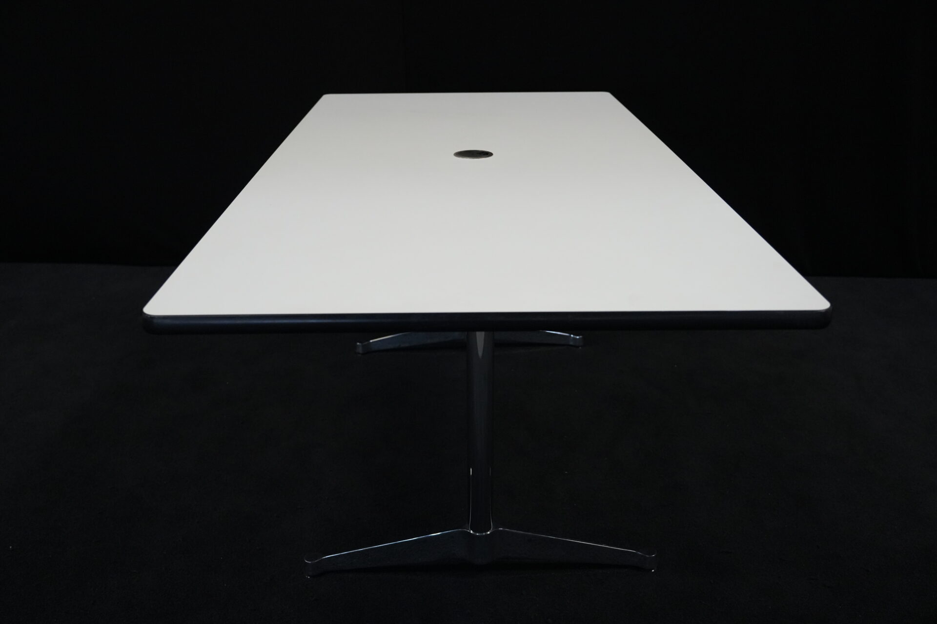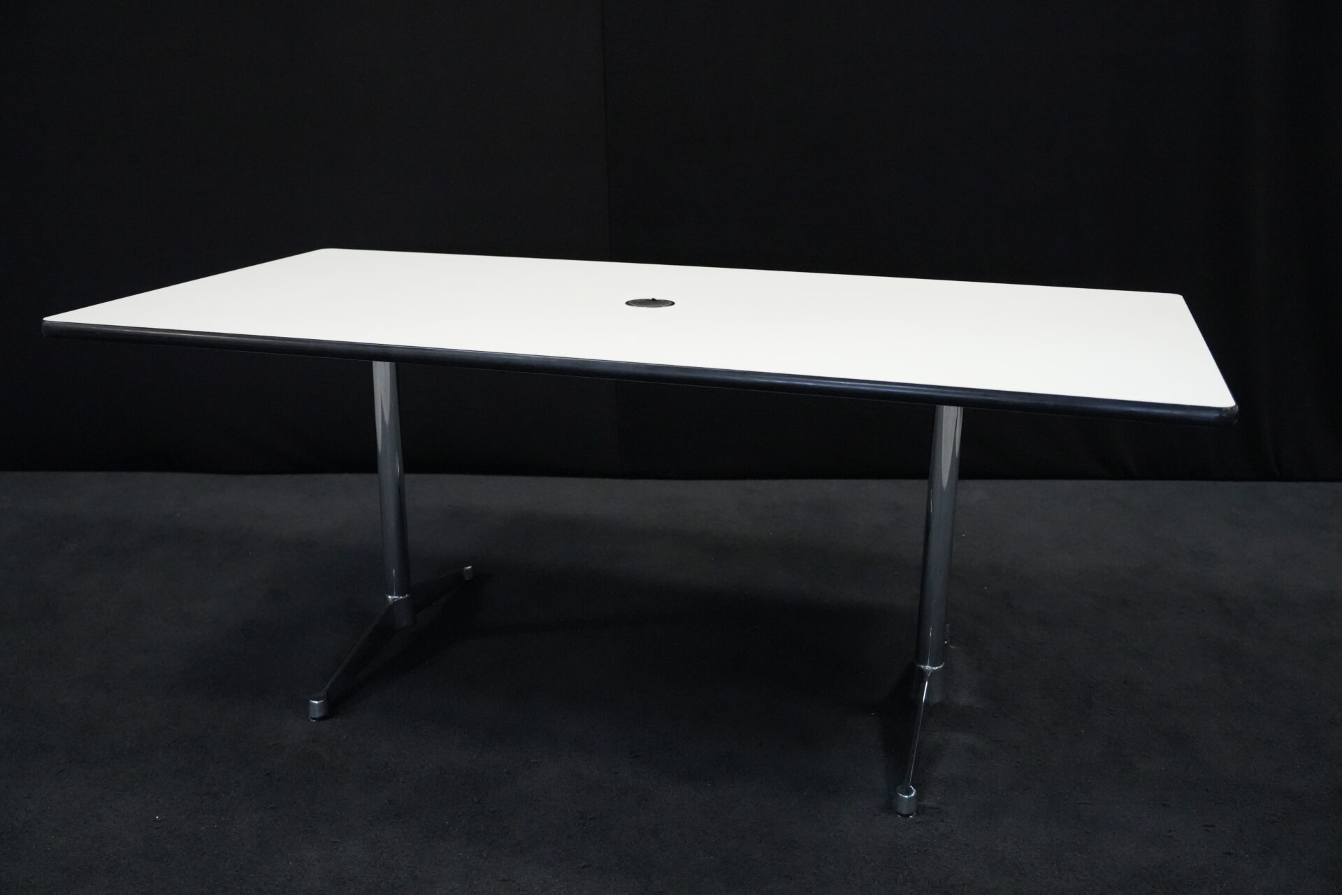 Vitra Tisch Kunstharz / weiß | Marke: Vitra | Tischplatte: weiß | Gestell: verchromt | Ausstattung: Kabel-Loch in der Mitte | Abmessungen: H: 73cm | B: 194cm | T: 90cm
