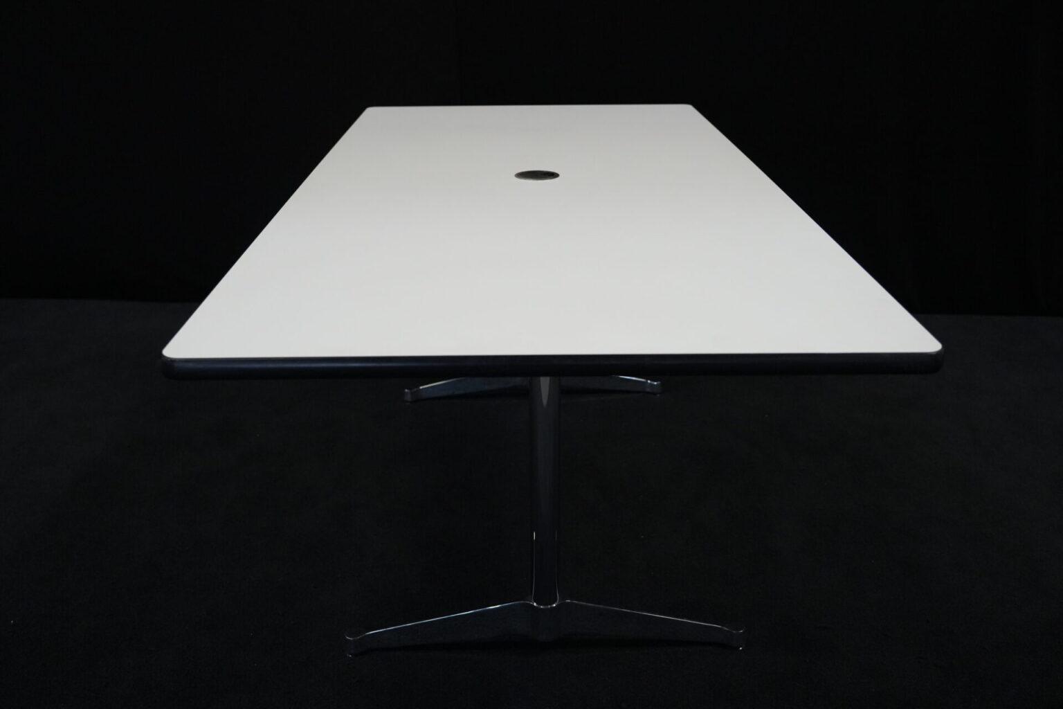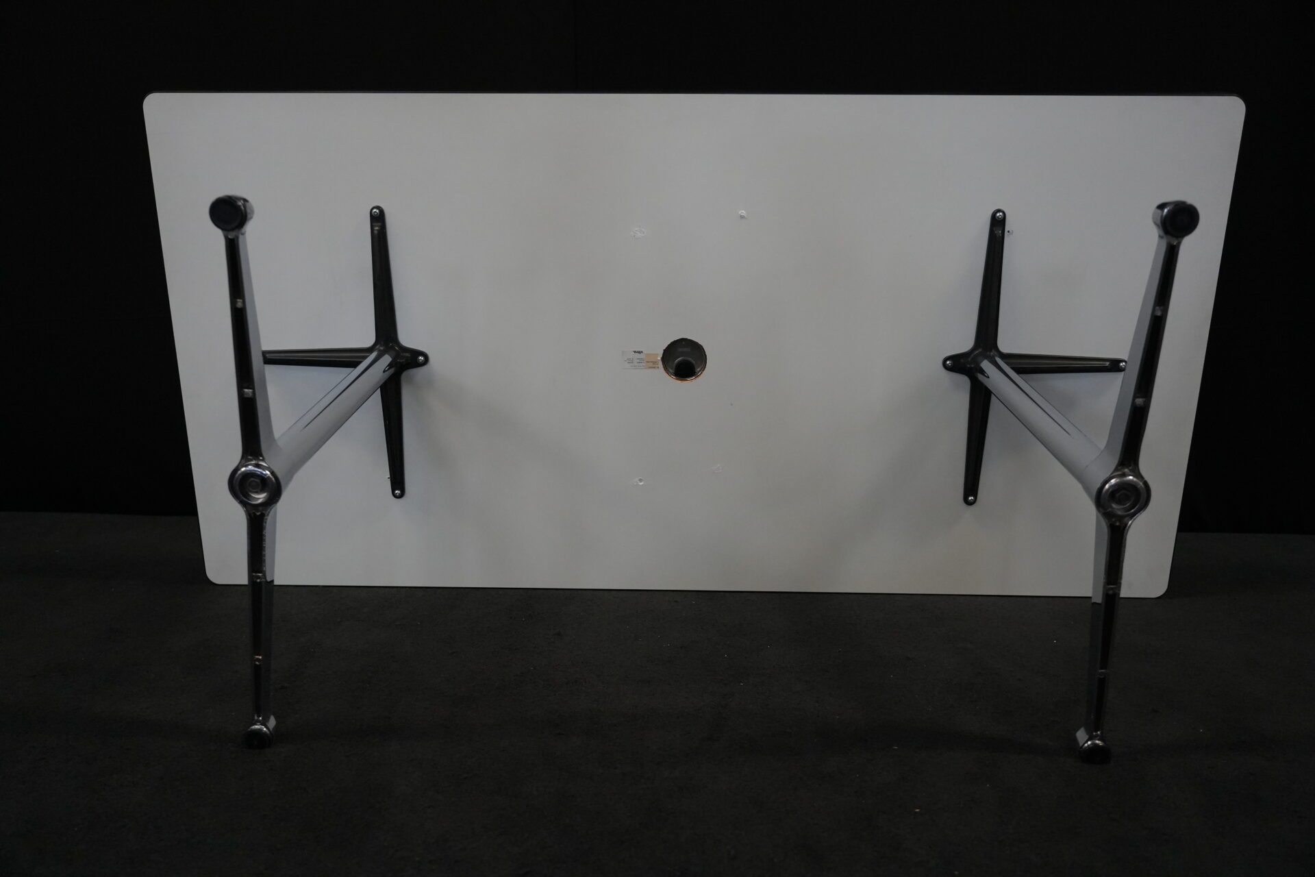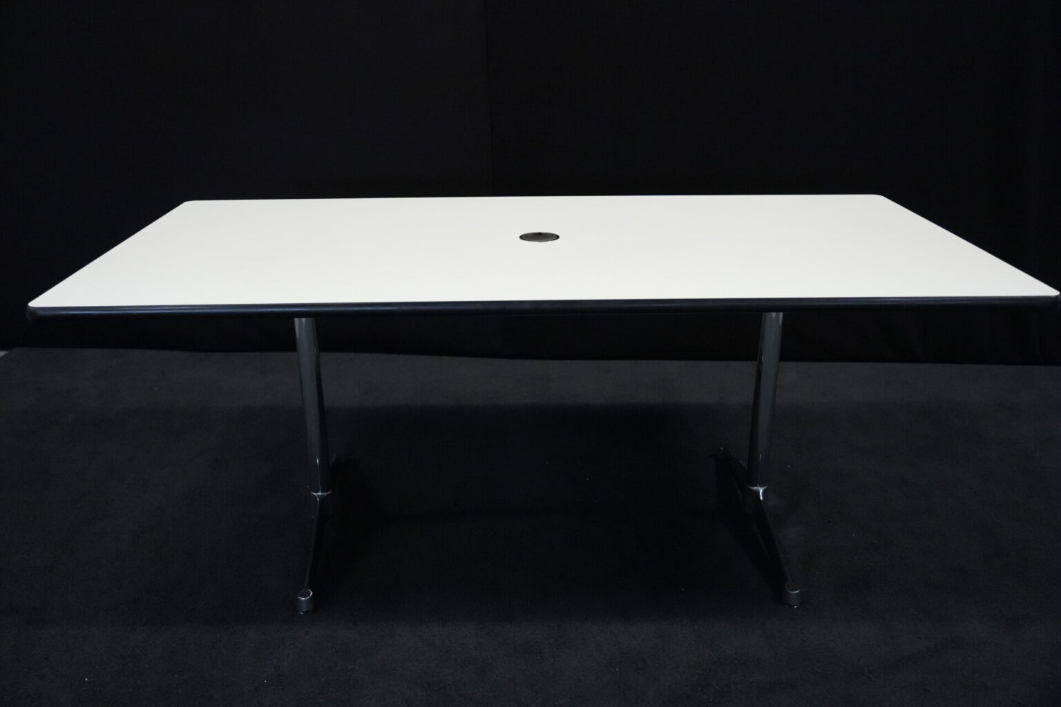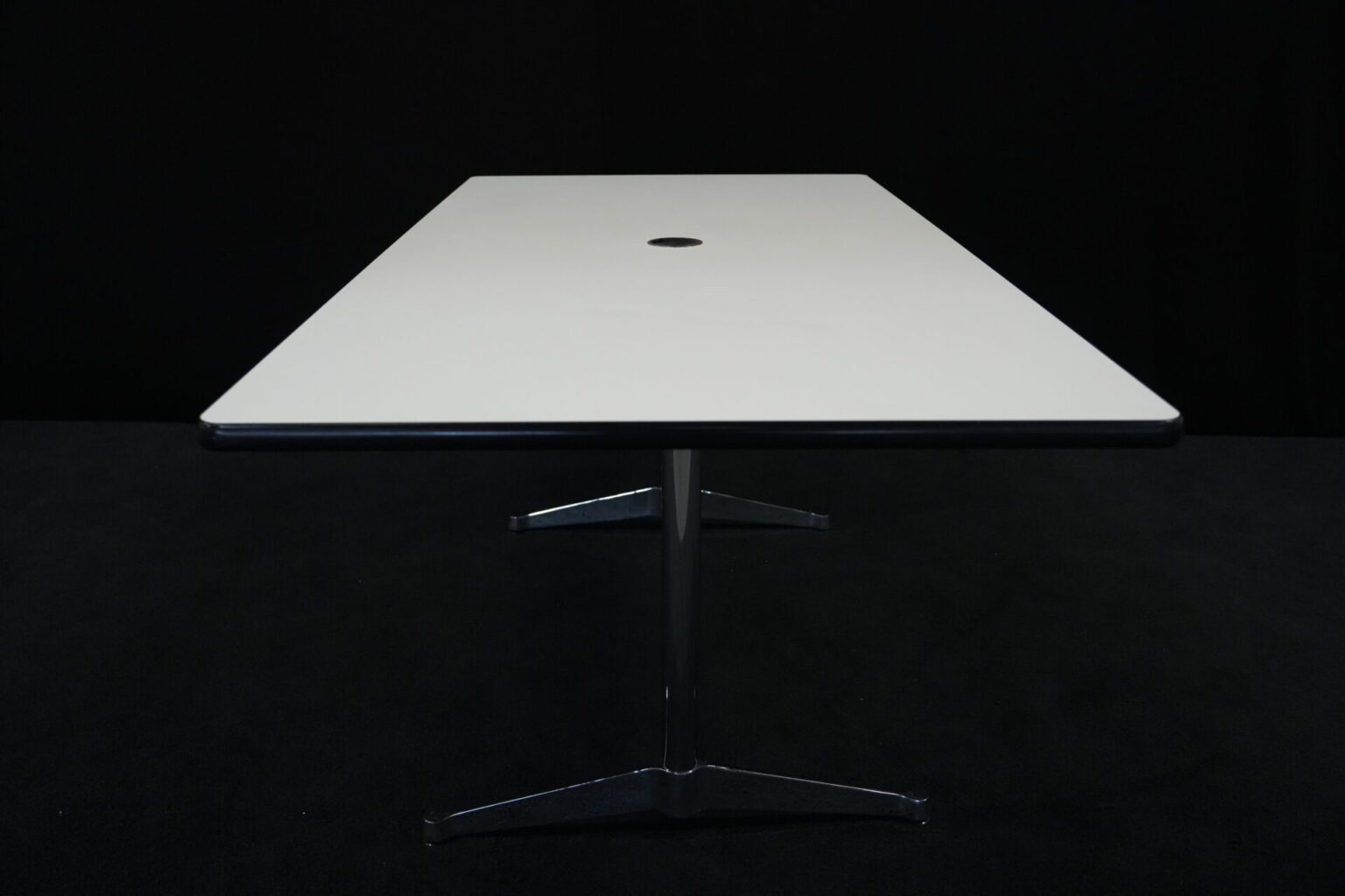 Vitra Tisch Kunstharz / weiß | Marke: Vitra | Tischplatte: weiß | Gestell: verchromt | Ausstattung: Kabel-Loch in der Mitte | Abmessungen: H: 73cm | B: 194cm | T: 90cm